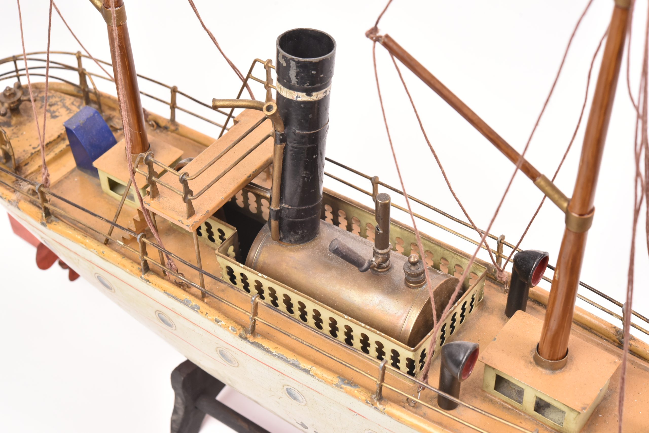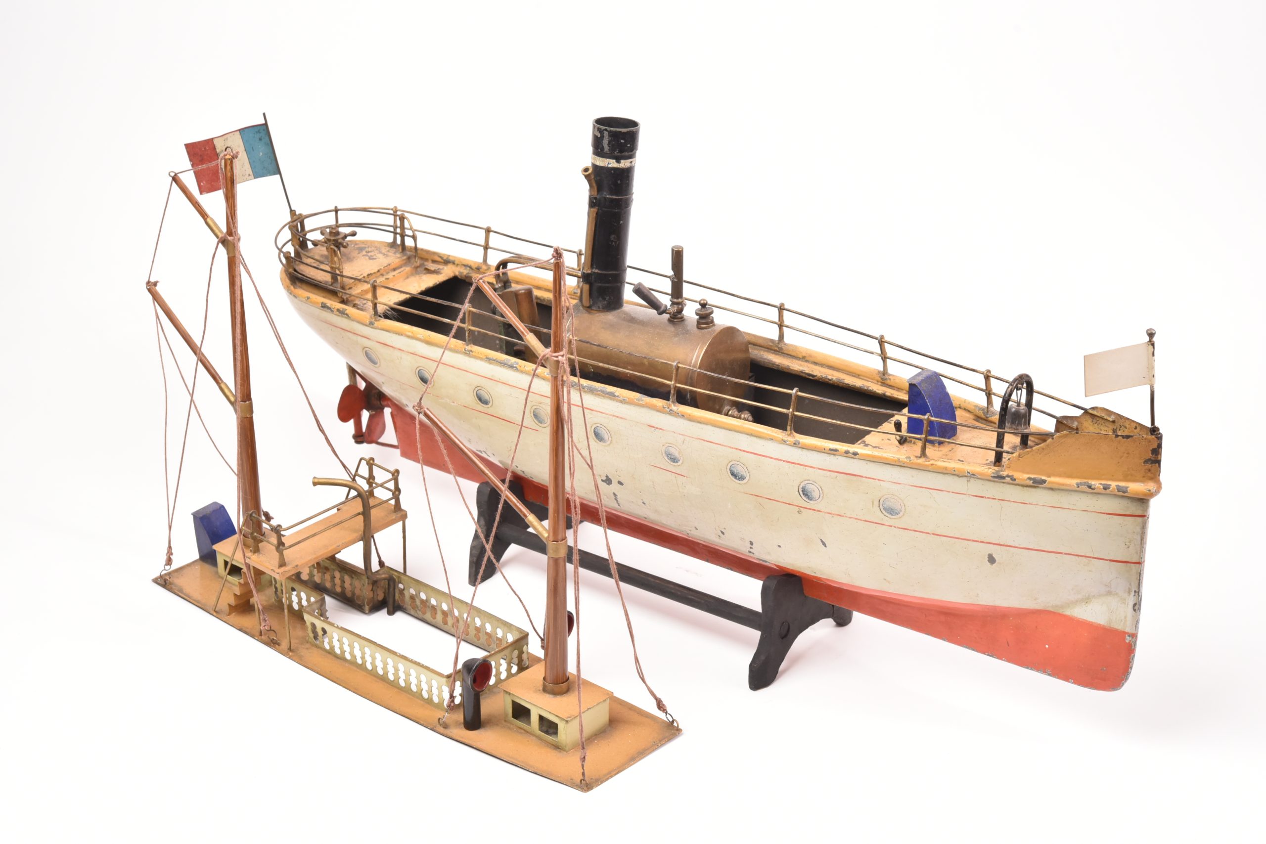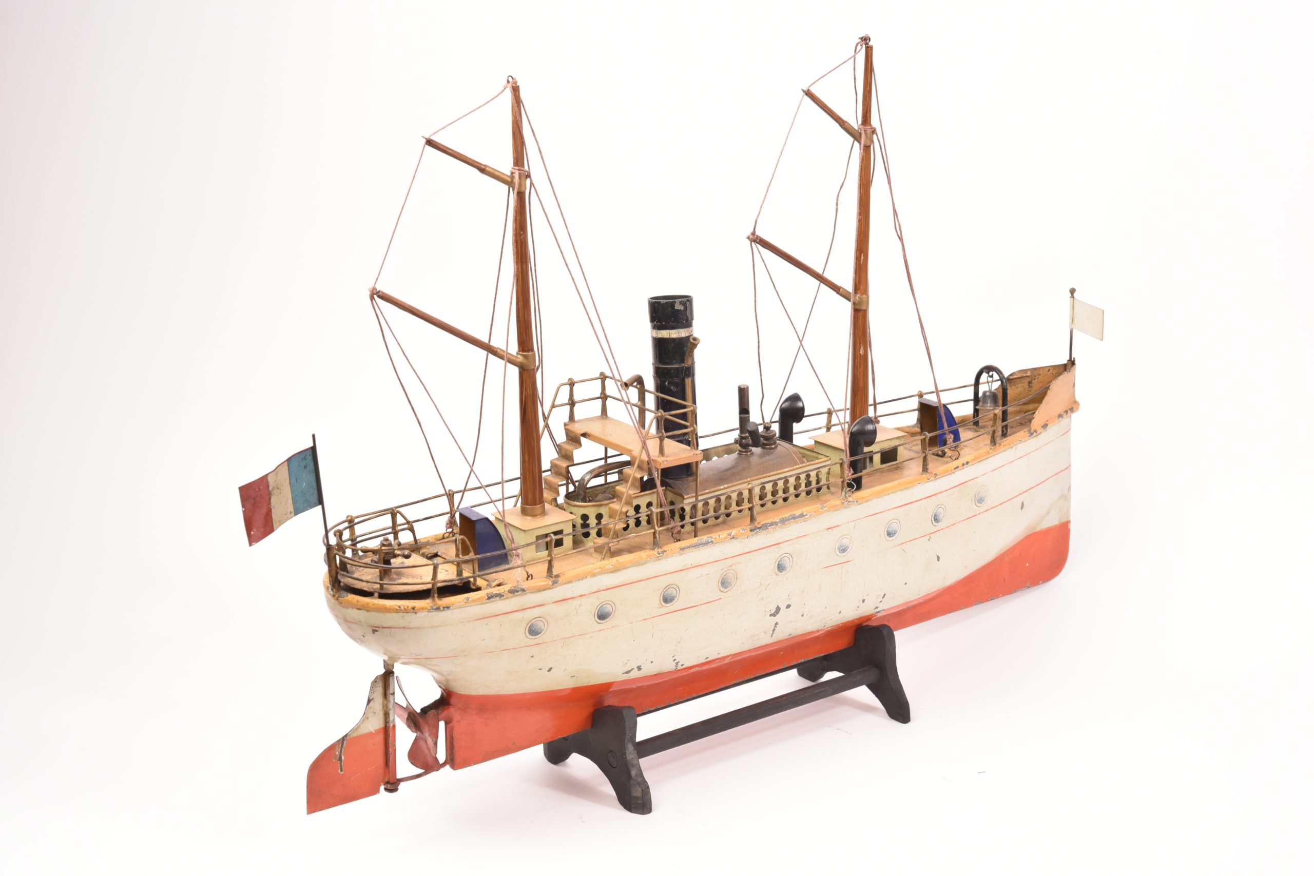 Manufactured by the German toy maker, Carette. This ship is fairly long, measuring 54 cm from bow to stern. The hull is made of painted sheet metal, it features a live steam mechanism, horizontal boiler and oscillating drum. This model might be the very first ever made by Carette with this mechanism. The boat is complete with original paintwork. The super structure features some paint renovations.  Beautiful condition.