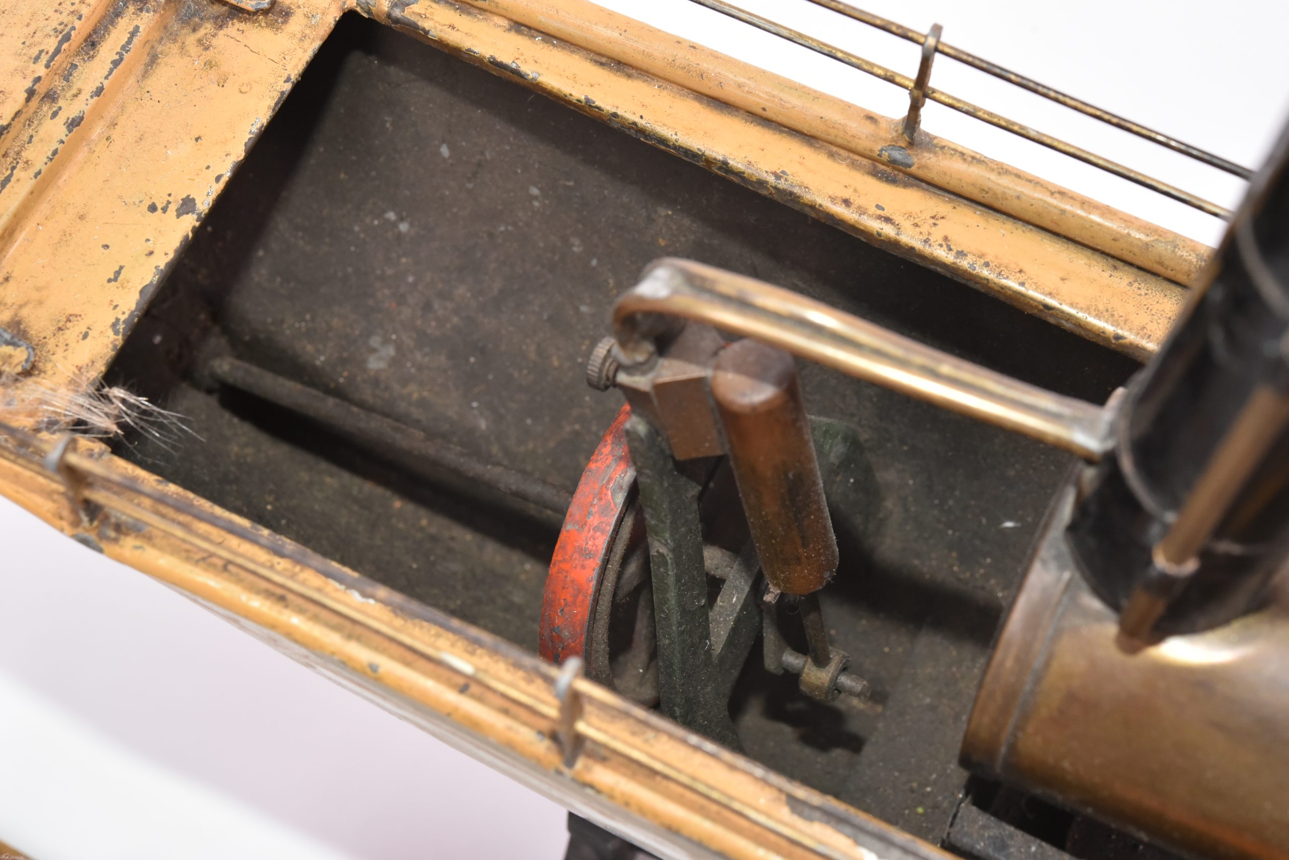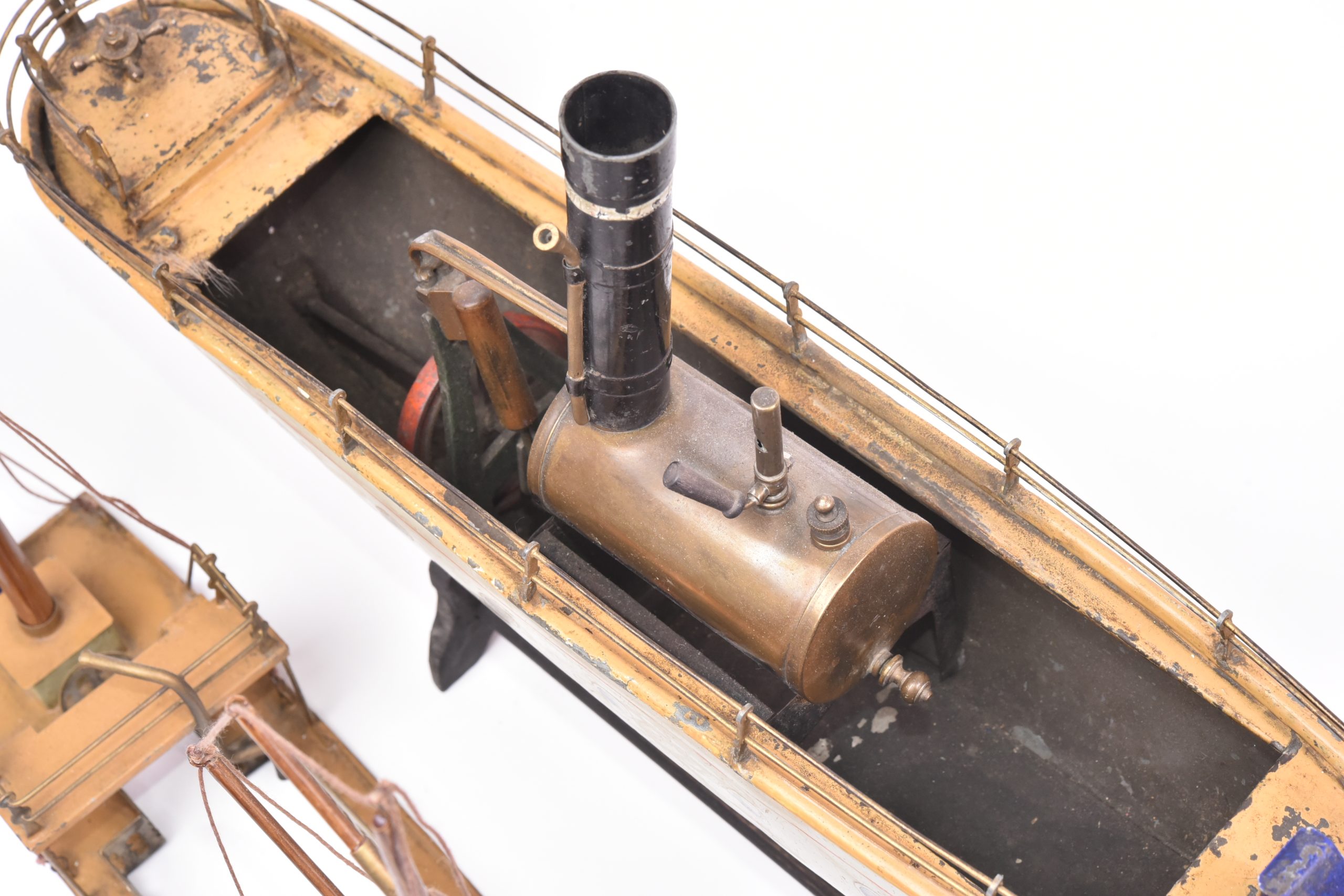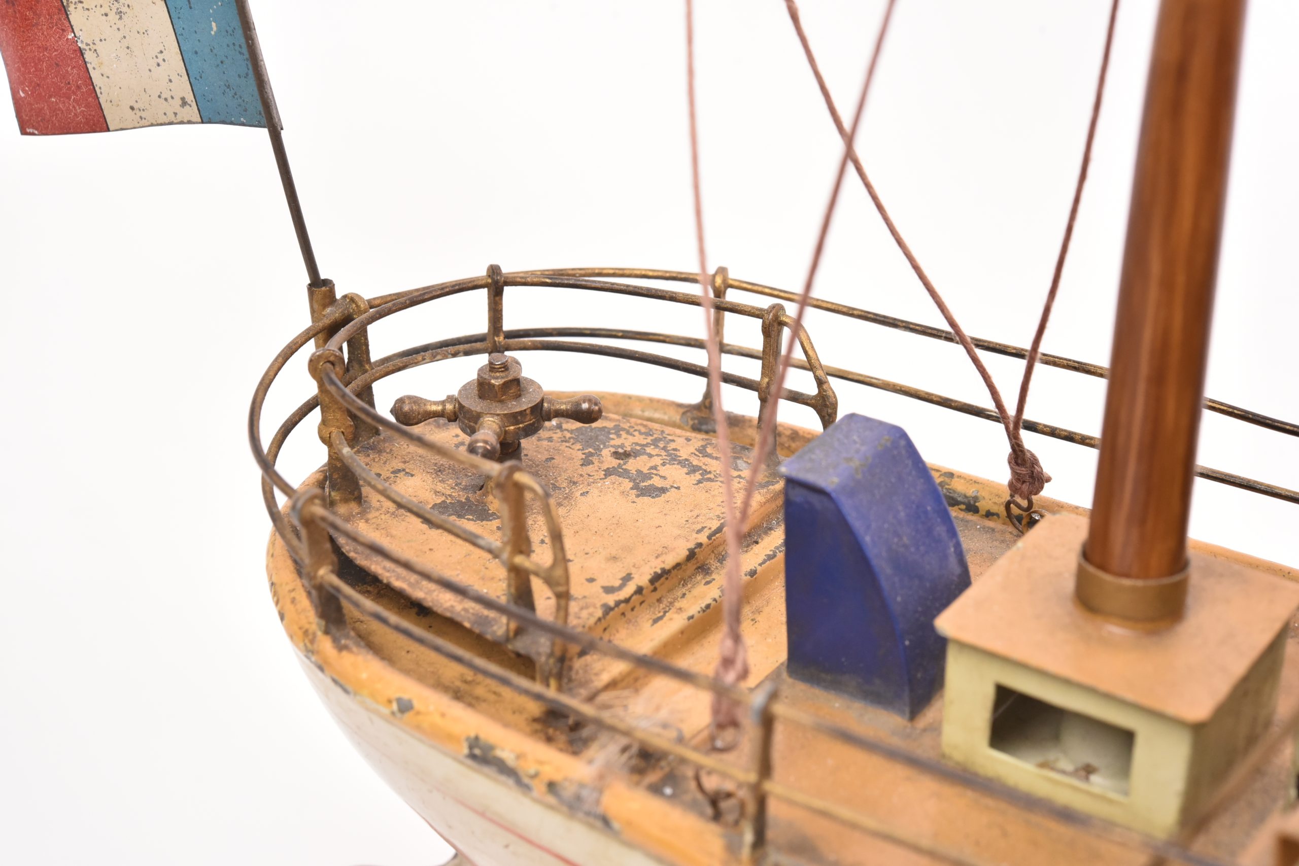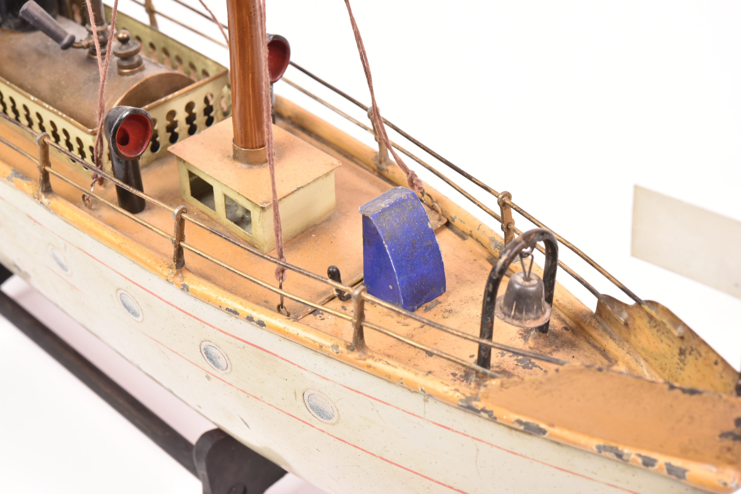 Manufactured by the German toy maker, Carette. This ship is fairly long, measuring 54 cm from bow to stern. The hull is made of painted sheet metal, it features a live steam mechanism, horizontal boiler and oscillating drum. This model might be the very first ever made by Carette with this mechanism. The boat is complete with original paintwork. The super structure features some paint renovations.  Beautiful condition.