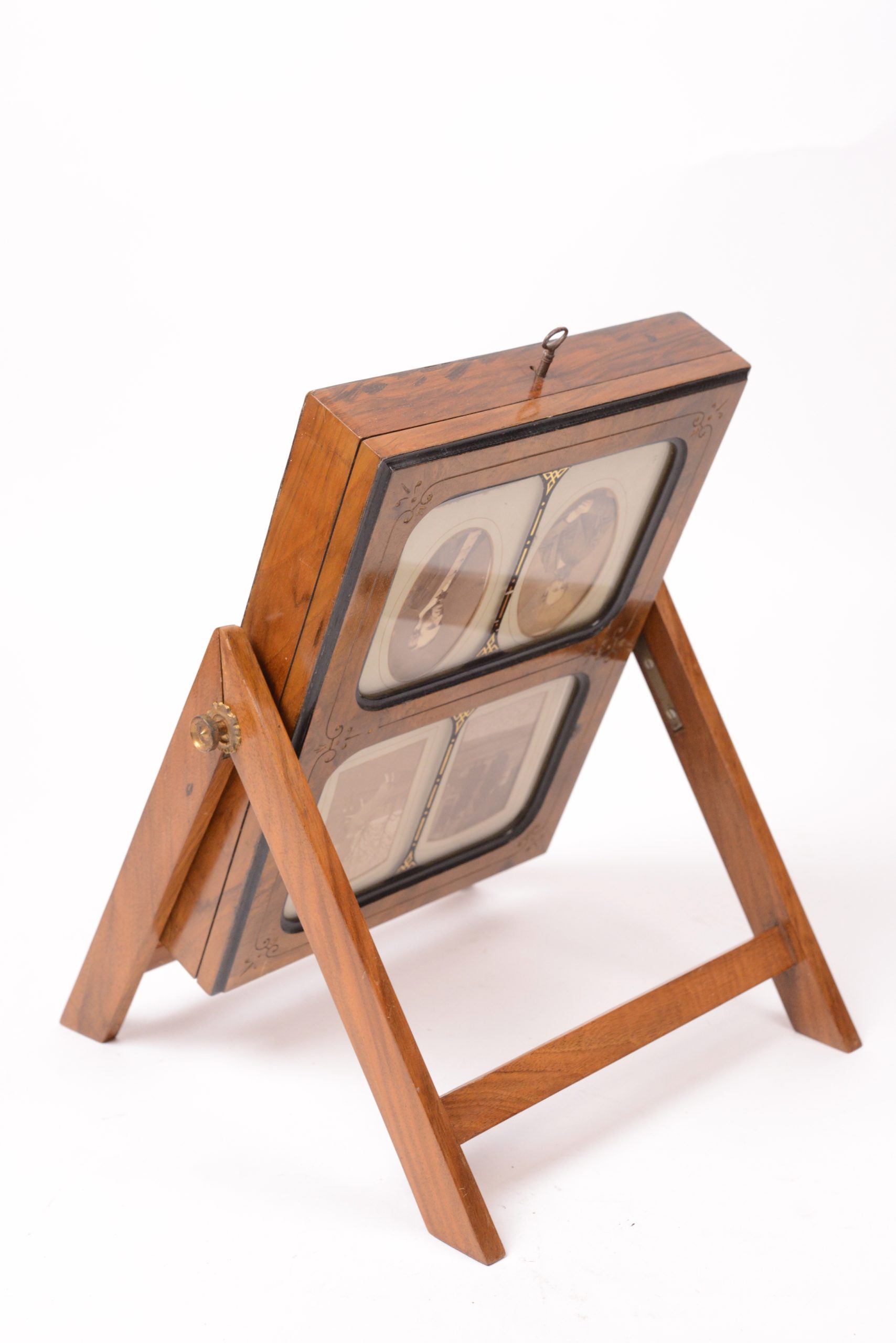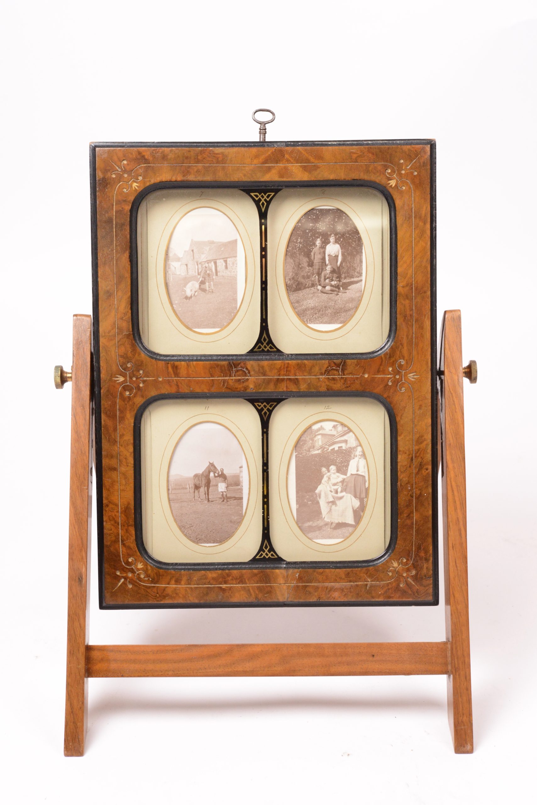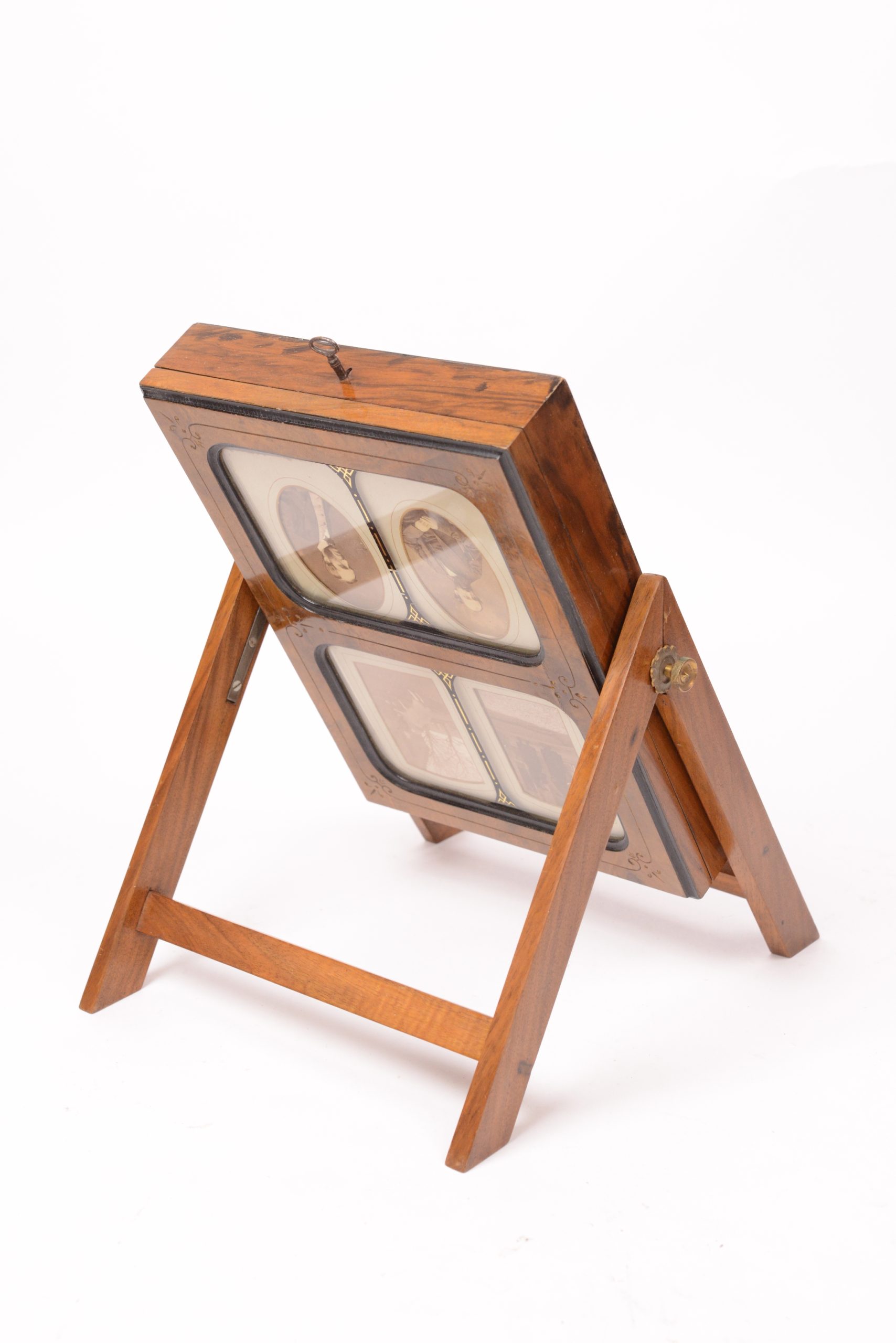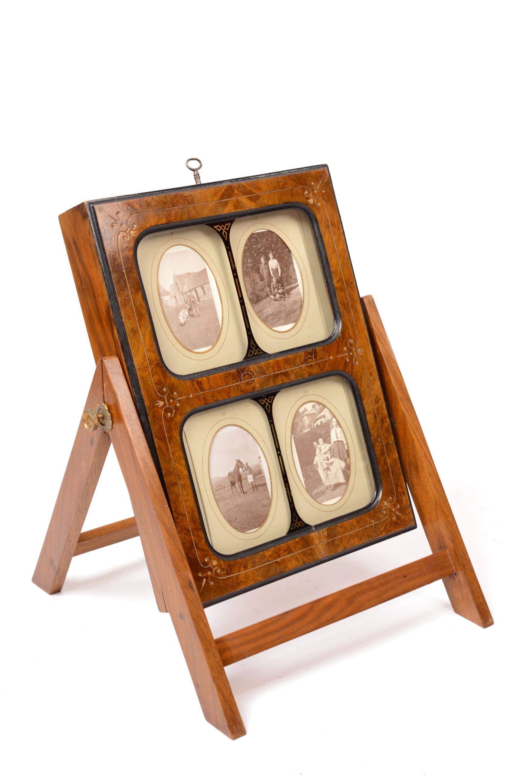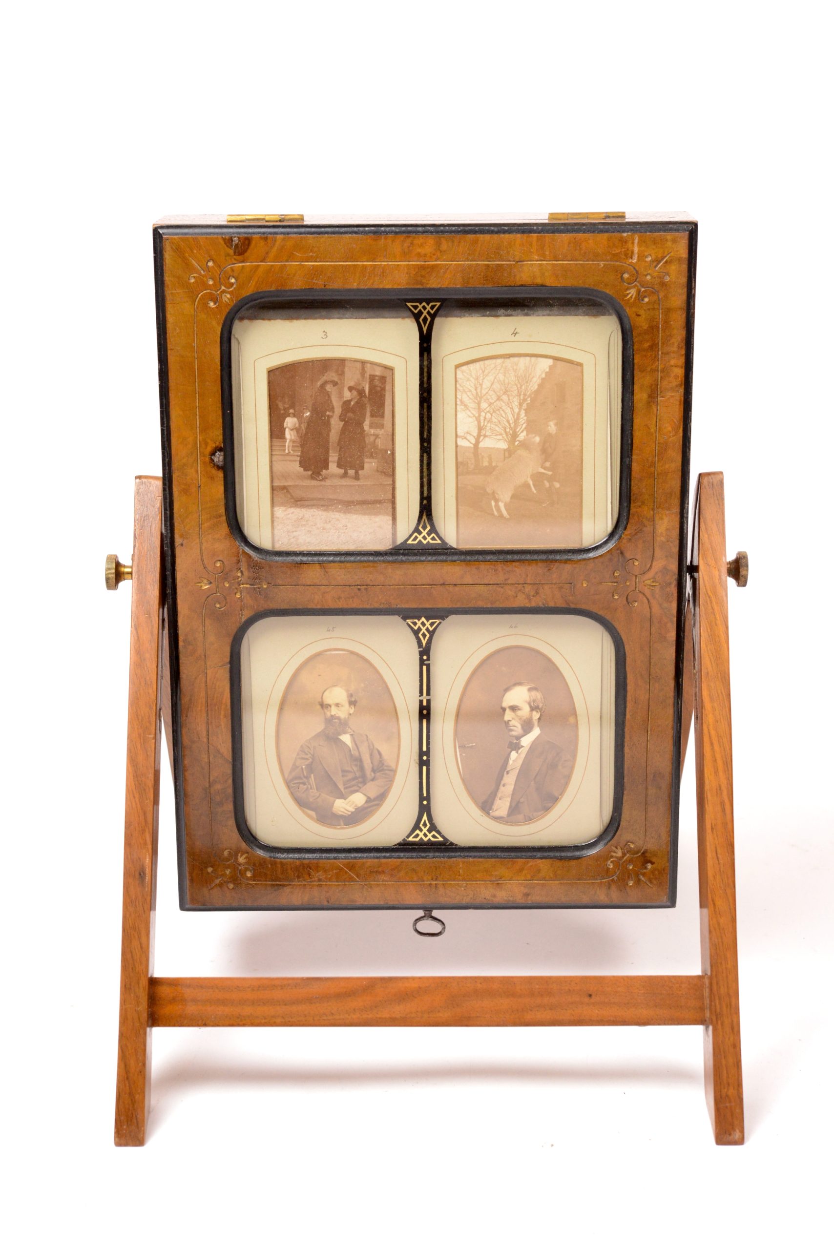 Un tel album objet est présenté sous l’appellation « album photographique tournant » dans les catalogues de la maison Derogy de la fin du XIX<sup>ème</sup> siècle.  Il est décrit ainsi : « <em>Cet album est aussi un joli meuble de salon contenant une série de photographies qui viennent se présenter successivement au public sans qu’on puisse y toucher</em> ». A chaque tour du plateau, des images sont escamotées, laissant place aux suivantes. L’album peut recevoir 52 cartes de visite. Très belle construction en noyer verni avec incrustations de motifs dorés sur les deux faces.