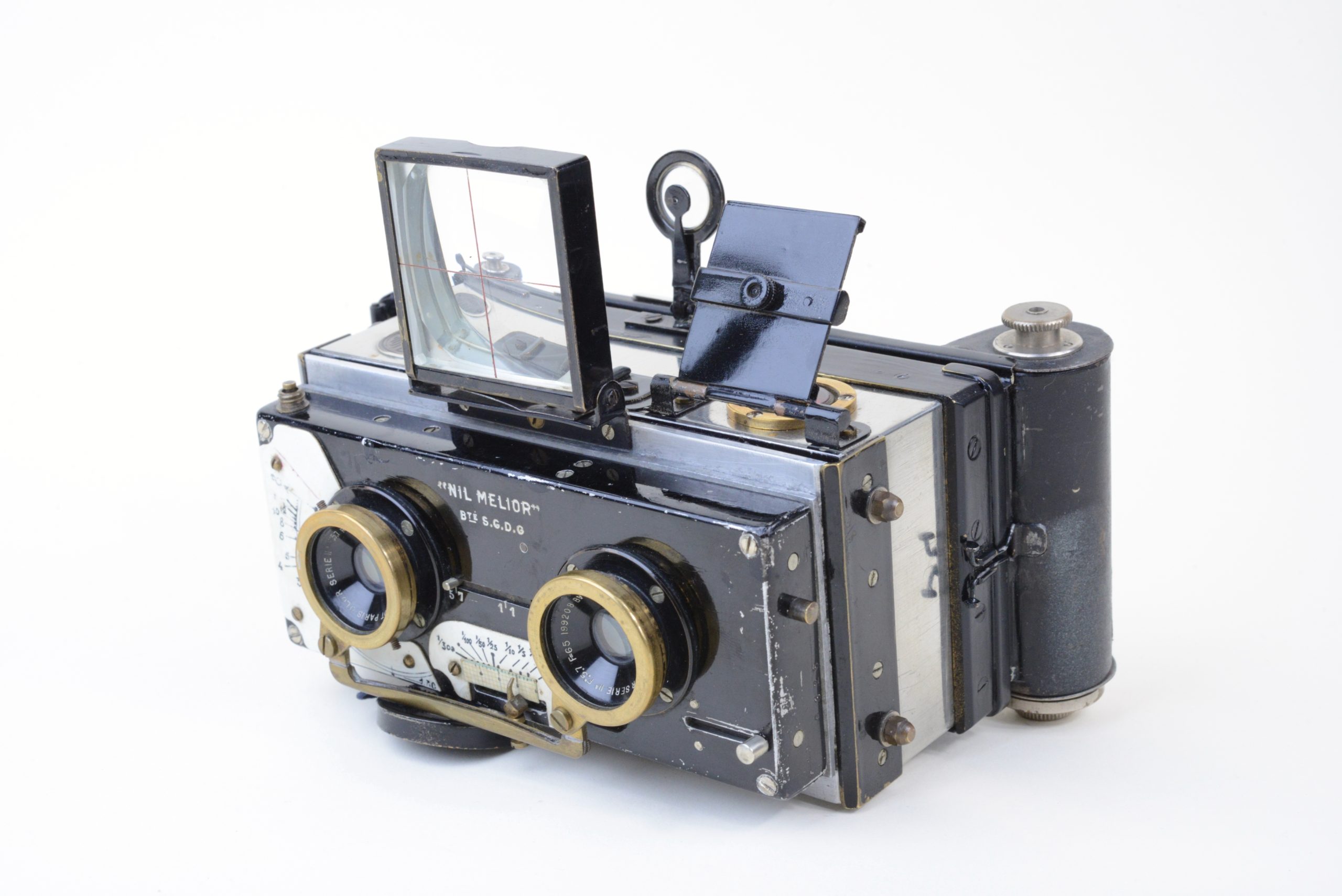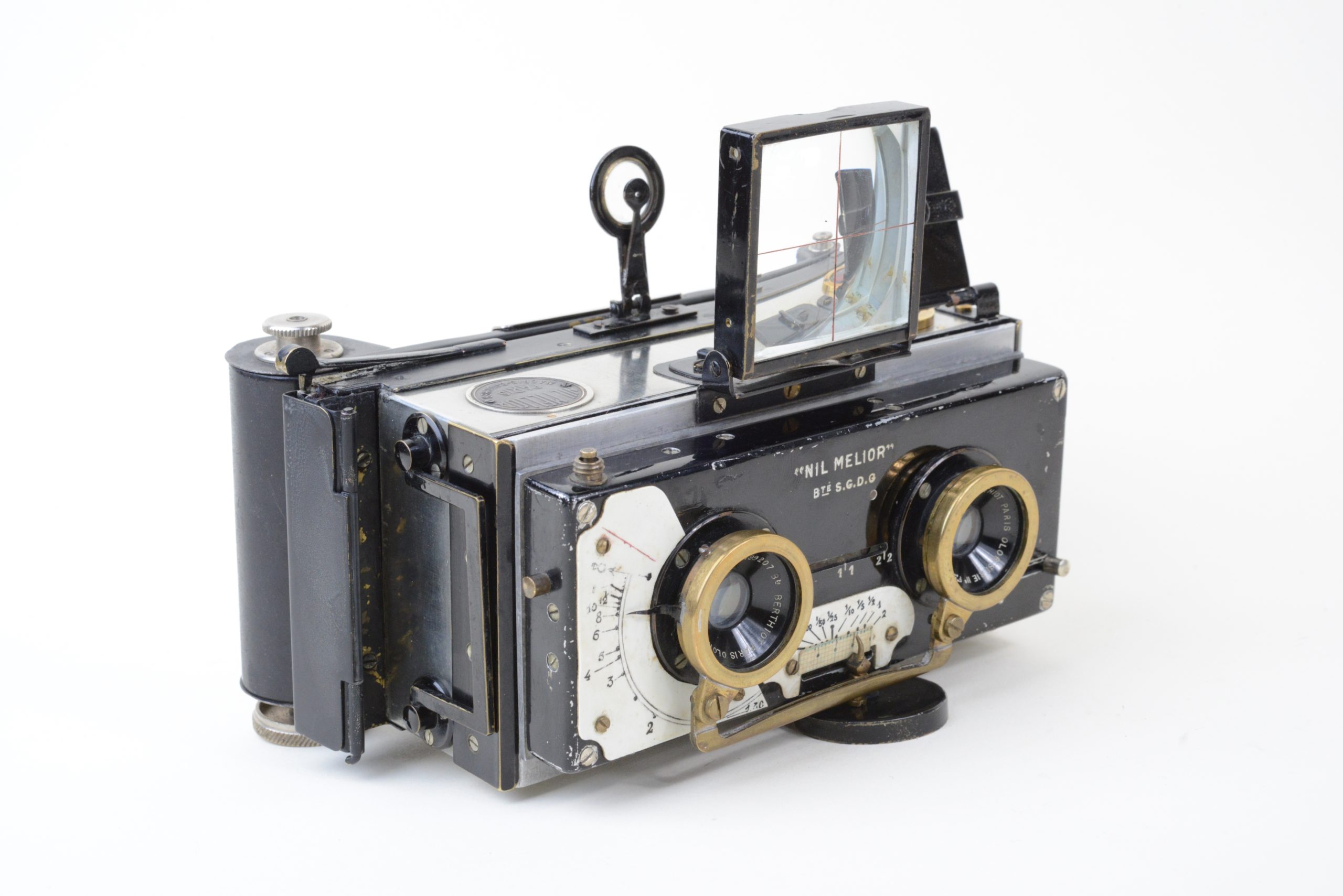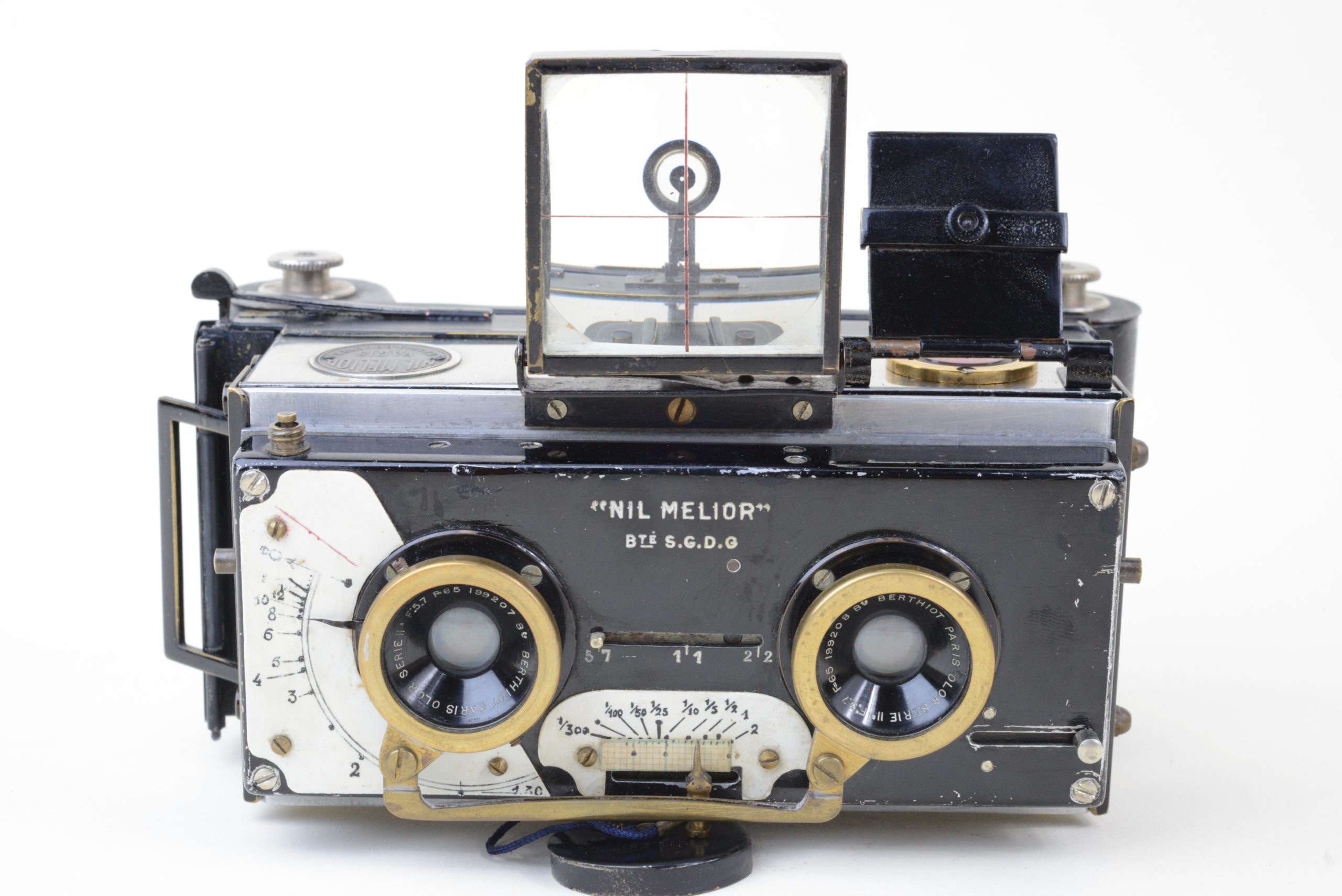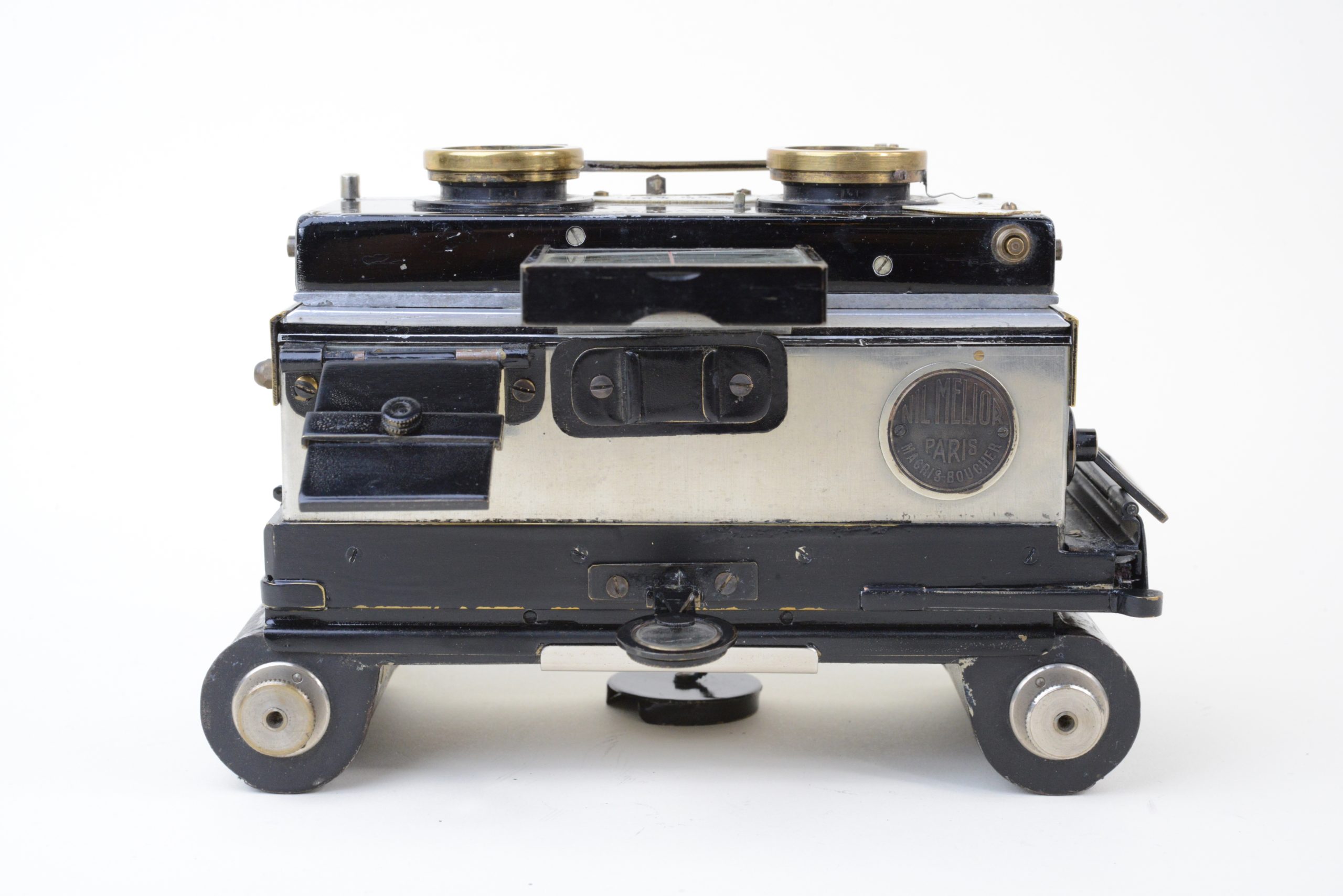 Appareil stéréoscopique 6x13 « Nil Melior » de Macris-Boucher.  Encore utilisable, il est muni d’un dos film amovible  (film 120). L’appareil a fait l’objet de perfectionnements en atelier, notamment les systèmes de réglage de la distance et des vitesses afin de rendre plus précise la mise au point.  L’obturateur est à double guillotine. Les objectifs sont des Olor Berthiot 1 :5,7 F=65 mm. Diaphragmes à iris couplés. Système ingénieux de renvoi, par miroir à 45°, de l’image du niveau à bulle situé sur le dessus. Cela permet un suivi simultané du réglage du niveau et de l’image dans le viseur. Vers 1925.
