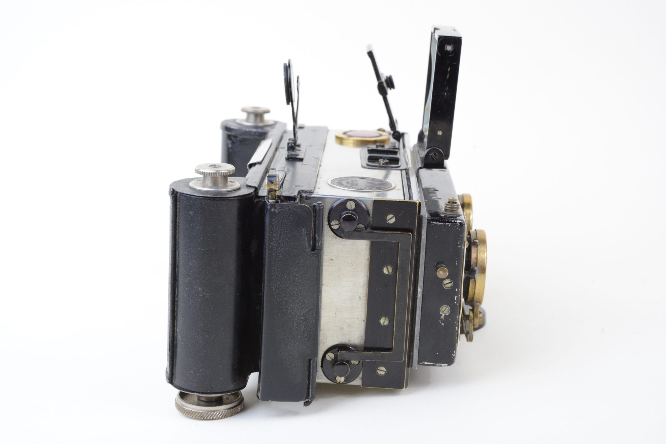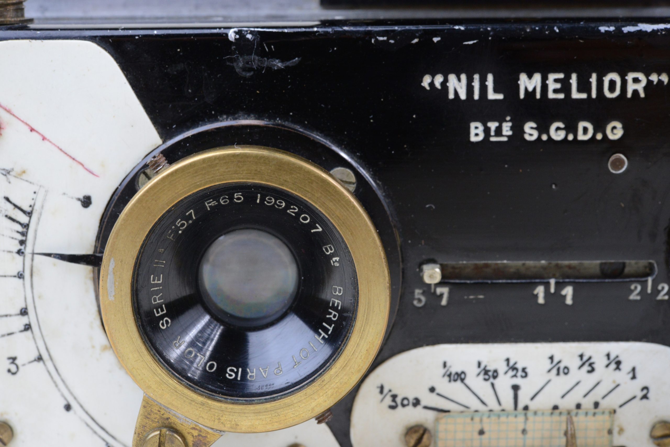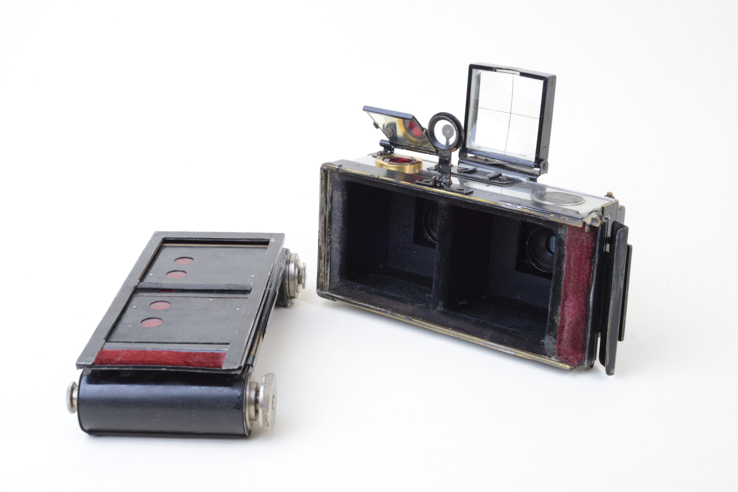 Appareil stéréoscopique 6x13 « Nil Melior » de Macris-Boucher.  Encore utilisable, il est muni d’un dos film amovible  (film 120). L’appareil a fait l’objet de perfectionnements en atelier, notamment les systèmes de réglage de la distance et des vitesses afin de rendre plus précise la mise au point.  L’obturateur est à double guillotine. Les objectifs sont des Olor Berthiot 1 :5,7 F=65 mm. Diaphragmes à iris couplés. Système ingénieux de renvoi, par miroir à 45°, de l’image du niveau à bulle situé sur le dessus. Cela permet un suivi simultané du réglage du niveau et de l’image dans le viseur. Vers 1925.