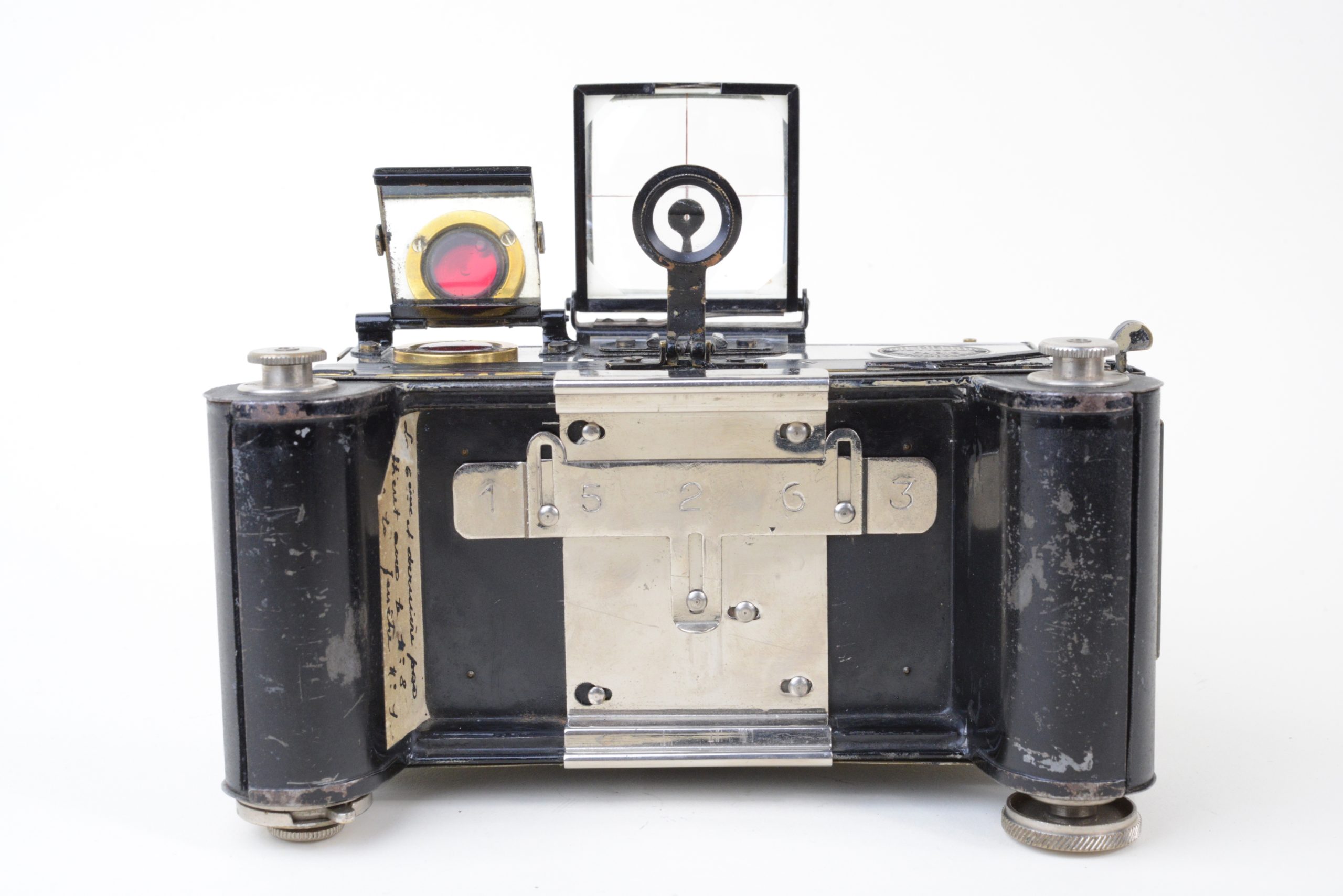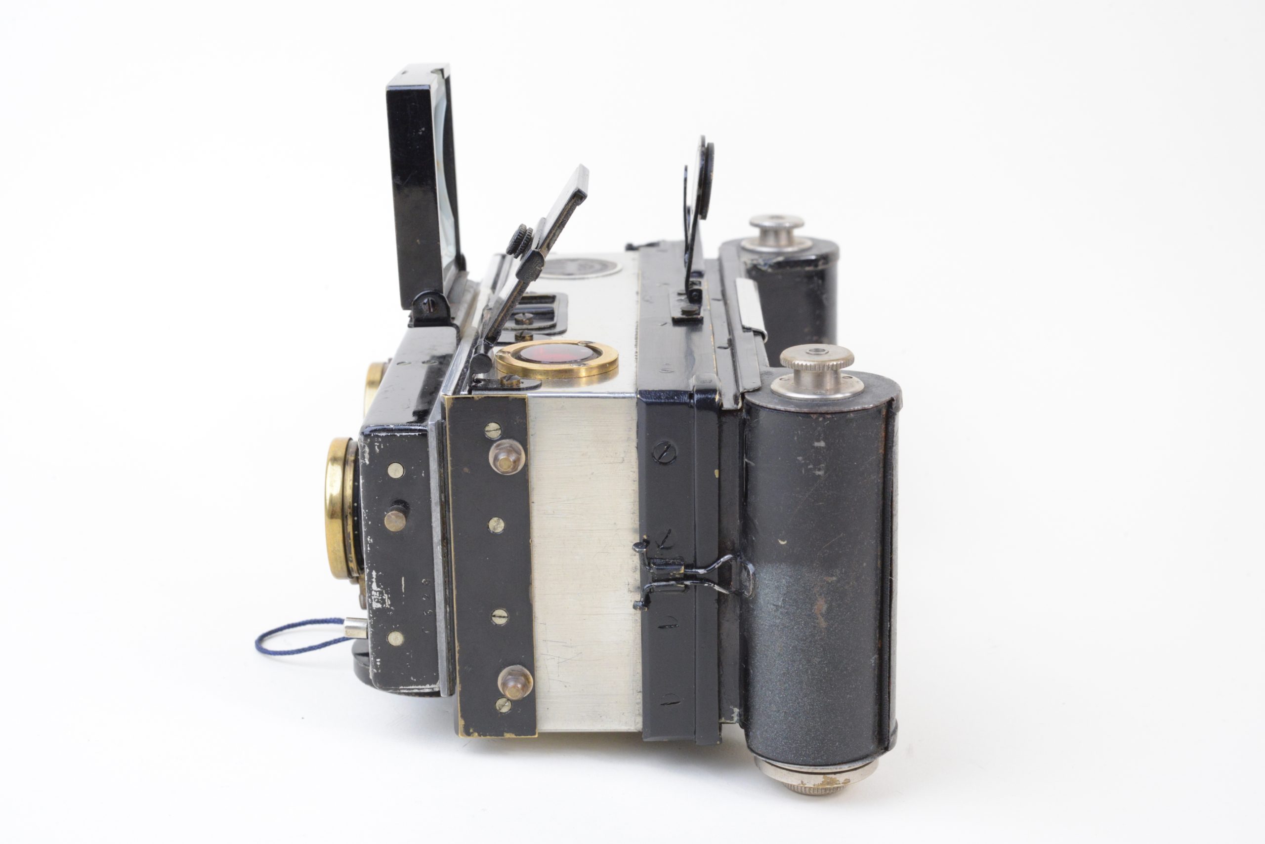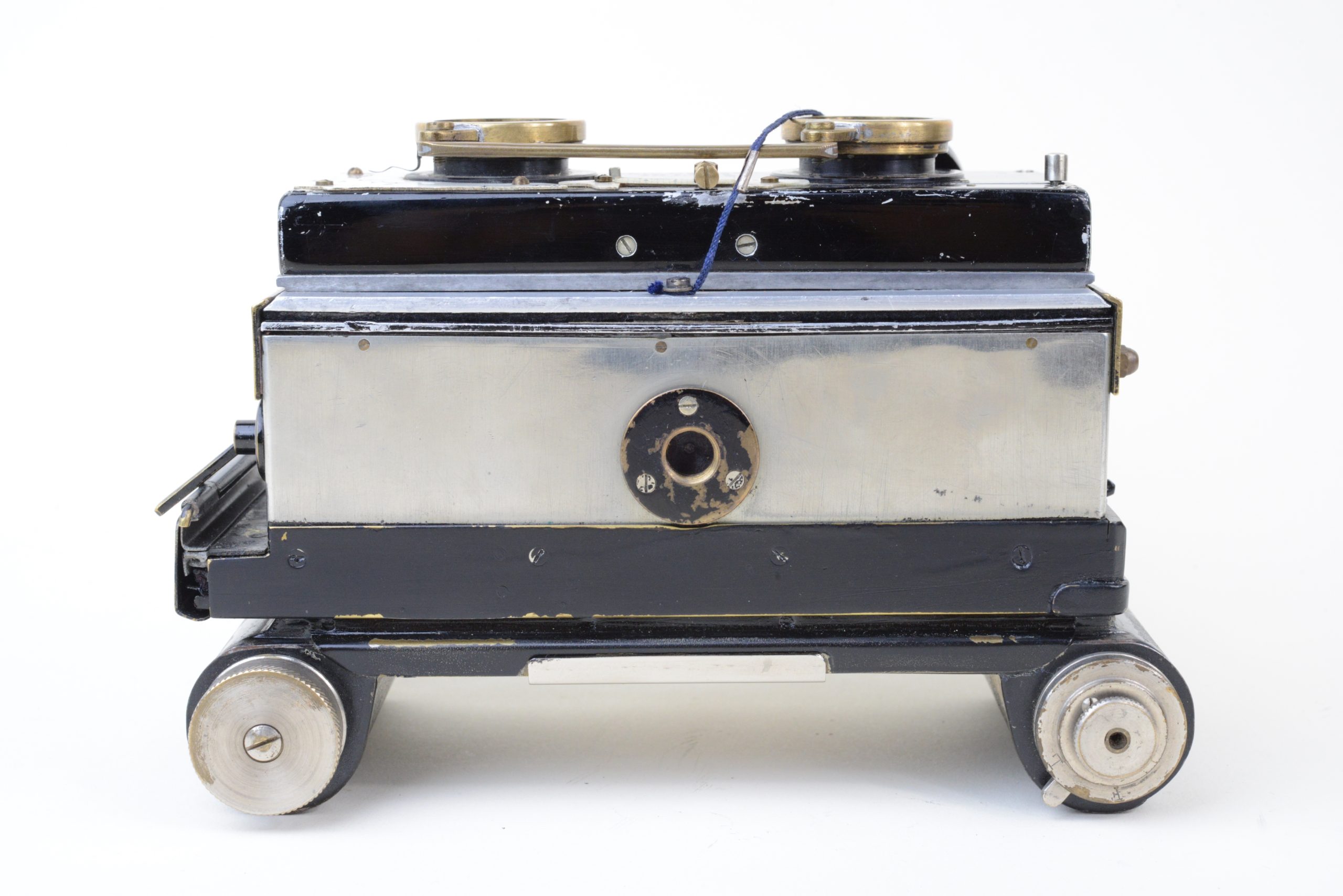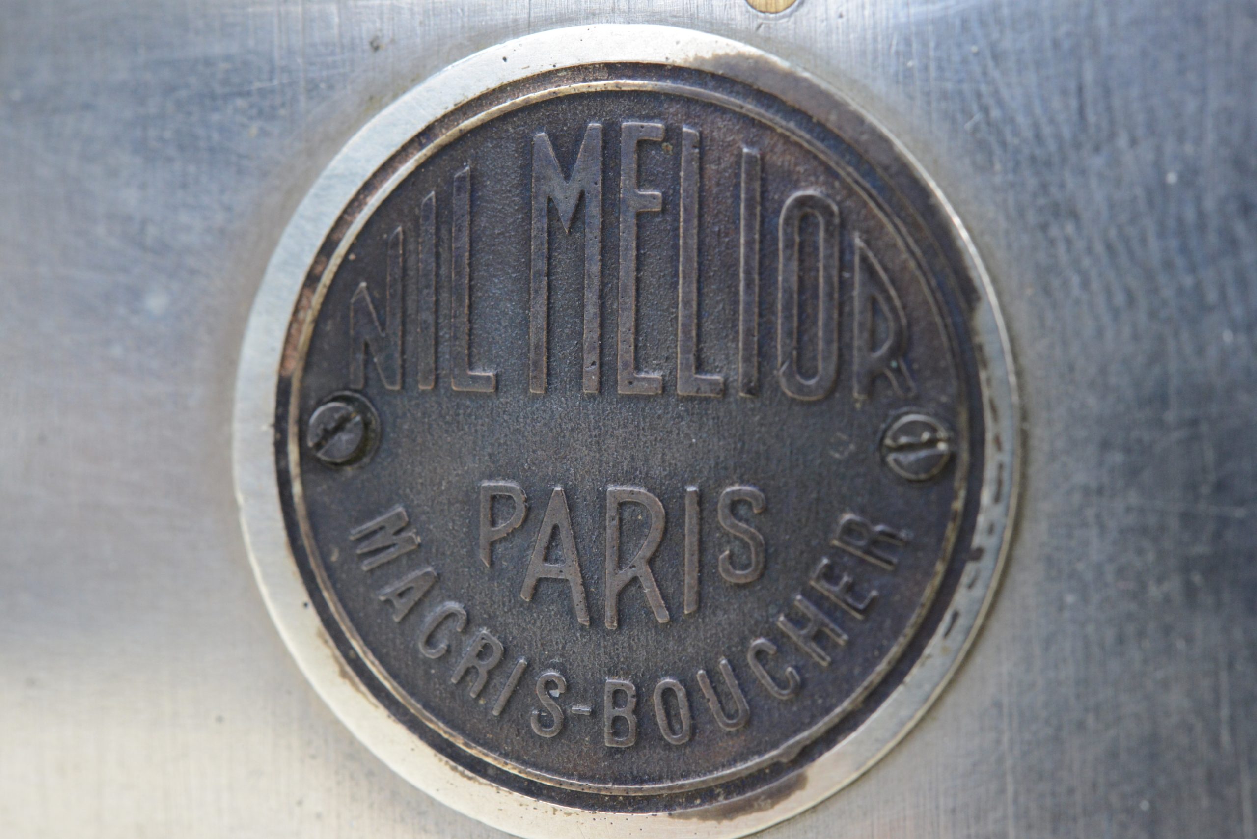 Appareil stéréoscopique 6x13 « Nil Melior » de Macris-Boucher.  Encore utilisable, il est muni d’un dos film amovible  (film 120). L’appareil a fait l’objet de perfectionnements en atelier, notamment les systèmes de réglage de la distance et des vitesses afin de rendre plus précise la mise au point.  L’obturateur est à double guillotine. Les objectifs sont des Olor Berthiot 1 :5,7 F=65 mm. Diaphragmes à iris couplés. Système ingénieux de renvoi, par miroir à 45°, de l’image du niveau à bulle situé sur le dessus. Cela permet un suivi simultané du réglage du niveau et de l’image dans le viseur. Vers 1925.