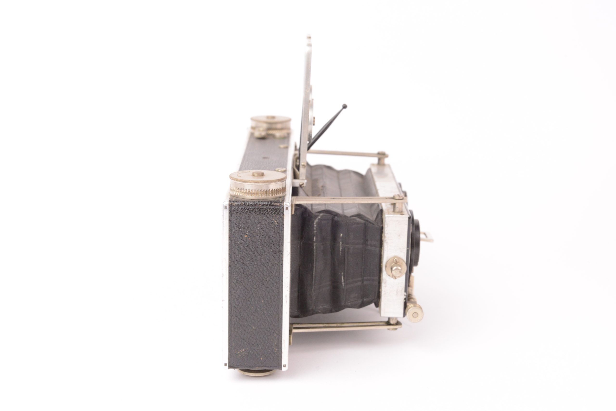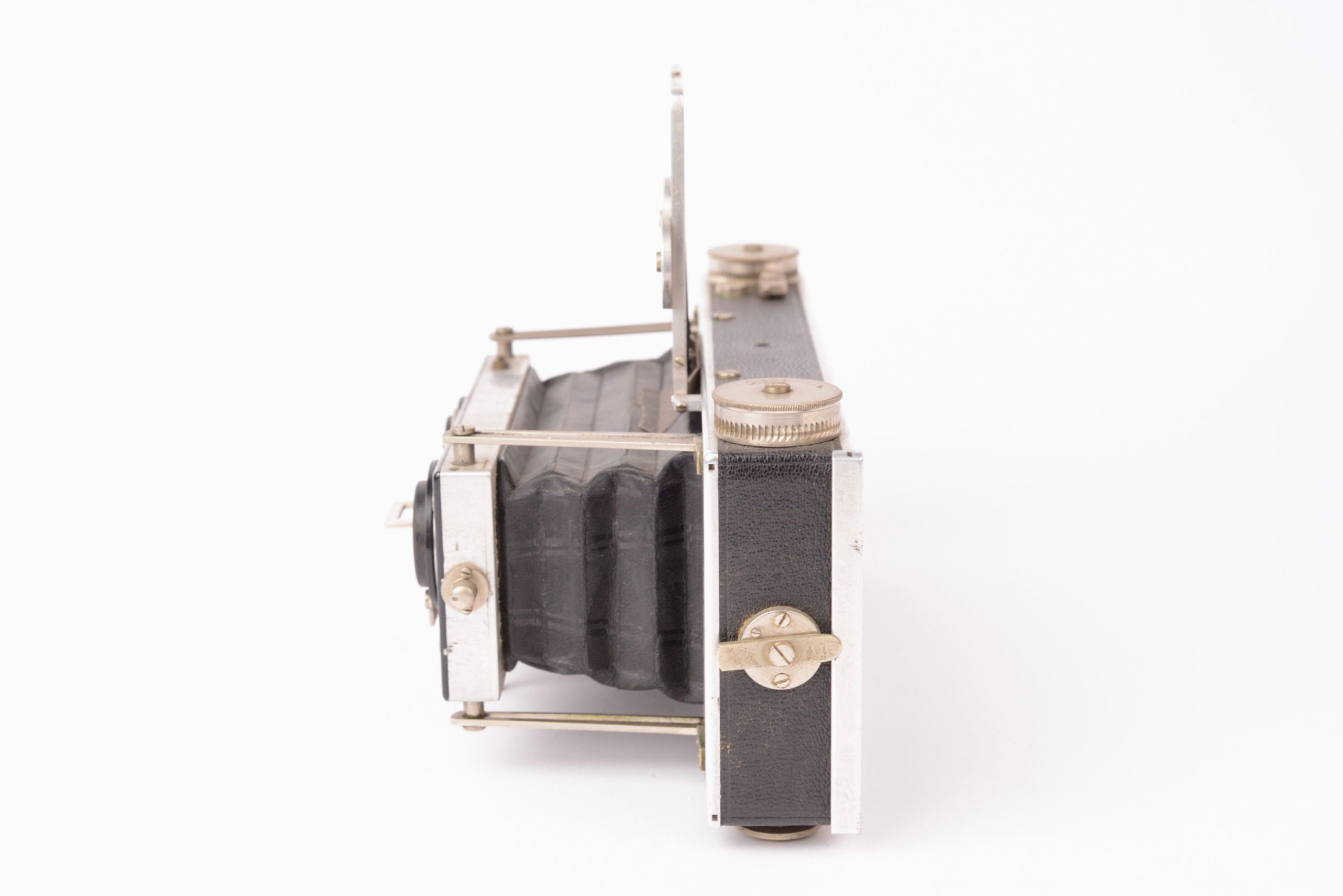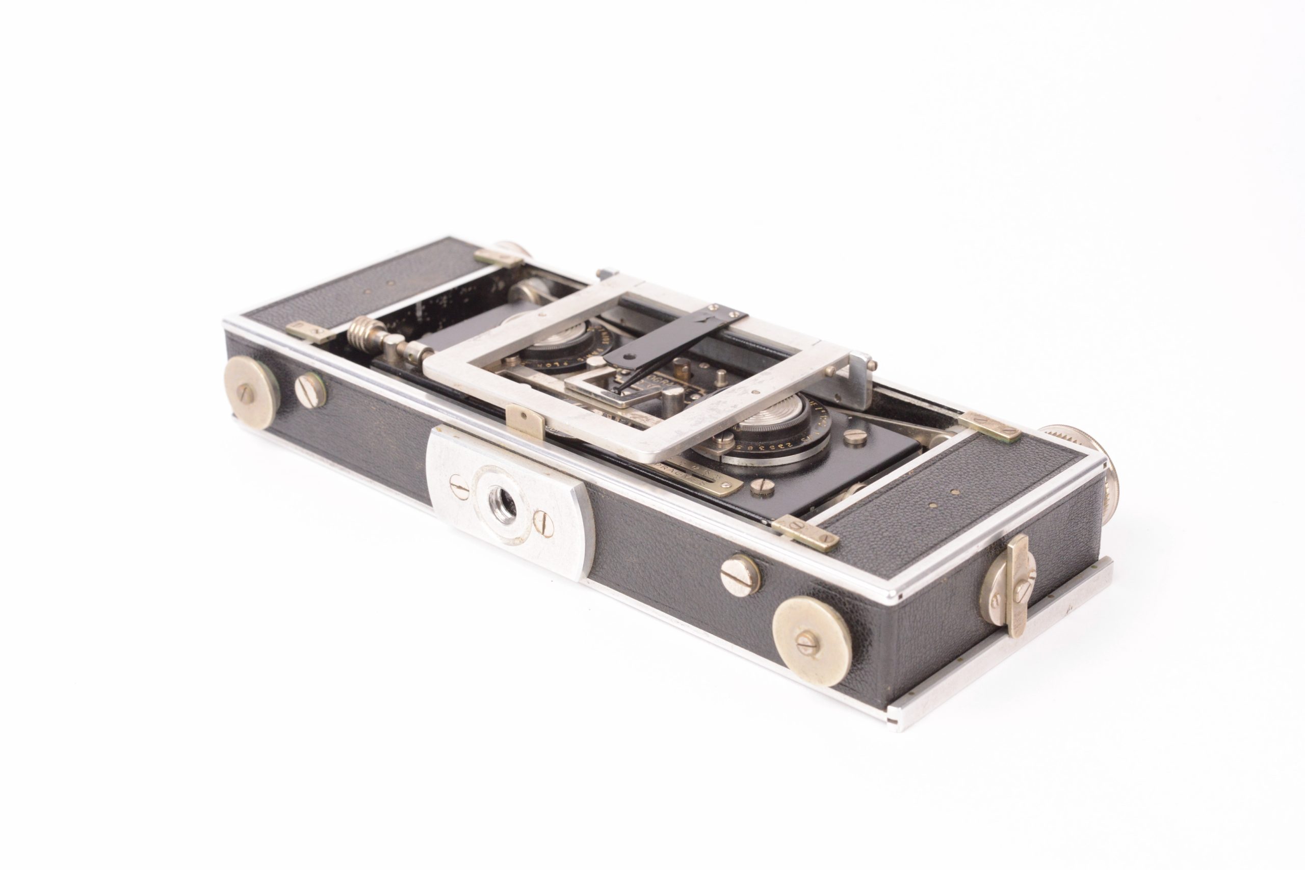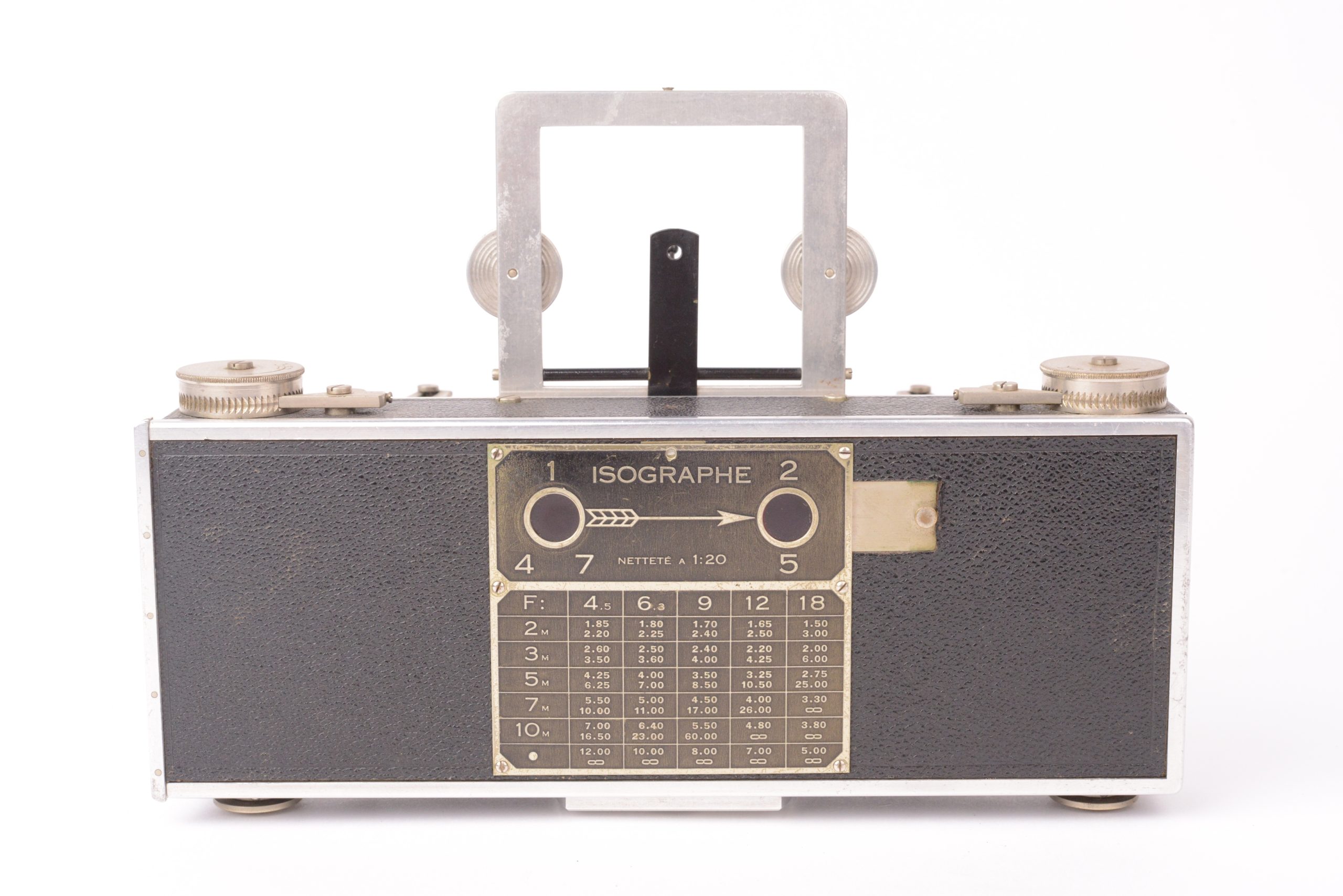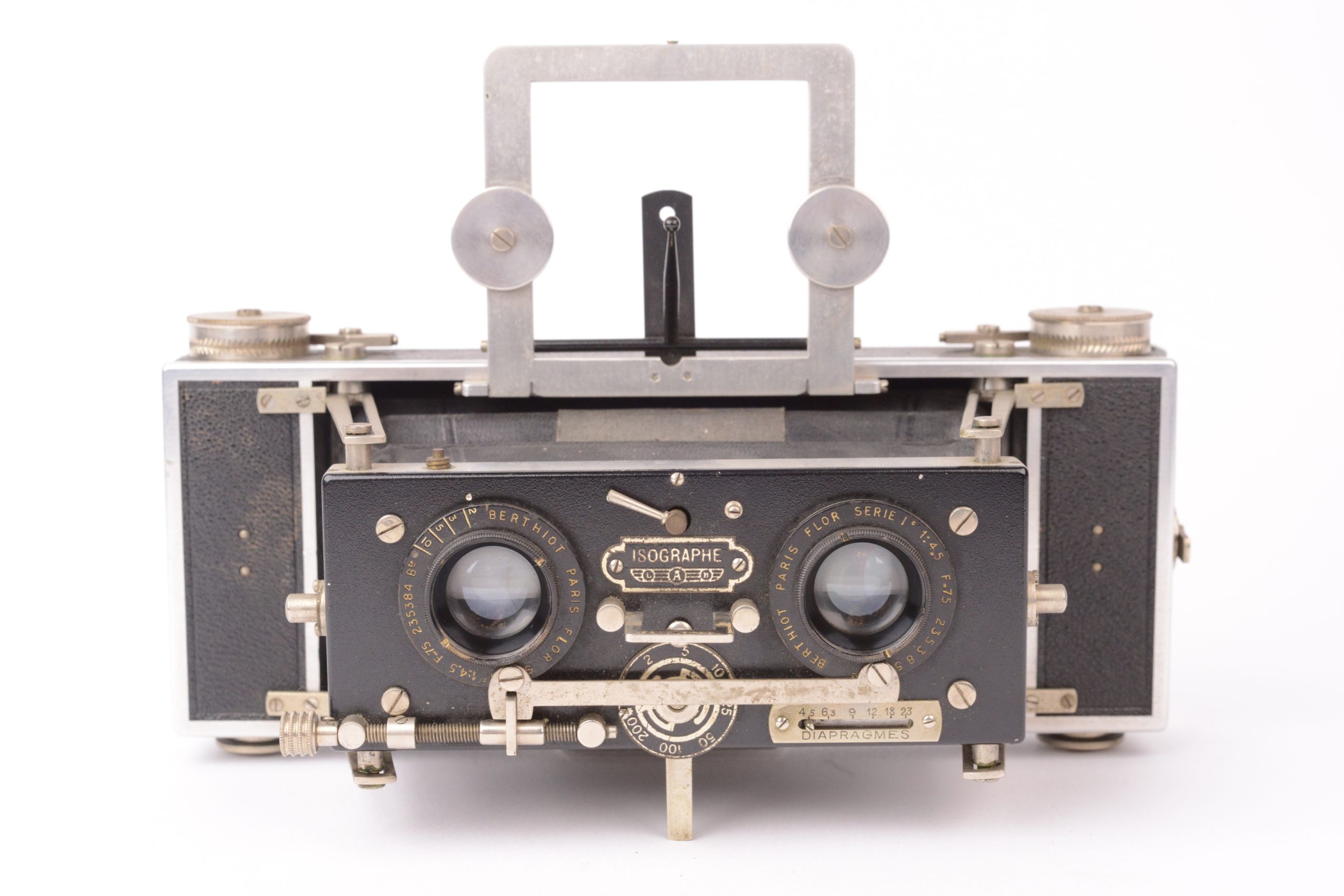 Appareil stéréoscopique Isographe de Baudry pour film 120 au format 6x13. Ce modèle figure dans un catalogue de 1936. Gainé maroquin fin. Netteté à pleine ouverture de 4m. à l’infini. Viseur à cadre. Écrou de pied au Congrès. Décentrement de 9 mm en hauteur. Diaphragme à iris commandé par bielle. Obturateur 1/200<sup>ème</sup>. A la différence des modèles antérieurs de 1930, ce modèle n’est pas à mise au point fixe. Il est doté d’une possibilité de mise au point micrométrique par molette agissant sur une vis sans fin actionnant la rotation des lentilles frontales. Objectif Berthiot Flor 1 :4,5 de 75 mm. Dimensions fermées : 200x90x32 mm. Poids 700 gr. Table de profondeur de champ à l’arrière du dos film. Très bel état cosmétique et fonctionnel. Pièce de collection peu courante.