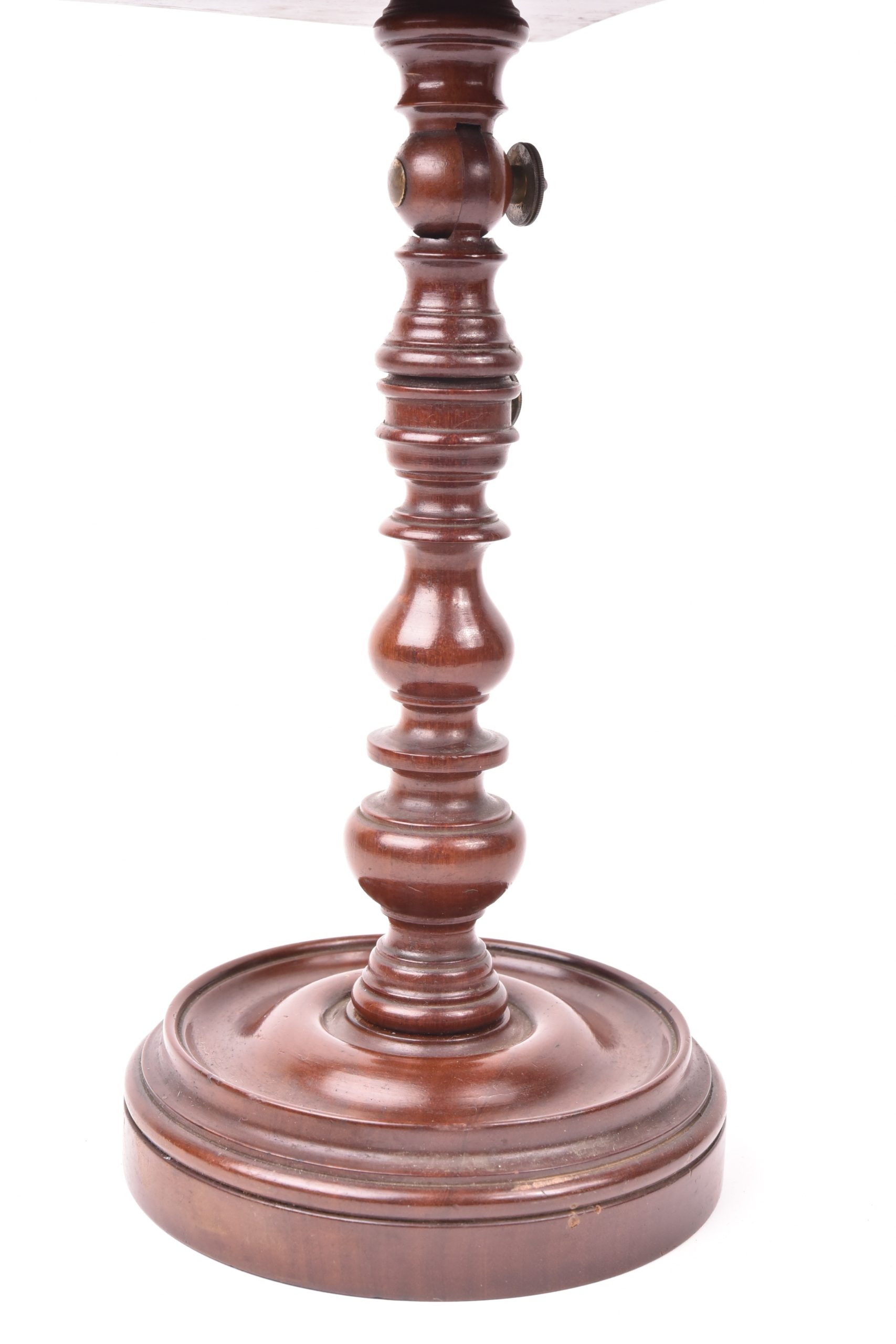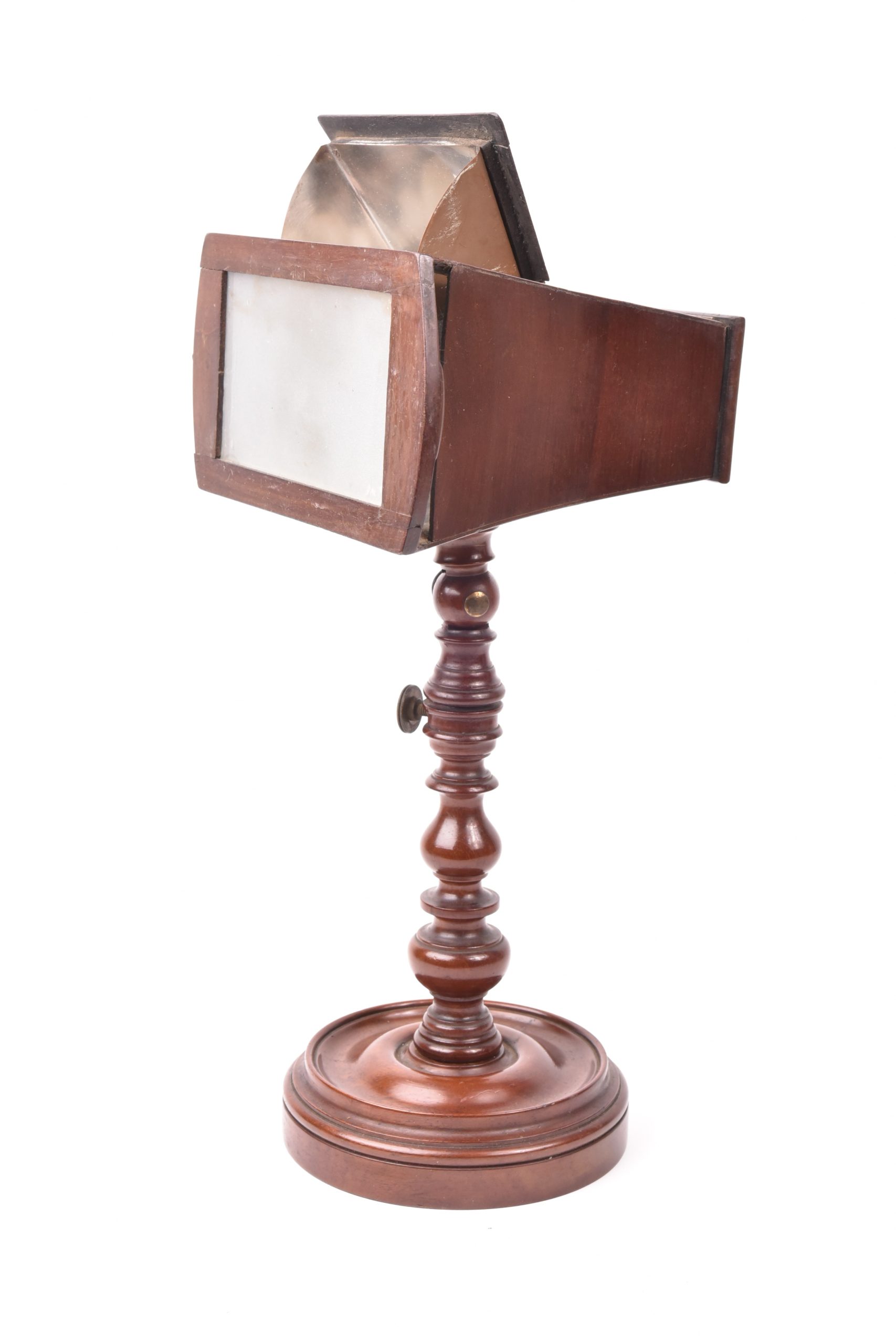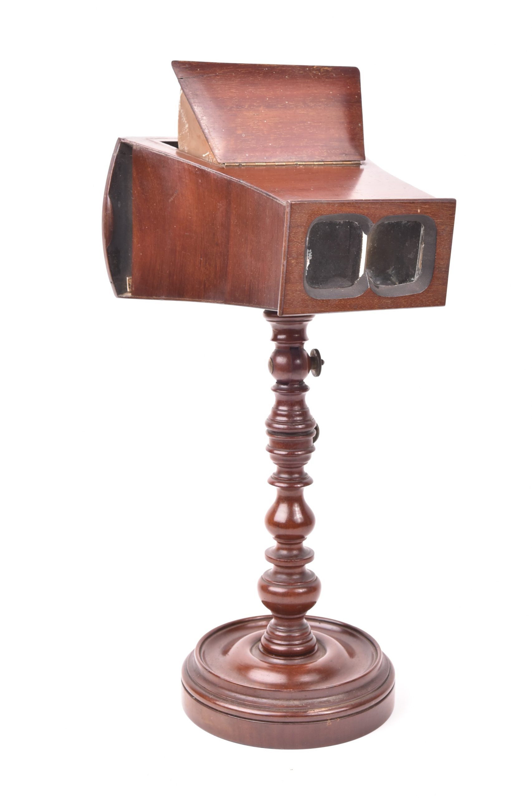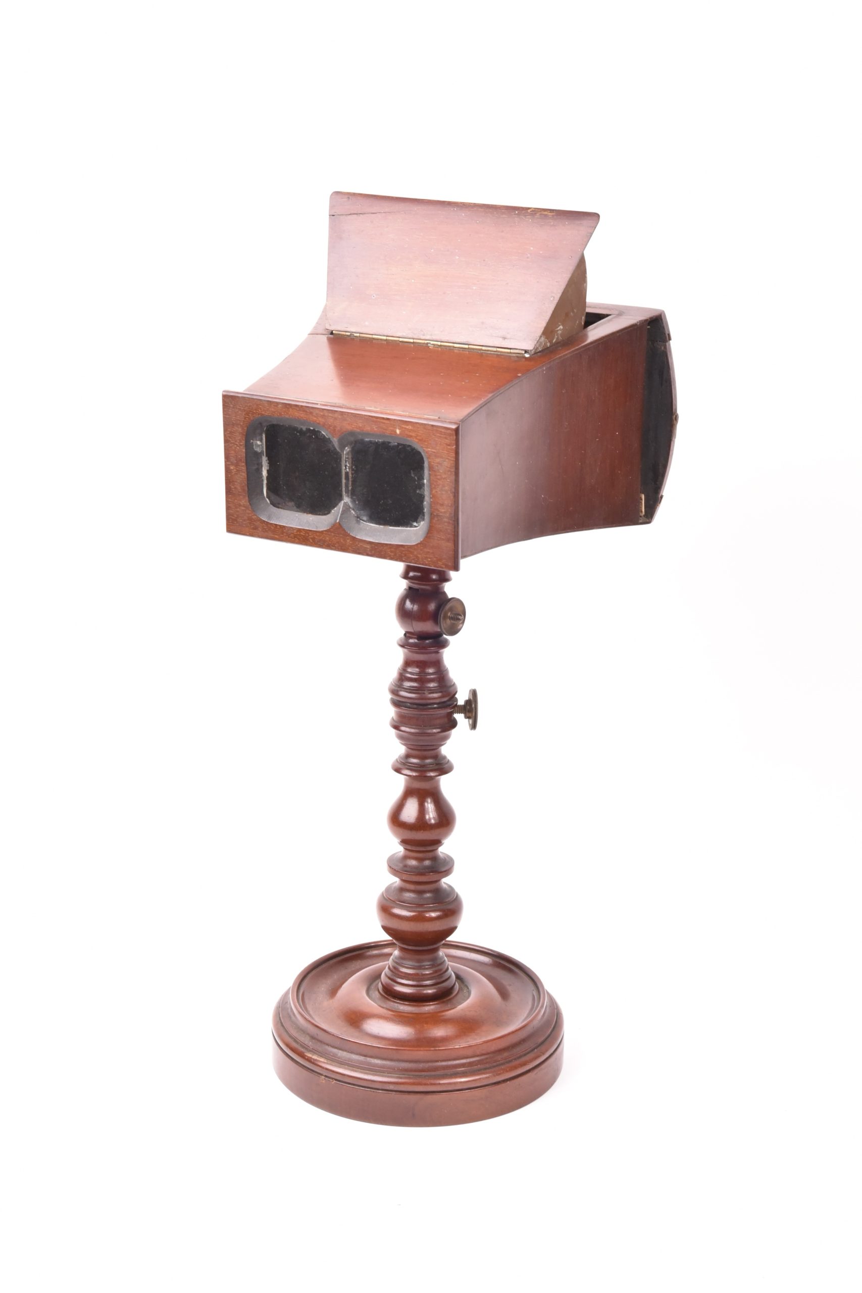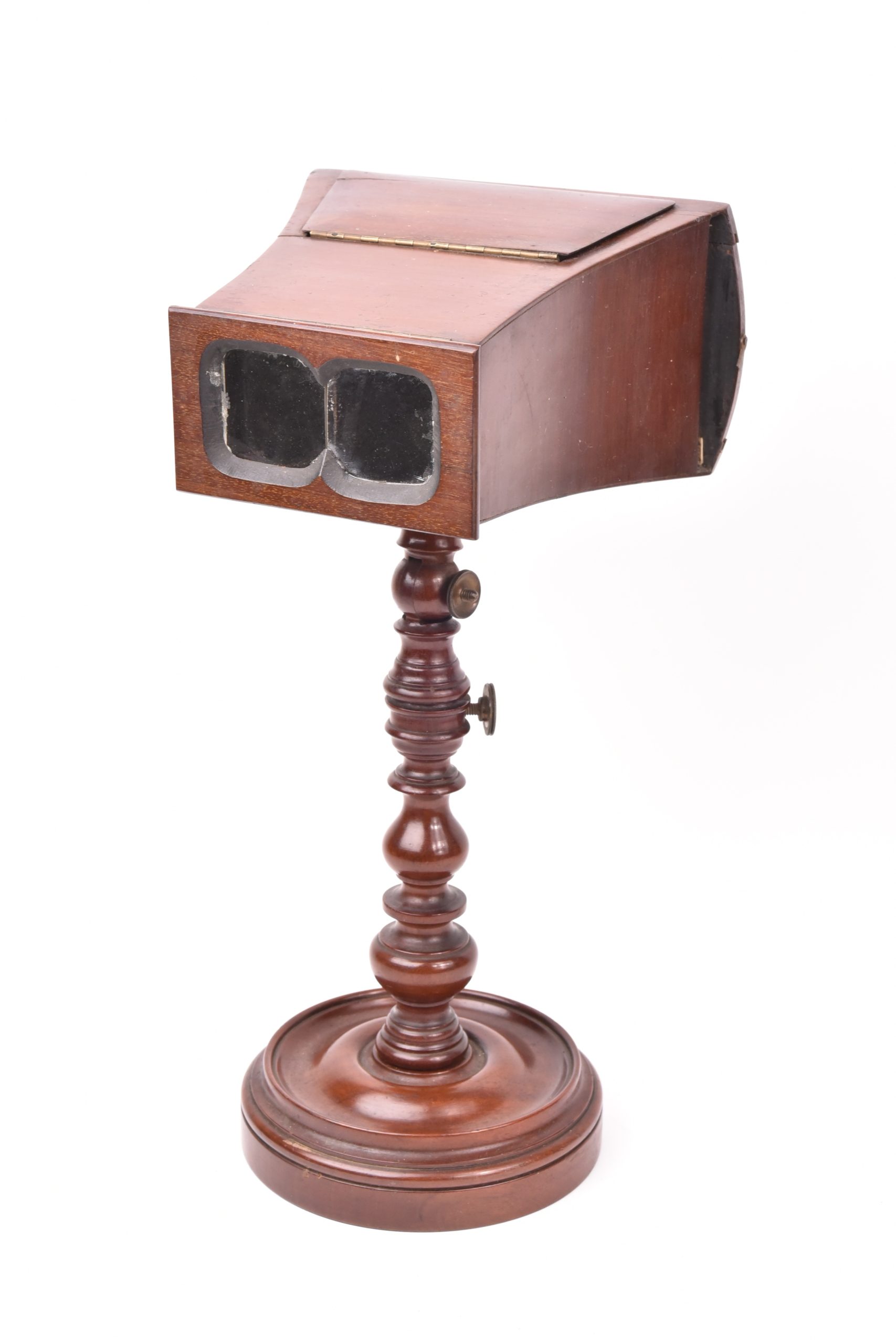 Brewster type stereoscope mounted on an articulated foot in turned wood. The foot is adjustable in height and comes with its base. The whole viewer is made of walnut wood. An adjustable mirror on the top serves for the observation of stereo views on paper. Very modular, nice condition. End of the XIXth century. Small crack on the wooden cover of the tilting mirror.