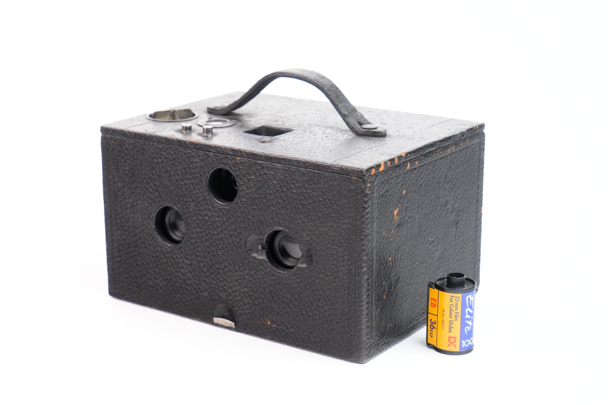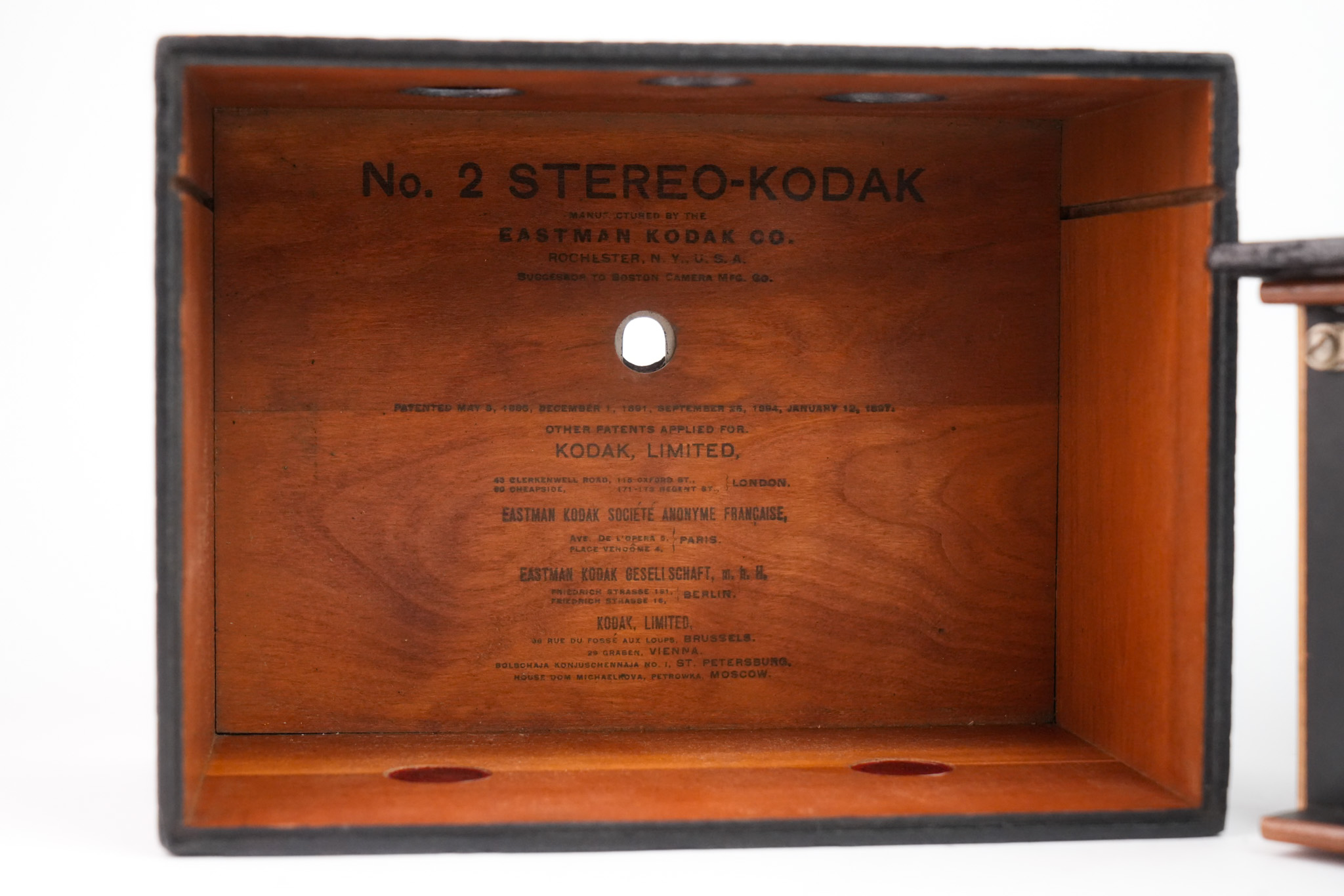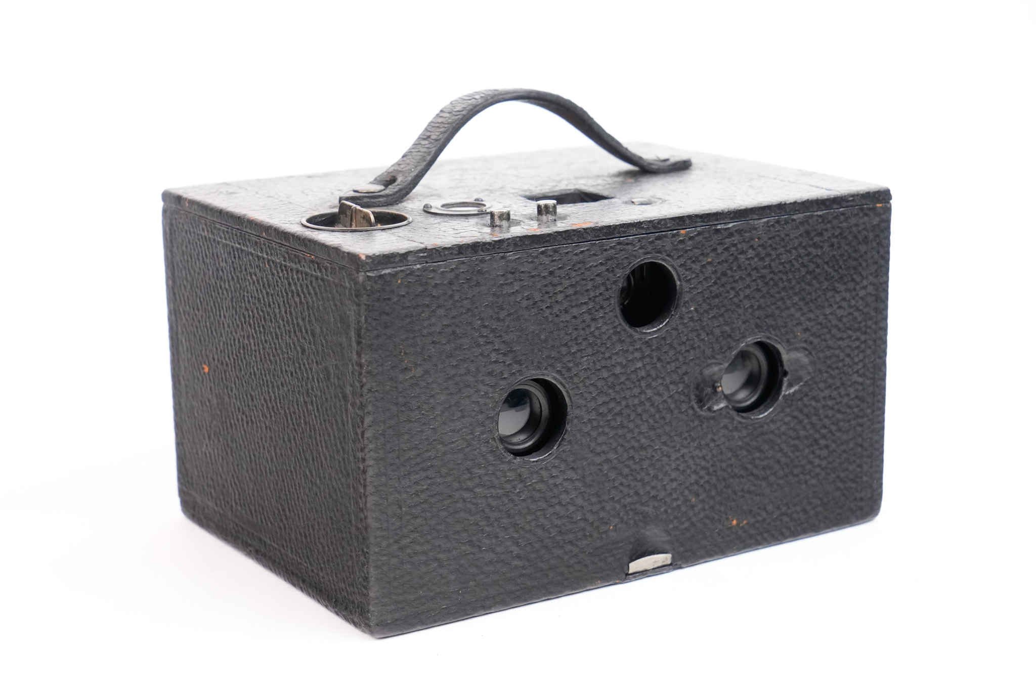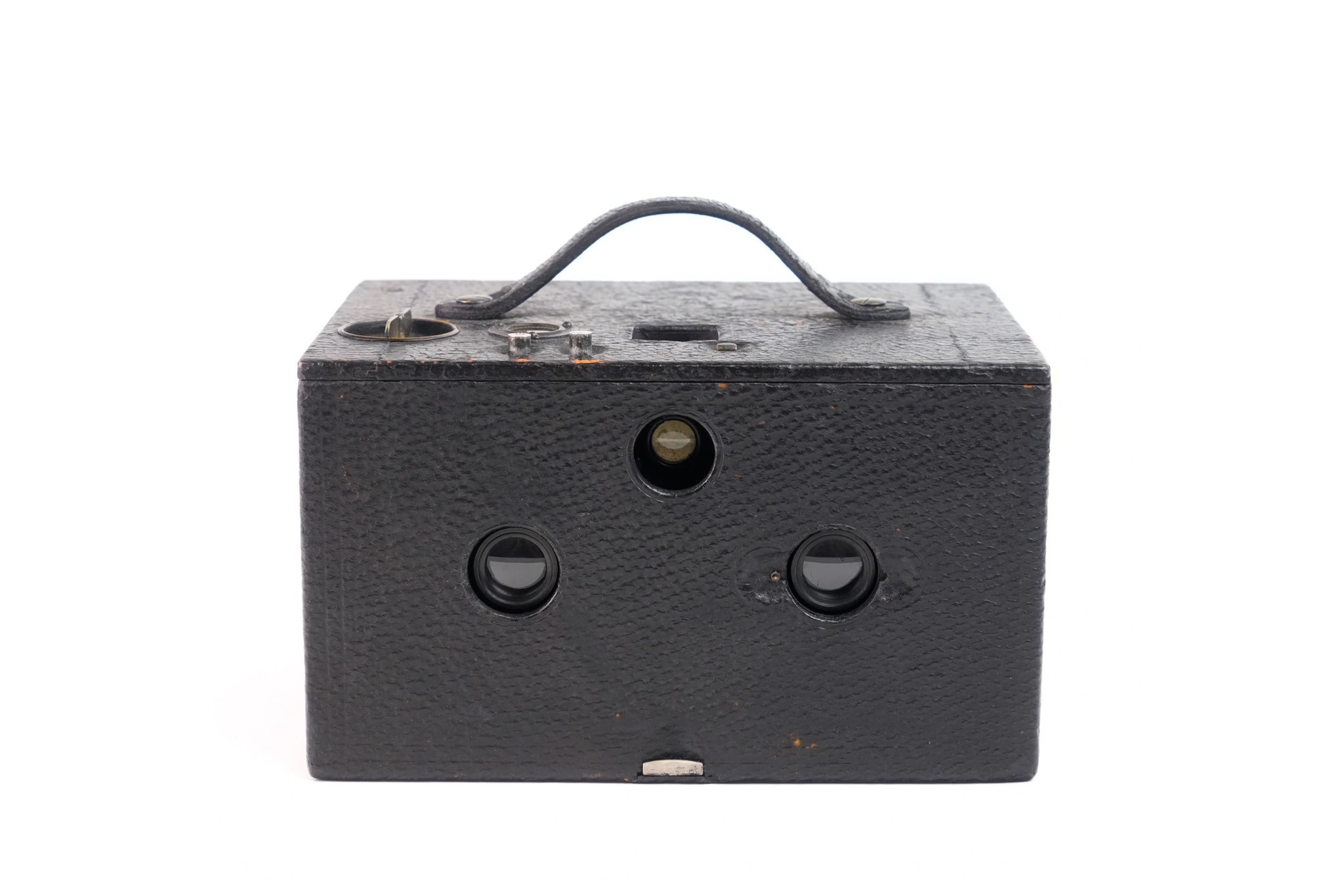 L’appareil photo stéréo Kodak n° 2, est produit par Eastman Kodak entre 1901 et 1905. D’apparence proche du modèle Bulls-Eye de la même marque, il se distingue par son double objectif rectiligne rapide associé à une version modifiée de l’obturateur Eastman, permettant la prise de vues stéréoscopiques sur film en cartouche. Chaque chargement autorise jusqu’à six clichés au format 8,9 × 15,2 cm, produisant des images destinées à être vues en relief. L’appareil peut également fonctionner en mode monoscopique grâce à un cache amovible sur l’un des objectifs, témoignant d’une certaine polyvalence. Équipé de trois diaphragmes, d’un viseur lumineux, d’un niveau à bulle et d’un pas de vis pour trépied, il combine simplicité d’usage et précision technique. Compact pour son époque (12,1 × 15,2 × 20,6 cm) et relativement léger (992 g), il était commercialisé au prix de 15 dollars, reflétant la stratégie de démocratisation de la photographie menée par Kodak au début du XXe siècle. Rare.
