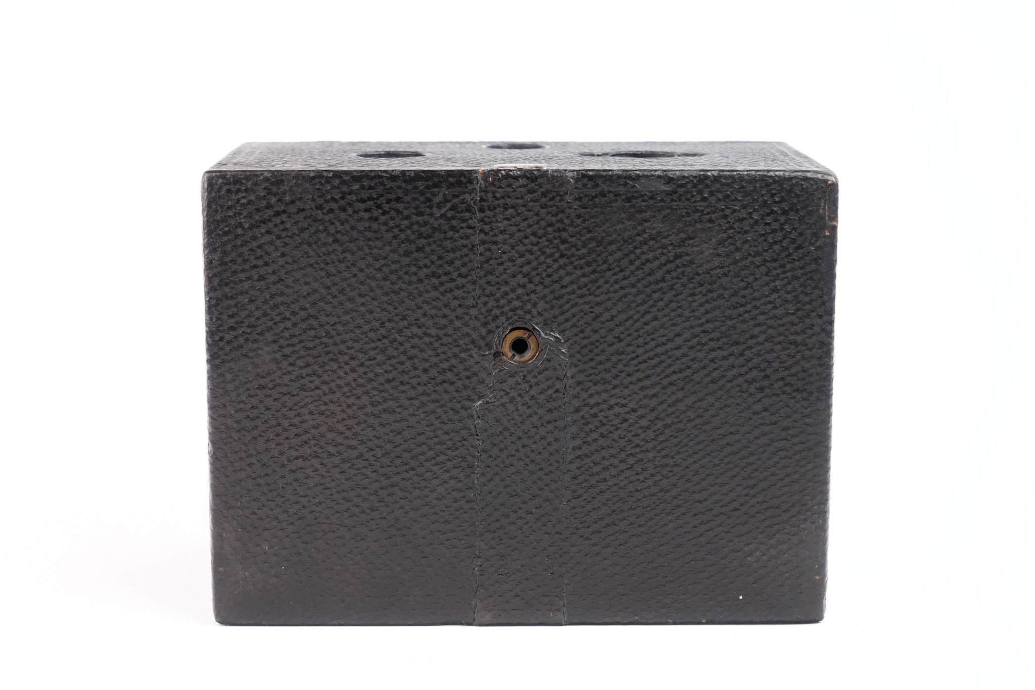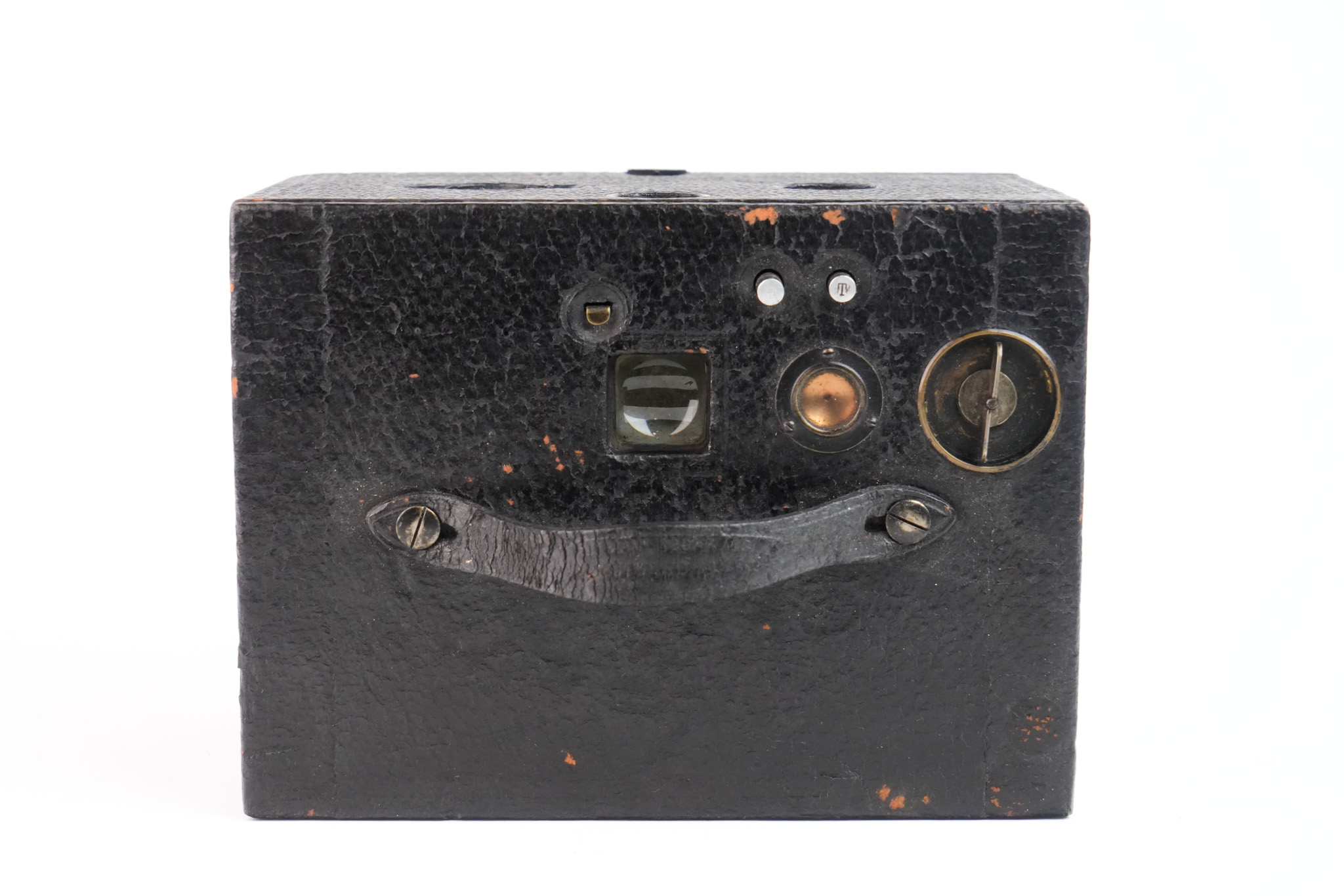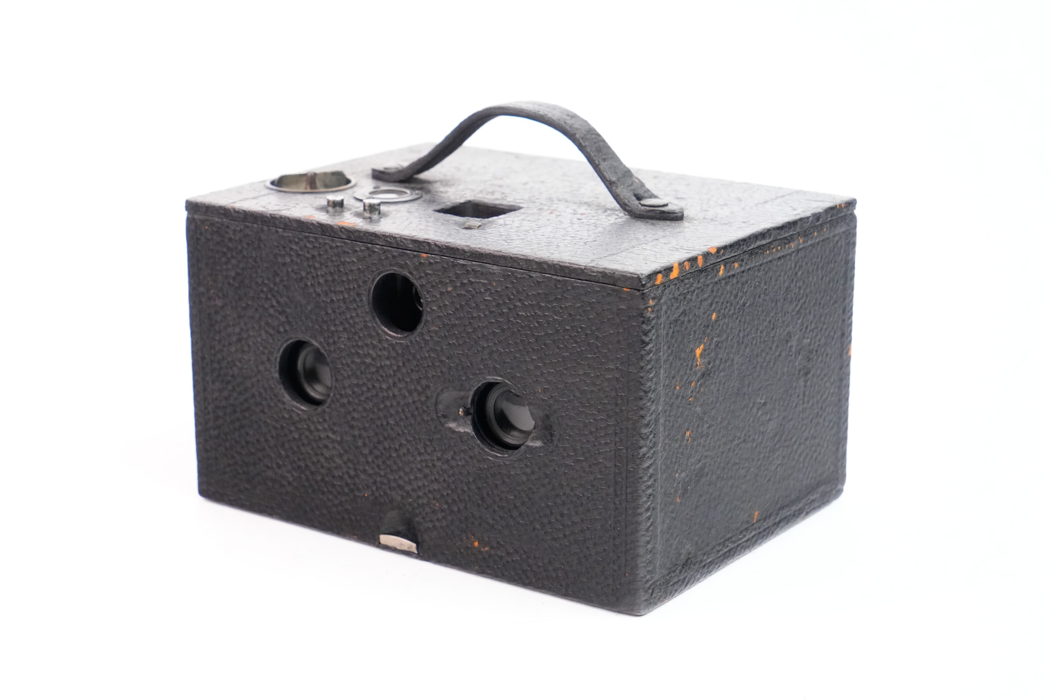 L’appareil photo stéréo Kodak n° 2, est produit par Eastman Kodak entre 1901 et 1905. D’apparence proche du modèle Bulls-Eye de la même marque, il se distingue par son double objectif rectiligne rapide associé à une version modifiée de l’obturateur Eastman, permettant la prise de vues stéréoscopiques sur film en cartouche. Chaque chargement autorise jusqu’à six clichés au format 8,9 × 15,2 cm, produisant des images destinées à être vues en relief. L’appareil peut également fonctionner en mode monoscopique grâce à un cache amovible sur l’un des objectifs, témoignant d’une certaine polyvalence. Équipé de trois diaphragmes, d’un viseur lumineux, d’un niveau à bulle et d’un pas de vis pour trépied, il combine simplicité d’usage et précision technique. Compact pour son époque (12,1 × 15,2 × 20,6 cm) et relativement léger (992 g), il était commercialisé au prix de 15 dollars, reflétant la stratégie de démocratisation de la photographie menée par Kodak au début du XXe siècle. Rare.