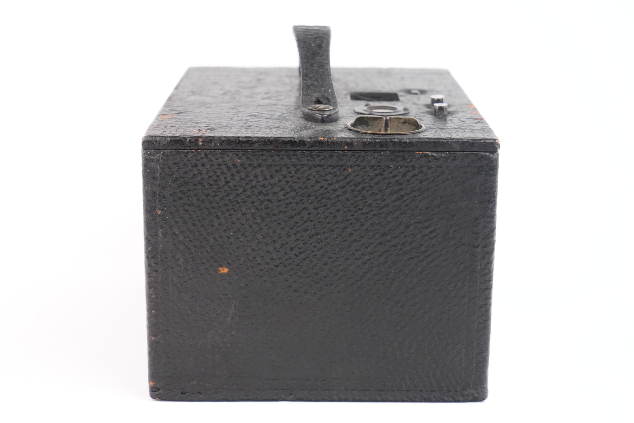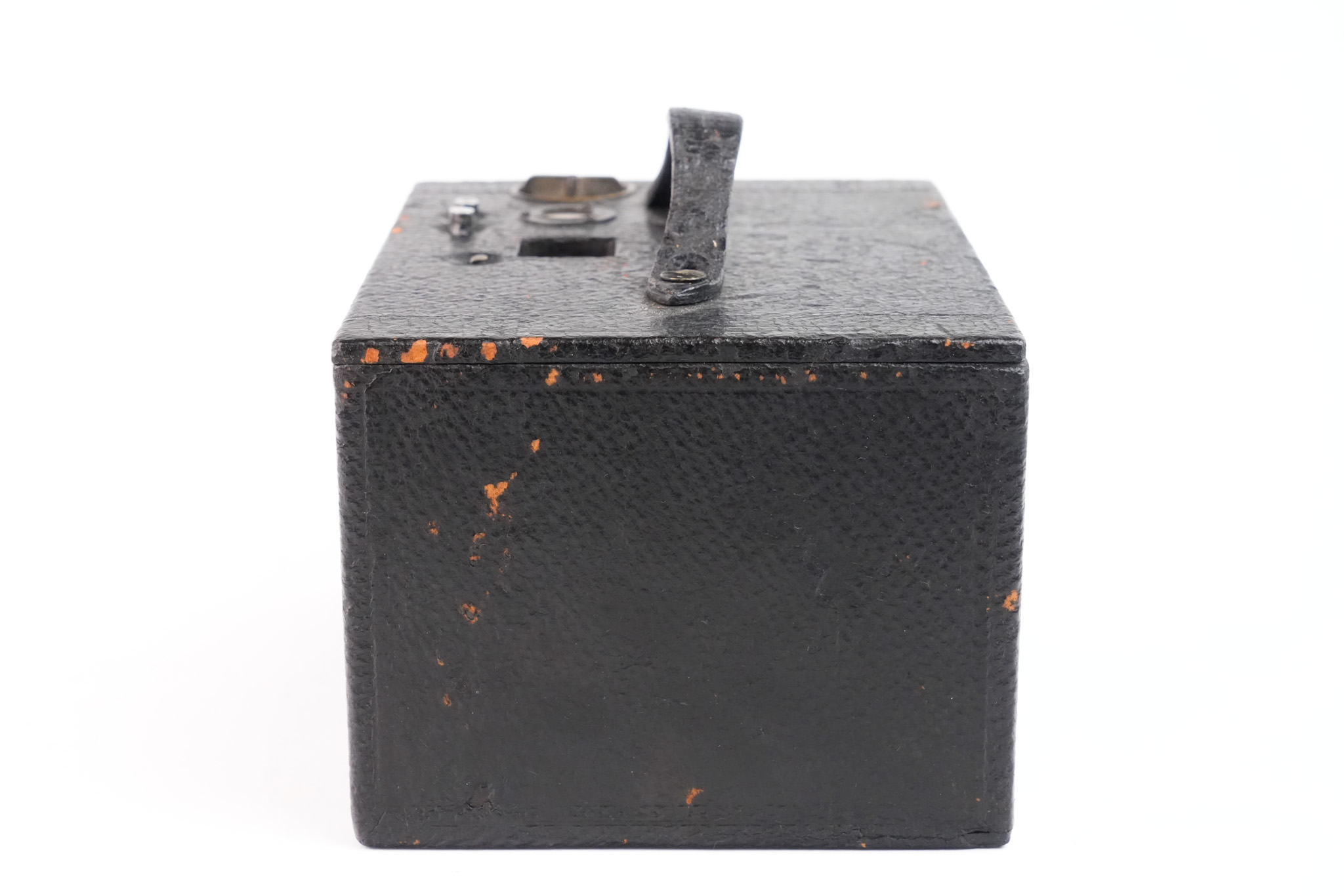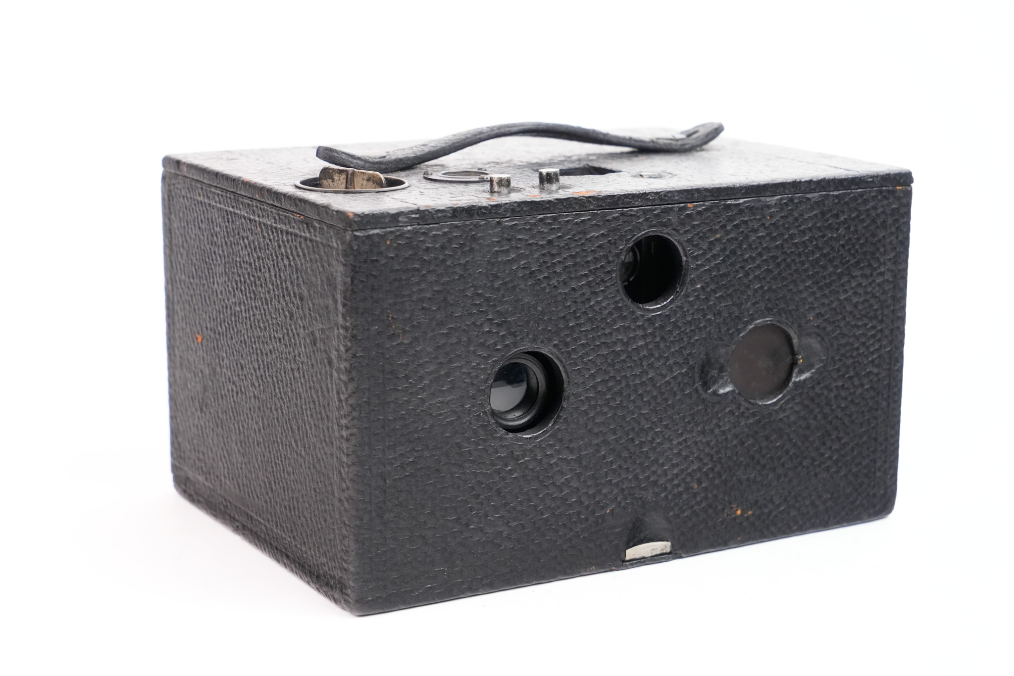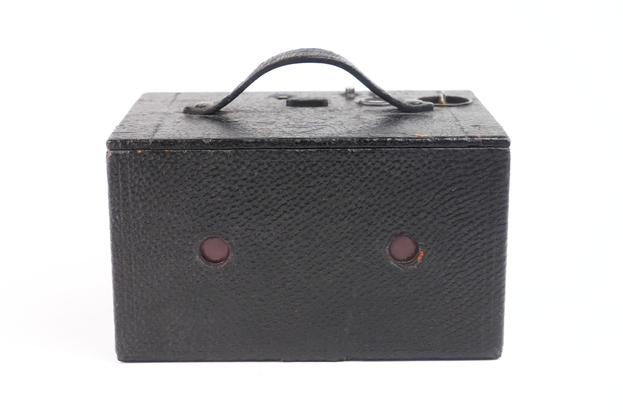 L’appareil photo stéréo Kodak n° 2, est produit par Eastman Kodak entre 1901 et 1905. D’apparence proche du modèle Bulls-Eye de la même marque, il se distingue par son double objectif rectiligne rapide associé à une version modifiée de l’obturateur Eastman, permettant la prise de vues stéréoscopiques sur film en cartouche. Chaque chargement autorise jusqu’à six clichés au format 8,9 × 15,2 cm, produisant des images destinées à être vues en relief. L’appareil peut également fonctionner en mode monoscopique grâce à un cache amovible sur l’un des objectifs, témoignant d’une certaine polyvalence. Équipé de trois diaphragmes, d’un viseur lumineux, d’un niveau à bulle et d’un pas de vis pour trépied, il combine simplicité d’usage et précision technique. Compact pour son époque (12,1 × 15,2 × 20,6 cm) et relativement léger (992 g), il était commercialisé au prix de 15 dollars, reflétant la stratégie de démocratisation de la photographie menée par Kodak au début du XXe siècle. Rare.