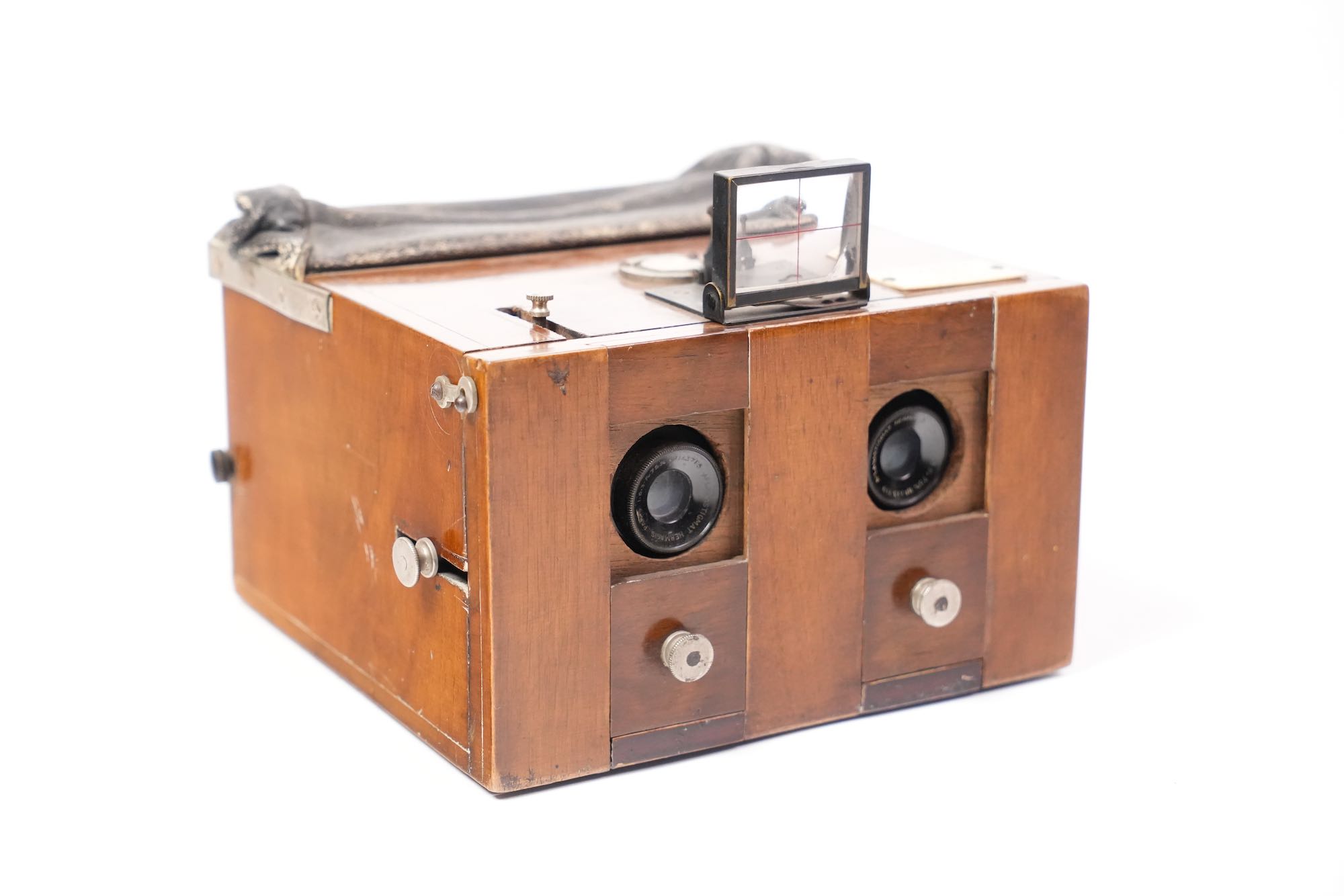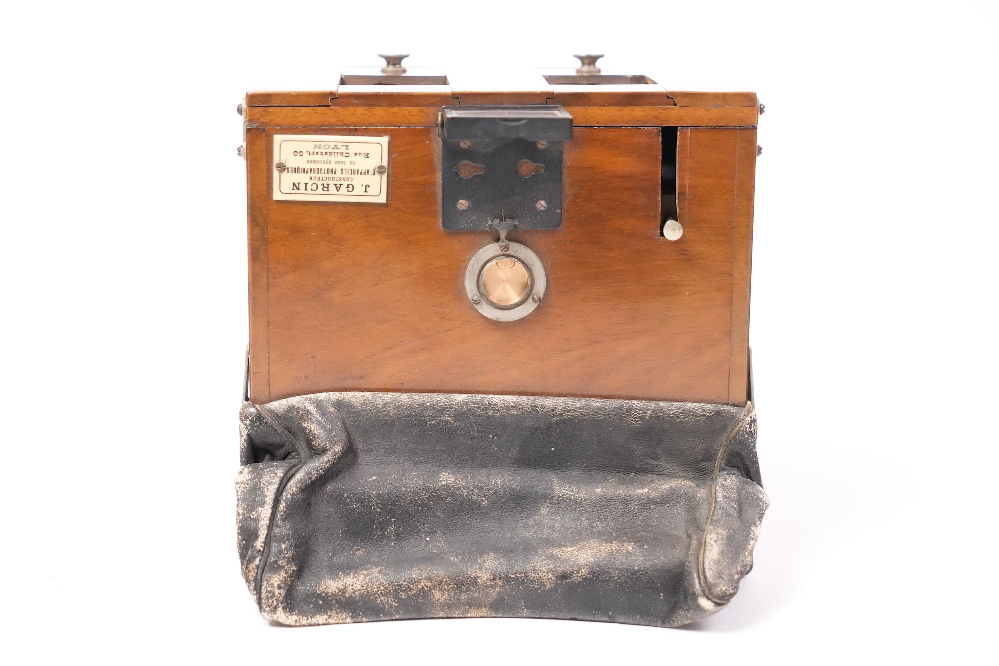 J. Garcin, « Le Multiple », Lyon, c. 1895–1905 — Appareil photographique stéréoscopique de salon sur plaques, boîtier en bois verni avec viseur cadre rabattable sur le dessus ,un manchon en cuir pour le changement de plaque; façade à deux objectifs jumelés (optique française) et commandes frontales de prise de vue, chaque objectif protégé sur un petit panneau vertical; système d’obturation interne ; plaque du constructeur « J. Garcin, constructeur d’appareils photographiques, Lyon »