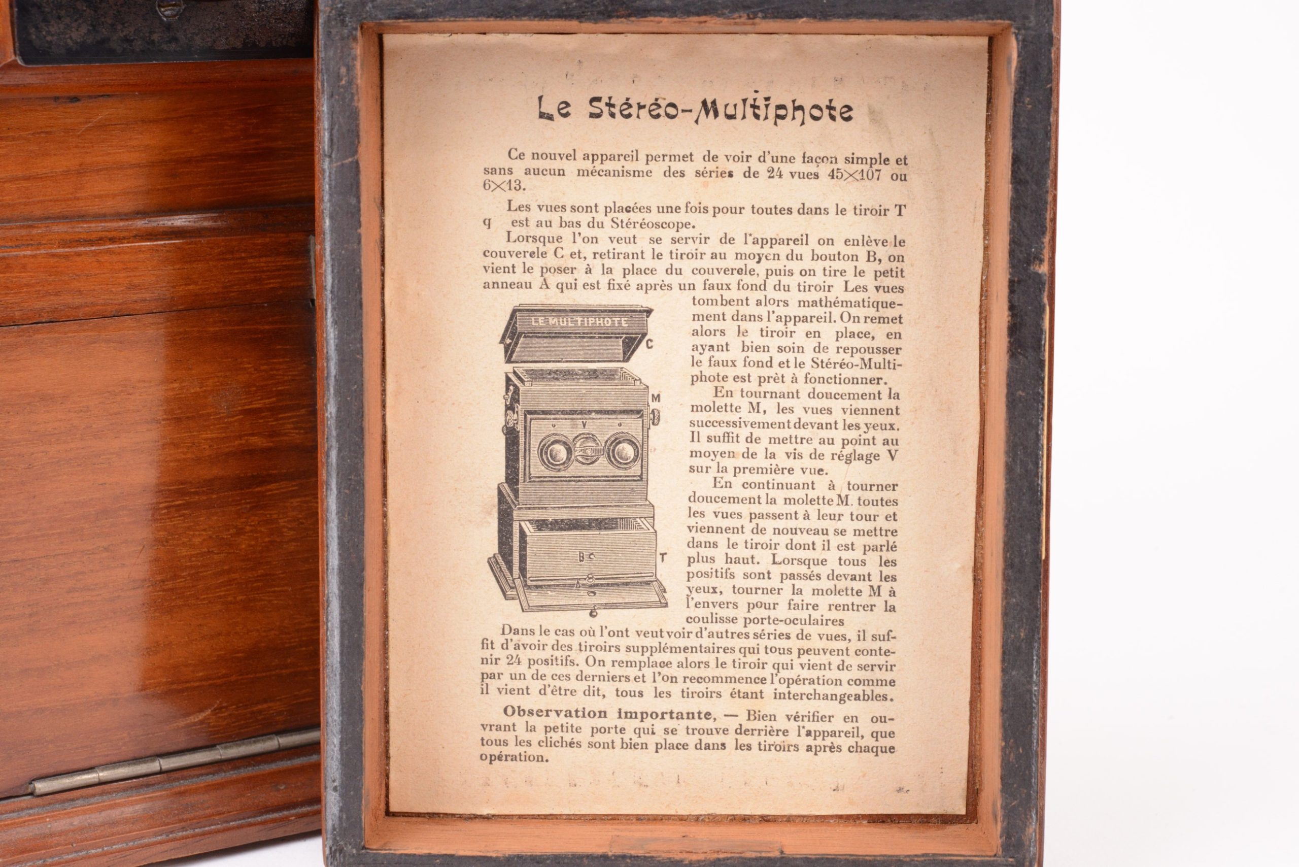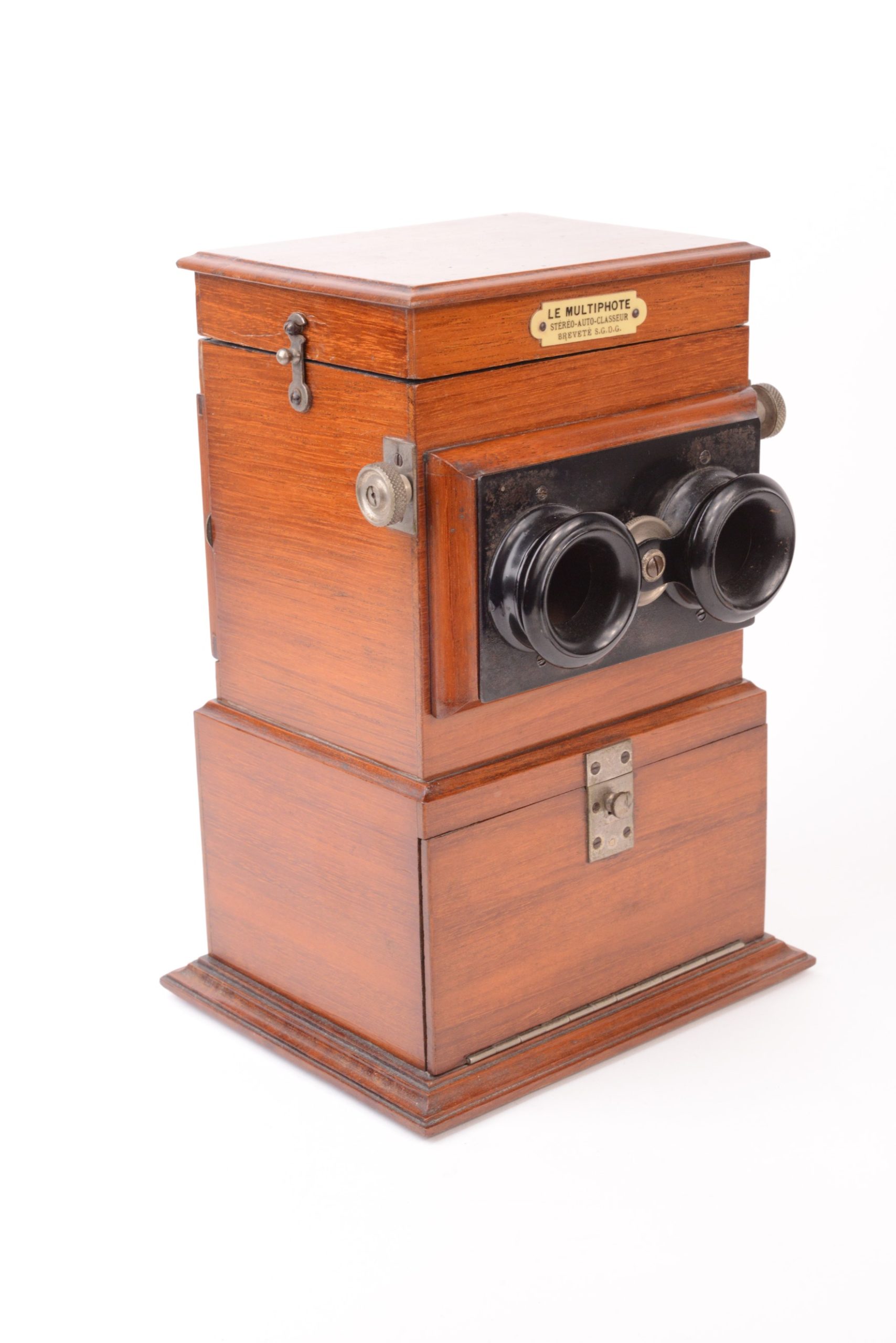 Le Multiphote est un stéréoscope pour 24 vues 45x107 est fabriqué par Lucien Bize puis Robert Pleyau successeur. Il est commercialisé en 1907. Un magasin classeur, fermé par un couvercle et situé en haut de l’appareil, contient 24 vues. Au fur et à mesure de leur examen, les 24 vues tombent les unes après les autres dans le tiroir situé en bas. In fine, le logement portant les oculaires est complètement sorti, en bout de course. Le tiroir est ensuite enlevé et déposé sur le dessus à la place du couvercle et le bloc porte oculaires est totalement ramené dans la visionneuse à J'aide des deux boutons sur le côté. En tirant enfin la plaque constituant le fond du tiroir, les 24 vues tombent alors dans le chargeur de la visionneuse. Le tiroir peut être ensuite replacé dans son logement du bas et le couvercle au-dessus de la visionneuse. Cette dernière est prête pour un nouveau cycle d'observation.