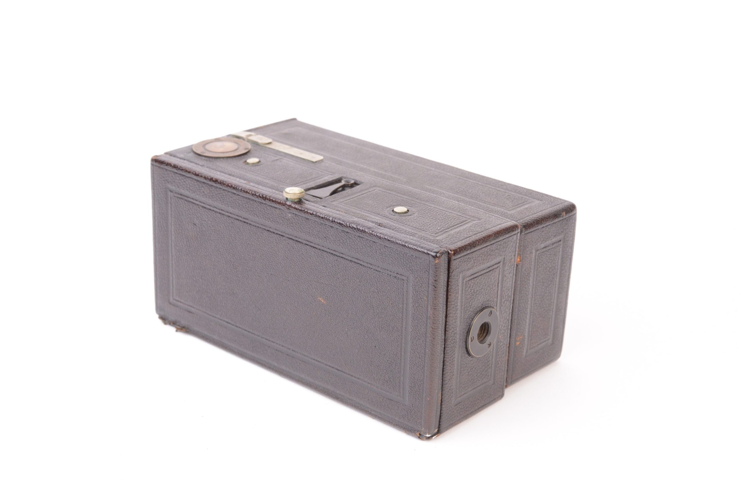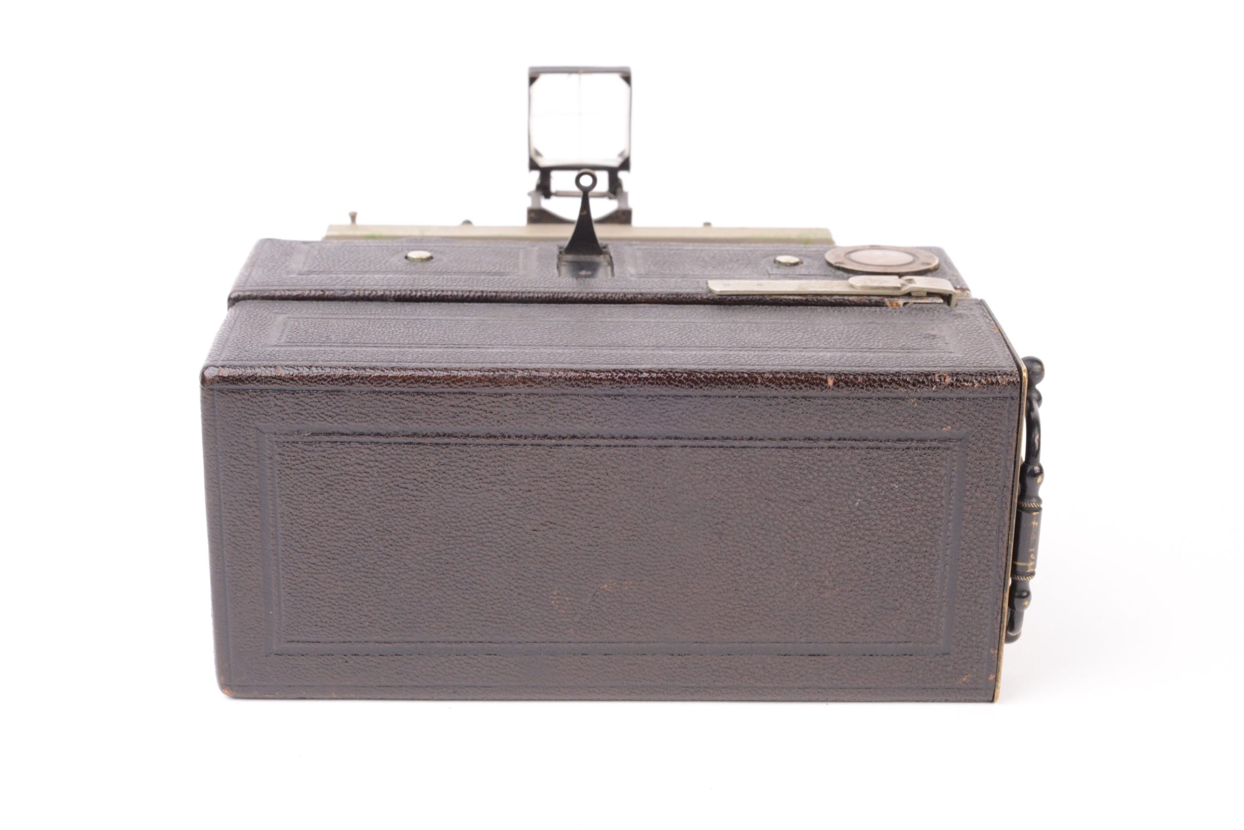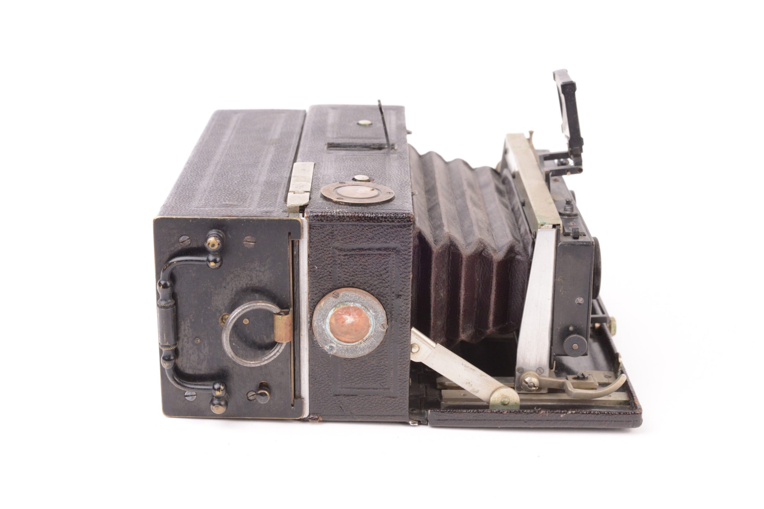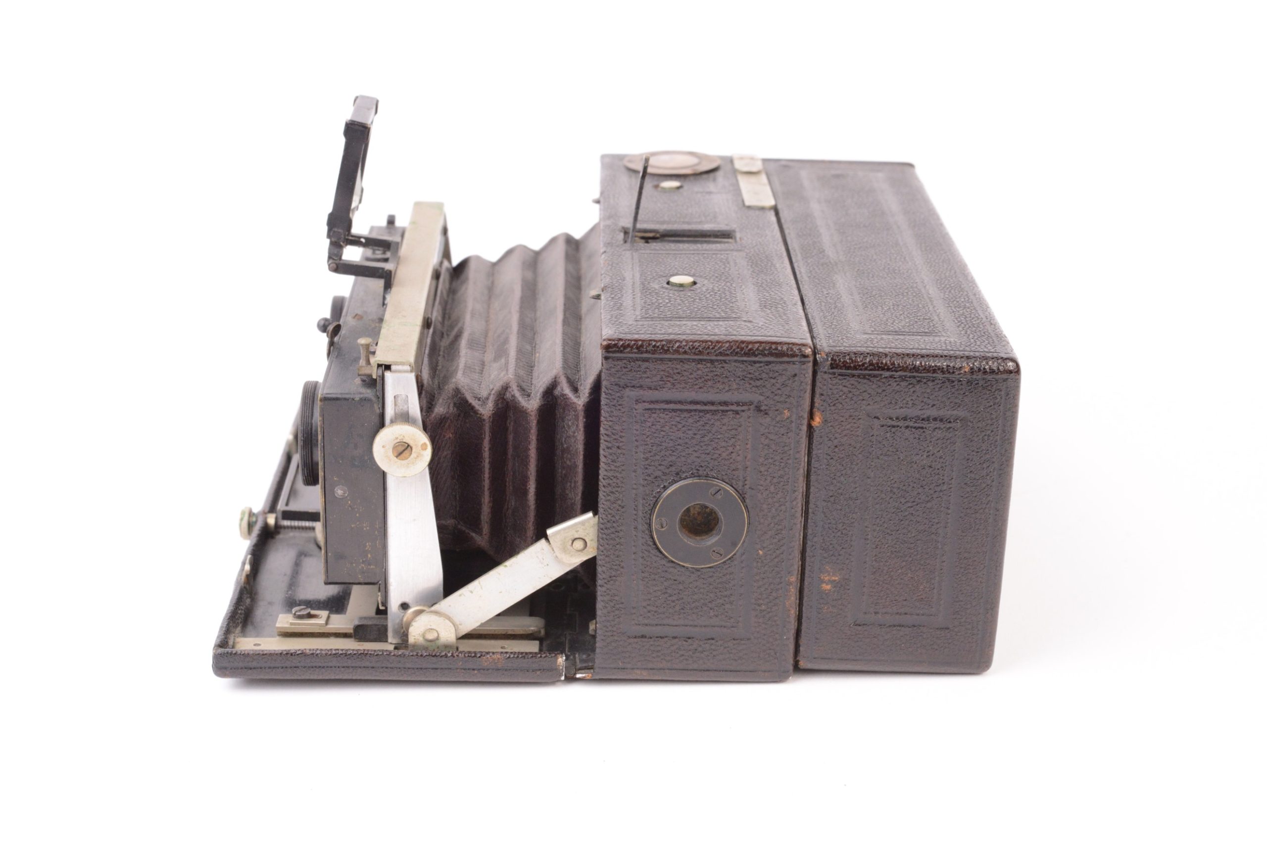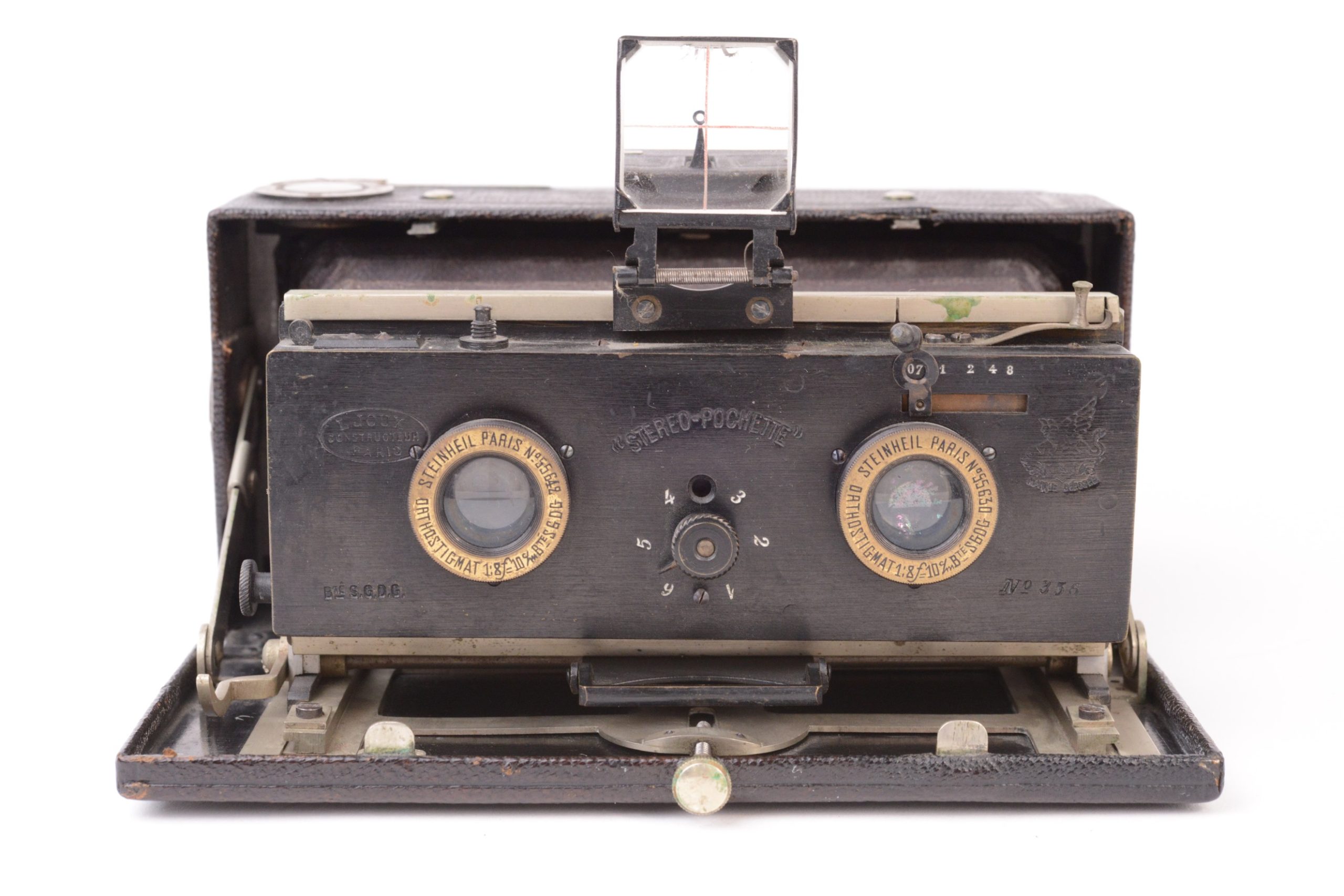 Lucien JOUX Stéréo-Pochette. Appareil stéréoscopique pliant de format 6x13 cm. Il s’agit de la seconde version, juste après celle de 1900, avec chariot et corps en métal, plus robustes que les prédécesseurs en bois noirci. L’appareil est construit tout en métal gainé maroquin noir. Il possède un soufflet en cuir bordeaux quadrillé. La platine avant coulisse sur des glissières fixées sur l’abattant avant et sur lesquelles elle peut se bloquer par levier. Décentrement vertical possible. Obturateur permettant la pose et l’instantané variable. Viseur clair direct à lentille négative avec œilleton. Dos magasin à plaques avec niveau d’horizontalité. Bel état.