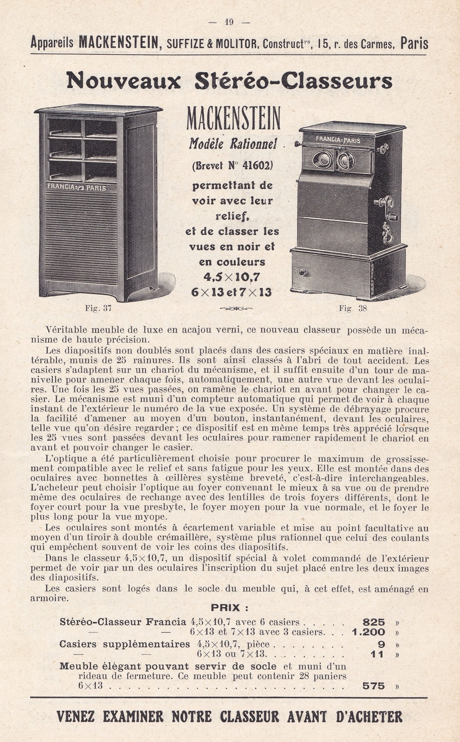 Nouveau Stéréo-Classeur Mackenstein Suffize & Molitor commercialisé dans les années 25-35. Format 6x13 cm. Un catalogue de cette époque le présente ainsi : « Véritable meuble de luxe en acajou verni, ce nouveau classeur possède un mécanisme de haute précision. Les diapositifs non doublés sont placés dans des casiers spéciaux en matière inaltérable, munis de 25 rainures. Ils sont ainsi classés à l'abri de tout accident. Les casiers s'adaptent sur un chariot du mécanisme, et il suffit ensuite d'un tour de manivelle pour amener chaque fois, automatiquement, une autre vue devant les oculaires. Une fois les 25 vues passées, on ramène le chariot en avant pour changer le casier. Le mécanisme est muni d'un compteur automatique qui permet de voir à chaque instant de l'extérieur le numéro de la vue exposée. Un système de débrayage procure la facilité d'amener au moyen d'un bouton, instantanément, devant les oculaires, telle vue qu'on désire regarder; ce dispositif est en même temps très apprécié lorsque les 25 vues sont passées devant les oculaires pour ramener rapidement le chariot en avant et pouvoir changer le casier. L'optique a été particulièrement choisie pour procurer le maximum de grossissement compatible avec le relief et sans fa ligue pour les yeux. Elle est montée dans des oculaires avec bonnettes à œillères système breveté, c'est-à-dire interchangeables. L'acheteur peut choisir l'optique au foyer convenant le mieux à sa vue ou de prendre même des oculaires de rechange avec des lentilles de trois foyers différents, dont le foyer court pour la vue presbyte, le foyer moyen pour la vue normale, ct le foyer le plus long pour la vue myope. Les oculaires sont montés à écartement variable et mise au point facultative au moyen d'un tiroir à double crémaillère, système plus rationnel que celui des coulants qui empêchent souvent de voir les coins des diapositifs. Dans le classeur 4,5 x 10,7, un dispositif spécial à volet commandé de l'extérieur permet de voir par un des oculaires l'inscription du sujet placé entre les deux images des diapositifs. Les casiers sont logés dans le socle du meuble qui, à cet effet, est aménagé en armoire.». L’appareil possède à l’arrière un grand miroir pivotant destiné à renvoyer plus ou moins de lumière sur le verre dépoli. Il sert en particulier pour l’observation des autochromes. Sur le haut du stéréoscope, est apposé la marque de fabrique : « SUMO PARIS – Appareils Mackenstein – Suffize & Molitor Constructeurs. ». Il n’y a qu’un seul panier accompagnant le stéréoscope. Ce dernier provient de la succession Henri SUFFIZE.