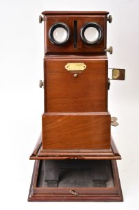 Visionneuse stéréoscopique de fête foraine à monnayeur. Construite en bois verni. Système à monnayeur électrique (...)Ce produit m'intéresse -