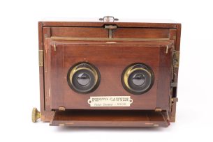 Appareil photographique stéréoscopique. La plaque en ivoirine apposée porte les mentions « Photo Cauvin – (...)Ce produit m'intéresse -