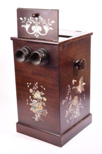 Beau Stéréoscope de table avec incrustations de nacres. Belles décorations à motifs floraux aux papillons. (...)Ce produit m'intéresse -