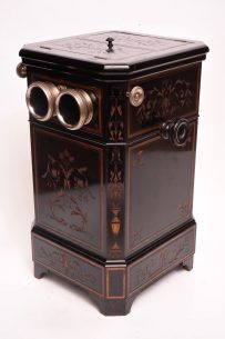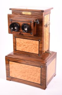 Stéréoscope de Parquet. Belle ébénisterie vernie à pans coupé. corniche, double socle. Poignées en bronze (...)Ce produit m'intéresse -