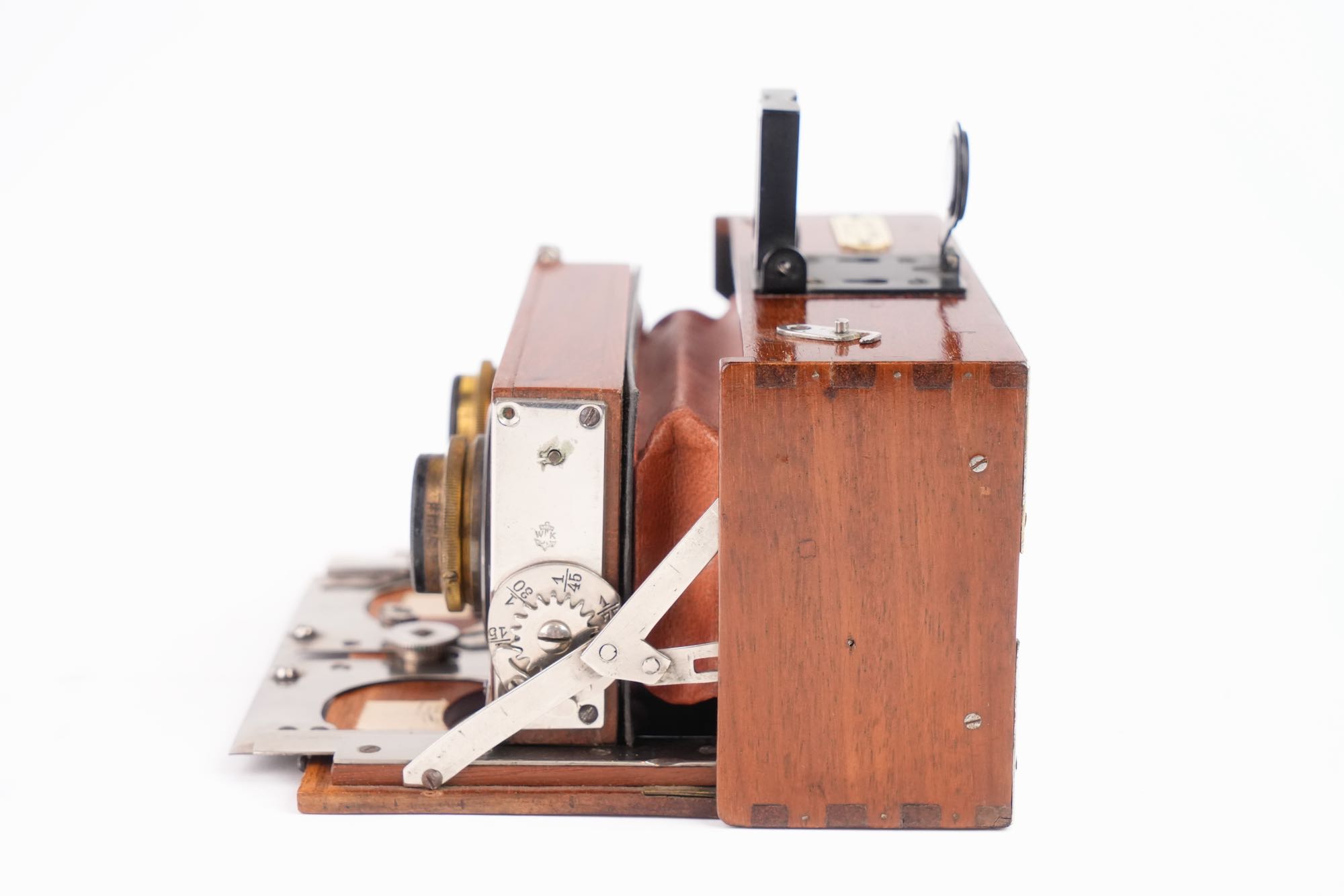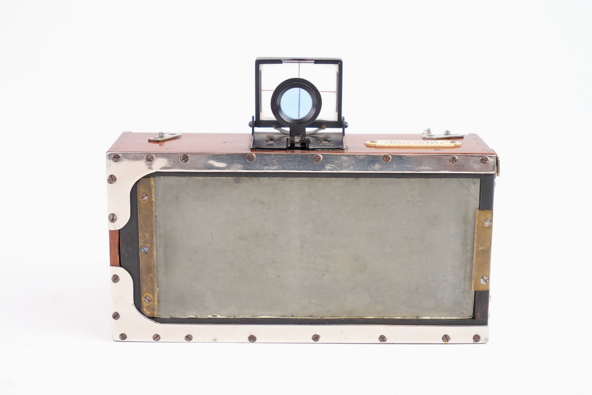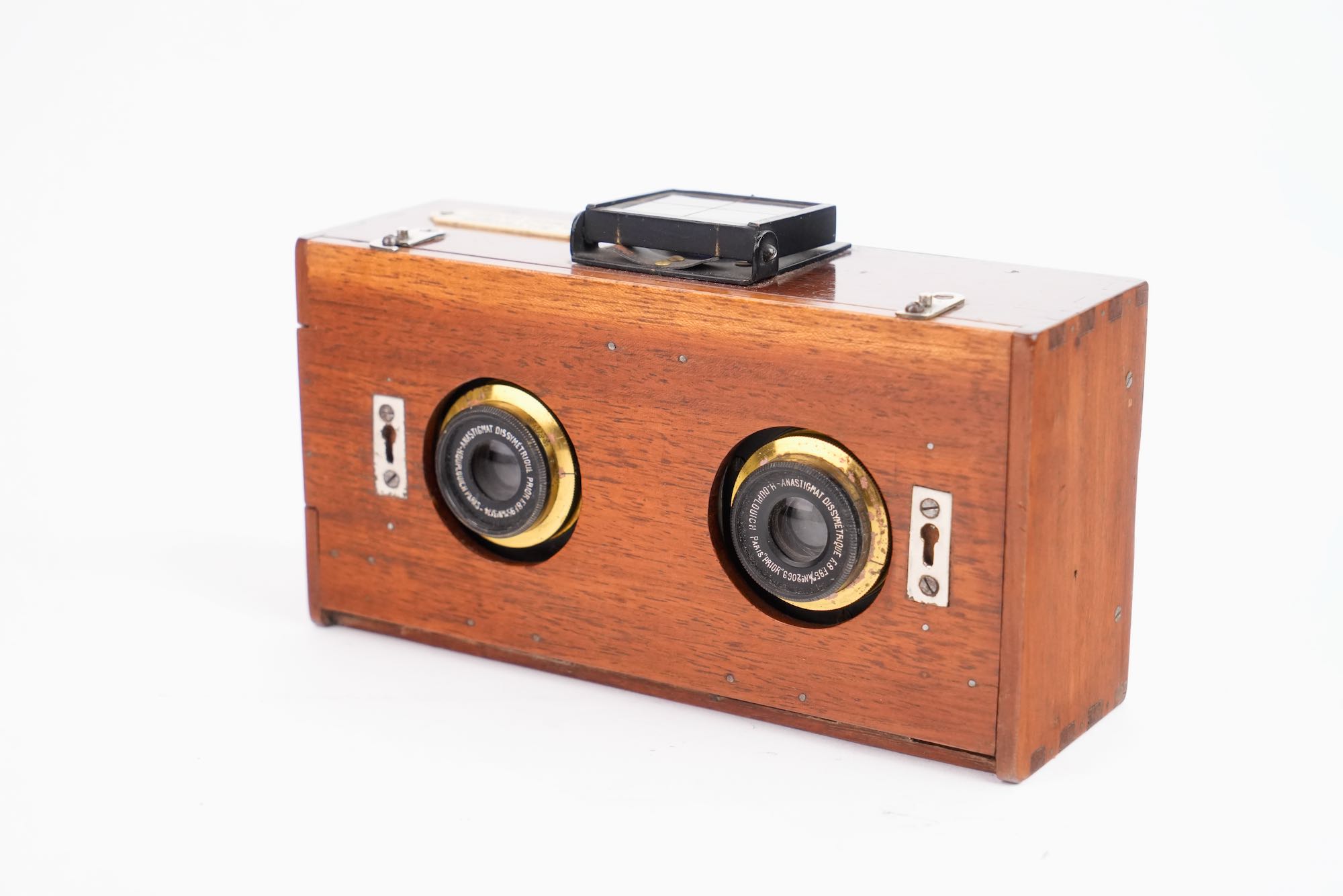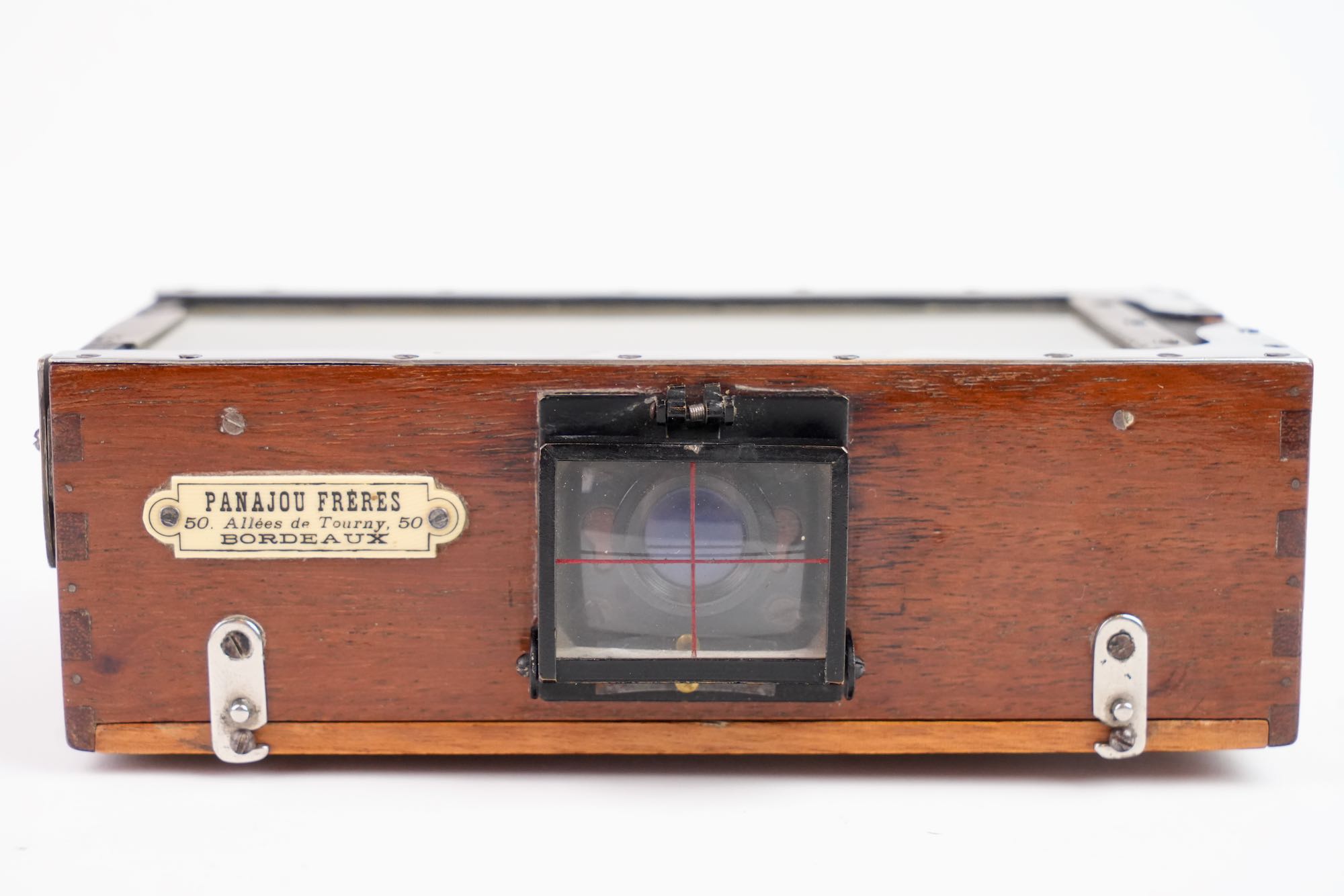 Rare appareil photographique stéréoscopique, format 6x13 cm, fin du XIXᵉ – début du XXᵉ siècle. Cet appareil en bois verni, de conception compacte et soignée, est destiné à la prise de vues stéréoscopiques permettant la restitution du relief par l’observation binoculaire. Il est équipé de deux objectifs Duplouich identiques en laiton, montés en façade. L’appareil comporte un soufflet interne escamotable, un mécanisme d’obturation à rideau et un viseur quadrillé sur le dessus, . Conçu pour des plaques format 6x13 cm .L’attribution aux établissements Duplouich demeure à vérifier, la présence de la plaque marchande indique une commercialisation par Panajou Frères, maison bordelaise.