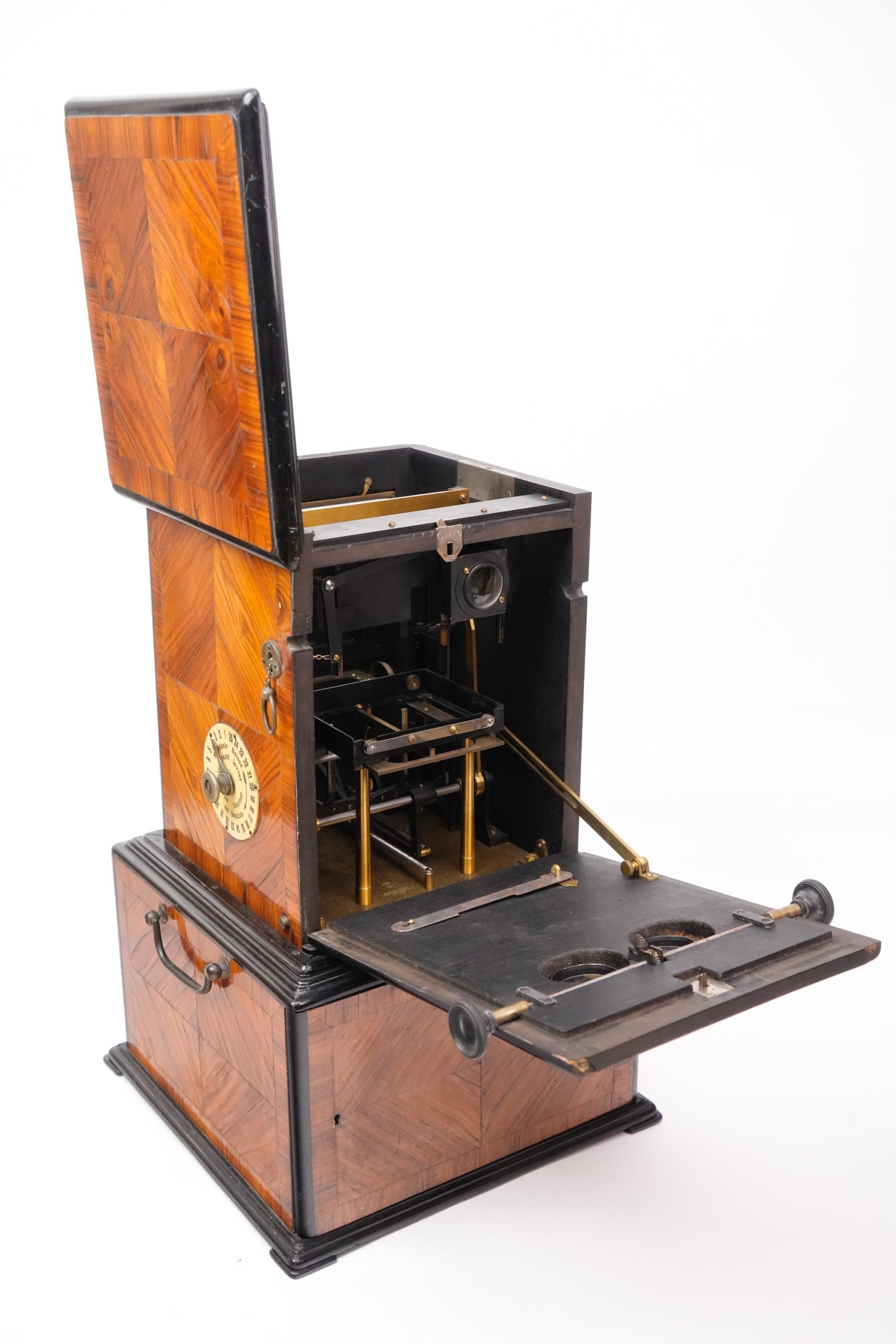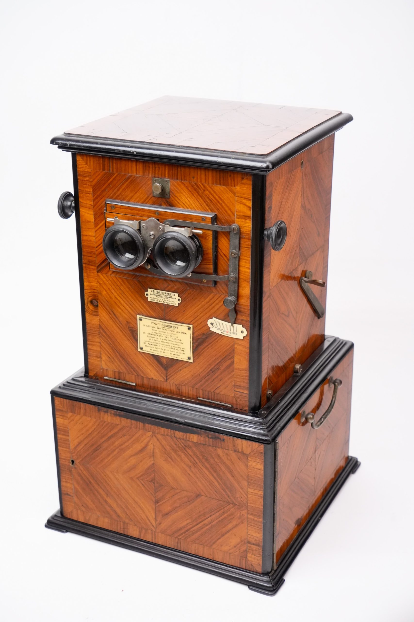 Un <em>Taxiphote</em> remarquable, conçu pour des plaques de 45x107 mm, fabriqué vers 1905 par les célèbres établissements Jules Richard. Cet appareil de vision stéréoscopique se distingue par son ébénisterie exceptionnelle, avec des surfaces finement parquetées en bois de rose, assemblées avec soin pour former des losanges dans le sens des veines du bois. Ce modèle au format 45x107 mm semble avoir été réalisé sur commande pour une famille de la haute bourgeoisie. L'appareil est doté d'un coffrage inférieur muni de deux tiroirs permettant de stocker jusqu'à huit magasins de rangement. Les boutons latéraux offrent un ajustement précis de l'écartement des oculaires, assurant un confort visuel optimal. Une pièce d’exception, alliant beauté, fonctionnalité et raffinement.