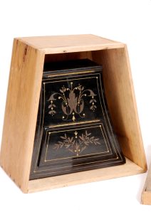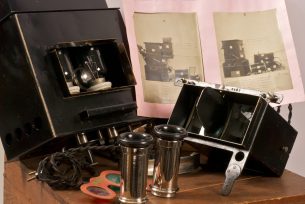 Un <em>Taxiphote</em> remarquable, conçu pour des plaques de 45x107 mm, fabriqué vers 1905 par les célèbres établissements Jules Richard. Cet appareil de vision stéréoscopique se distingue par son ébénisterie exceptionnelle, avec des surfaces finement parquetées en bois de rose, assemblées avec soin pour former des losanges dans le sens des veines du bois. Ce modèle au format 45x107 mm semble avoir été réalisé sur commande pour une famille de la haute bourgeoisie. L'appareil est doté d'un coffrage inférieur muni de deux tiroirs permettant de stocker jusqu'à huit magasins de rangement. Les boutons latéraux offrent un ajustement précis de l'écartement des oculaires, assurant un confort visuel optimal. Une pièce d’exception, alliant beauté, fonctionnalité et raffinement.