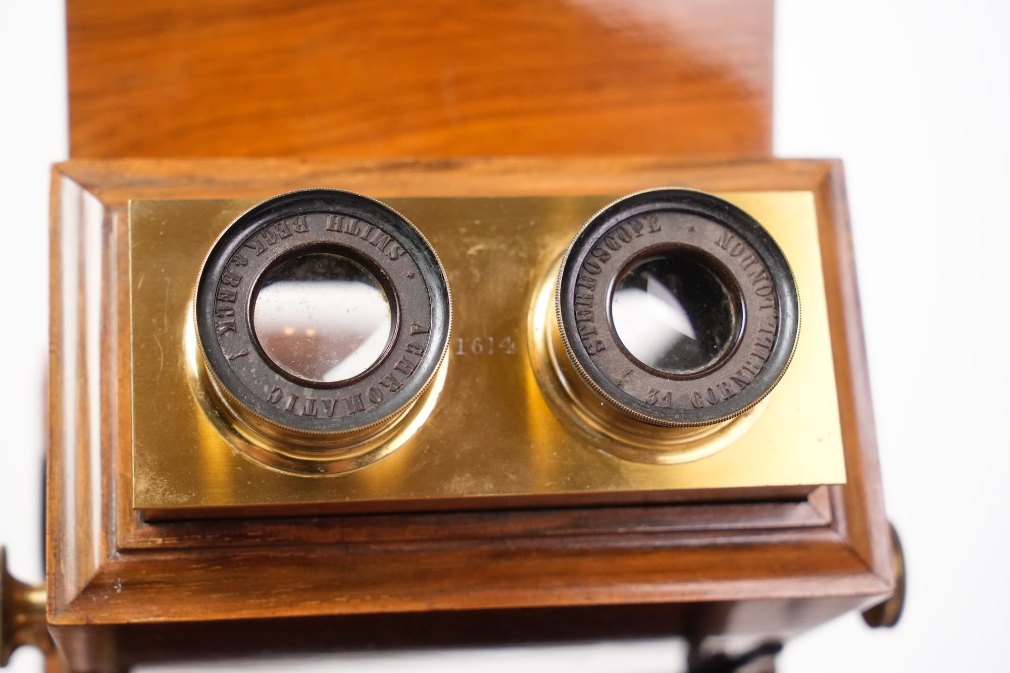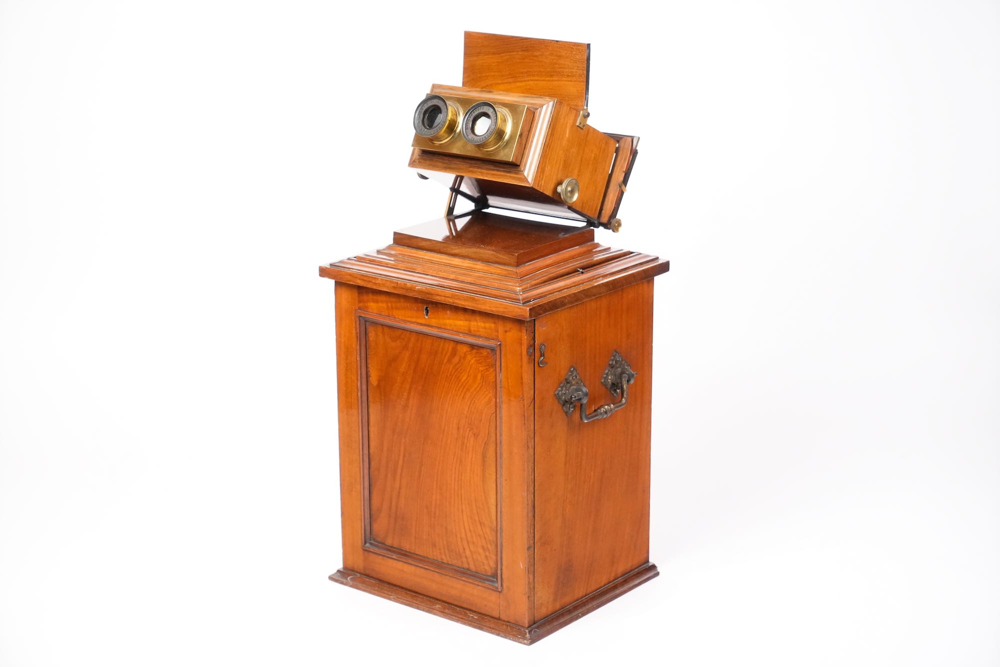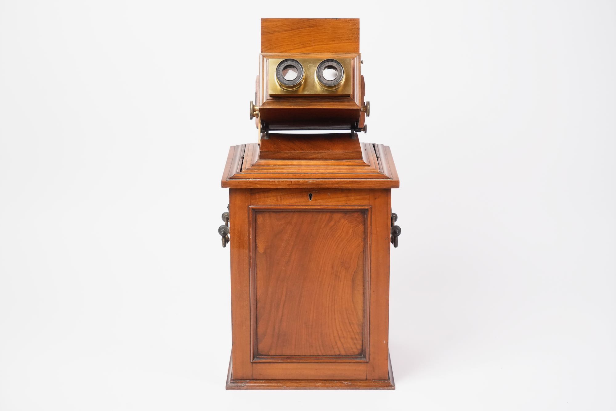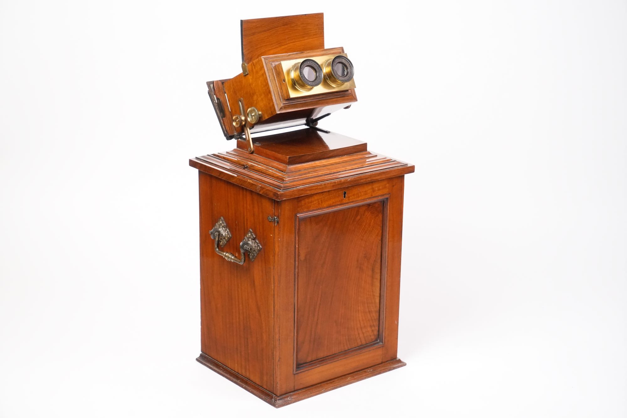 Le stéréoscope de type “armoire de salon” reflète la vogue de la stéréoscopie victorienne, une pratique domestique populaire dans les années 1850–1870, combinant curiosité scientifique et divertissement bourgeois. Smith & Beck, reconnus pour la qualité de leurs microscopes et appareils optiques, produisirent également plusieurs modèles de stéréoscopes de luxe, destinés à la présentation élégante de collections d’images tridimensionnelles.