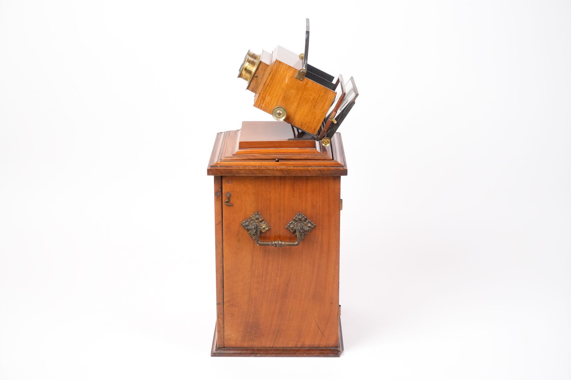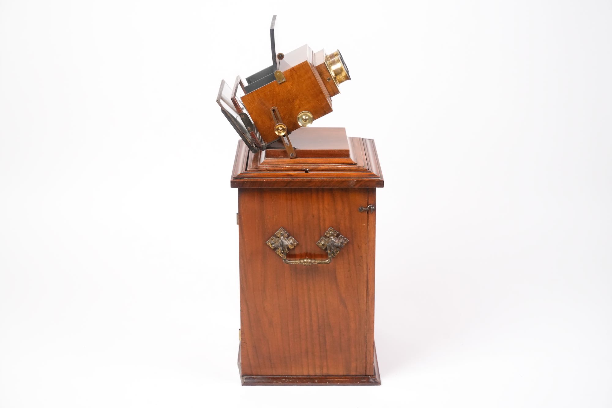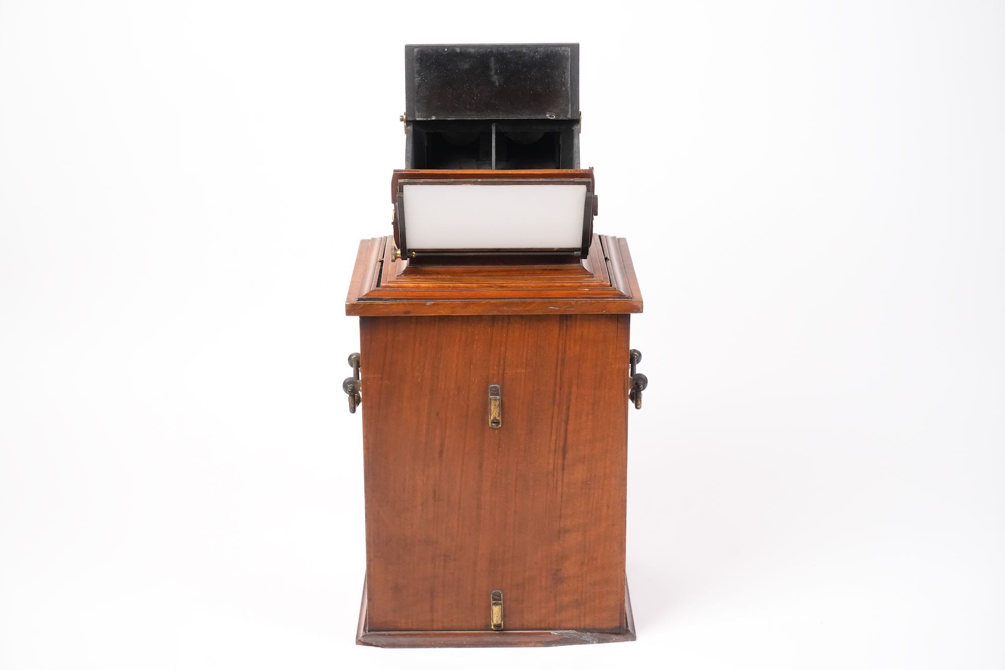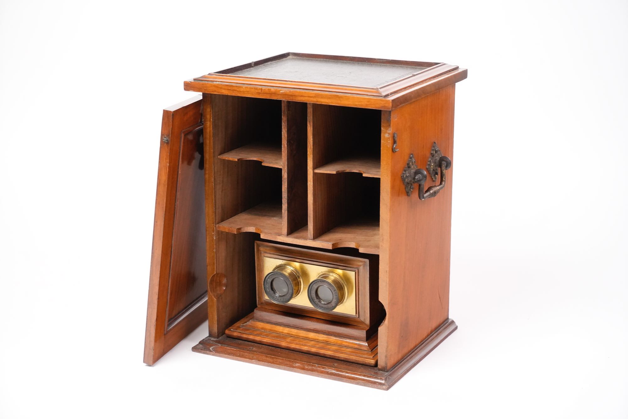 Le stéréoscope de type “armoire de salon” reflète la vogue de la stéréoscopie victorienne, une pratique domestique populaire dans les années 1850–1870, combinant curiosité scientifique et divertissement bourgeois. Smith & Beck, reconnus pour la qualité de leurs microscopes et appareils optiques, produisirent également plusieurs modèles de stéréoscopes de luxe, destinés à la présentation élégante de collections d’images tridimensionnelles.