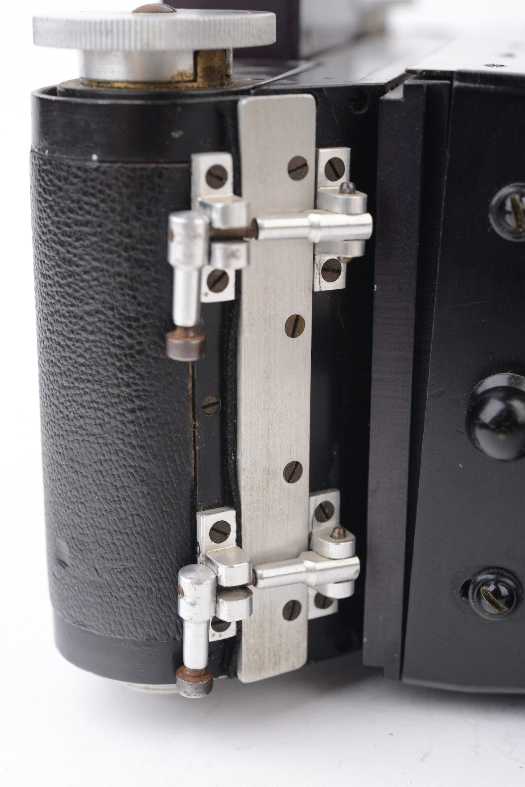 Appareil stéréoscopique Francia Mackenstein. Format 6x13cm. Dos film Velleaus (construit à Montrouge) pour film 120. Très belle fabrication en bois gainé maroquin.  Mise au point par bouton sur le côté agissant sur le déplacement du corps avant. Obturateur à guillotine, à vitesse variable ; armement par papillon central. Objectifs Tessar Krauss f 4,5 / 84 mm, diaphragmes iris couplés. Viseur réticulé clair direct à lentille négative. Présence d’un télémètre à coïncidence de marque Gallus. Bouchons d’objectifs.  Vers 1930. Très bel état général.