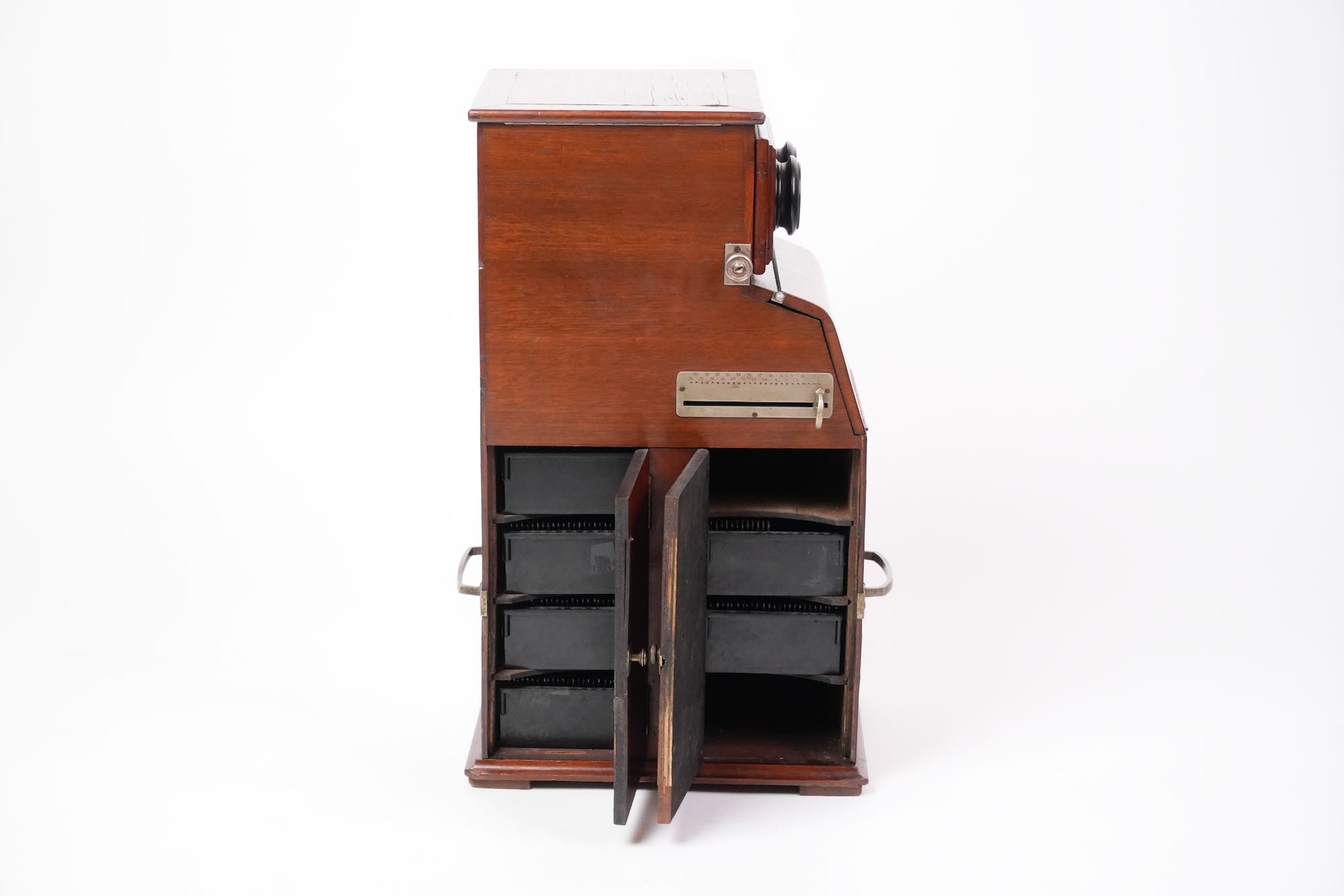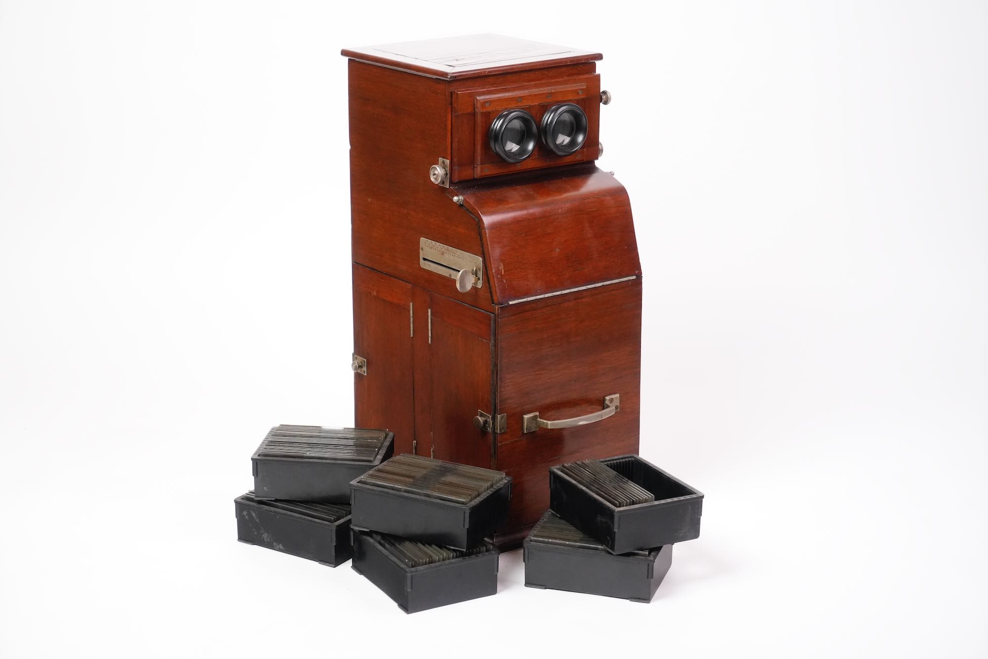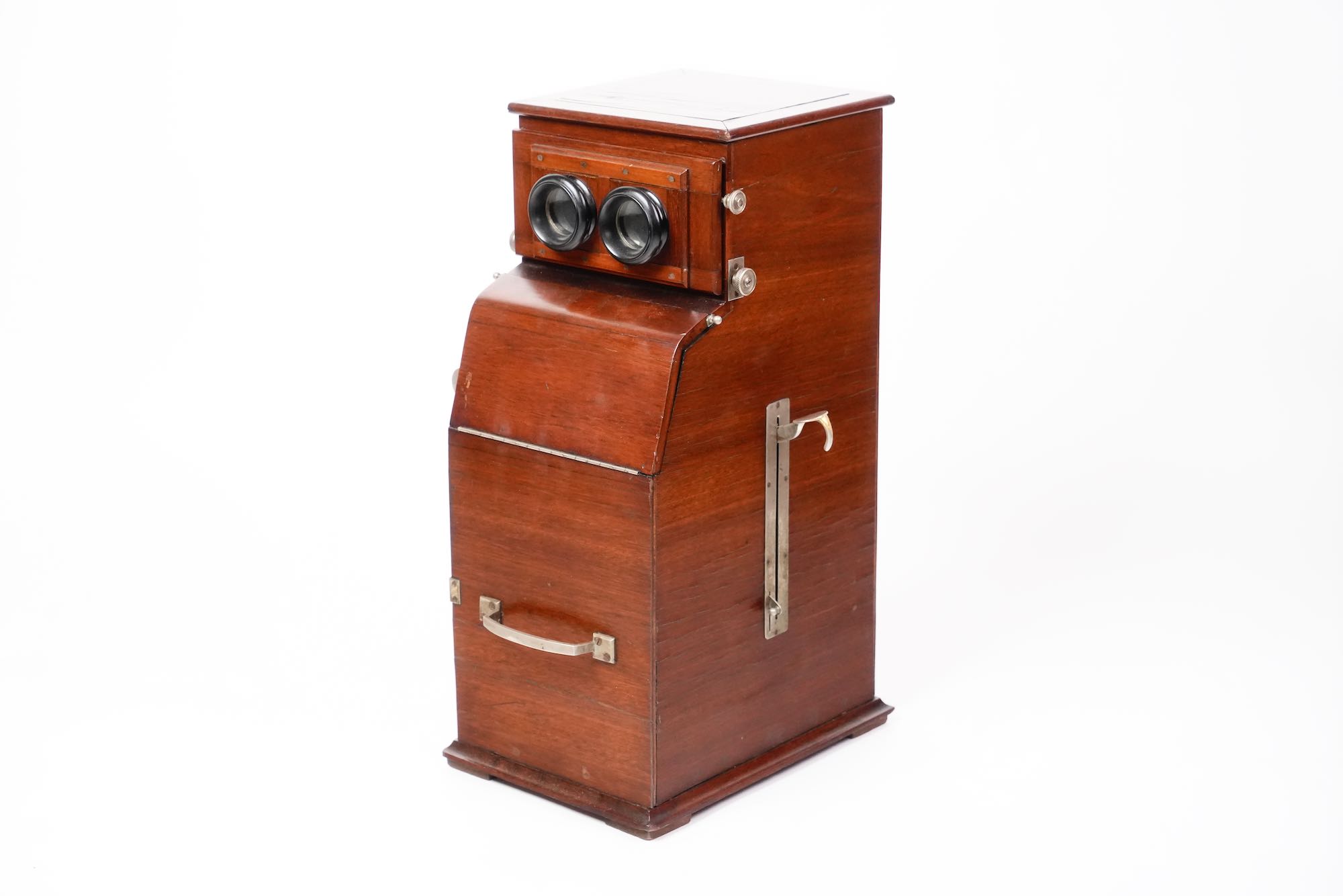 Important stéréoscope automatique dit « Stéréomagasine », marqué C.R., fabriqué en France vers 1905–1915. Réalisé en acajou verni avec ferrures en laiton nickelé, cet appareil illustre l’apogée de la stéréoscopie mécanique du début du XXᵉ siècle. Le système ingénieux du Stéréomagasine permettait le visionnage en séquence d’une série de vues stéréoscopiques sur plaques de verre, grâce à un mécanisme interne à manivelle faisant défiler automatiquement les images devant les objectifs oculaires. L’appareil se compose d’un coffret vertical intégrant le magasin à plaques, et des rangements pour les magasins en réserve. Les stéréoscopes de ce type, produits en petites séries, étaient souvent utilisés dans les salons bourgeois ou les établissements d’enseignement, pour la diffusion d’images éducatives, touristiques ou scientifiques.
