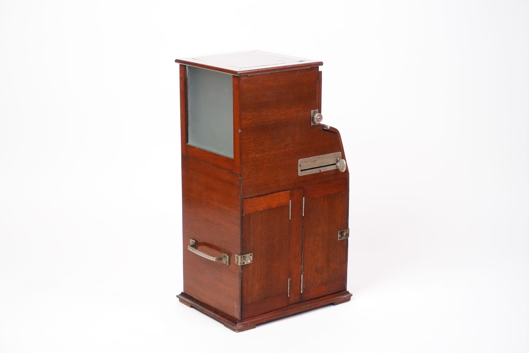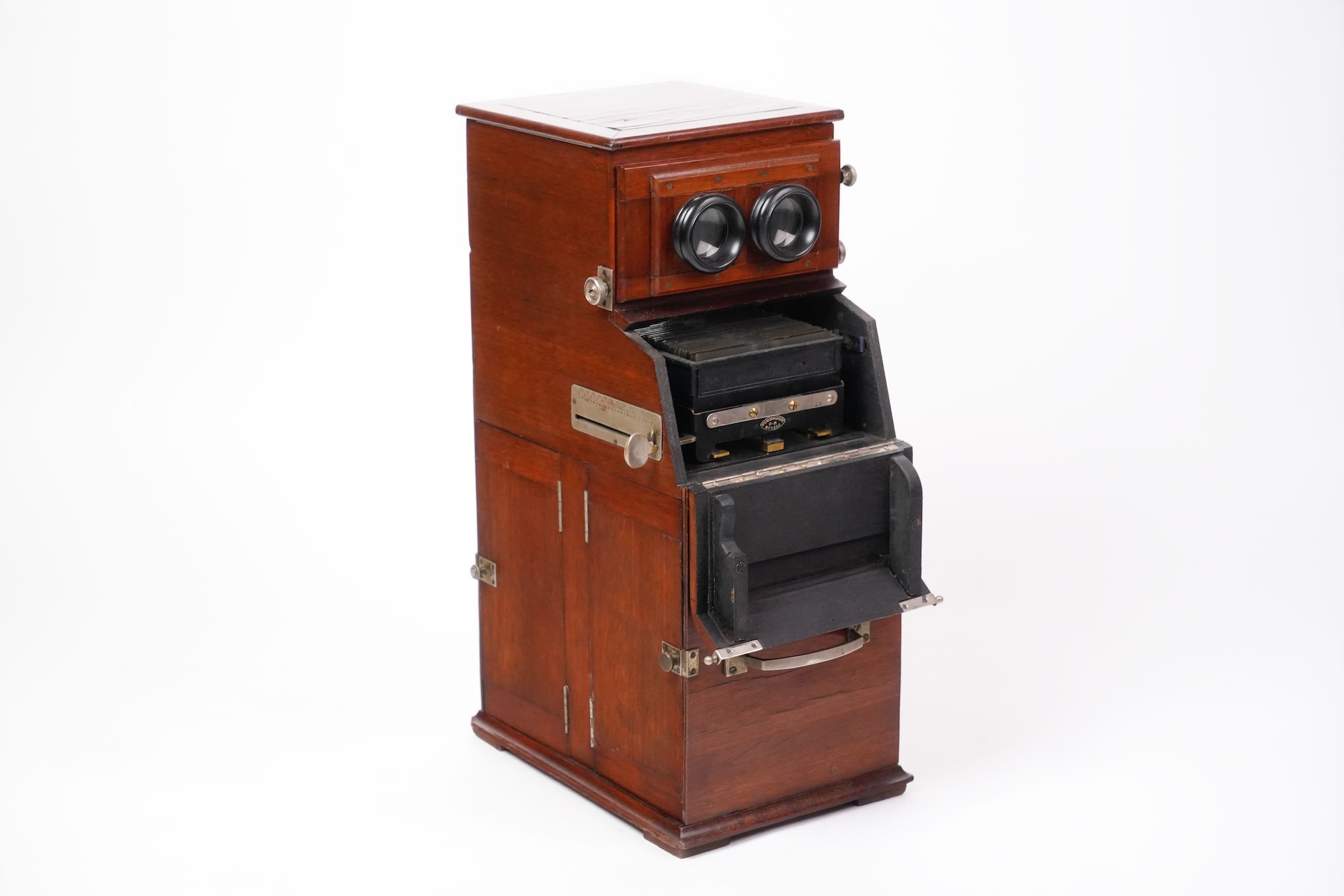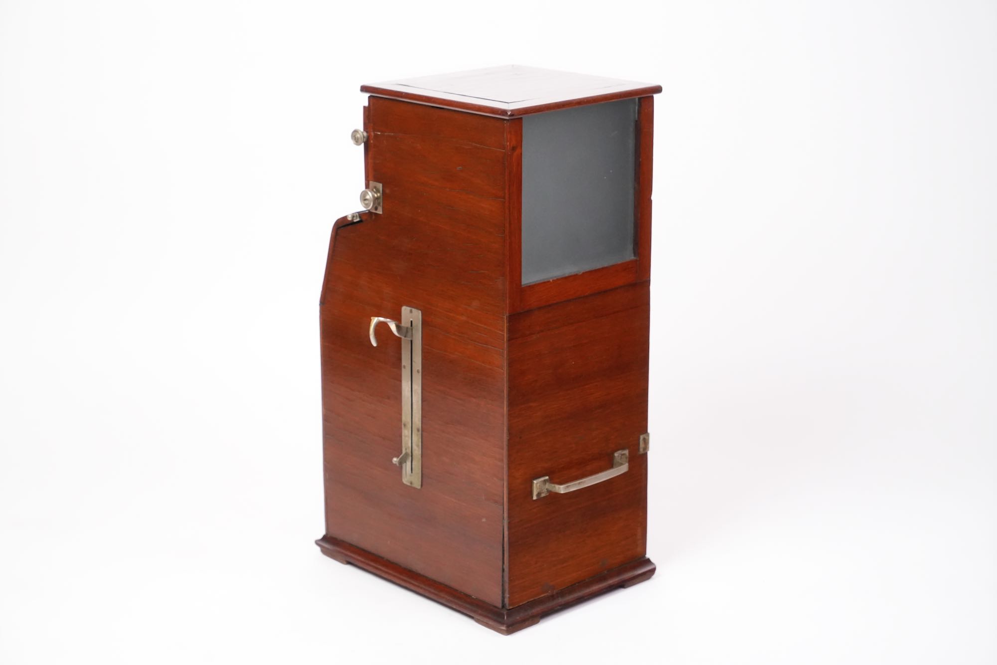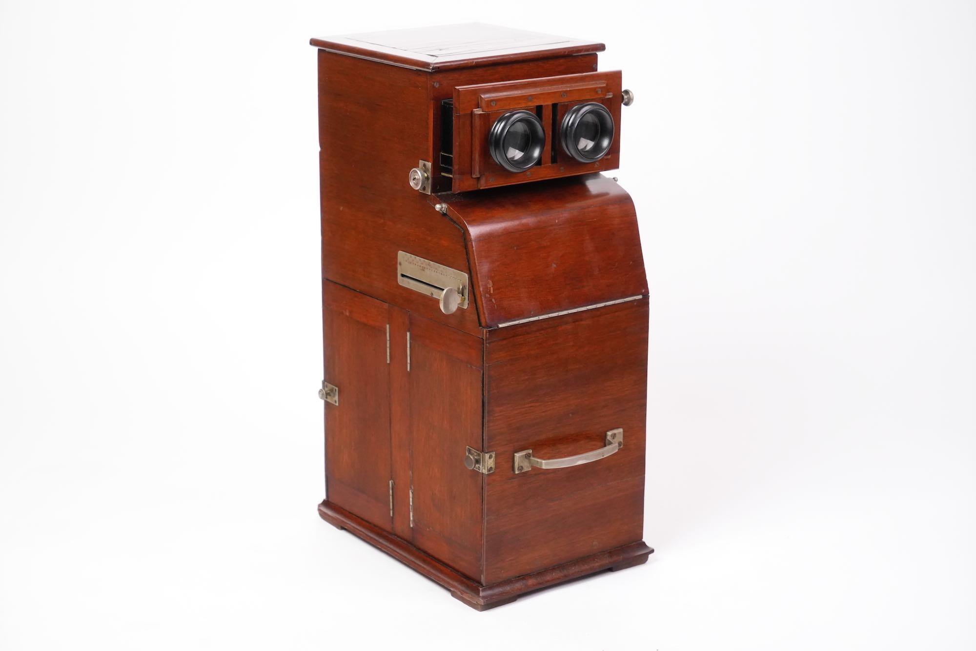 Important stéréoscope automatique dit « Stéréomagasine », marqué C.R., fabriqué en France vers 1905–1915. Réalisé en acajou verni avec ferrures en laiton nickelé, cet appareil illustre l’apogée de la stéréoscopie mécanique du début du XXᵉ siècle. Le système ingénieux du Stéréomagasine permettait le visionnage en séquence d’une série de vues stéréoscopiques sur plaques de verre, grâce à un mécanisme interne à manivelle faisant défiler automatiquement les images devant les objectifs oculaires. L’appareil se compose d’un coffret vertical intégrant le magasin à plaques, et des rangements pour les magasins en réserve. Les stéréoscopes de ce type, produits en petites séries, étaient souvent utilisés dans les salons bourgeois ou les établissements d’enseignement, pour la diffusion d’images éducatives, touristiques ou scientifiques.