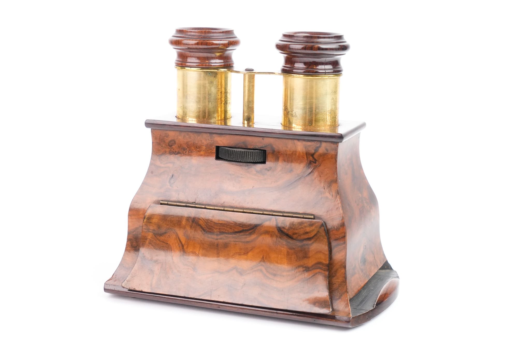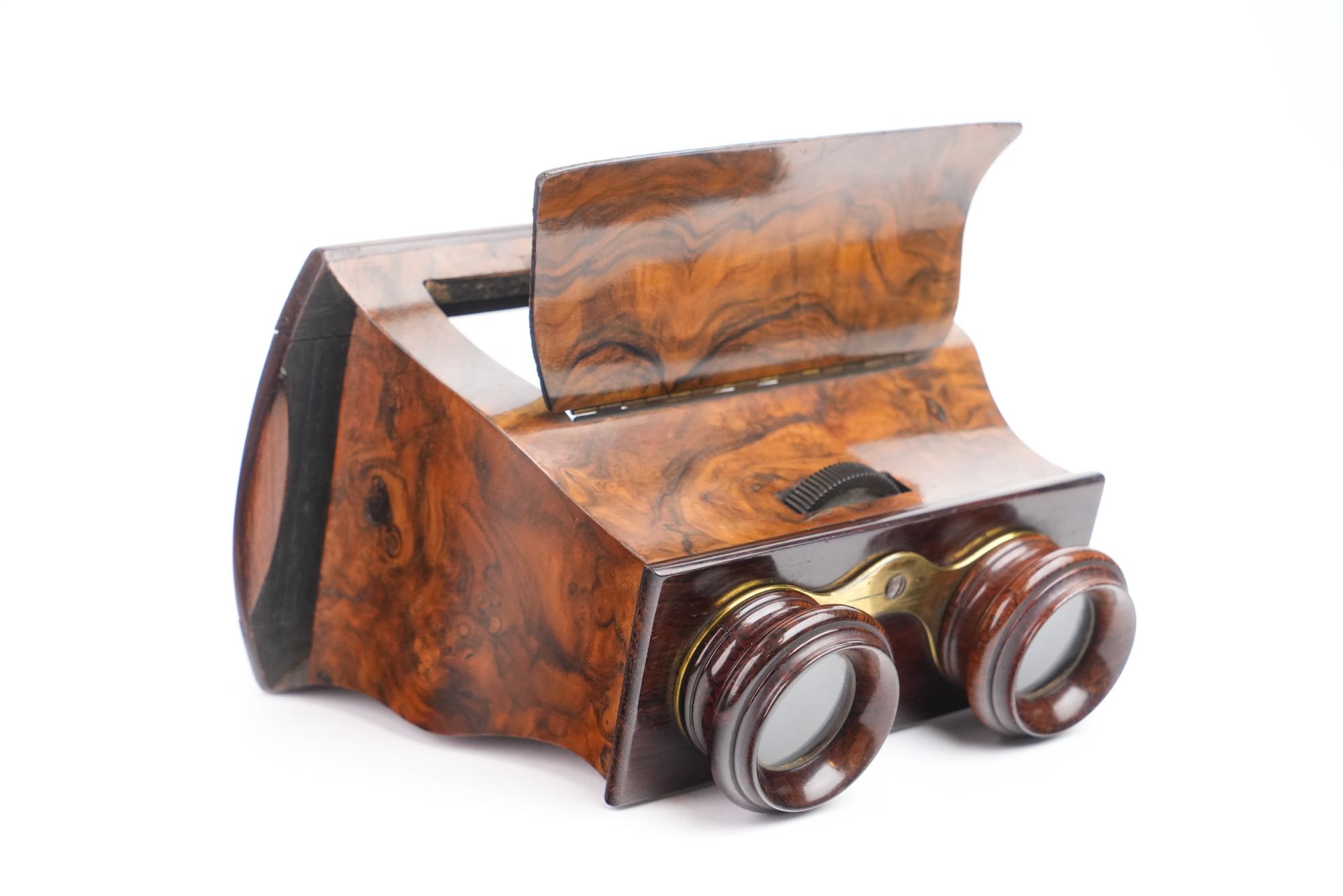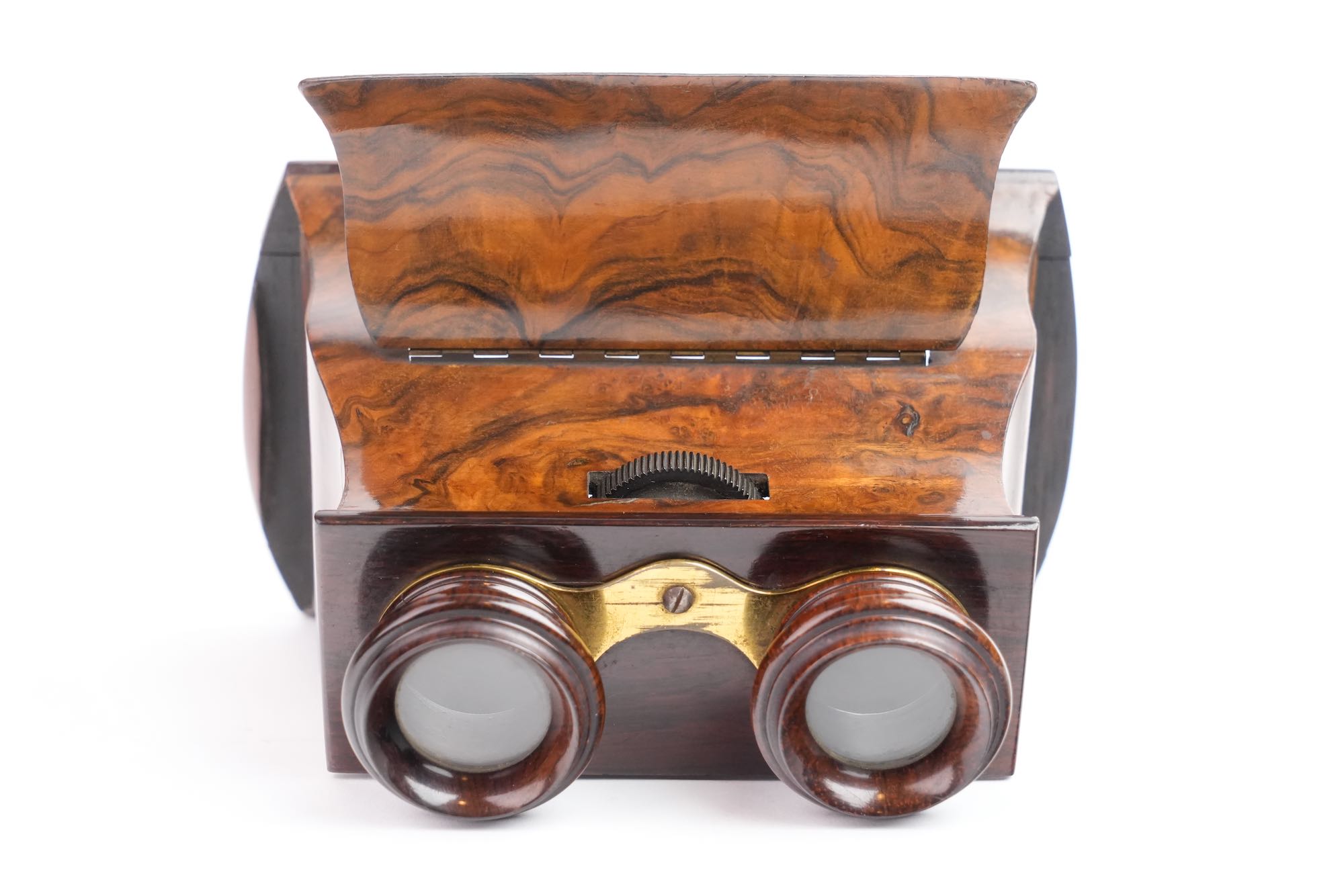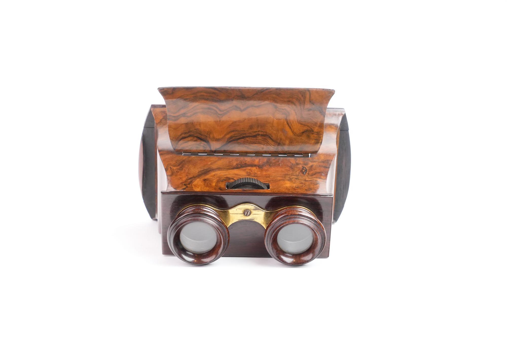 Stéréoscope à doucine. Format 9x18 cm. Construction en belle ébénisterie : Platine avant, oculaires et cadre arrière en palissandre, corps principal en ronce de noyer. Mise au point par un ingénieux bouton rotatifs sur le corps de la visionneuse. France, vers 1880. Très bel état.