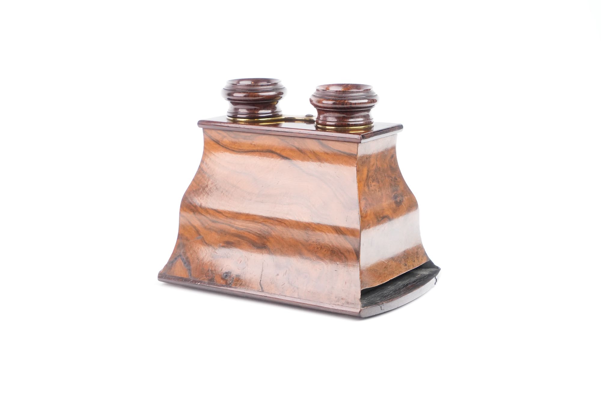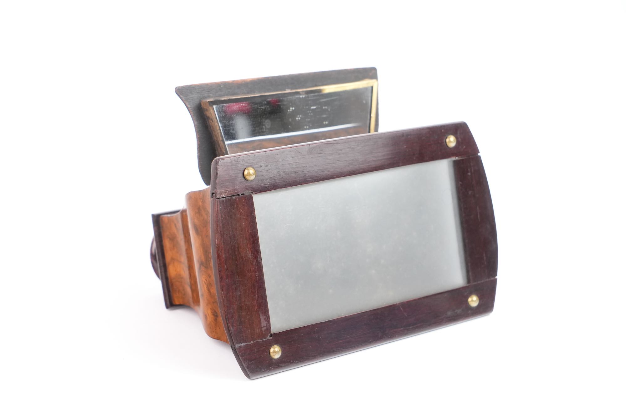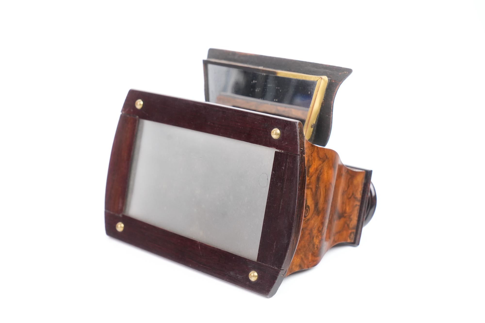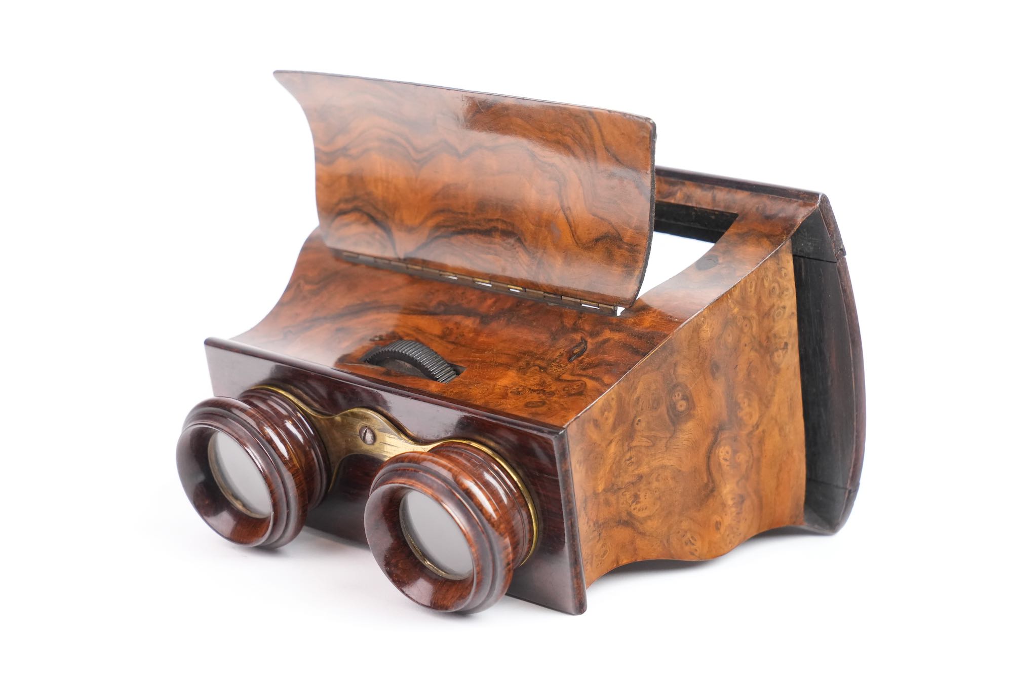 Stéréoscope à doucine. Format 9x18 cm. Construction en belle ébénisterie : Platine avant, oculaires et cadre arrière en palissandre, corps principal en ronce de noyer. Mise au point par un ingénieux bouton rotatifs sur le corps de la visionneuse. France, vers 1880. Très bel état.