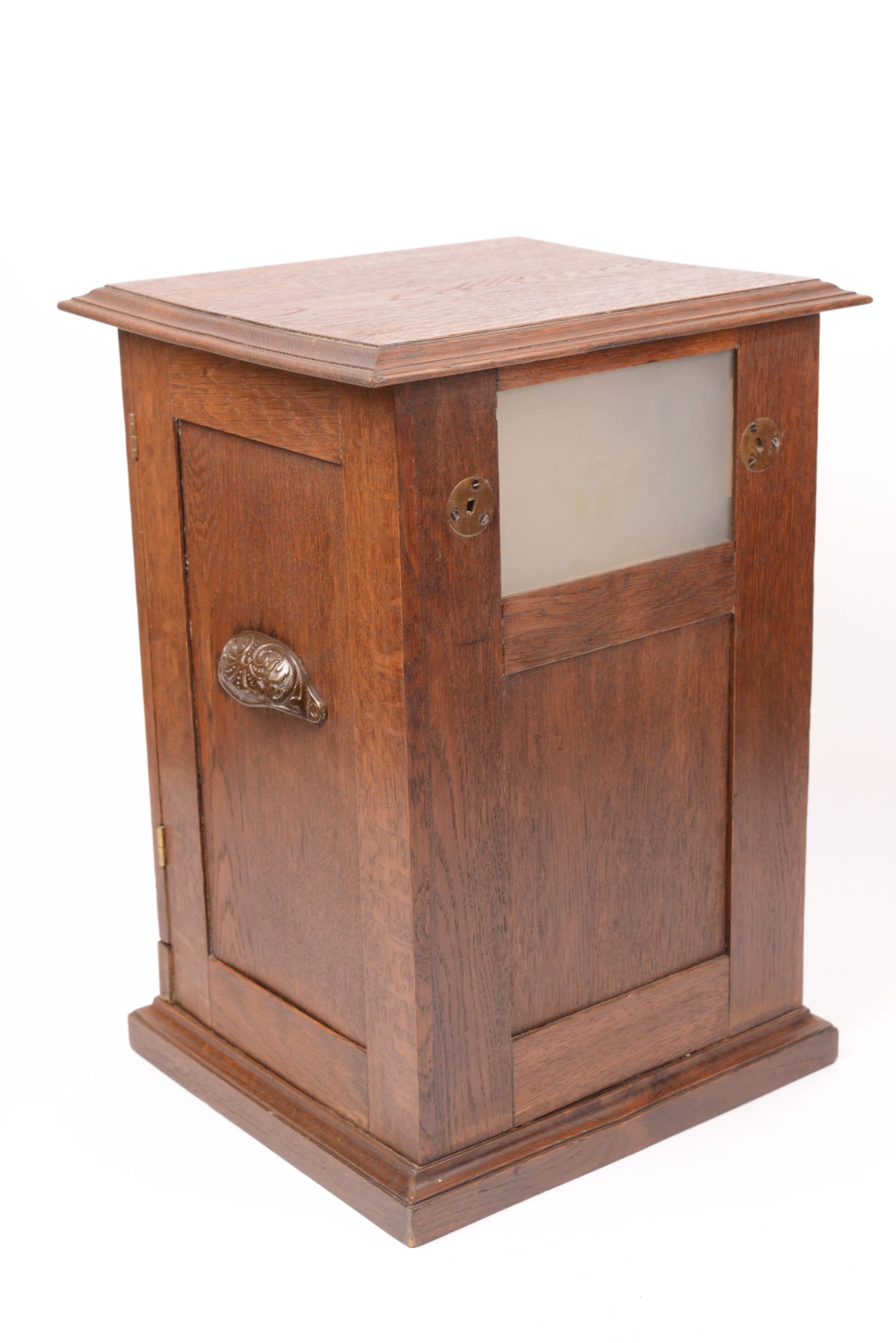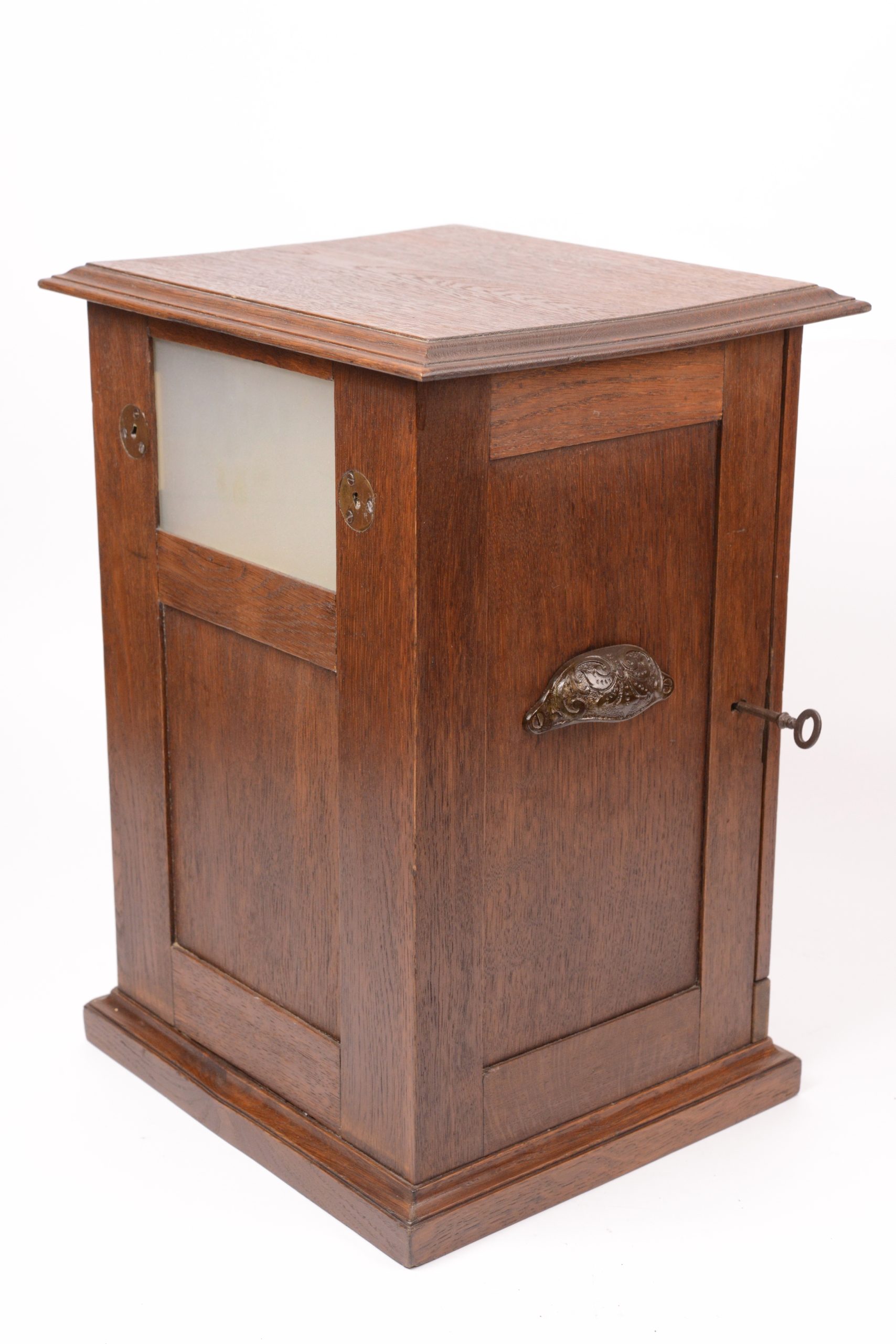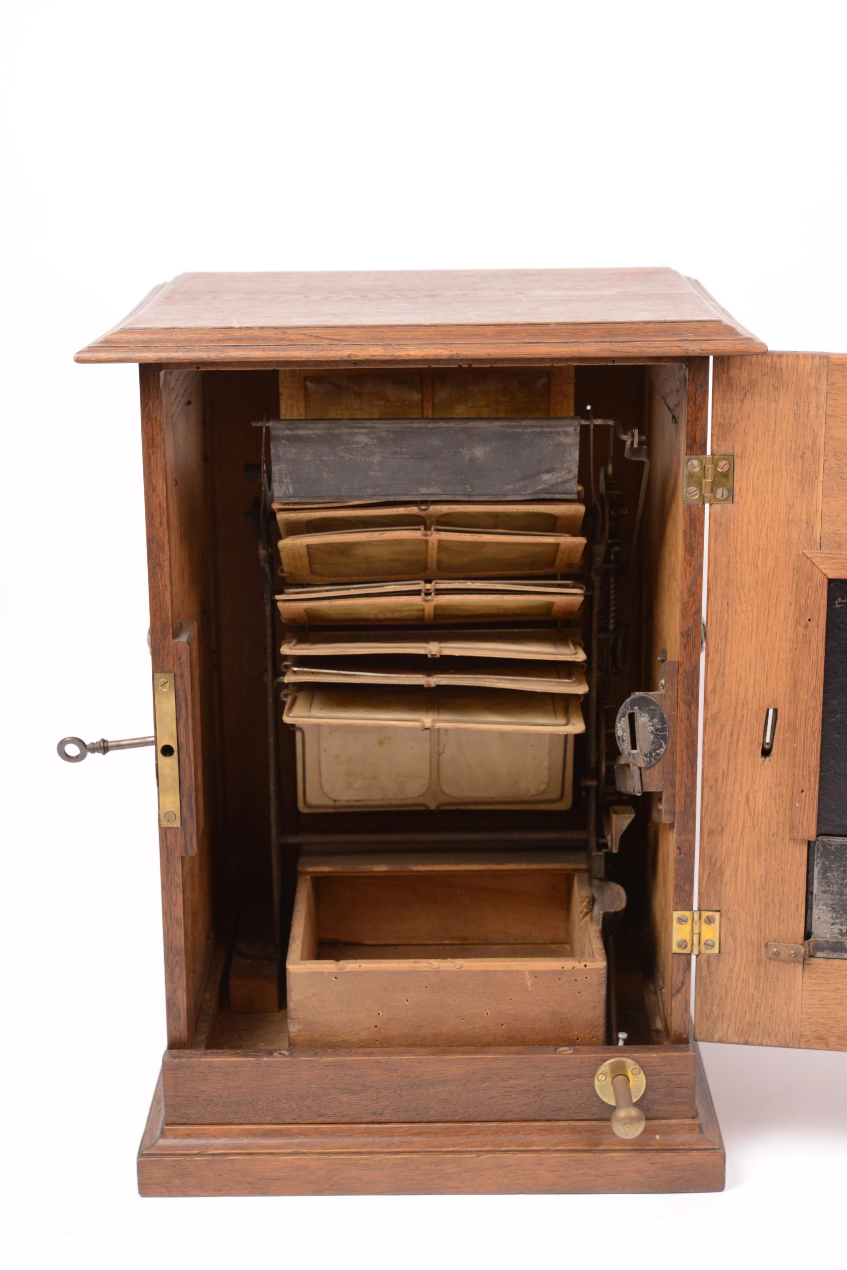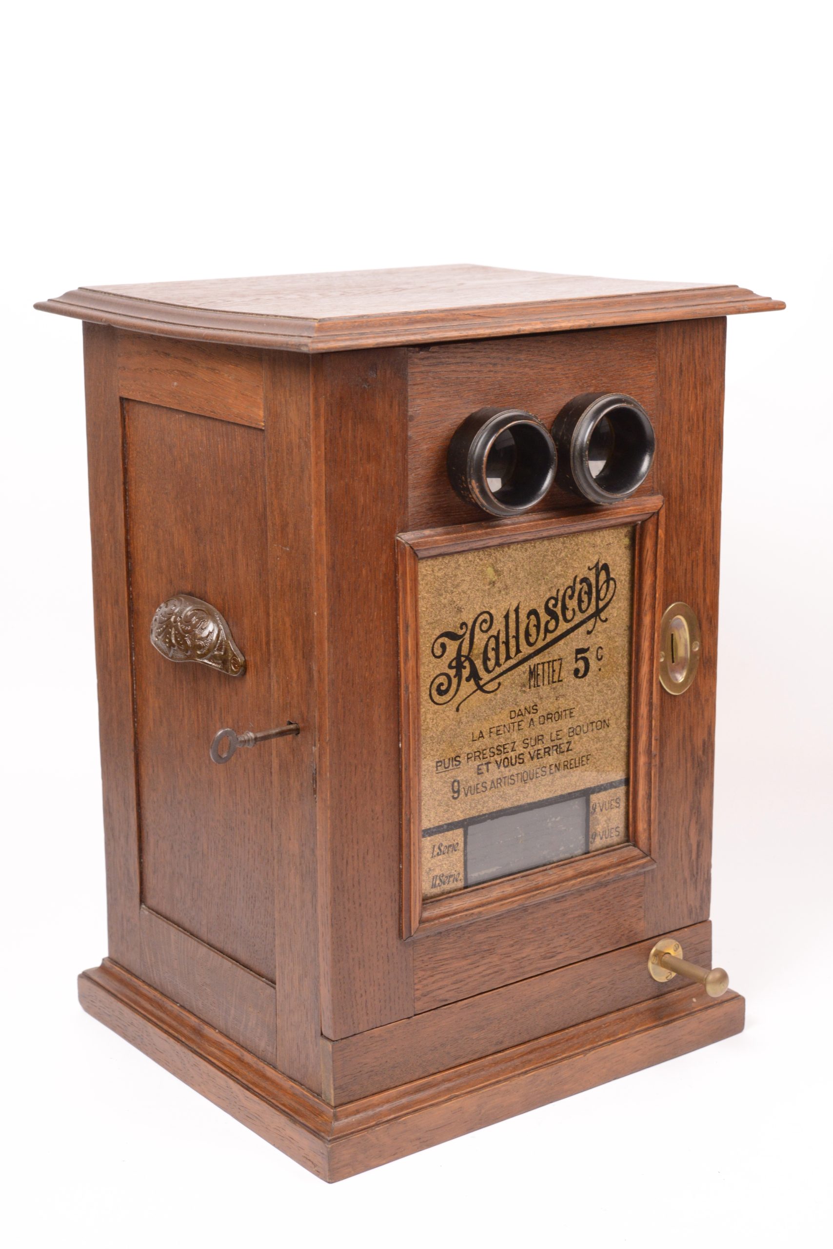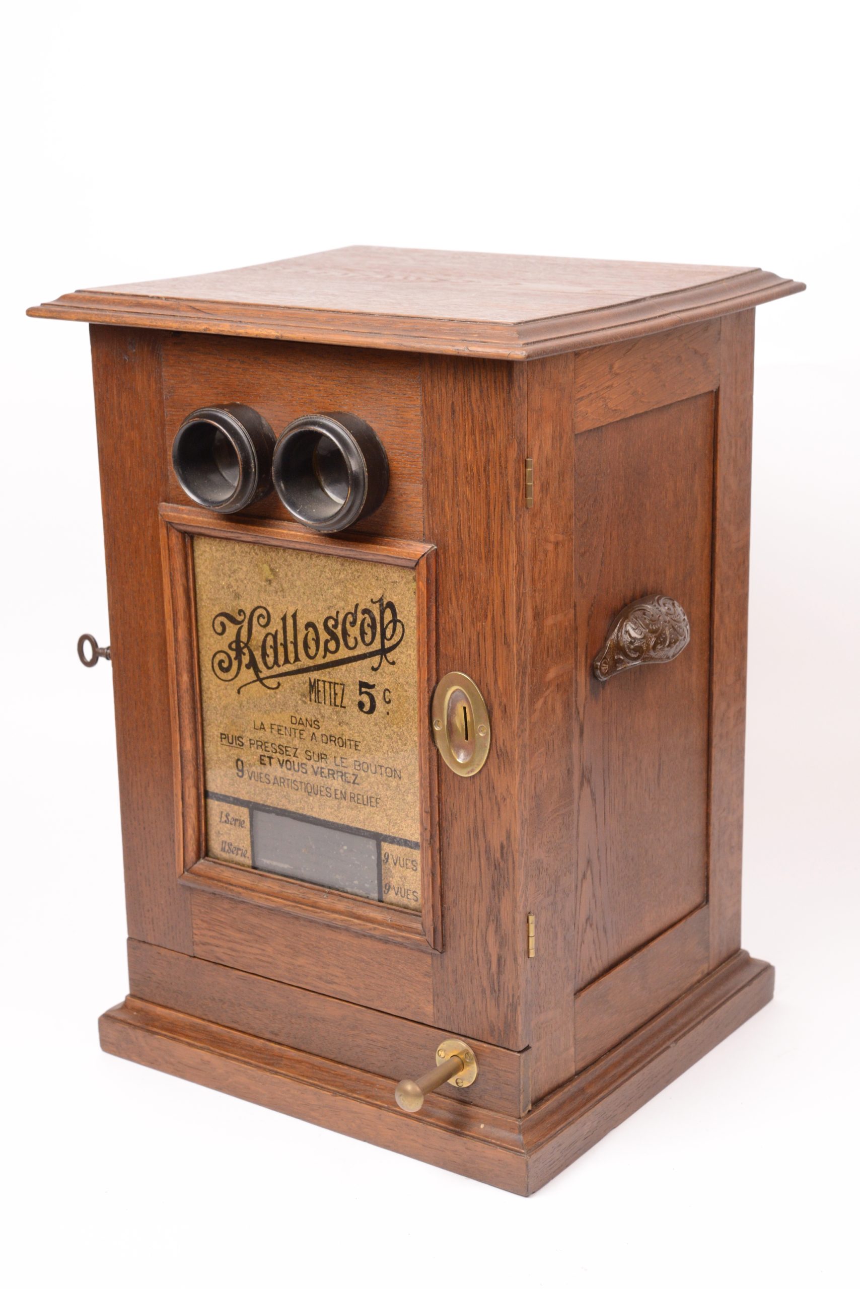 Stéréoscope à monnayeur Le Kalloscop. Produit par Polyphon Musikwerke dès 1895. Belle fabrication en chêne ciré. Sur la façade figure un cadre sous verre églomisé présentant les informations utiles. Le stéréoscope renferme neuf vues en relief. Il suffit d’introduire une pièce de monnaie pour voir apparaitre une première photographie en relief. Les huit autres stéréogrammes apparaissent successivement au fur et à mesure en pressant le petit bouton en laiton situé en bas de l’appareil à droite. Très bel état.