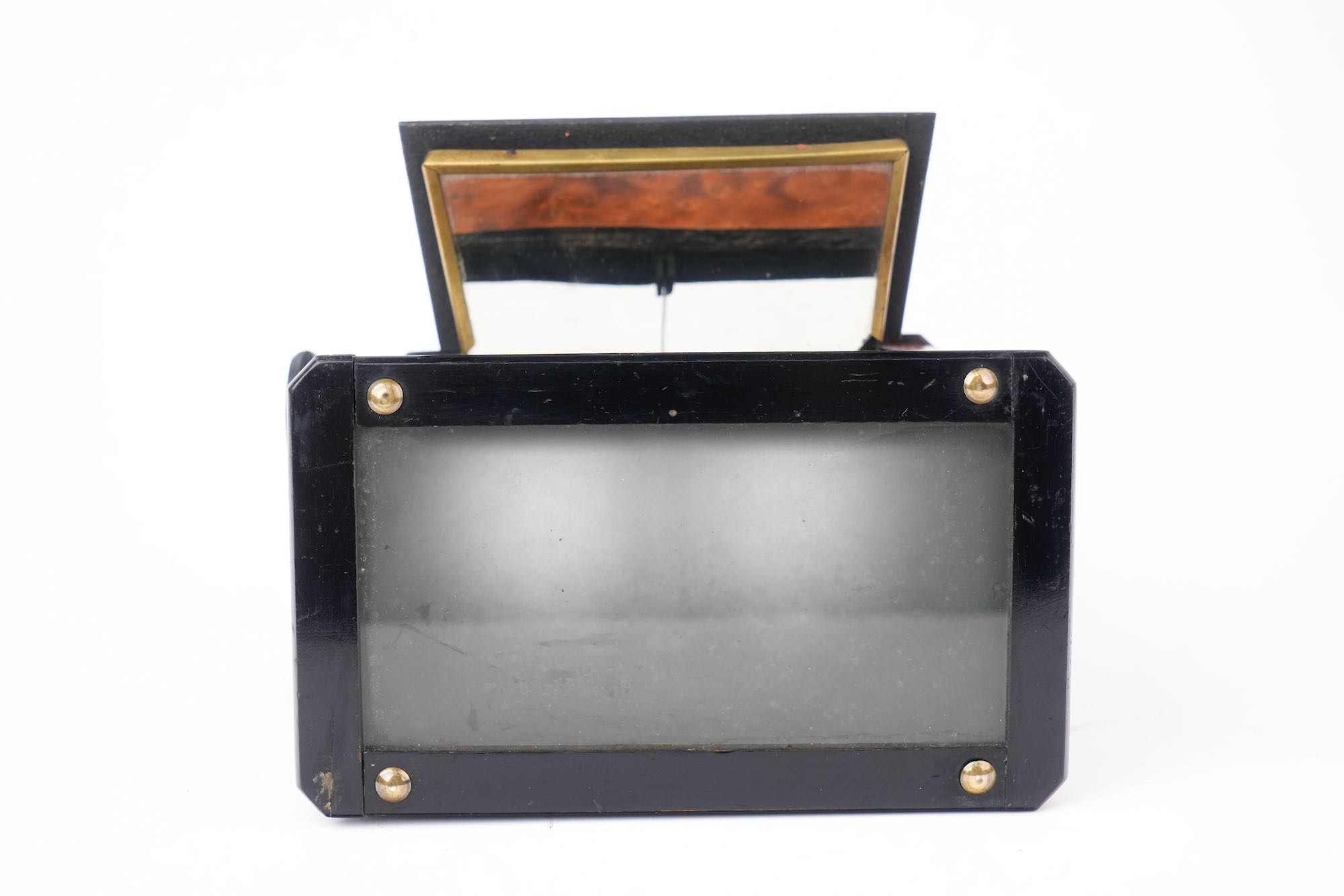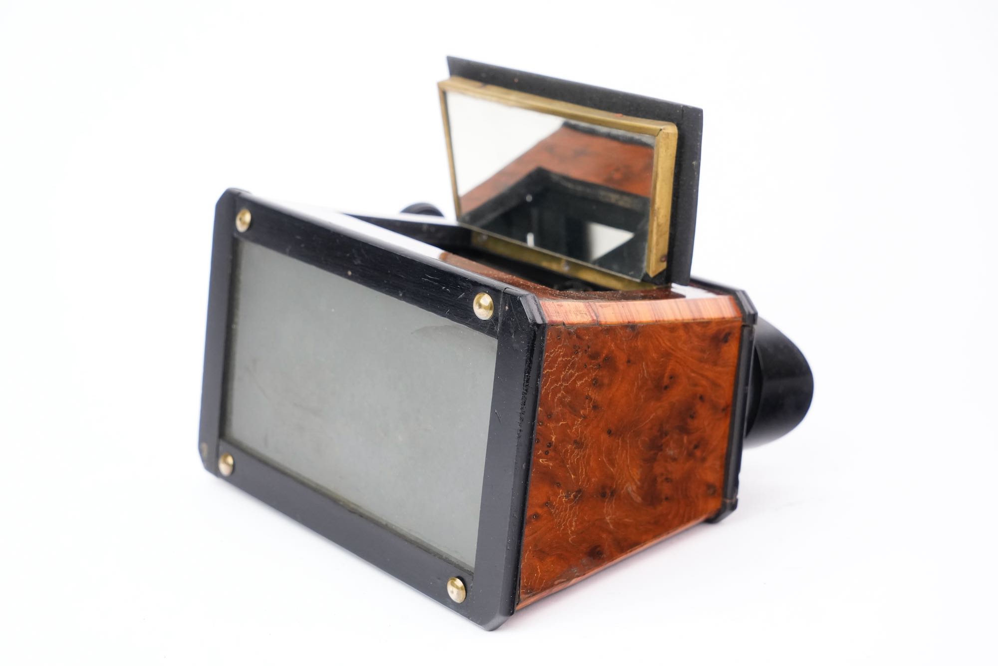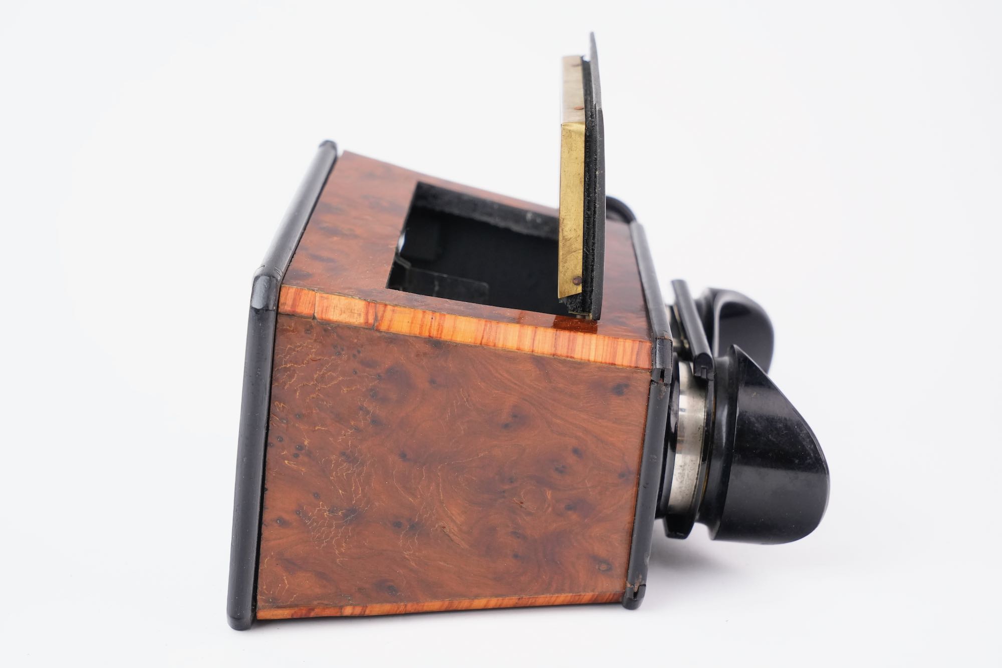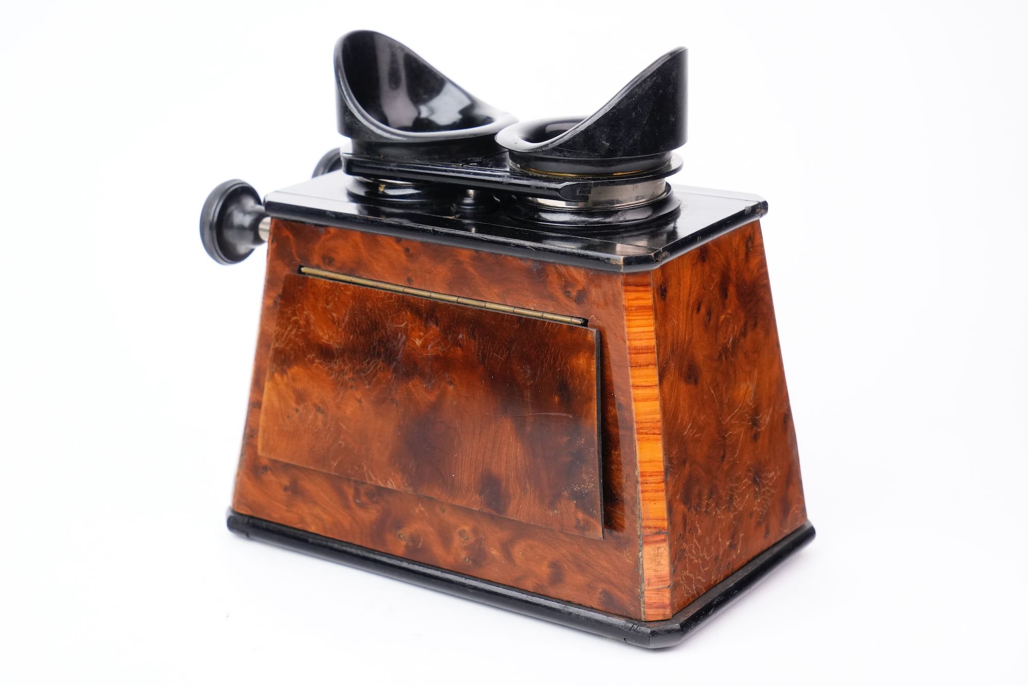 <div class="available-middle-text">Visionneuse stéréoscopique de fabrication soignée avec un assemblage de plusieurs essences. On reconnaît de la ronce de noyer pour les quatre panneaux principaux et du bois de rose pour les barrettes aux quatre angles. L'ajustement interoculaire est réglable et la mise au point l'est également. Miroir et dépoli en bon état. On relève la présence de quelques rayures et traces d'usure.</div>