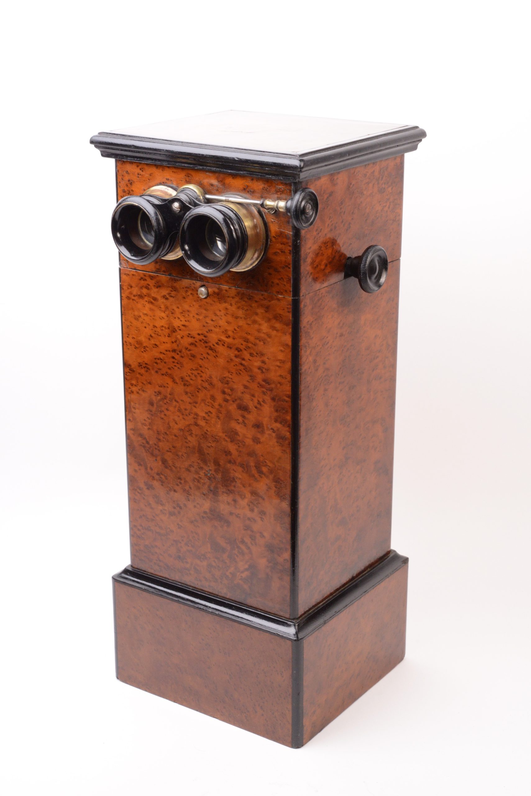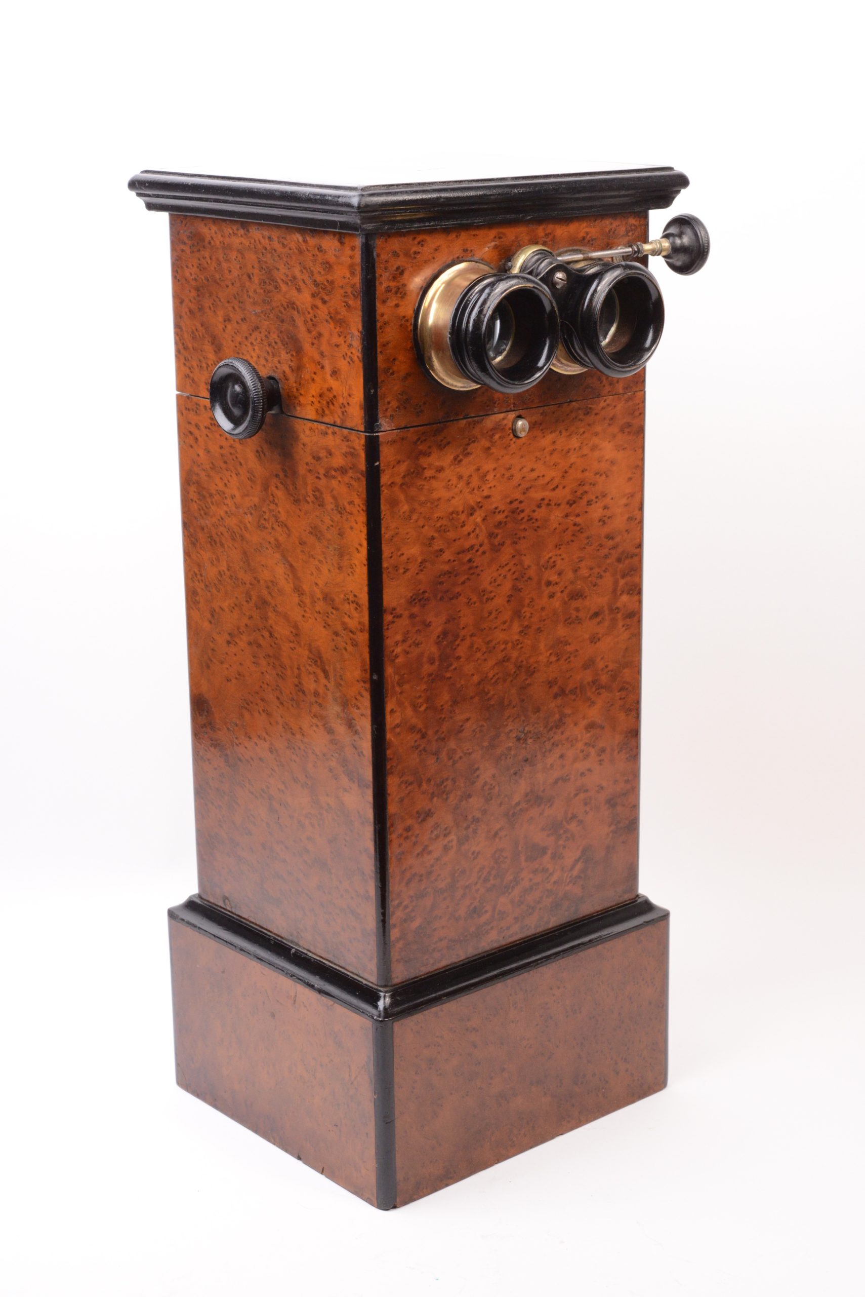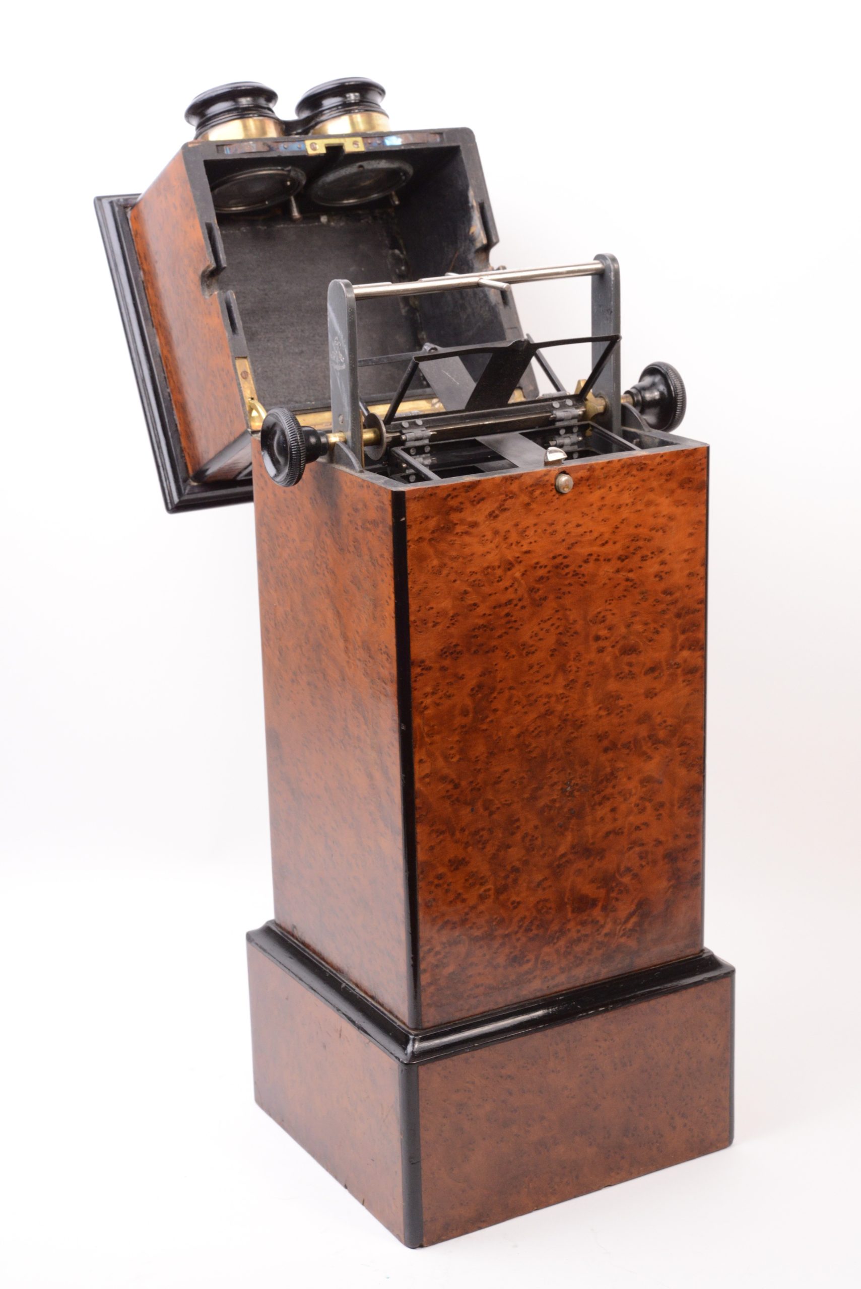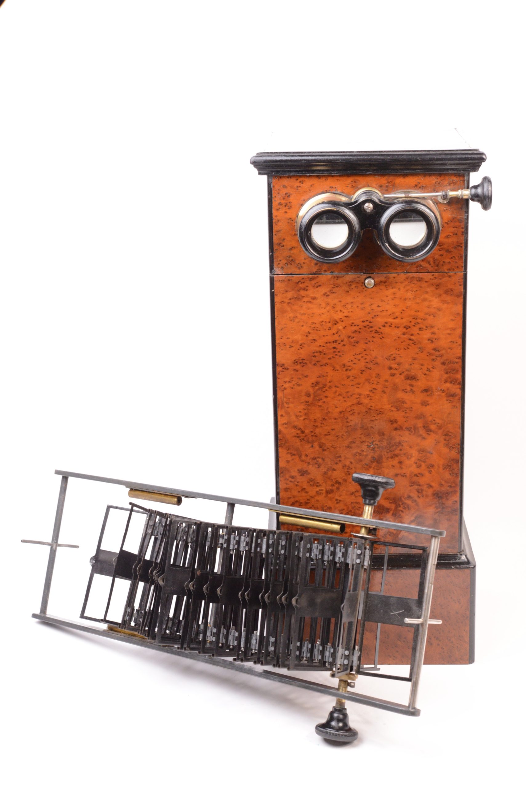 Stéréoscope de table 45x107. Belle fabrication en bois plaqué de ronce de thuya avec arrêtes et corniche en bois noirci. Coffrage étroit peu commun. La visionneuse reçoit un panier chargeur amovible interchangeable. Ce dernier porte le marquage « M-P-F » à l’étoile, caractéristique de Mattey qui avait rassemblé les maisons Legendre, Fouquet et Pennard spécialisées en stéréoscopie fin XIXème. Le chargeur peut contenir 50 vues disposées sur une chaîne rotative. Cette dernière est actionnée par deux boutons latéraux, assurant ainsi le changement de vues. A noter la qualité du groupe oculaire mu par un bouton actionnant une crémaillère. Très bel état.