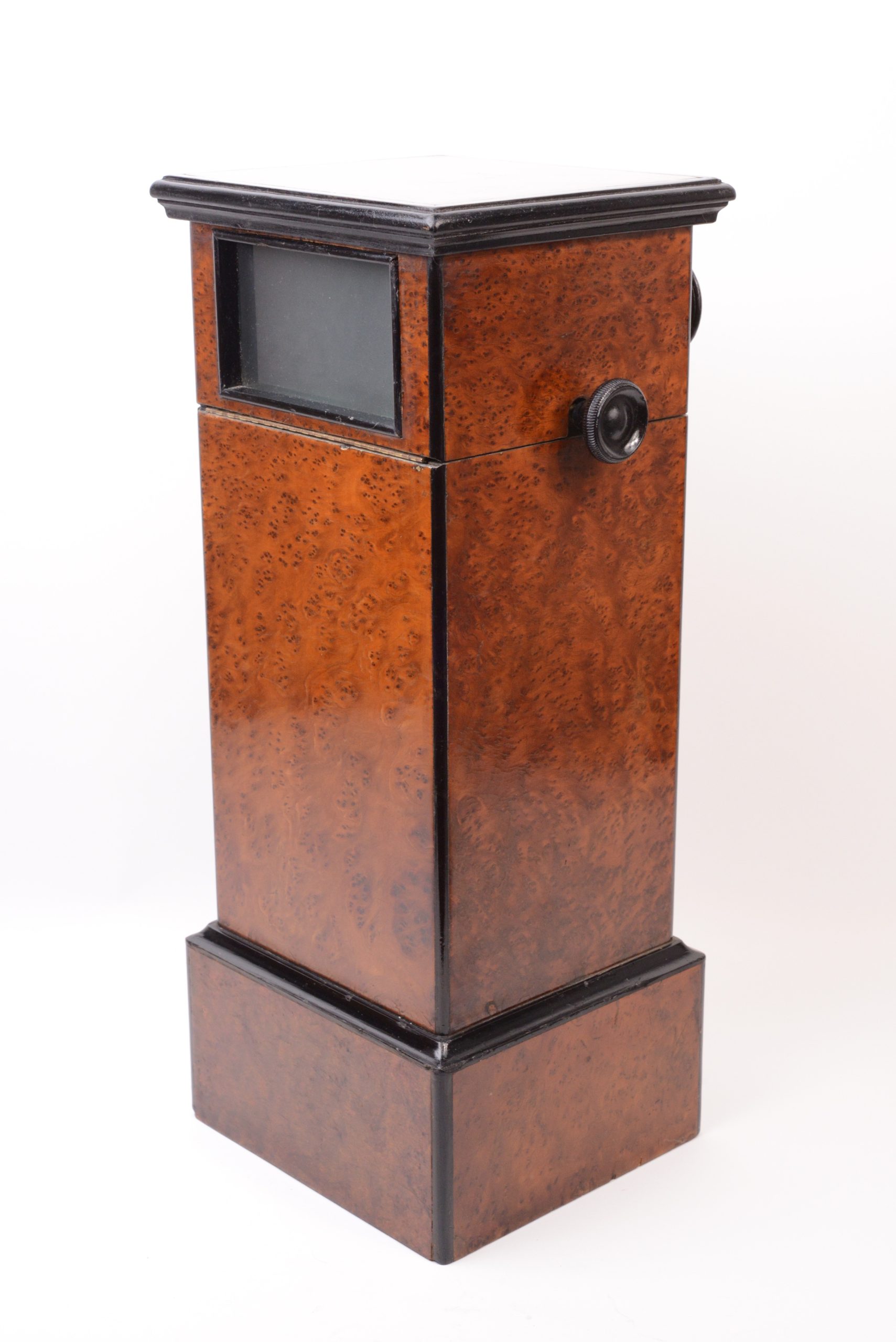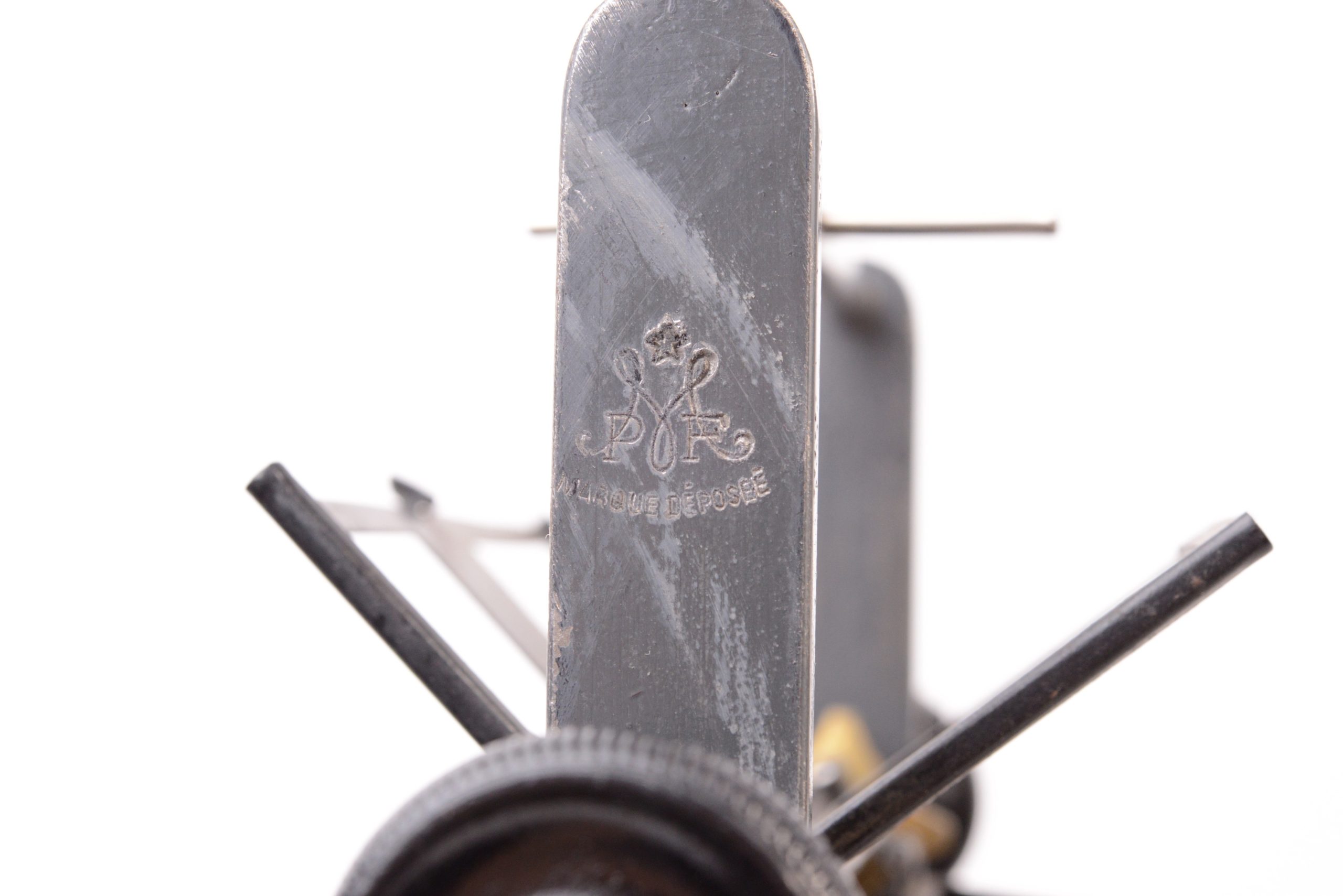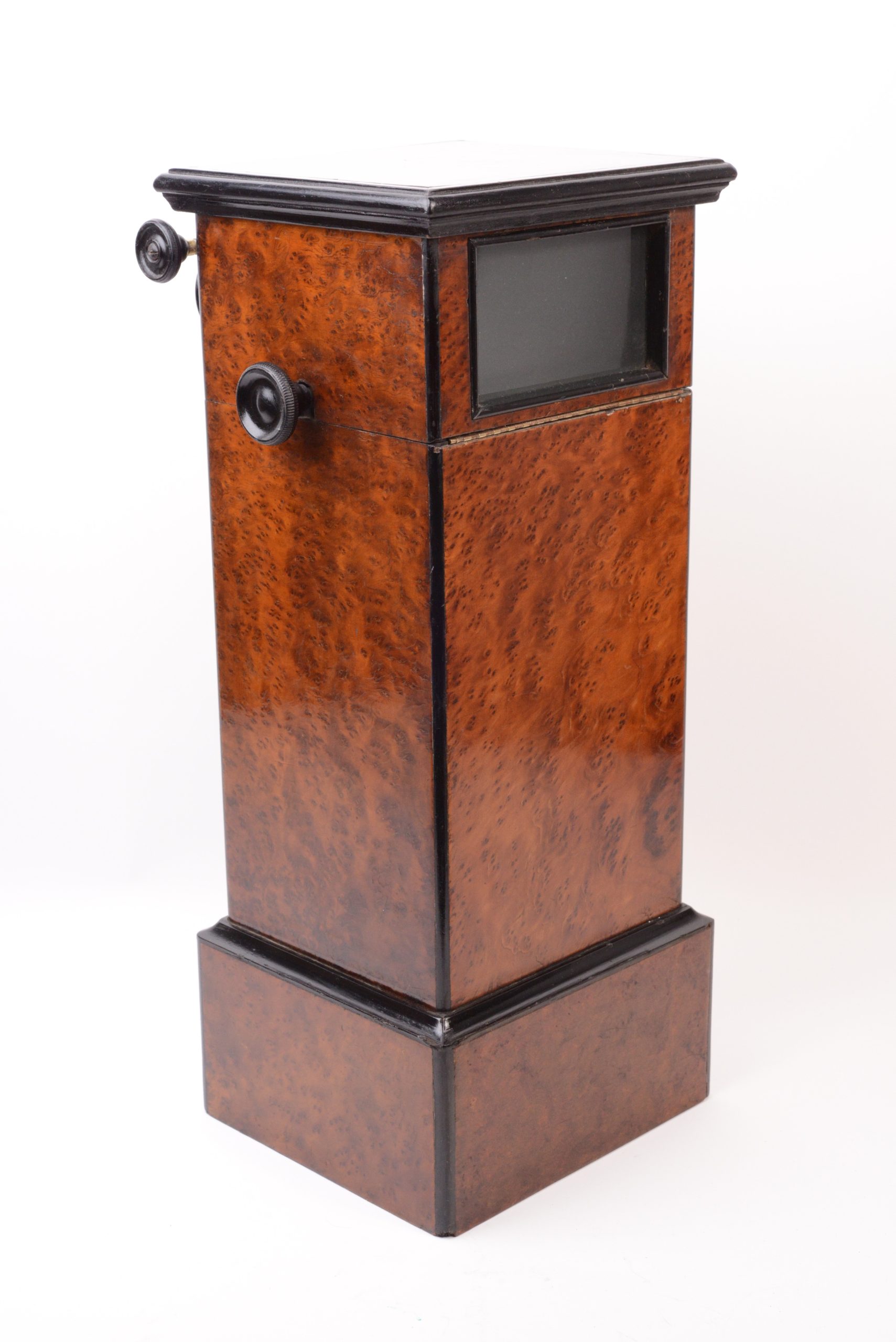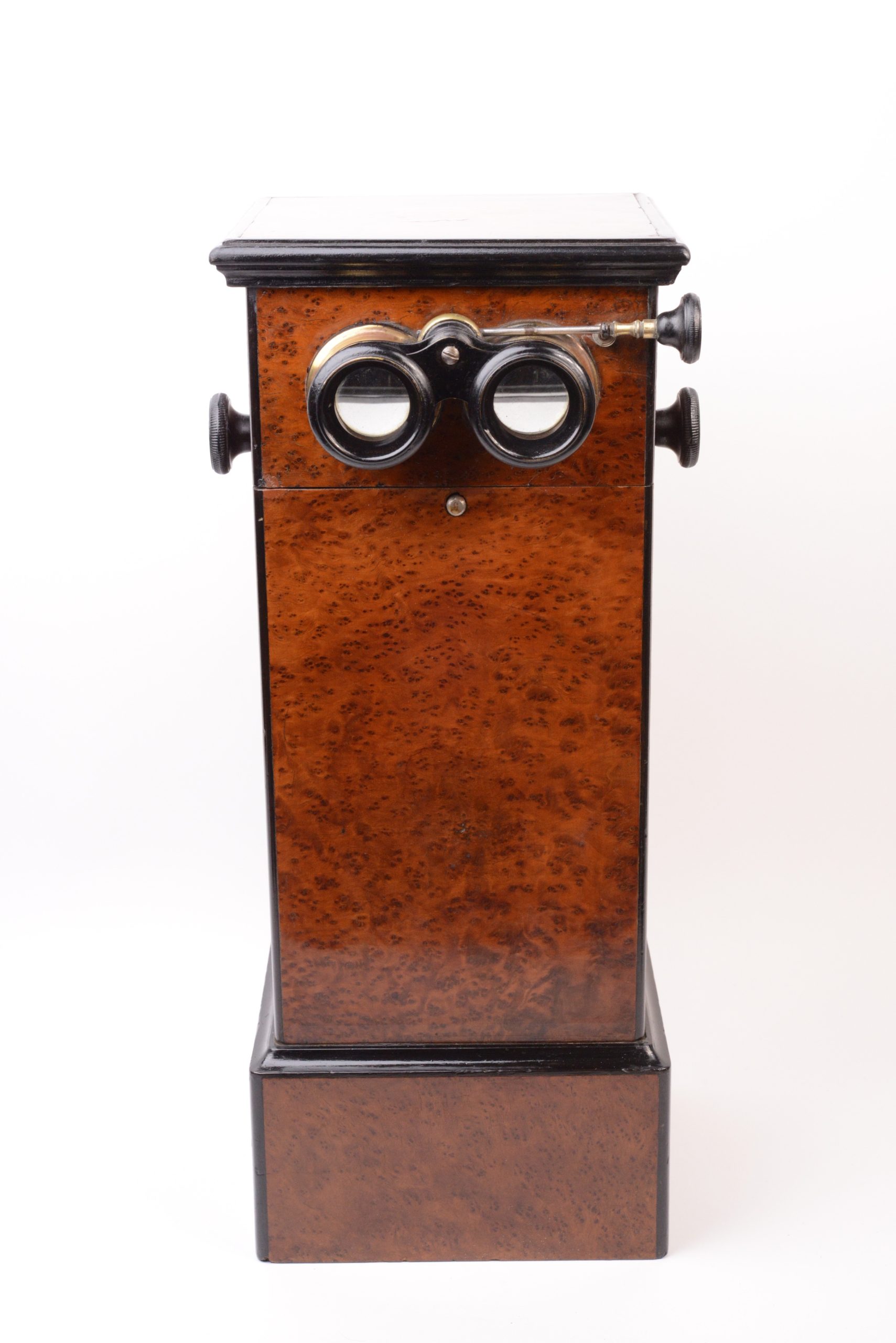 Stéréoscope de table 45x107. Belle fabrication en bois plaqué de ronce de thuya avec arrêtes et corniche en bois noirci. Coffrage étroit peu commun. La visionneuse reçoit un panier chargeur amovible interchangeable. Ce dernier porte le marquage « M-P-F » à l’étoile, caractéristique de Mattey qui avait rassemblé les maisons Legendre, Fouquet et Pennard spécialisées en stéréoscopie fin XIXème. Le chargeur peut contenir 50 vues disposées sur une chaîne rotative. Cette dernière est actionnée par deux boutons latéraux, assurant ainsi le changement de vues. A noter la qualité du groupe oculaire mu par un bouton actionnant une crémaillère. Très bel état.