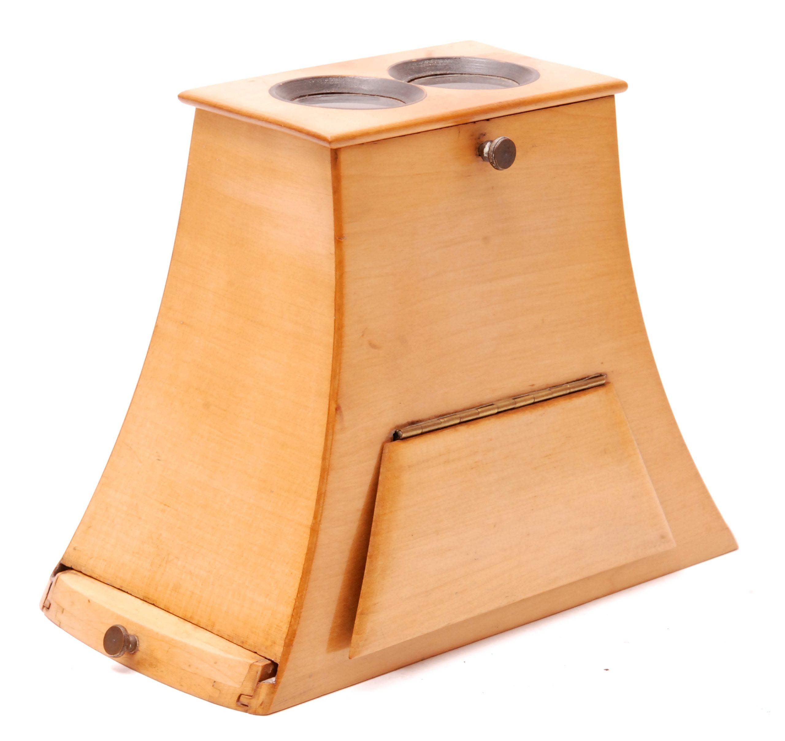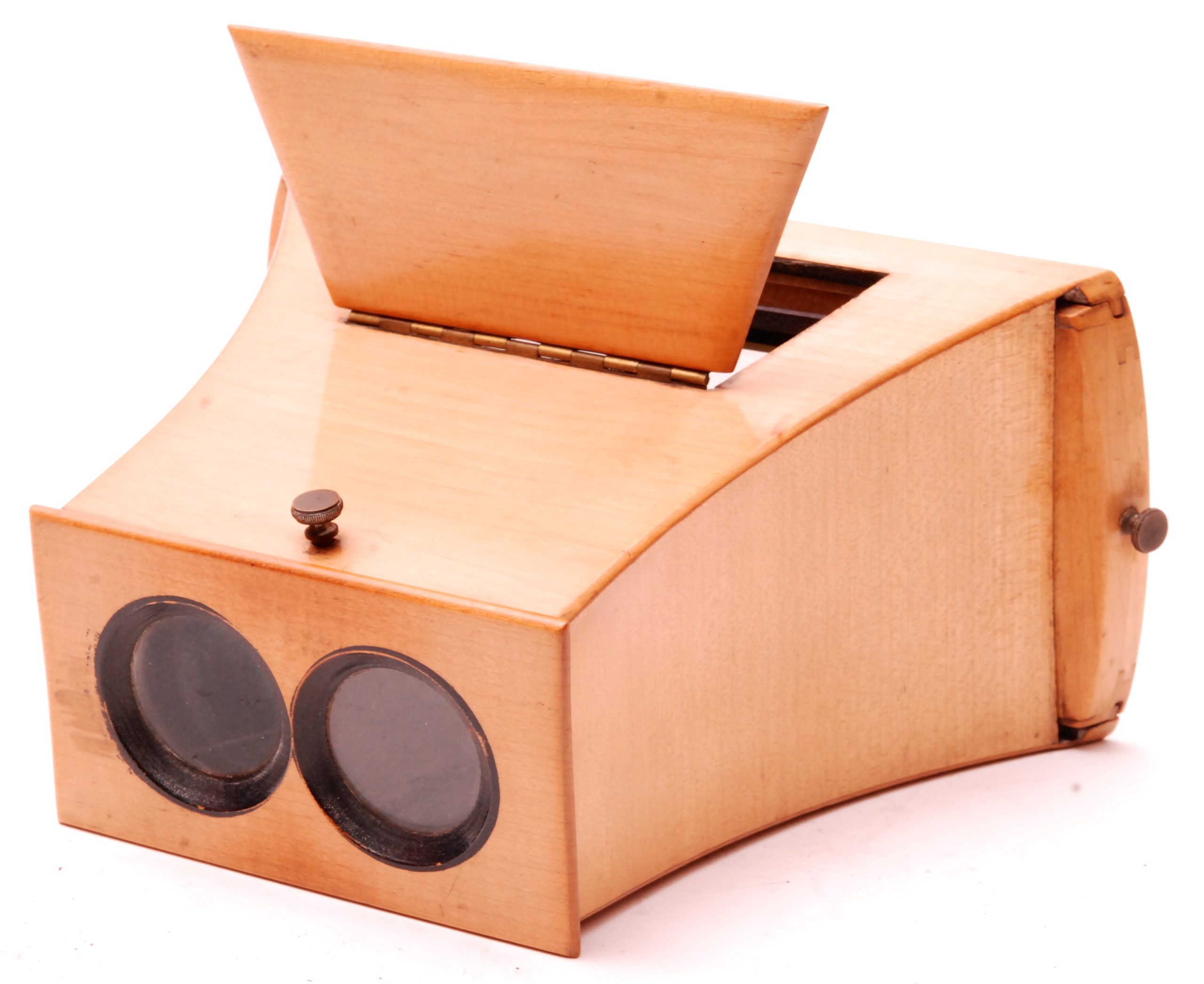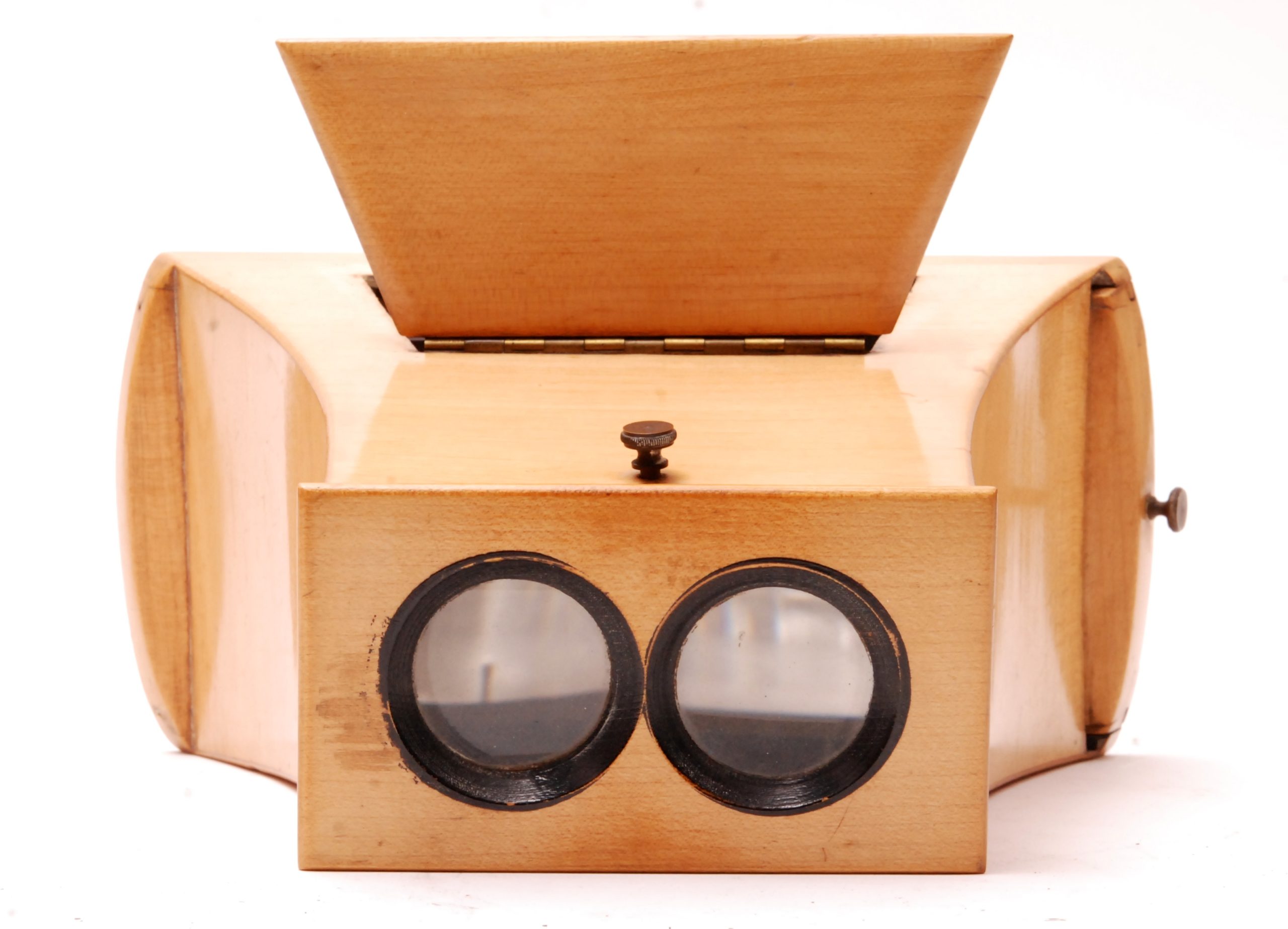 Ce stéréoscope de type Brewster est construit en bois de citronnier. il possède la marque au bi-gramme "D S" Duboscq-Soleil, correspondant à la période où Jules Duboscq était associé à son beau-père Jean-Baptiste François Soleil (Ca 1850). On remarque le système particulier à coulisse qui permet de recevoir en toute aisance et sécurité le stéréogramme daguerréotype ou collodion, monté sur cadre en verre. Un volet réflecteur permet d'éclairer les vues.