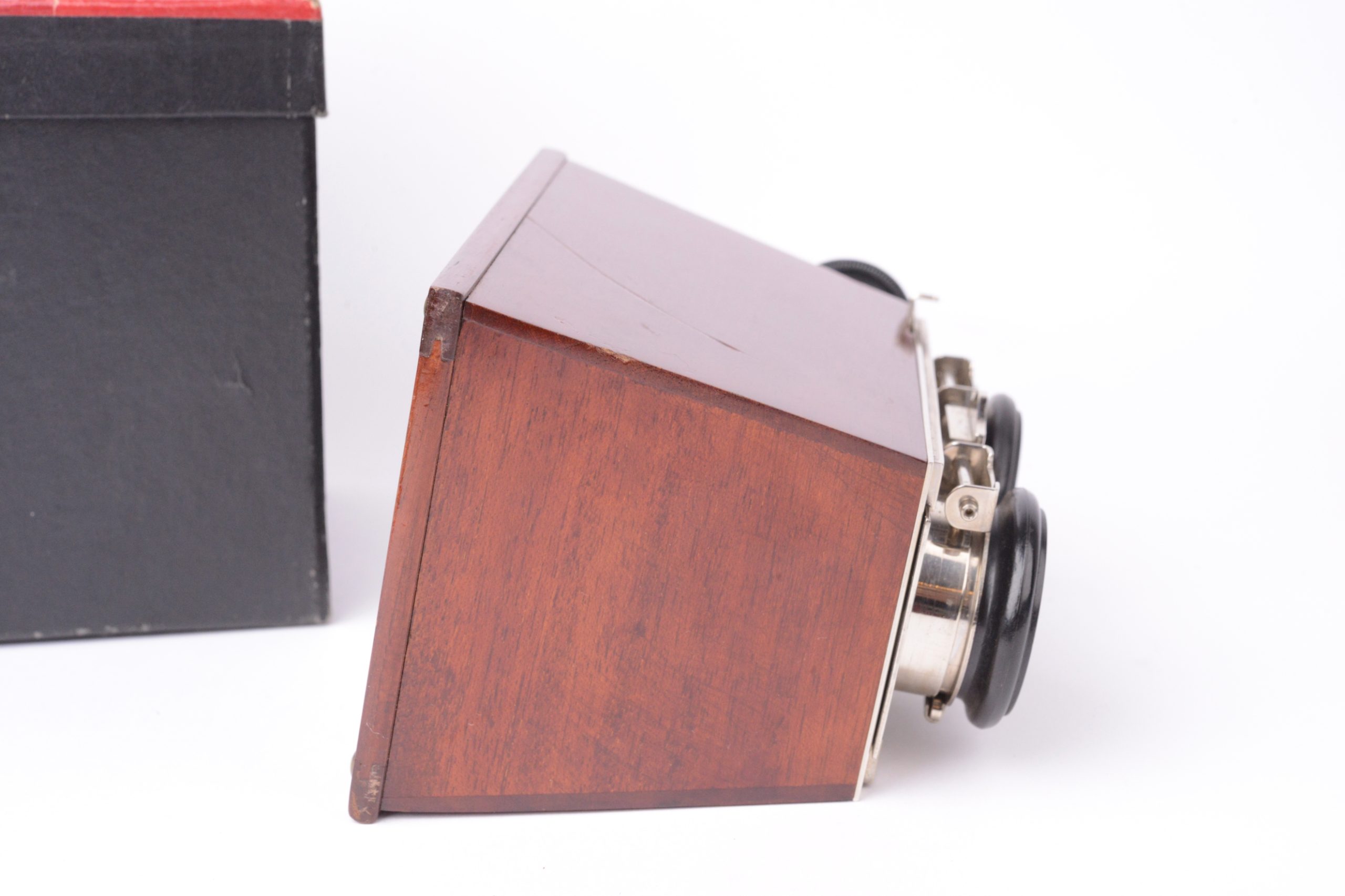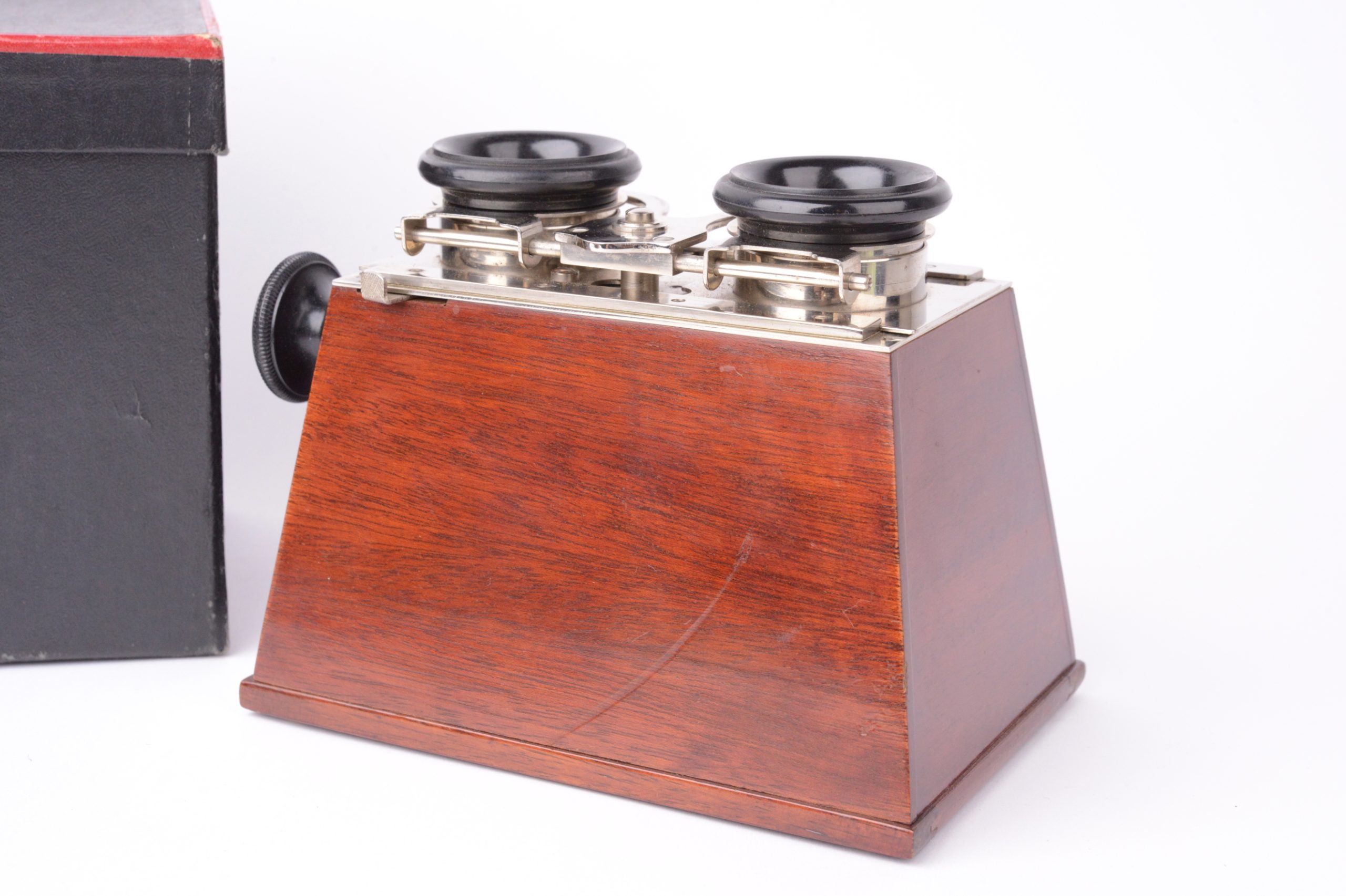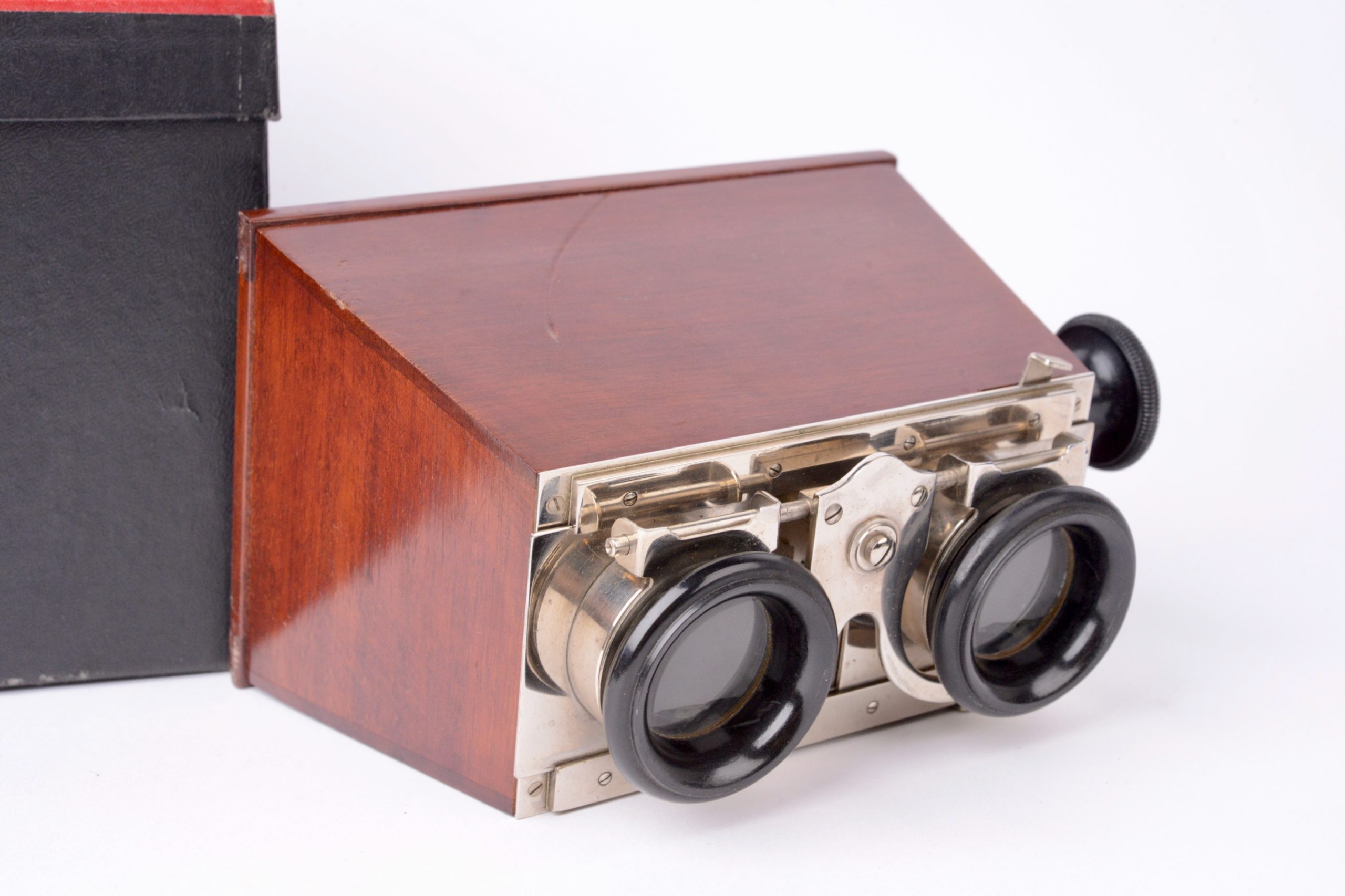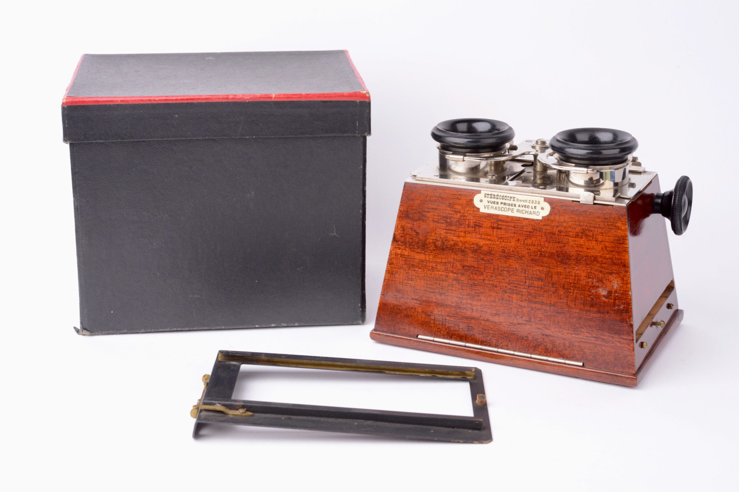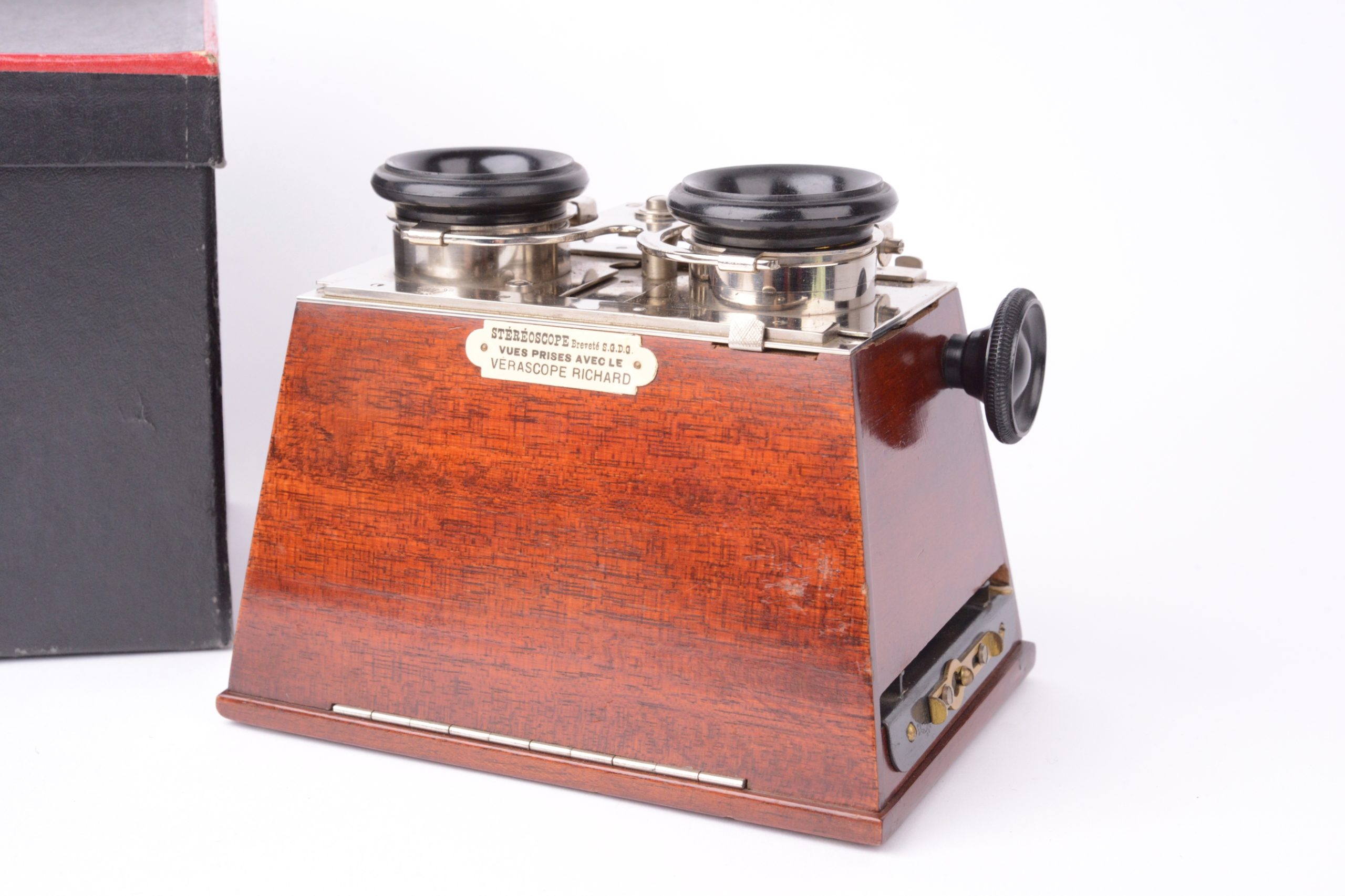 Stéréoscope Jules Richard 6x13 – 7x13. Belle fabrication en acajou verni. Objectifs achromatiques. La platine avant et le dispositif portant les oculaires à écartement variable sont en métal chromé. La mise au point s’effectue par bouton et crémaillère. Boite de transport en carton. Belle fabrication.