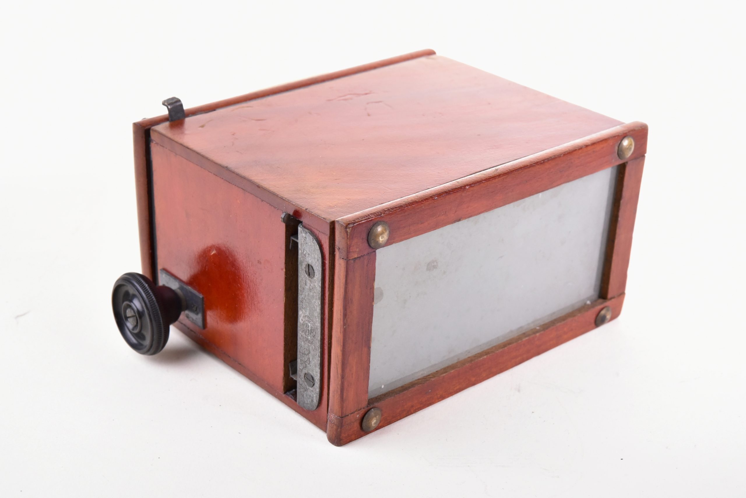 Stéréoscope Jules Richard pour autochromes. Modèle inverseur à prismes permettant de visionner les couples de vues autochromes 45x107. Ajustement à la vue par molette et réglages de l’écartement des oculaires sur la façade avant. Construction acajou. Platine avant avec parties métalliques en cuivre argenté oxydé verni, à l’image des Vérascopes. Vers 1915.