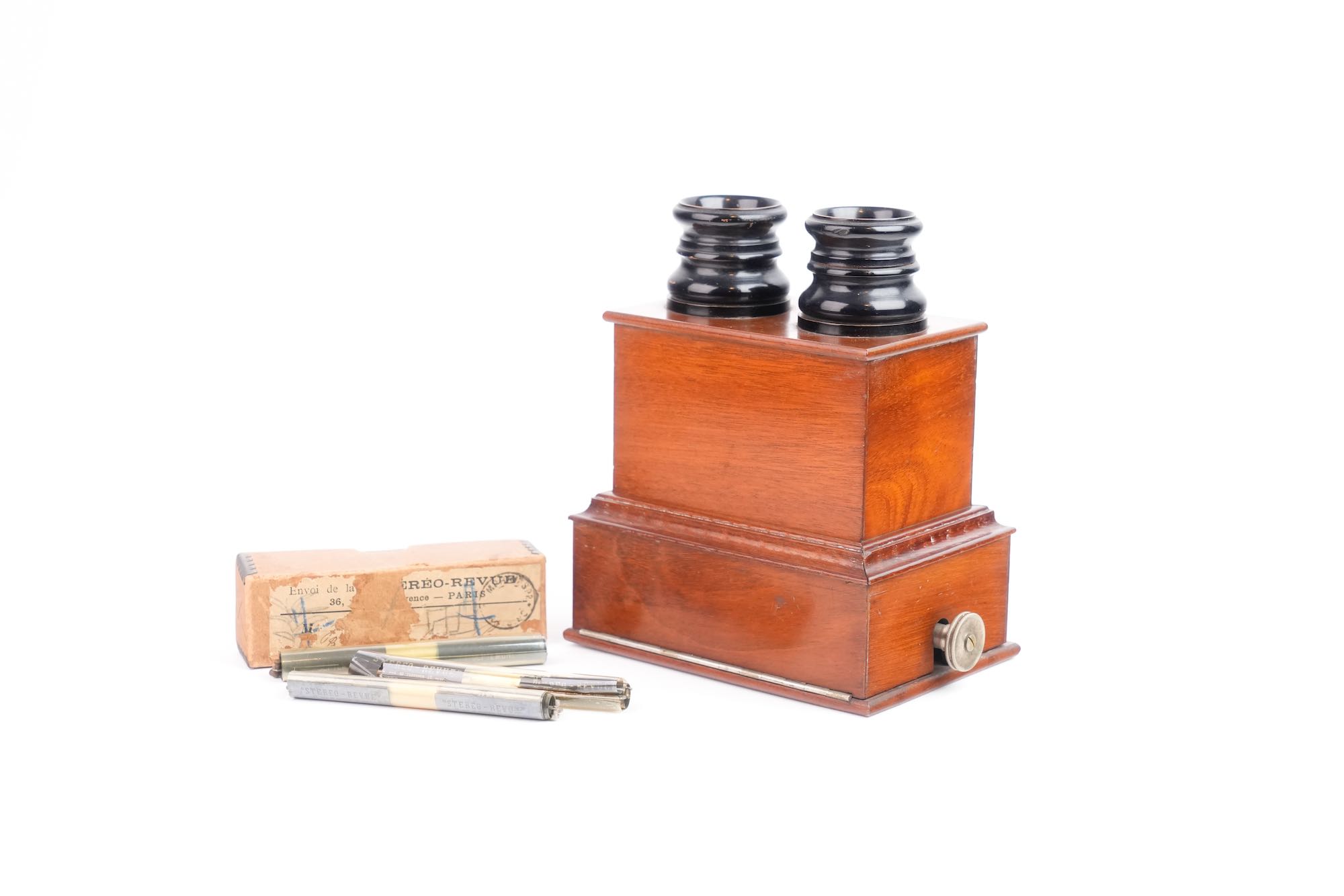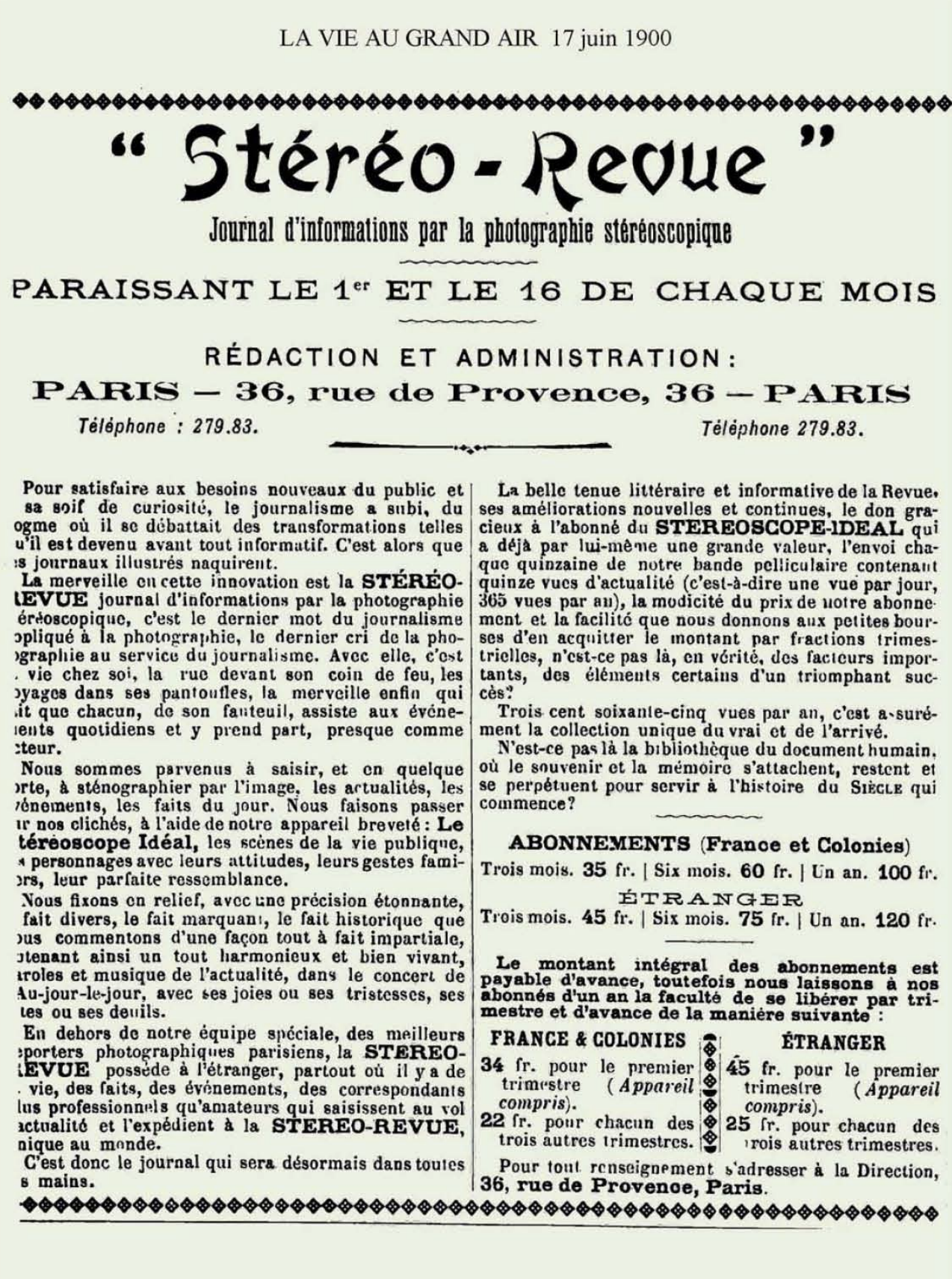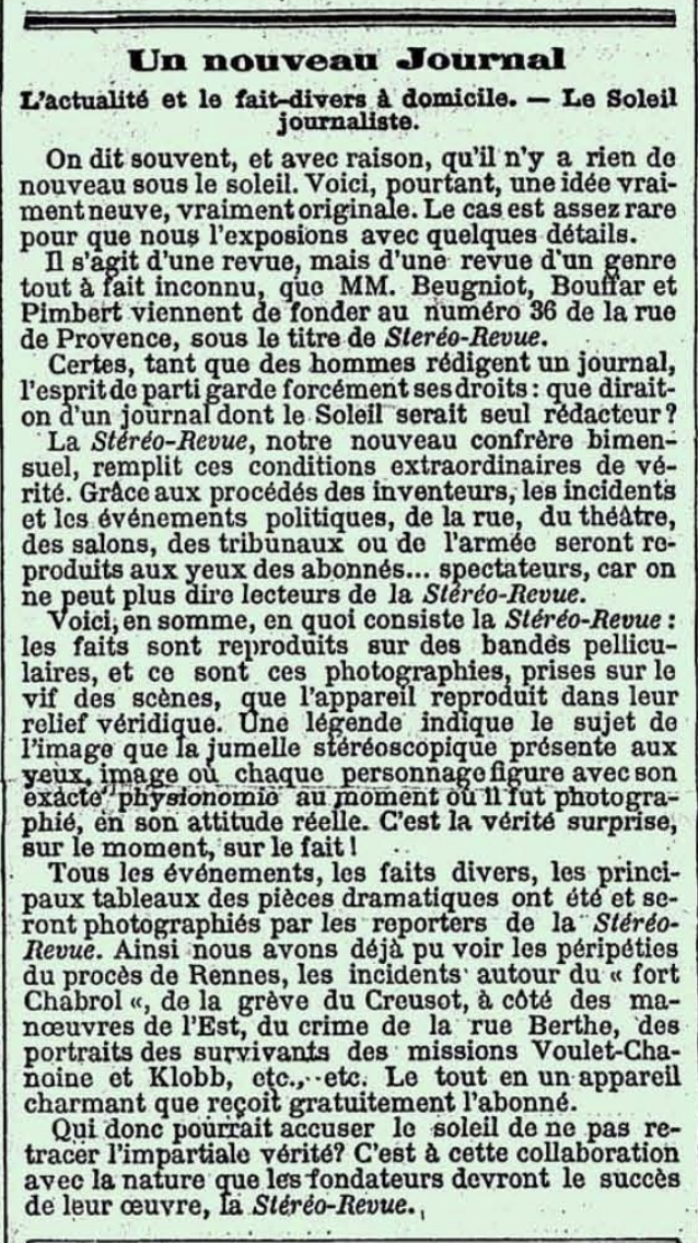 Stéréo-Revue — Lancée à Paris à la charnière des XIXᵉ et XXᵉ siècles, la Stéréo-Revue est un journal d’actualité diffusé sous forme de bandes photographiques stéréoscopiques, consultables au moyen d’un appareil portatif à double oculaire. Grâce à un mécanisme manuel permettant le défilement continu des images, l’abonné découvre en relief des scènes de la vie politique, sociale et culturelle contemporaine. À la croisée de la presse illustrée, de la photographie et des dispositifs de pré-cinéma, la Stéréo-Revue constitue l’une des premières tentatives de journalisme visuel immersif.