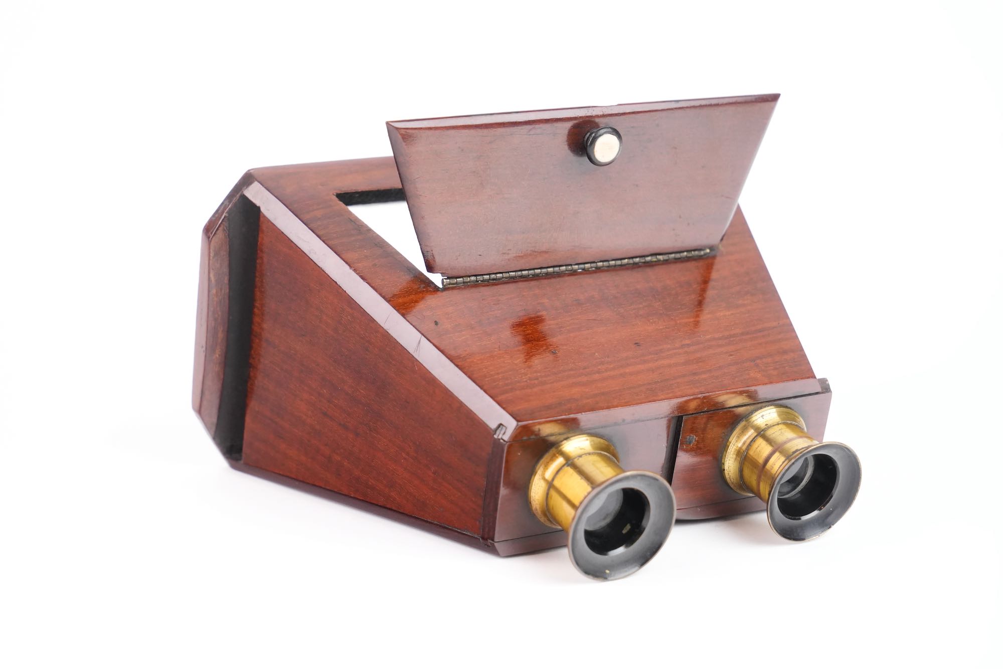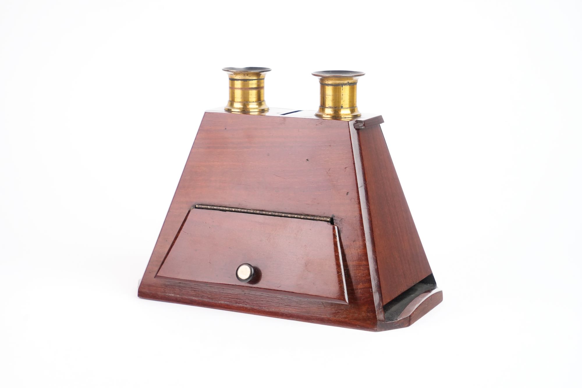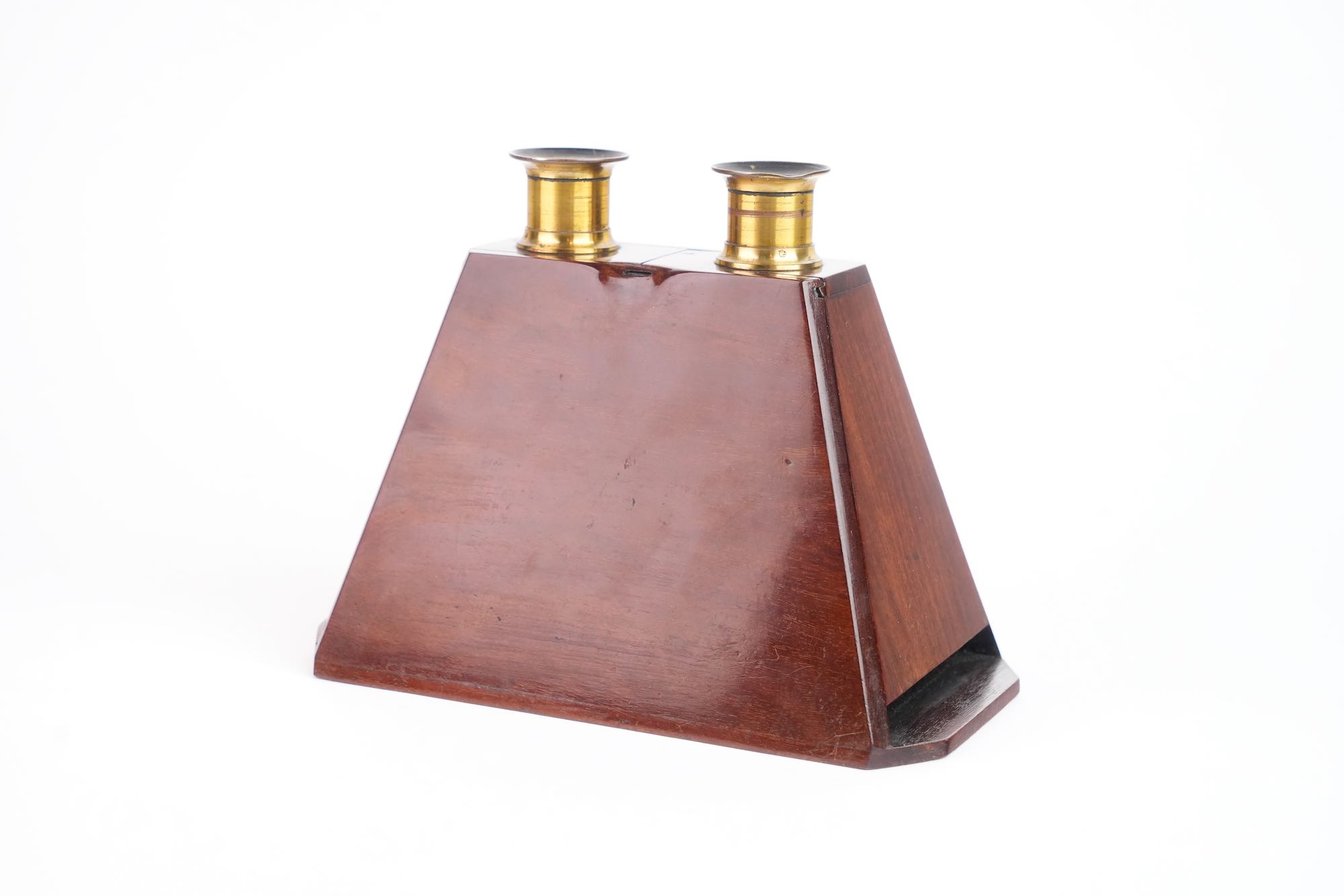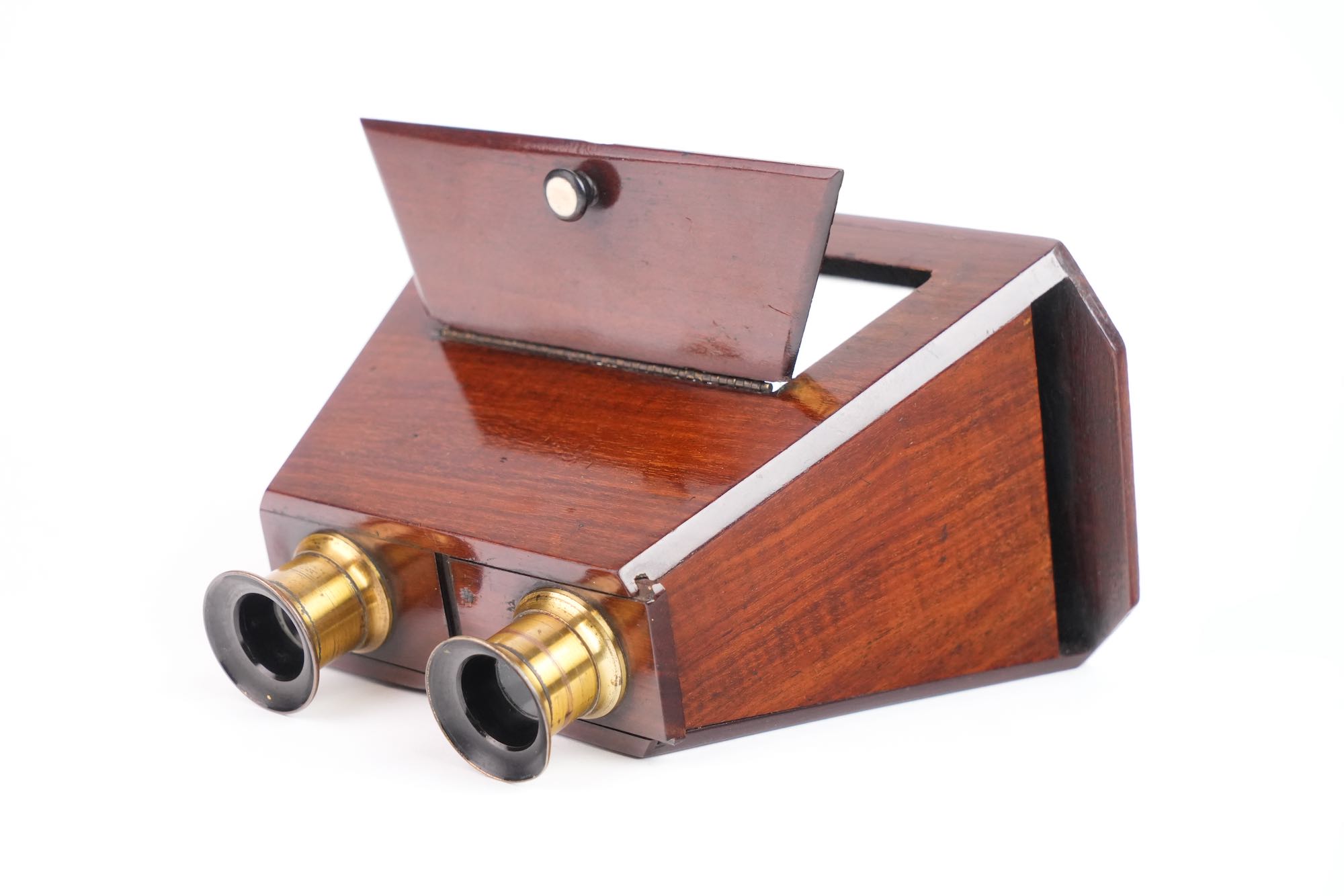 Stéréoscope primitif vers 1850/55. Stéréoscope pour le visionnage les vues stéréoscopiques. On note un assemblage à pan coupé droit et biseauté, les stéréoscopes un peu plus tardif sont galbés galbés . L'essence de bois employée est le palissandre. Les oculaires sont en laiton avec écartement des oculaires. Petite poignée en os pour le rabat réflecteur.