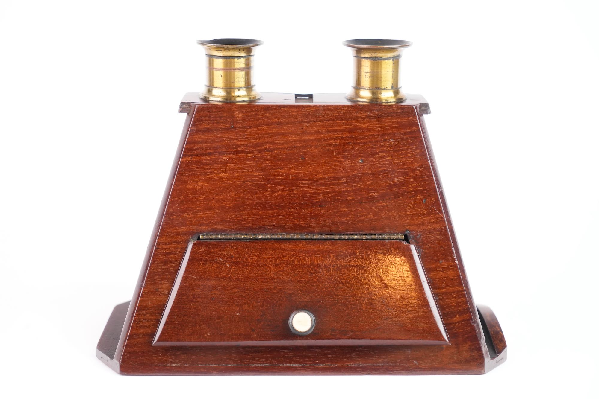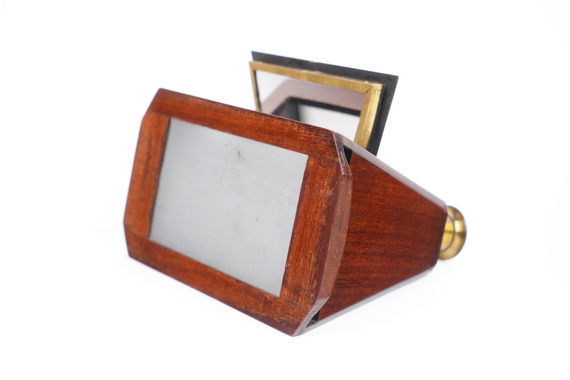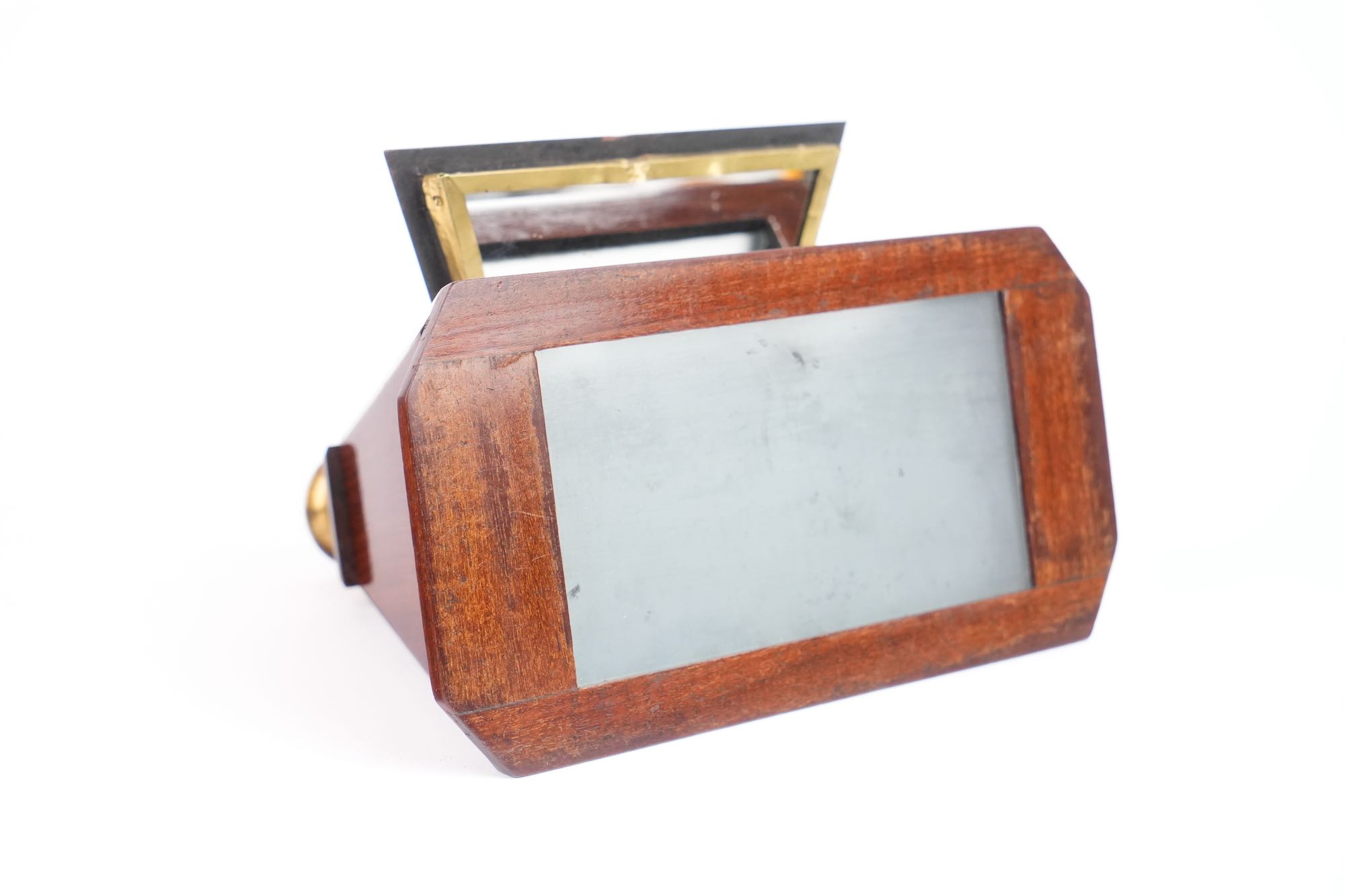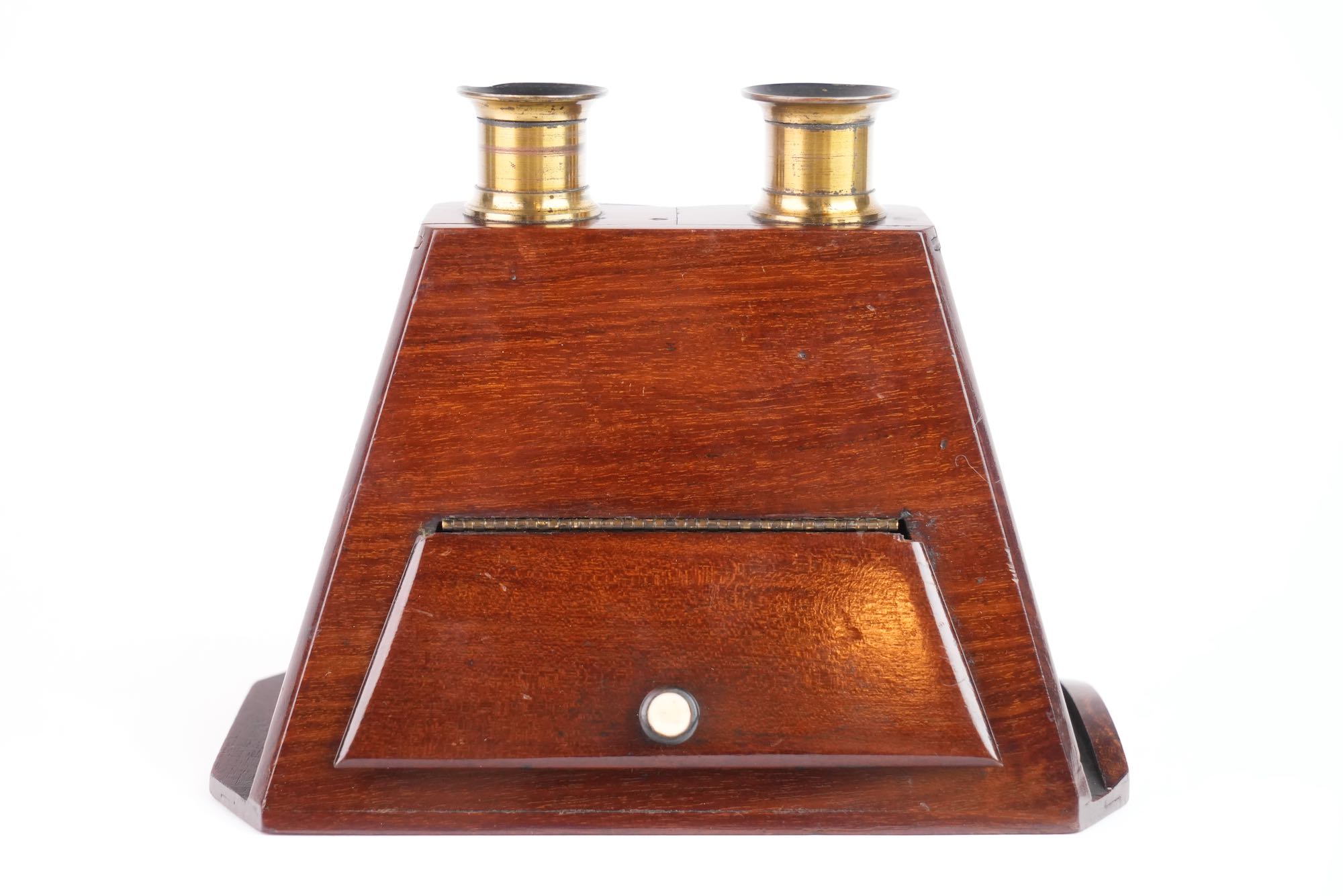 Stéréoscope primitif vers 1850/55. Stéréoscope pour le visionnage les vues stéréoscopiques. On note un assemblage à pan coupé droit et biseauté, les stéréoscopes un peu plus tardif sont galbés galbés . L'essence de bois employée est le palissandre. Les oculaires sont en laiton avec écartement des oculaires. Petite poignée en os pour le rabat réflecteur.
