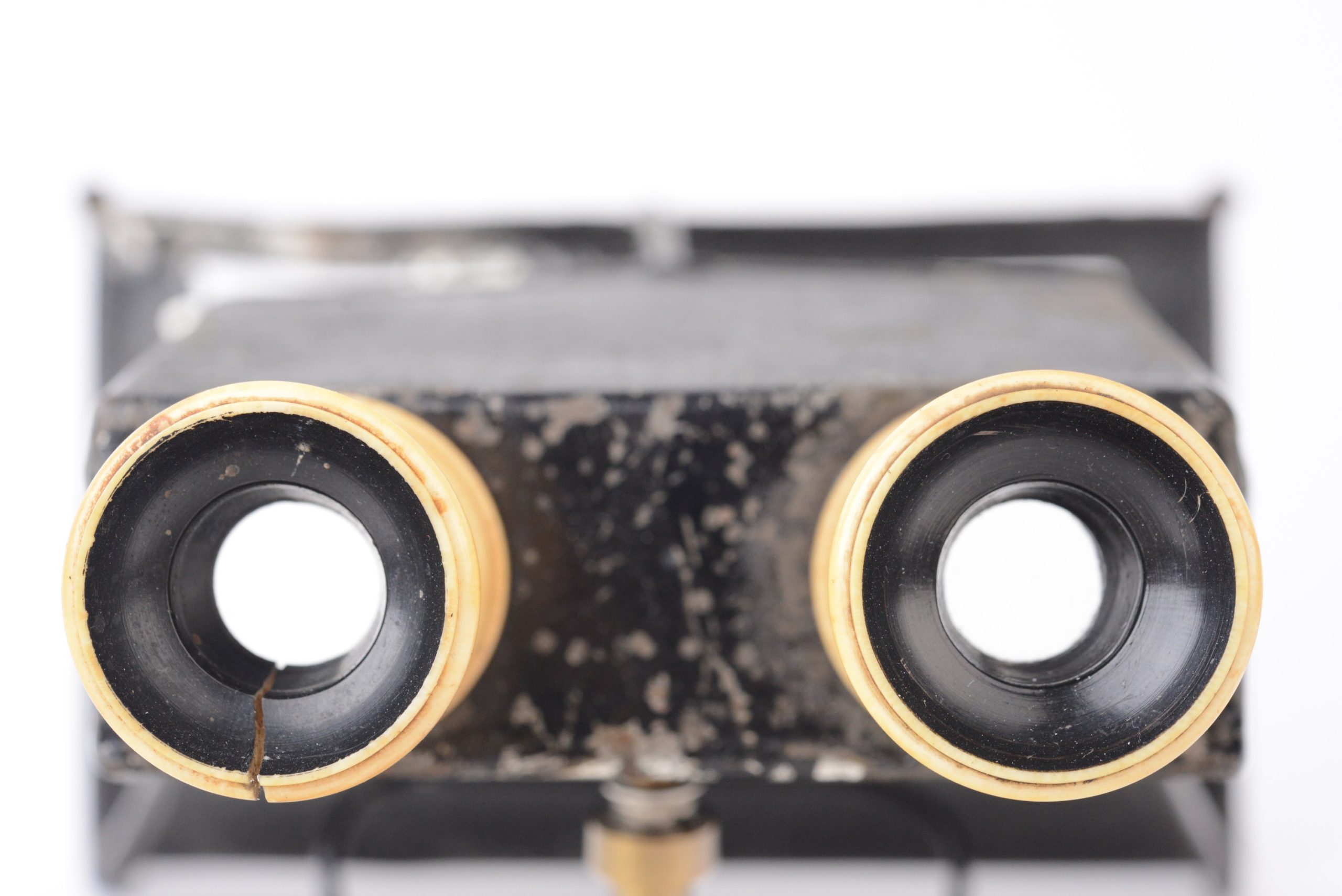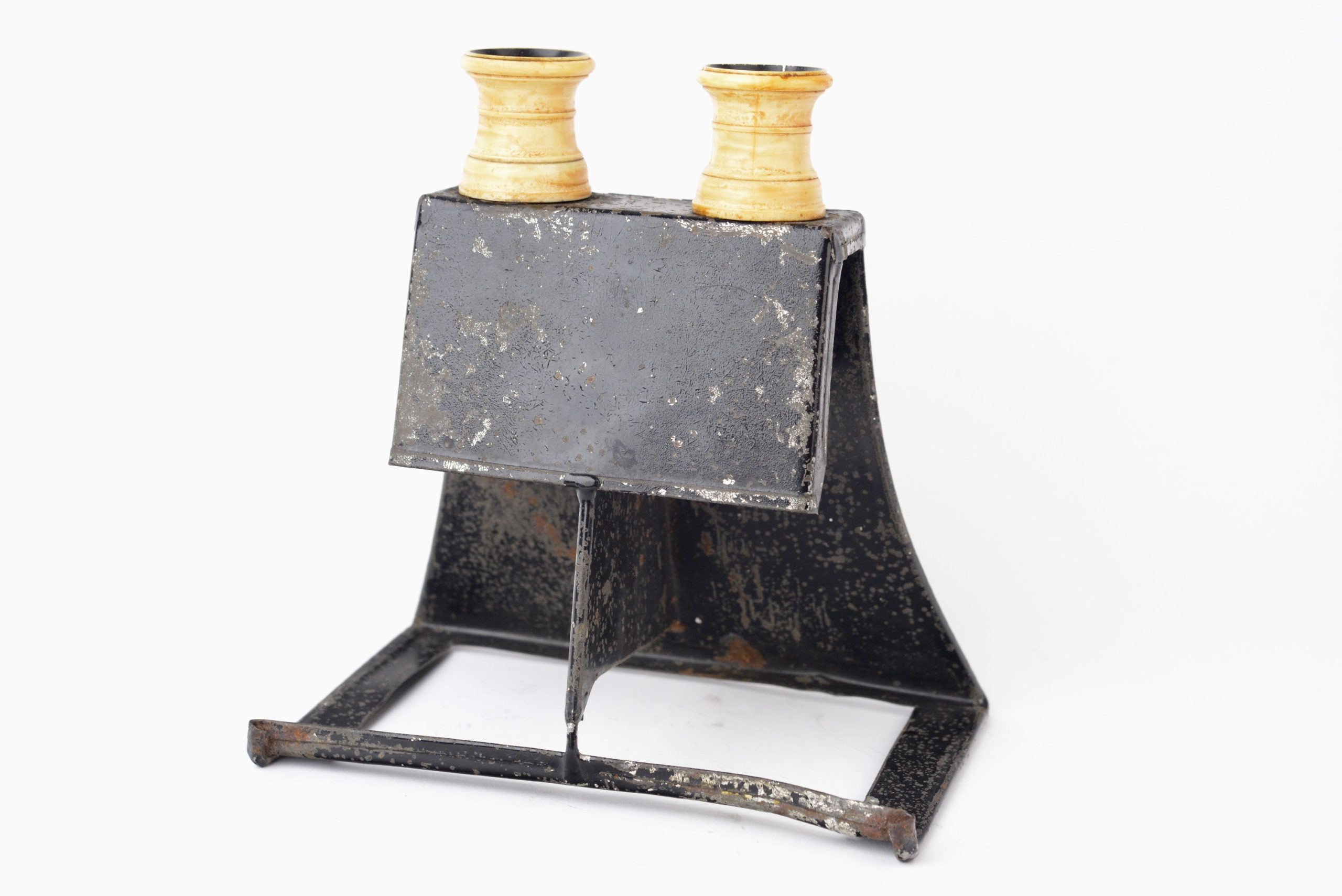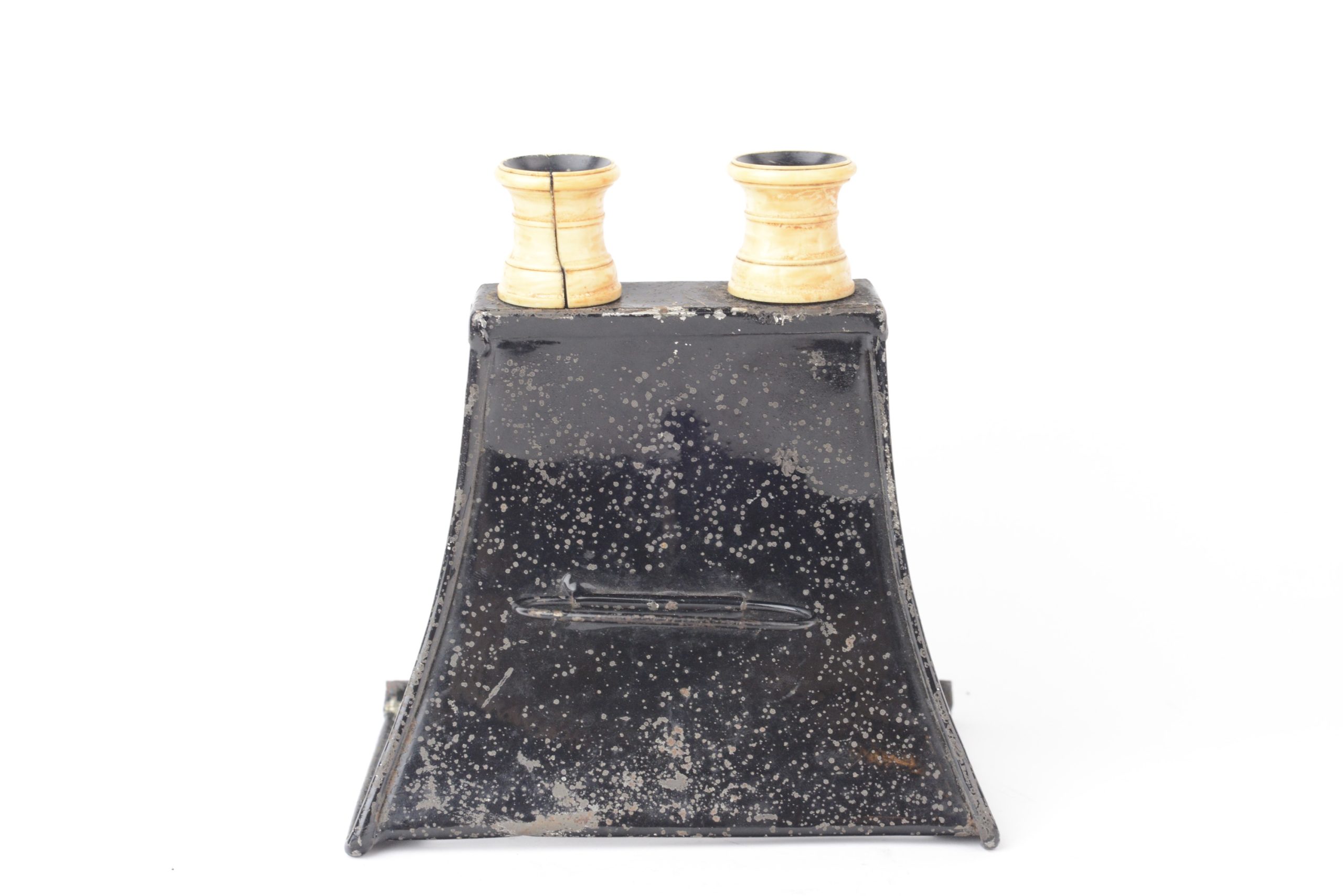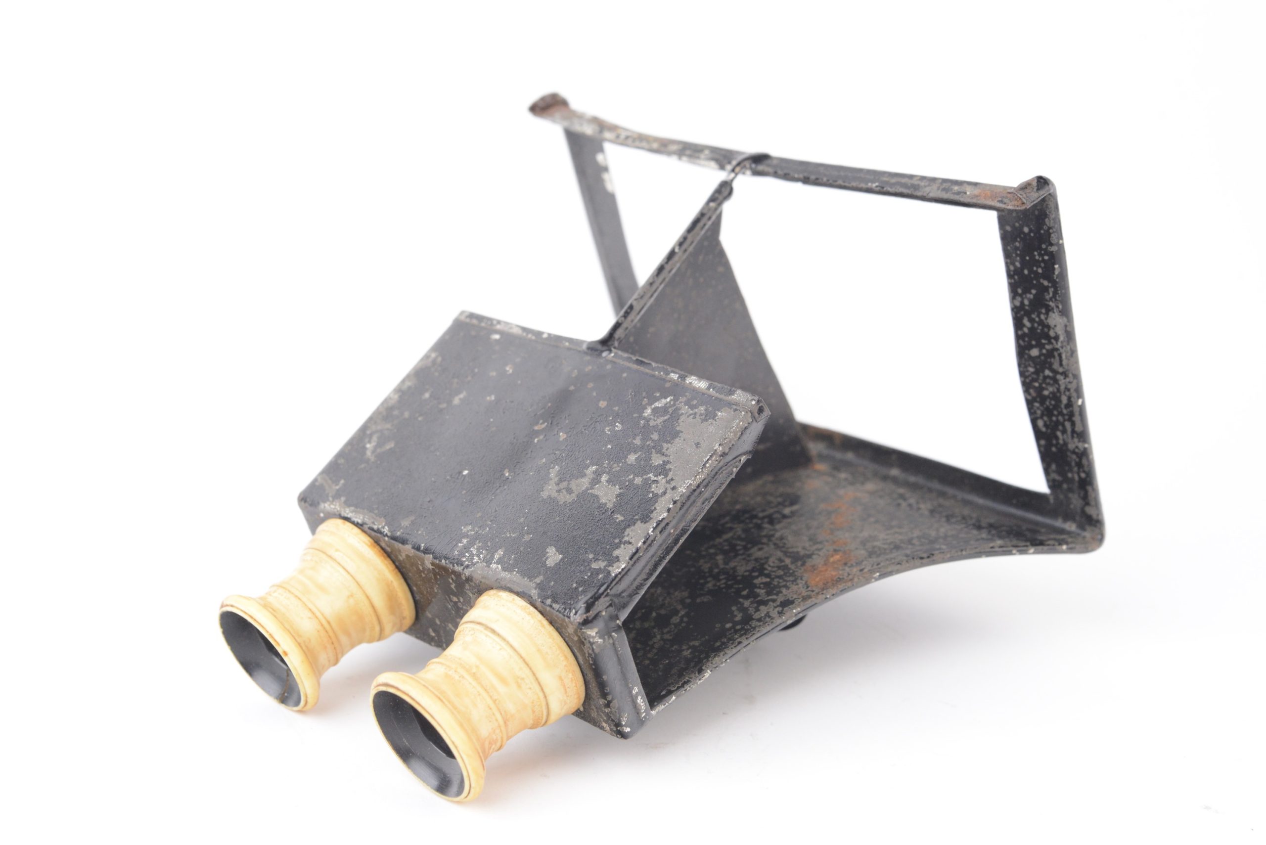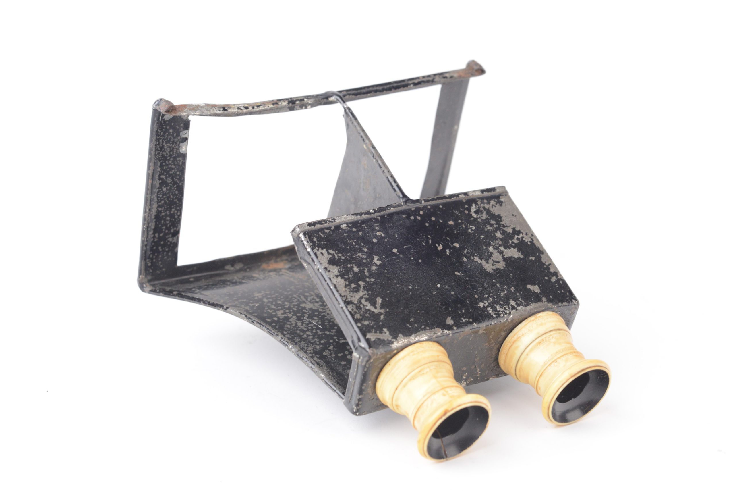 Stéréoscope primitif circa 1850. Ce stéréoscope est de toute rareté.  Il est construit tout en fer blanc noirci avec une simple séparation optique en toile noire. Les oculaires sont cependant en ivoire tourné, une gravure du même modèle figure page 9 de l’excellent ouvrage Stéréoscopes The First One Hundred Years de Paul Wing.