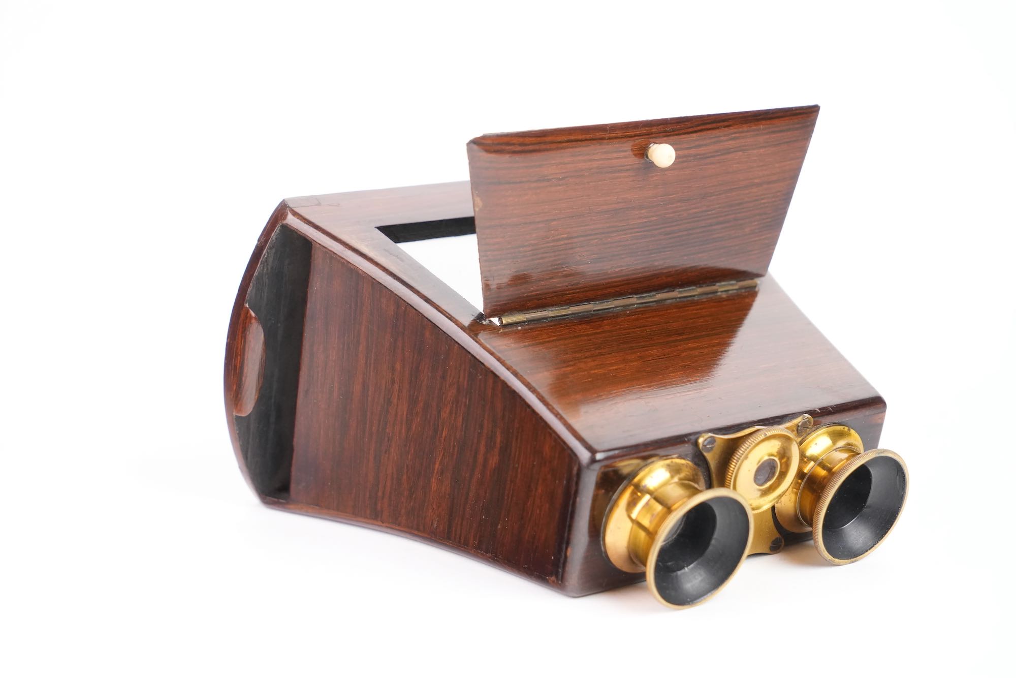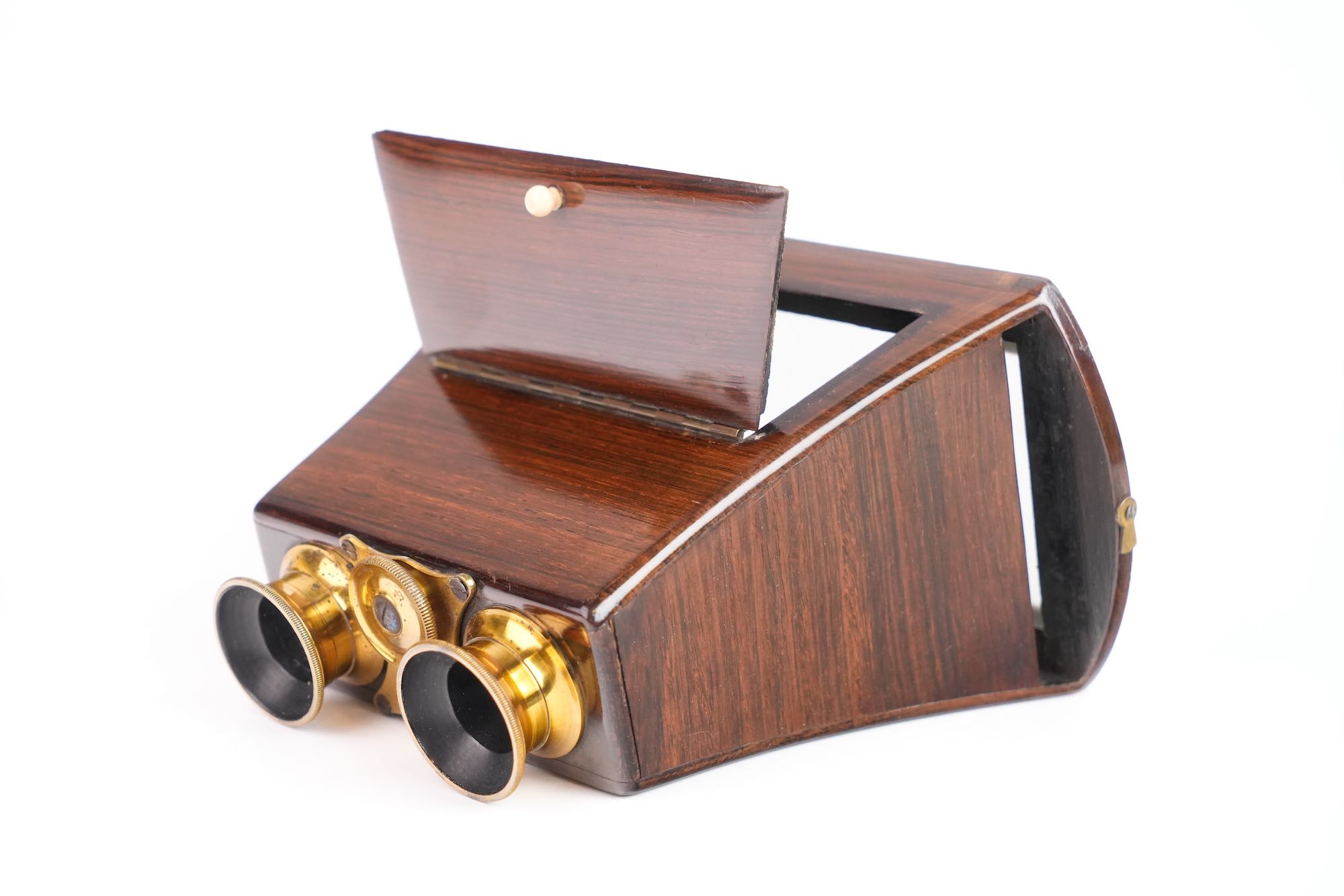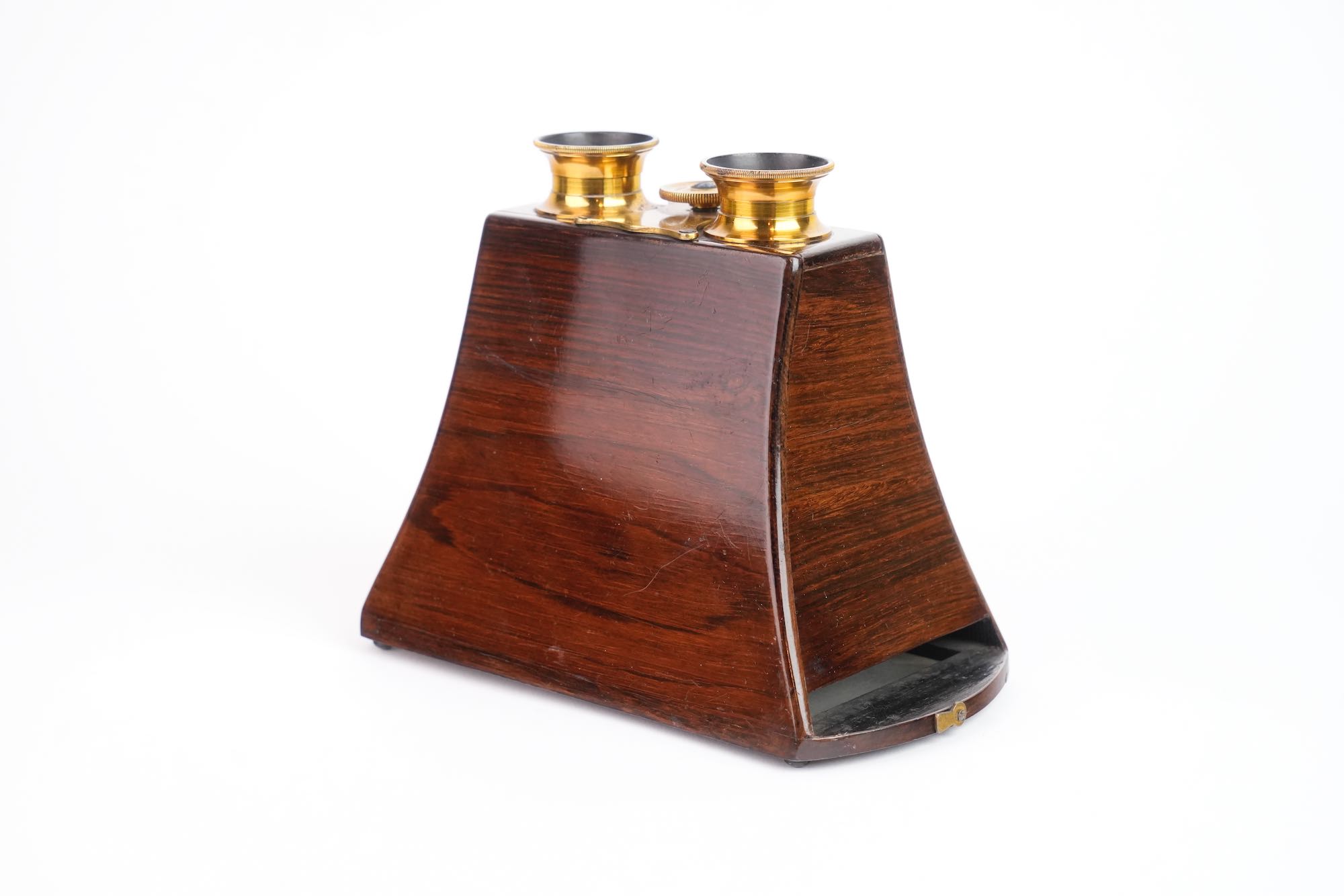 Stéréoscope de type Brewster Duboscq. Il est construit en palissandre et verni. Les oculaires sont en laiton avec molette de mise au point ; ils renferment des lentilles taillées en prismes. Le stéréoscope est muni d'un miroir articulé, à feuille argentée. Le dépoli est présent. Format 8,5 x 17 cm. Vers 1855.