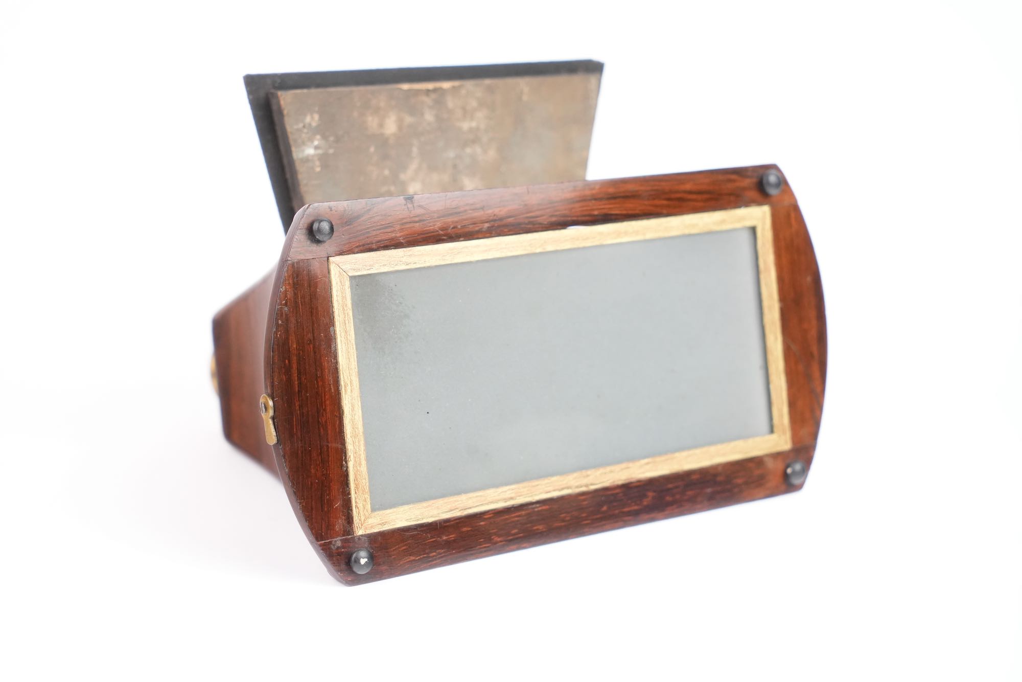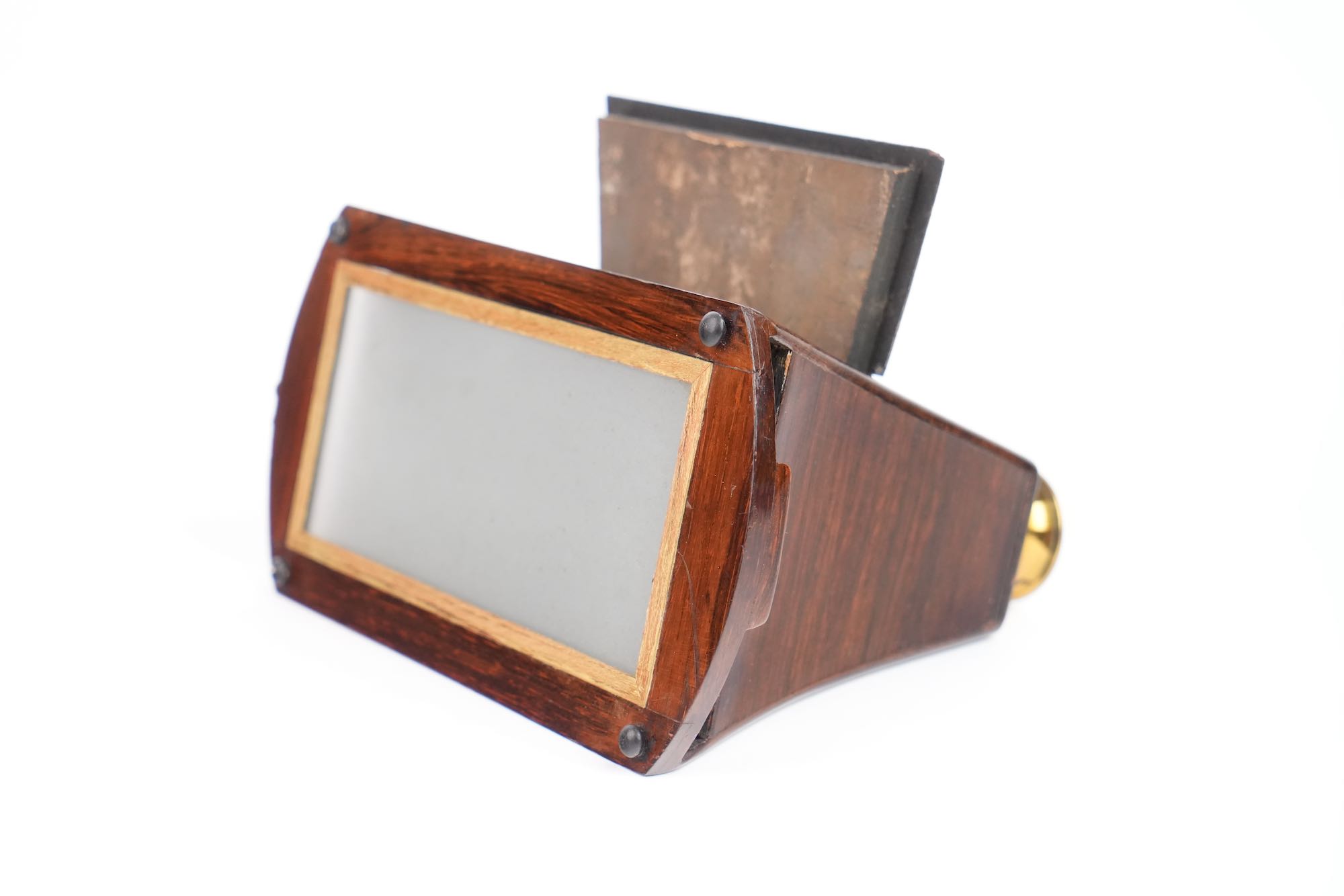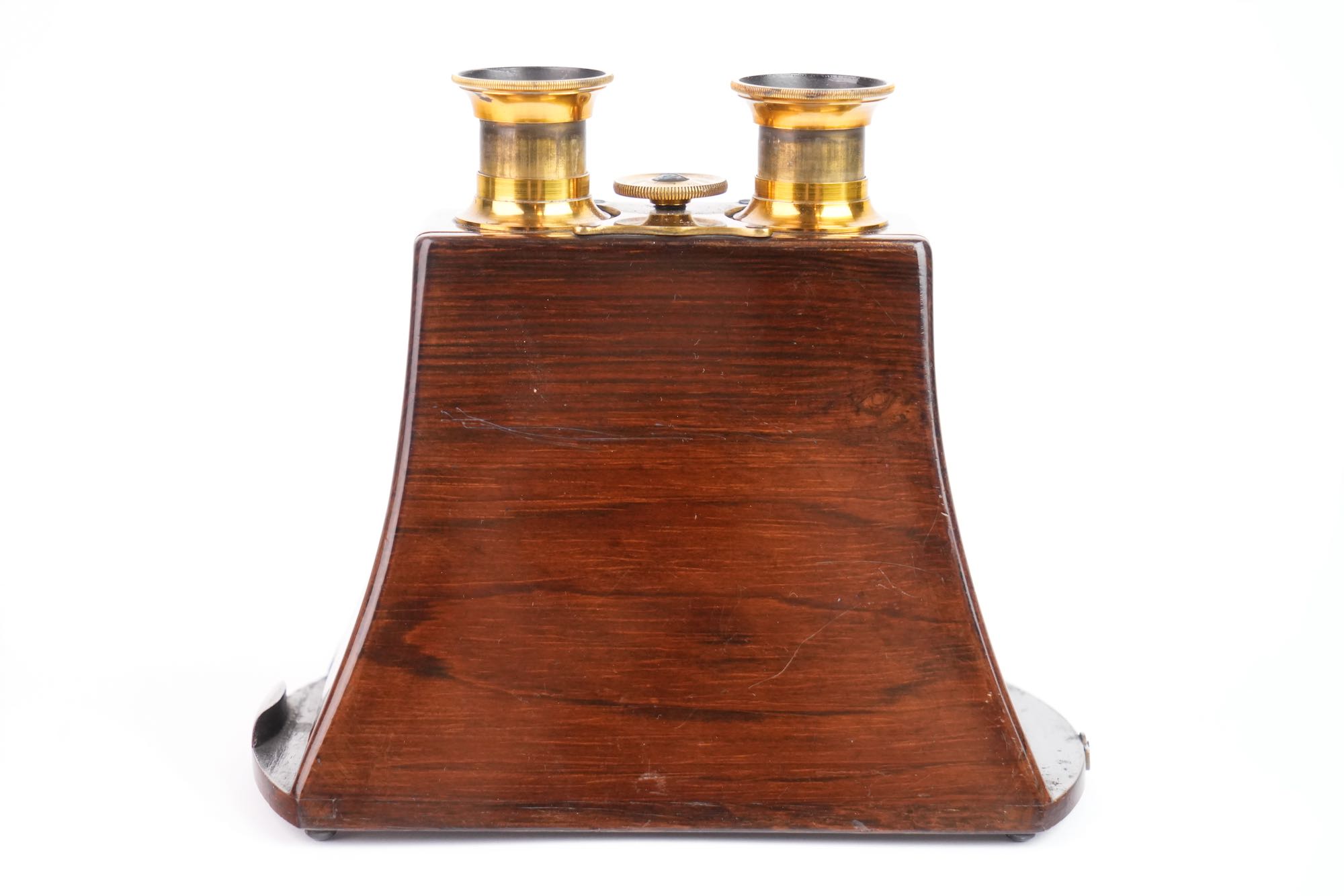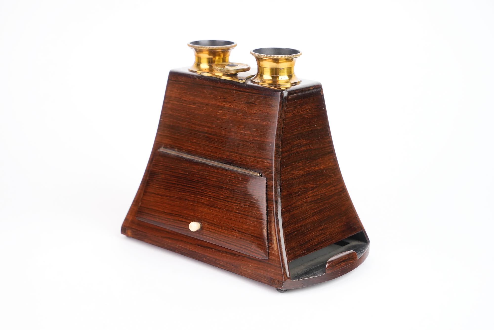 Stéréoscope de type Brewster Duboscq. Il est construit en palissandre et verni. Les oculaires sont en laiton avec molette de mise au point ; ils renferment des lentilles taillées en prismes. Le stéréoscope est muni d'un miroir articulé, à feuille argentée. Le dépoli est présent. Format 8,5 x 17 cm. Vers 1855.