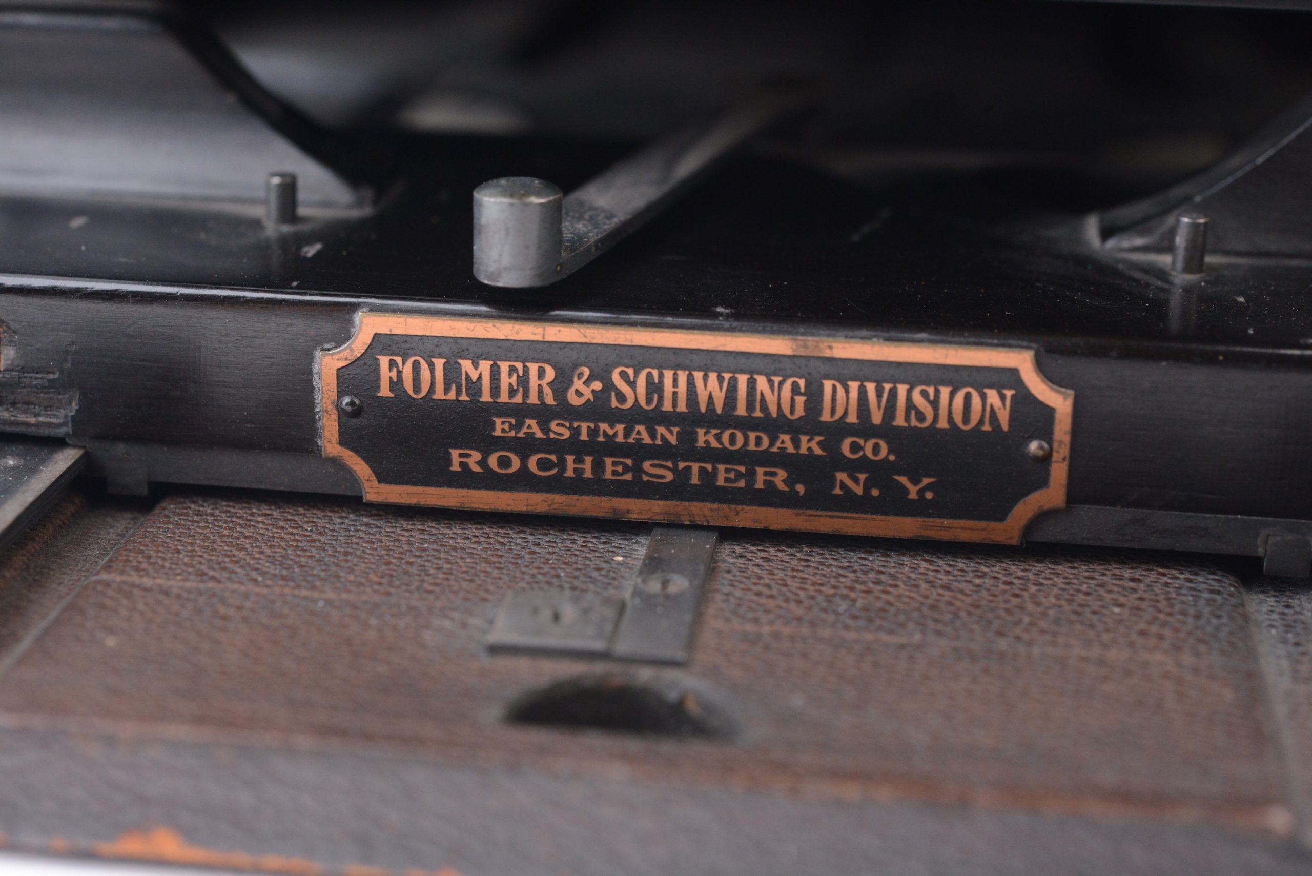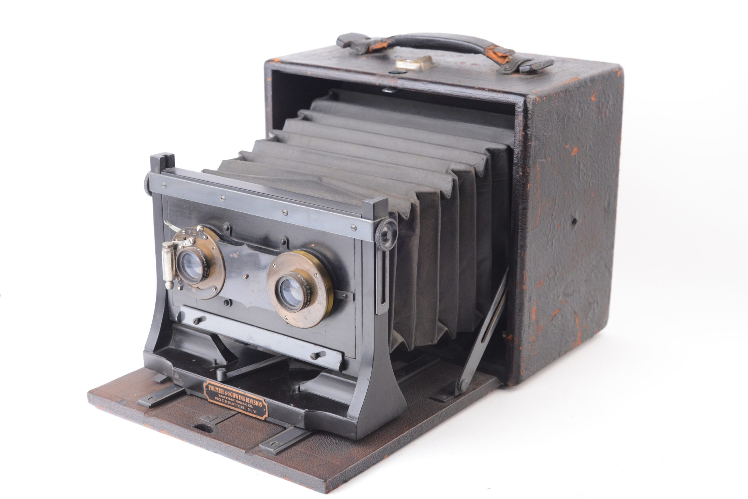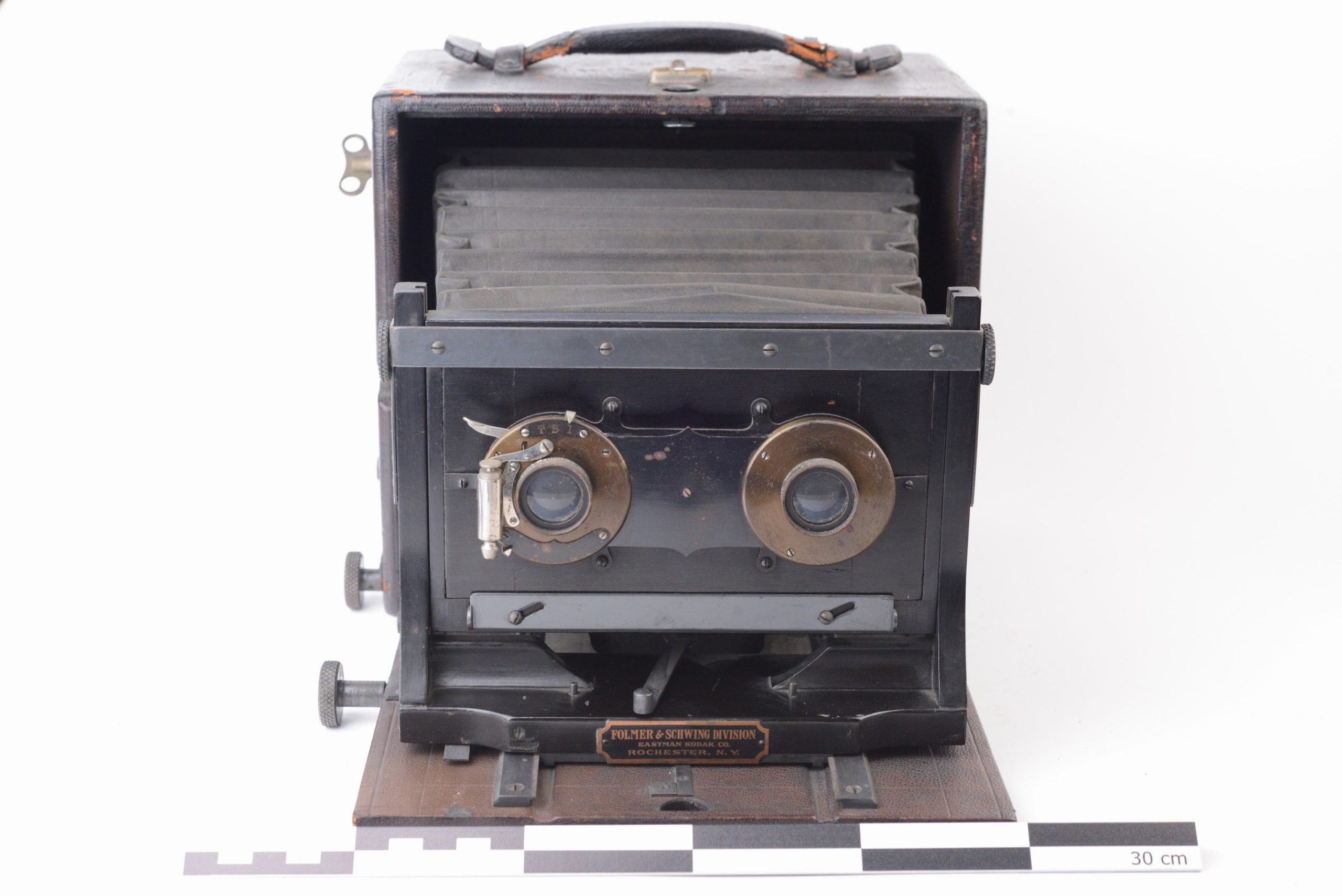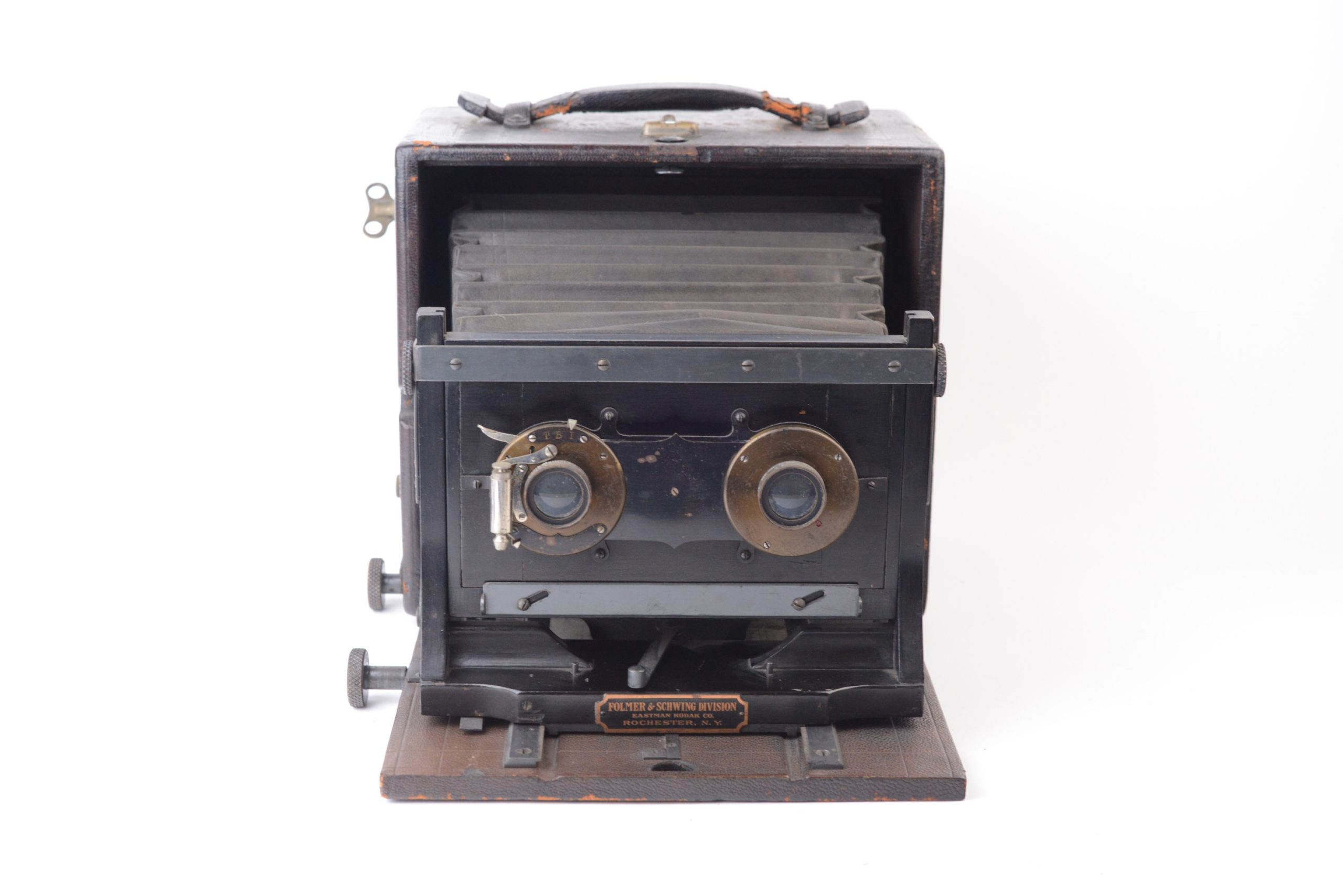 Appareil stéréoscopique Folmer & Schwing Division. Fabriqué par Eastman Kodak Co Rochester, N.Y. 1907. Format 5x7 inc.  Construction en bois gainé cuir avec soufflet en cuir noir. Objectifs Bausch & Lomb montés sur double obturateur central à déclenchement pneumatique. Second obturateur focal de plaque à l’arrière pouvant atteindre le 1/1000<sup>ème</sup> de seconde. Quelques craquelures sur le cuir. Modèle de construction robuste.