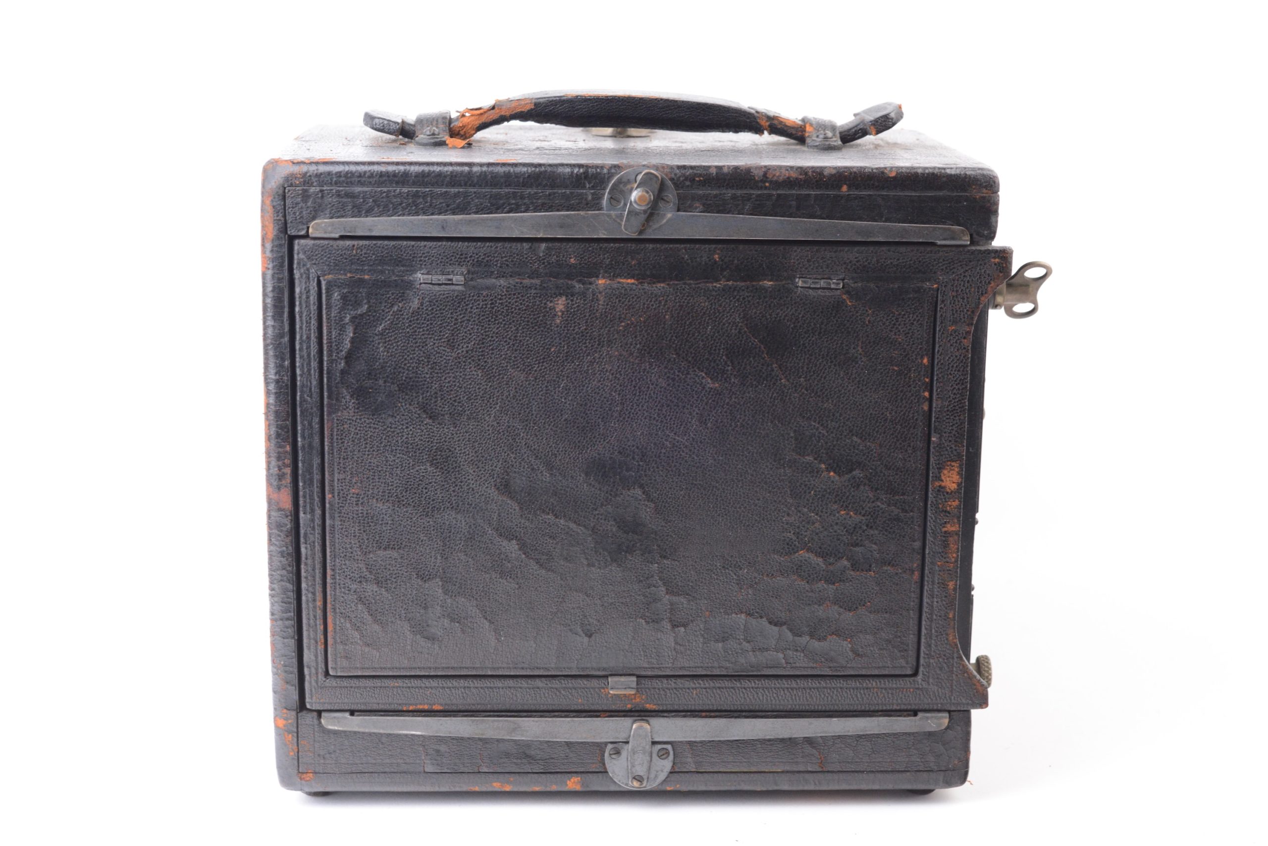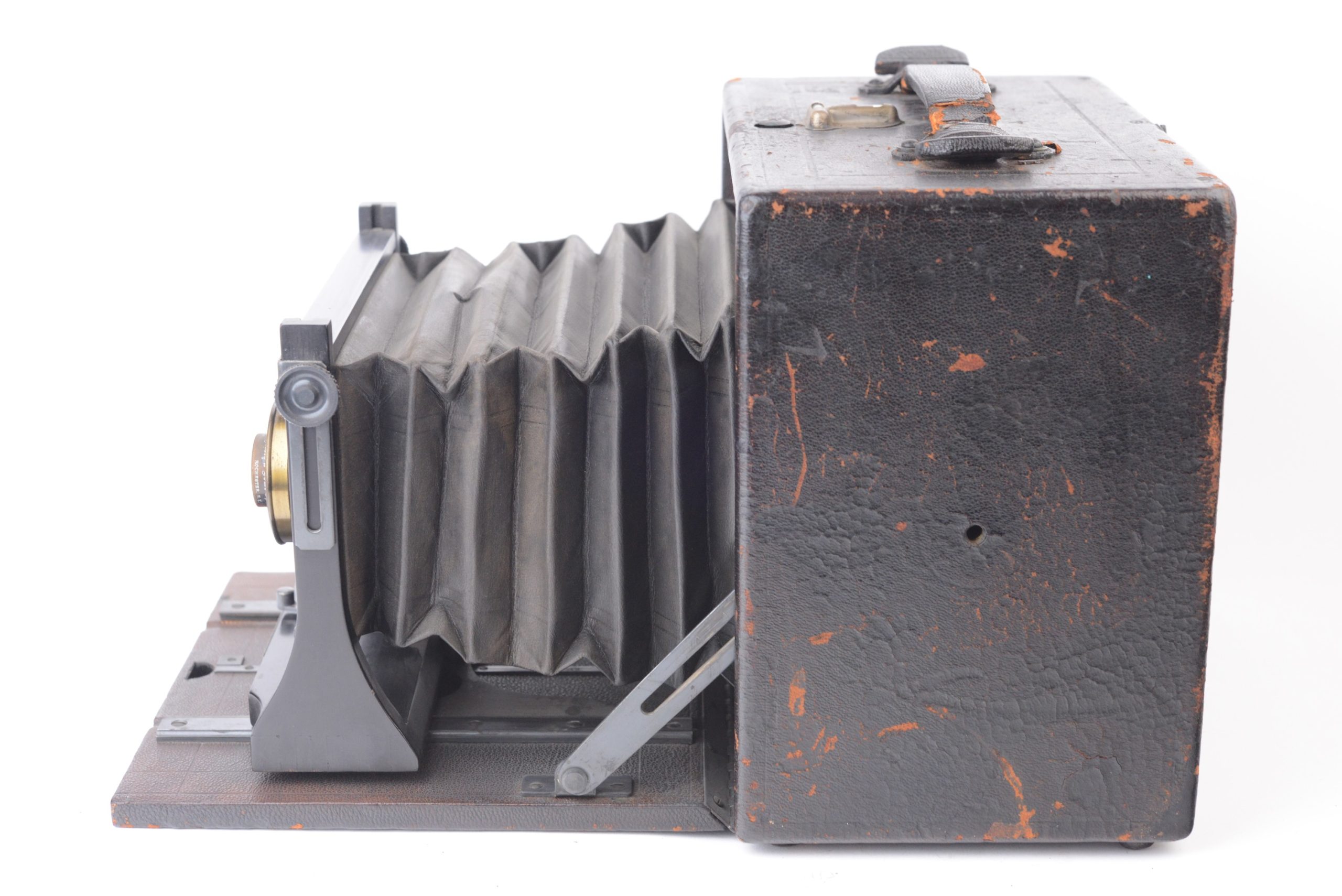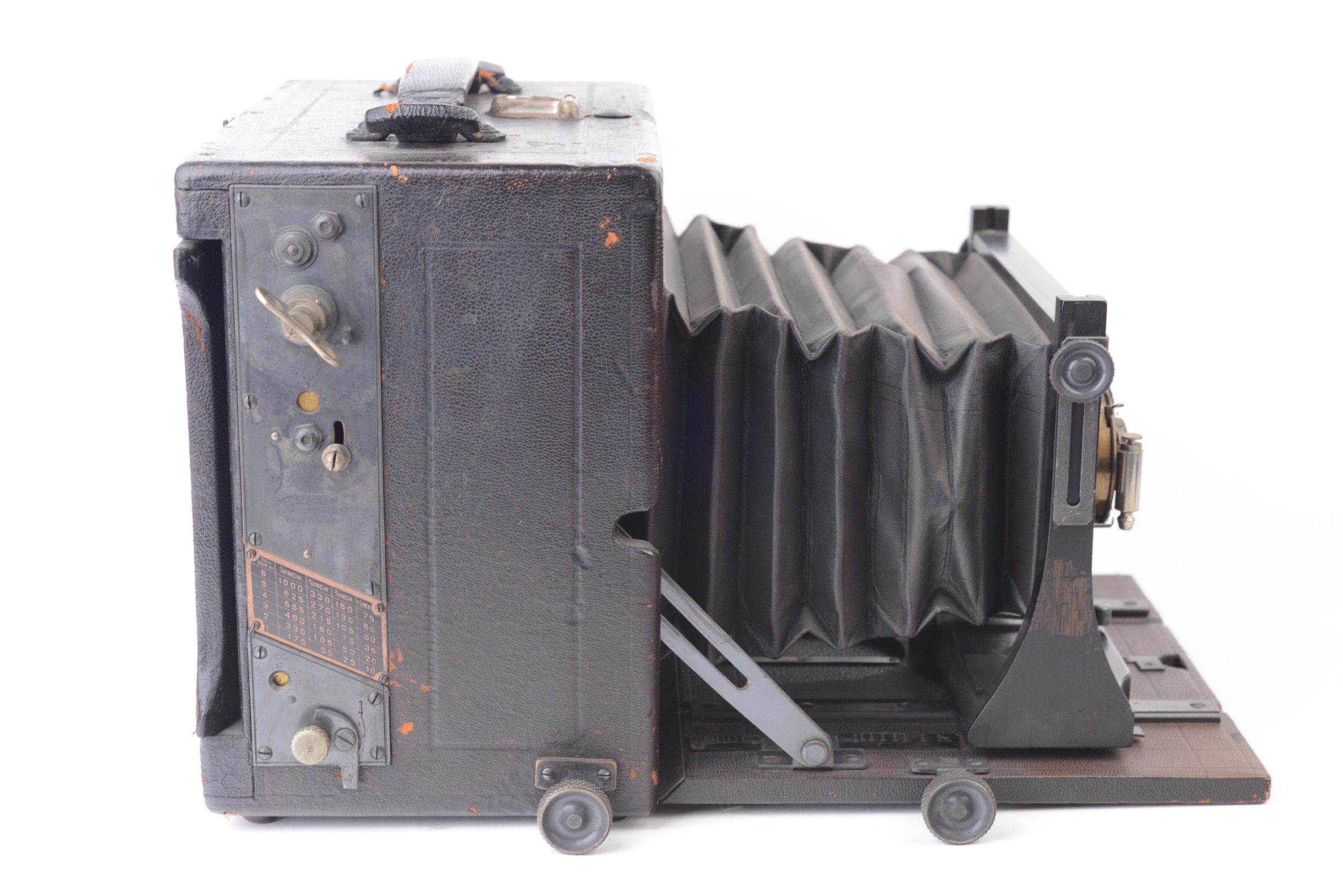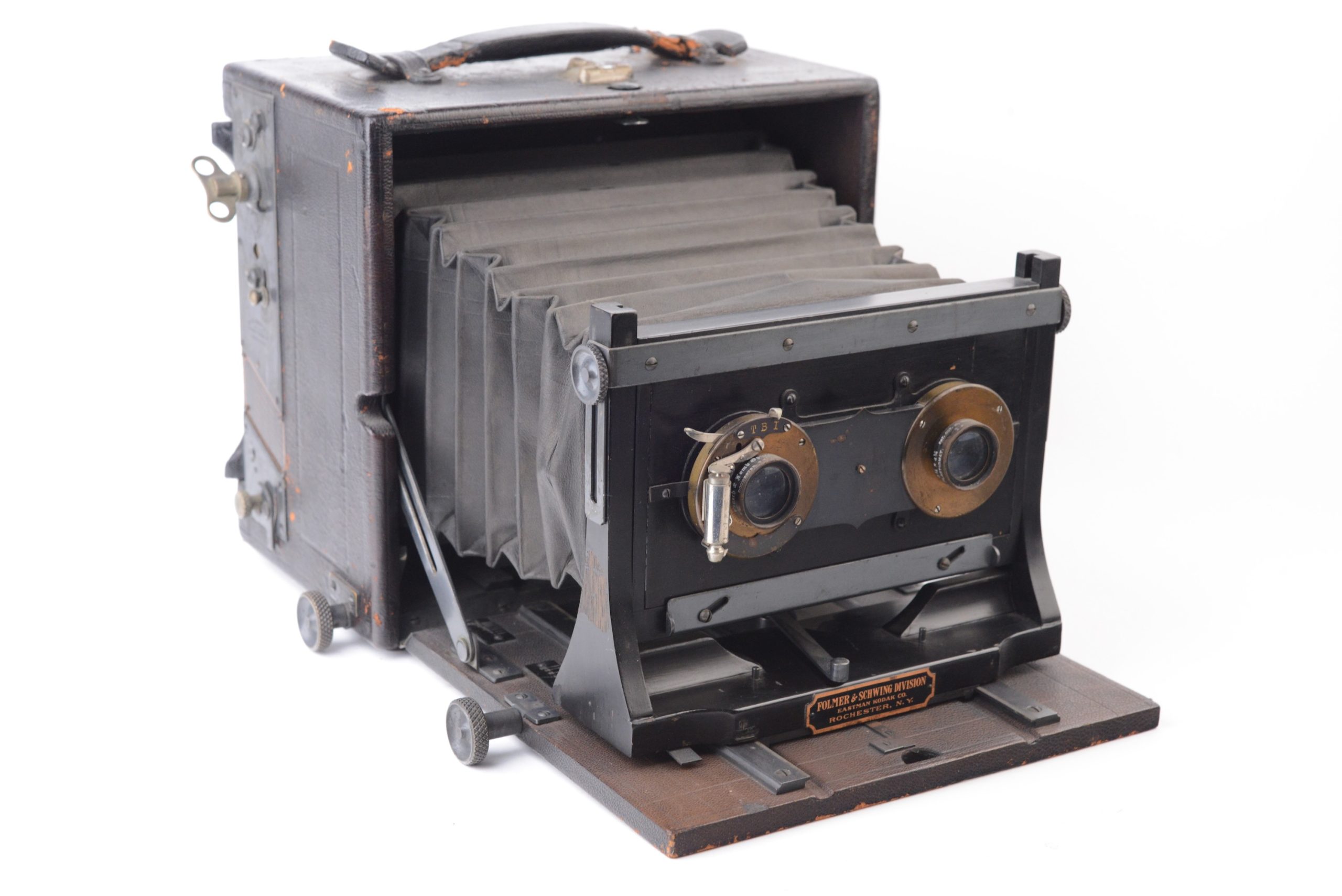 Appareil stéréoscopique Folmer & Schwing Division. Fabriqué par Eastman Kodak Co Rochester, N.Y. 1907. Format 5x7 inc.  Construction en bois gainé cuir avec soufflet en cuir noir. Objectifs Bausch & Lomb montés sur double obturateur central à déclenchement pneumatique. Second obturateur focal de plaque à l’arrière pouvant atteindre le 1/1000<sup>ème</sup> de seconde. Quelques craquelures sur le cuir. Modèle de construction robuste.