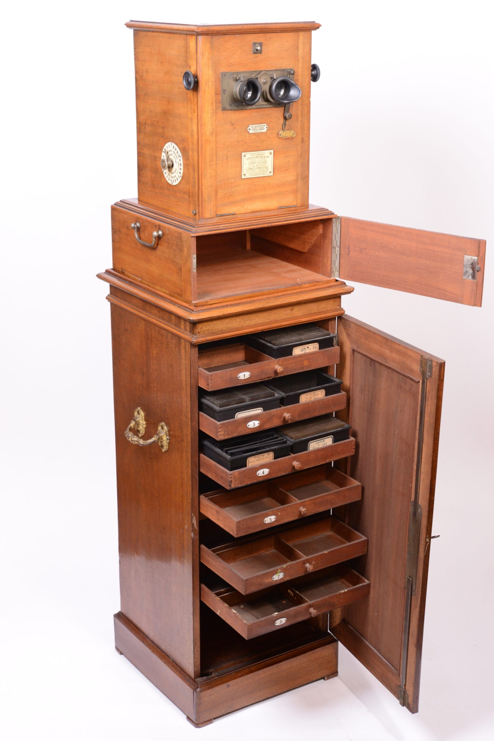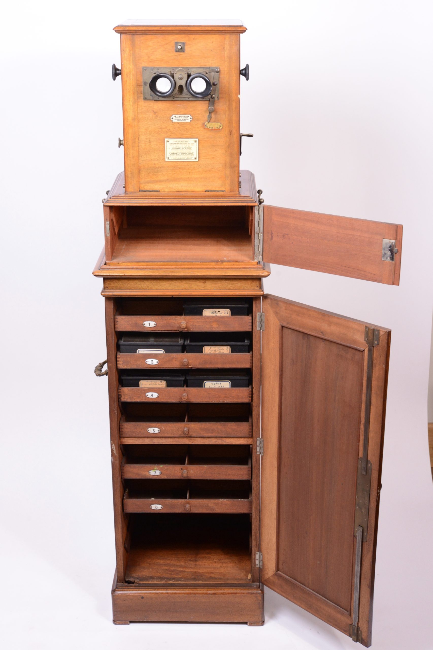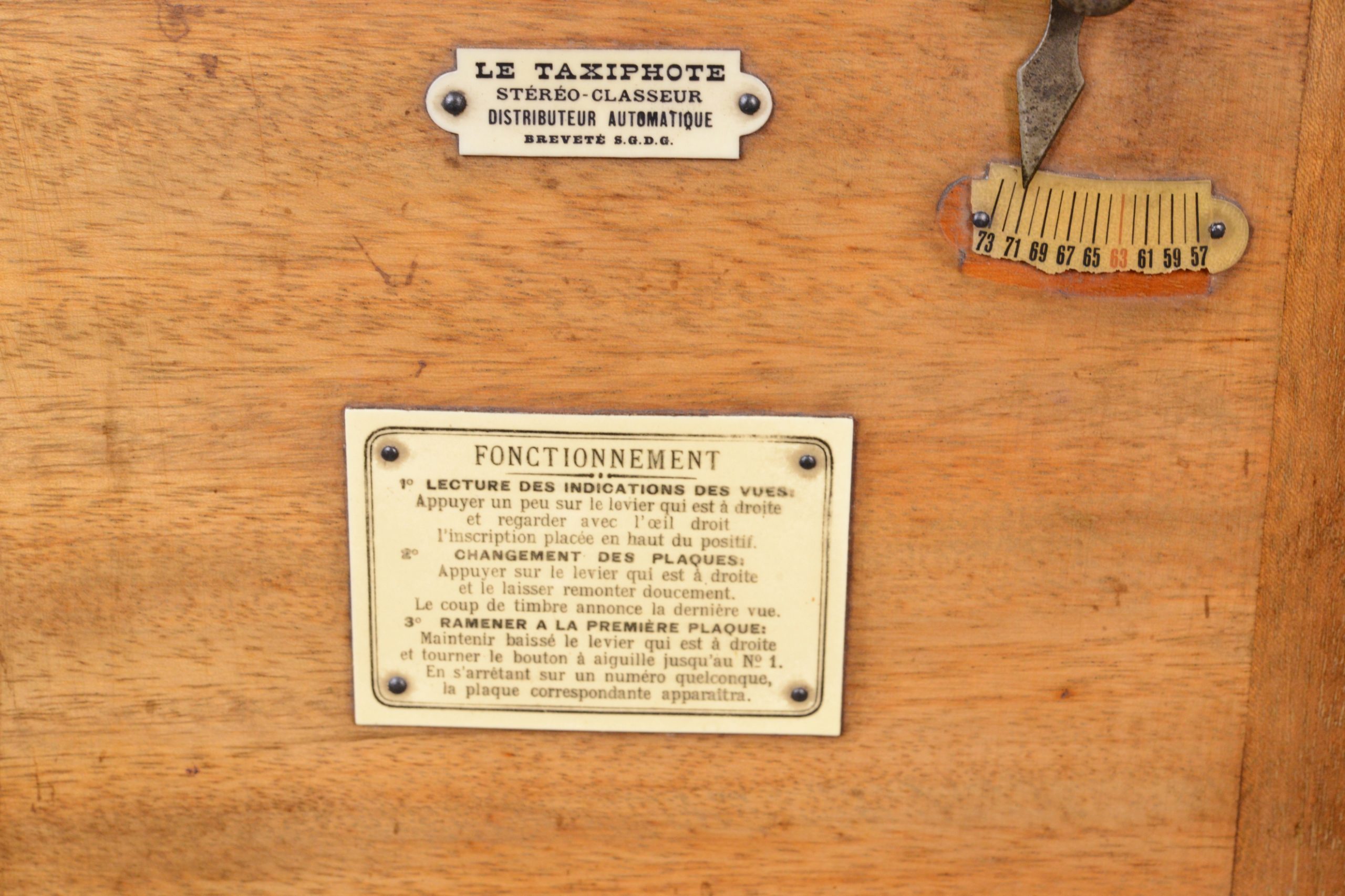 Taxiphote Jules Richard 6x13 avec son meuble colonne de rangement à 8 tiroirs (6 sont présents) pouvant contenir 4 paniers chacun. Chaque tiroir est numéroté et comporte une petite plaque en tôle émaillée fixée en façade. La base du Taxiphote peut recevoir deux tiroirs en plus. Les oculaires sont à écartement variable. Le Taxiphote et son meuble sont construits en noyer (Belle ébénisterie). Le Taxiphote renferme un mécanisme permettant l’observation des vues selon leur classement.  Présence de deux belles poignées en bronze ornementé. Numéro de série 12277.  Vers 1925.