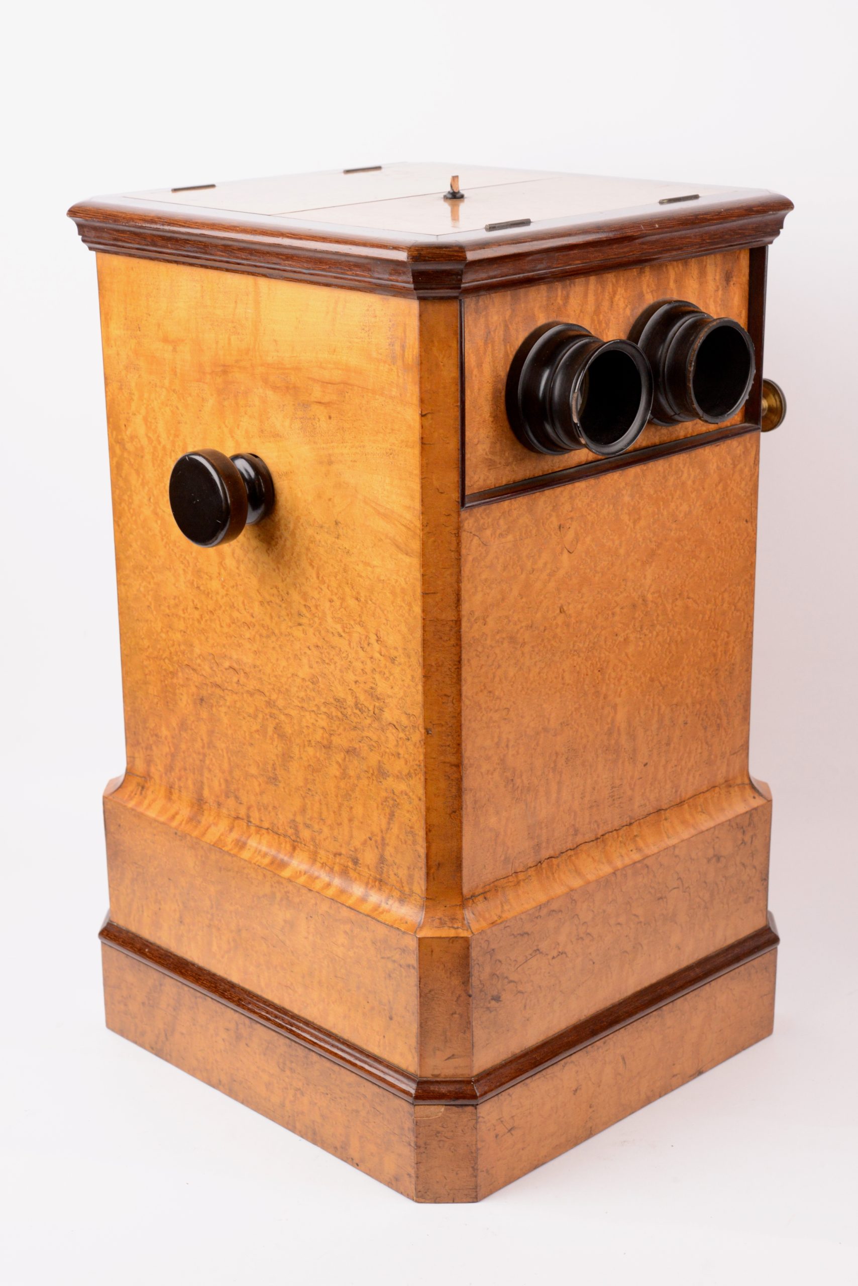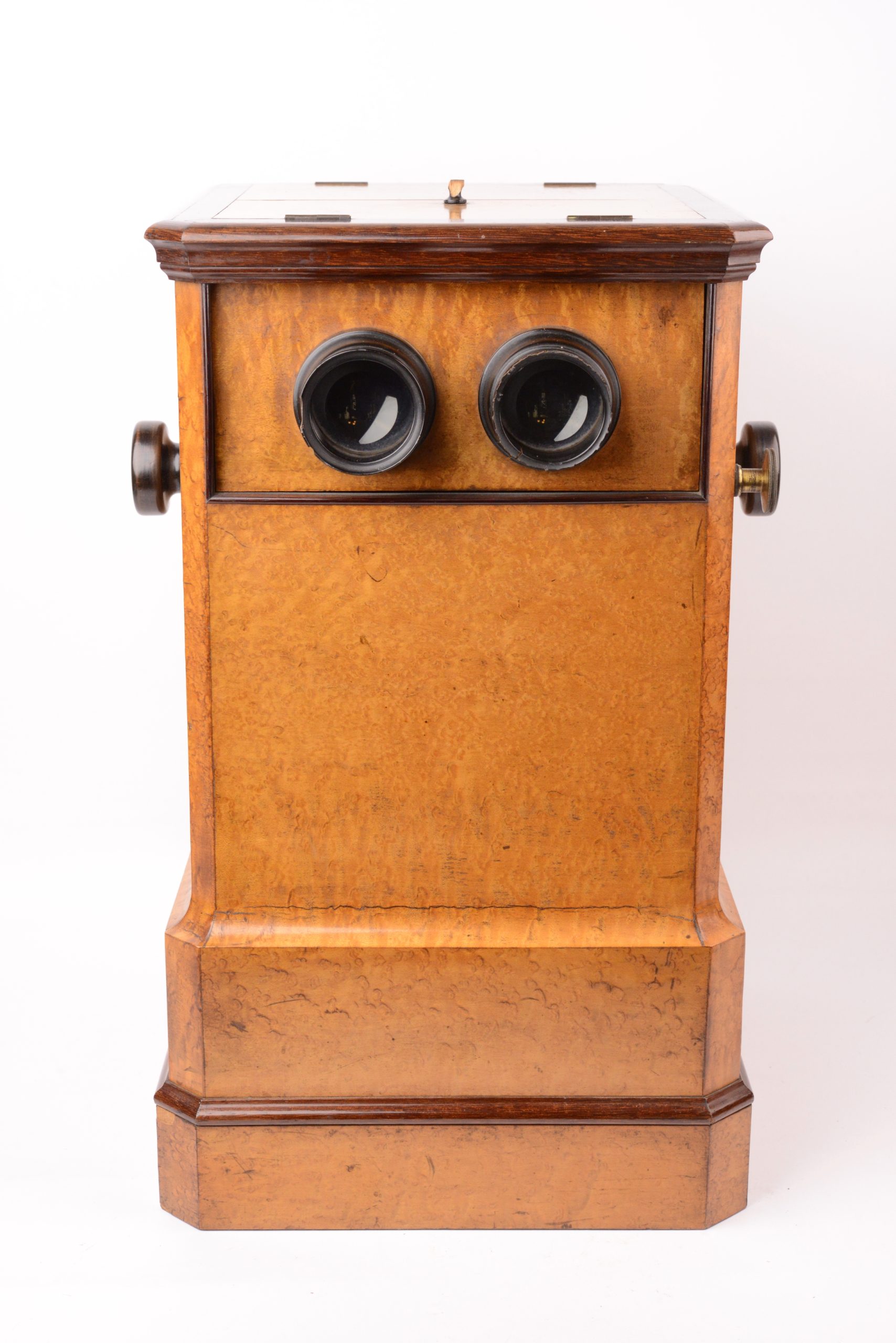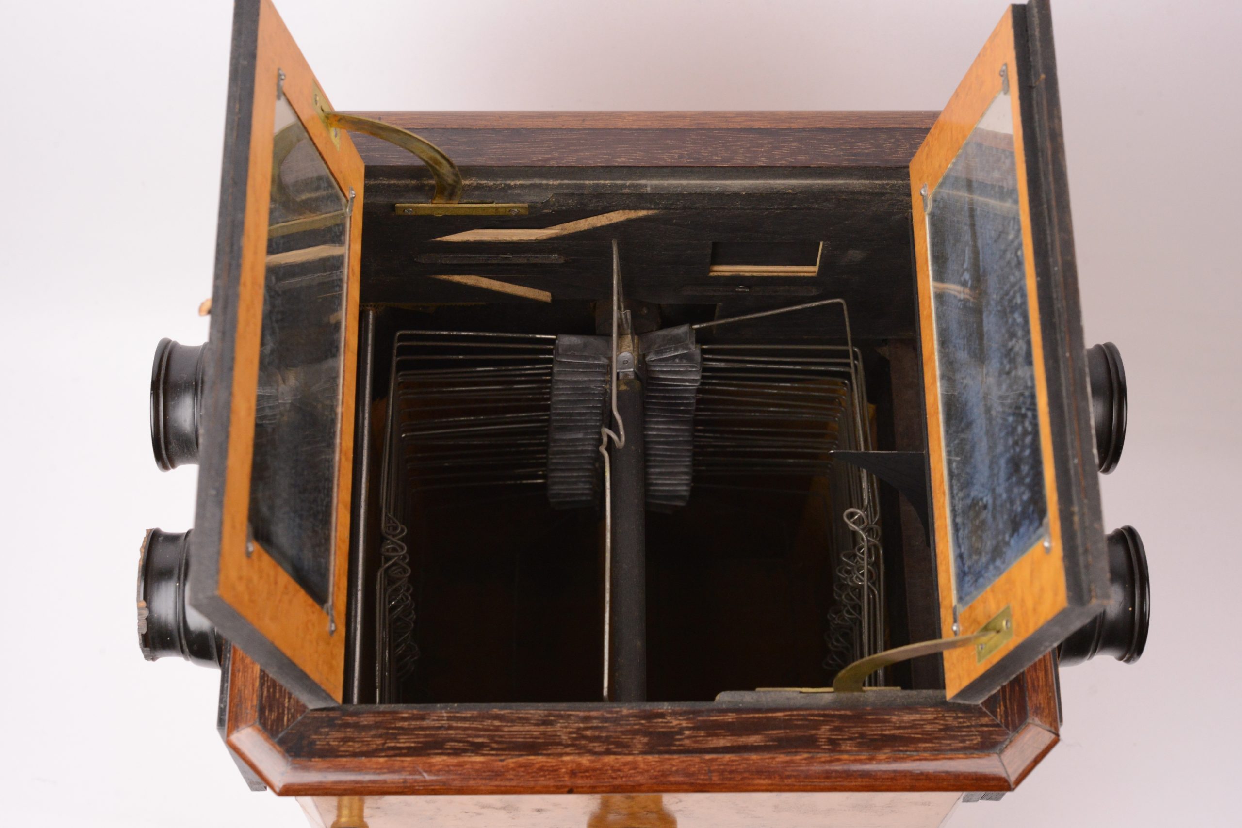 Visionneuse stéréoscopique de table double poste. Deuxième moitié du XIXème siècle. Très belle ébénisterie en bois de citronnier. La visionneuse comporte une chaine pouvant supporter 50 stéréogrammes au format 8,5x17. Le changement de vue s’effectue à l’aide des deux poignées latérales agissant sur la chaîne. La visionneuse offre la possibilité à deux personnes de pouvoir observer des vues simultanément. A cet effet, les deux volets fermant le haut de la visionneuse sont munis de miroirs pour l’éclairage des vues observées. Notez quelques égrenures sur la paire de moulures des oculaires.