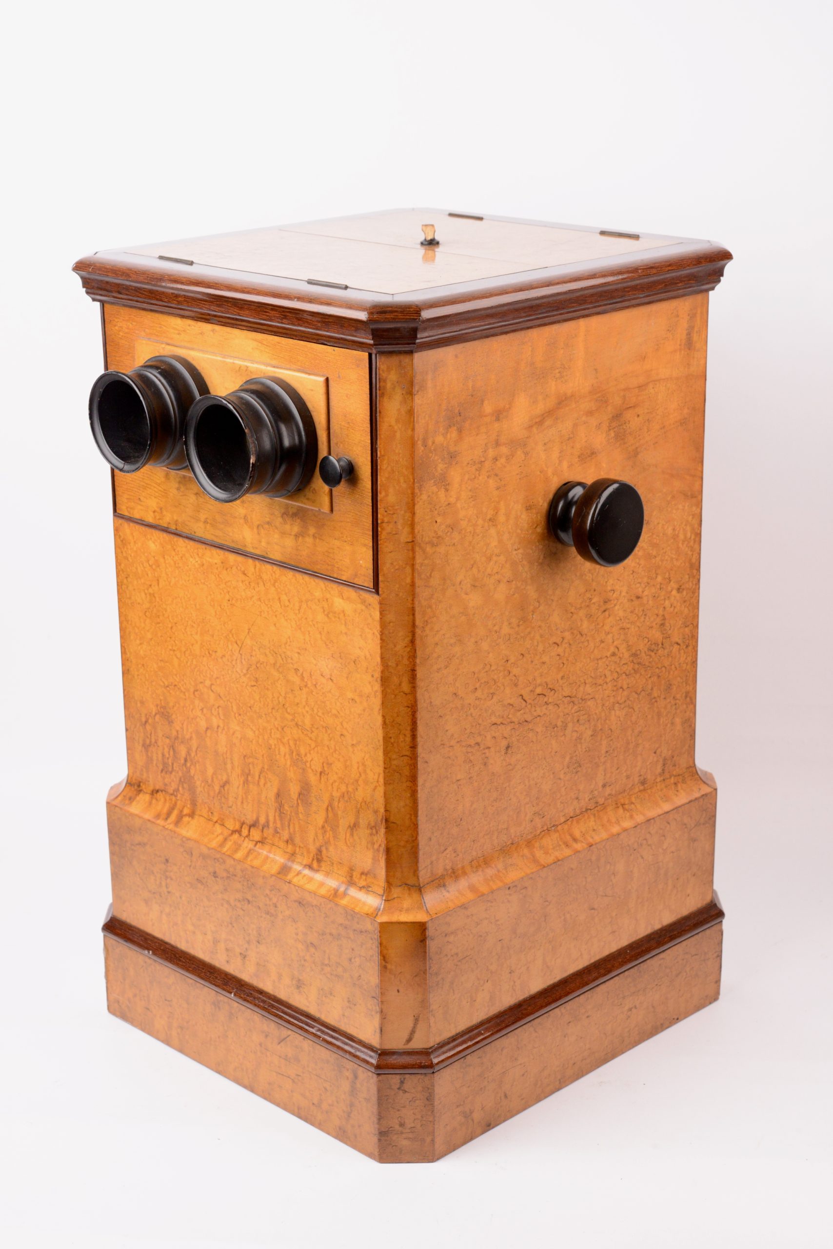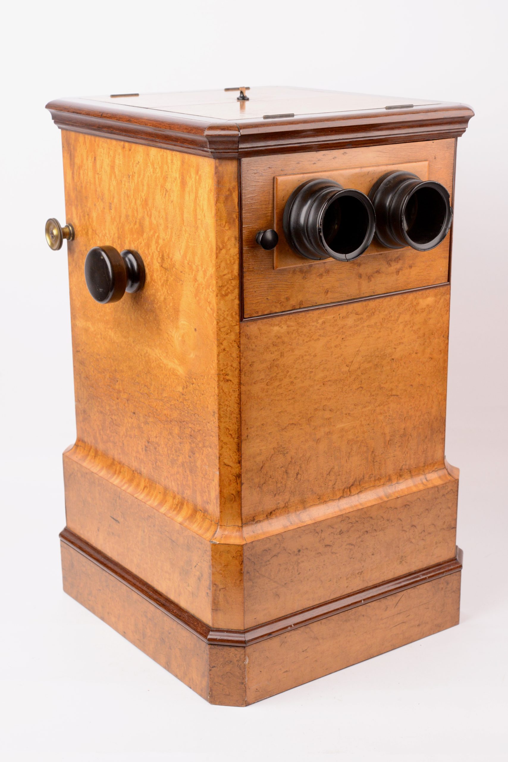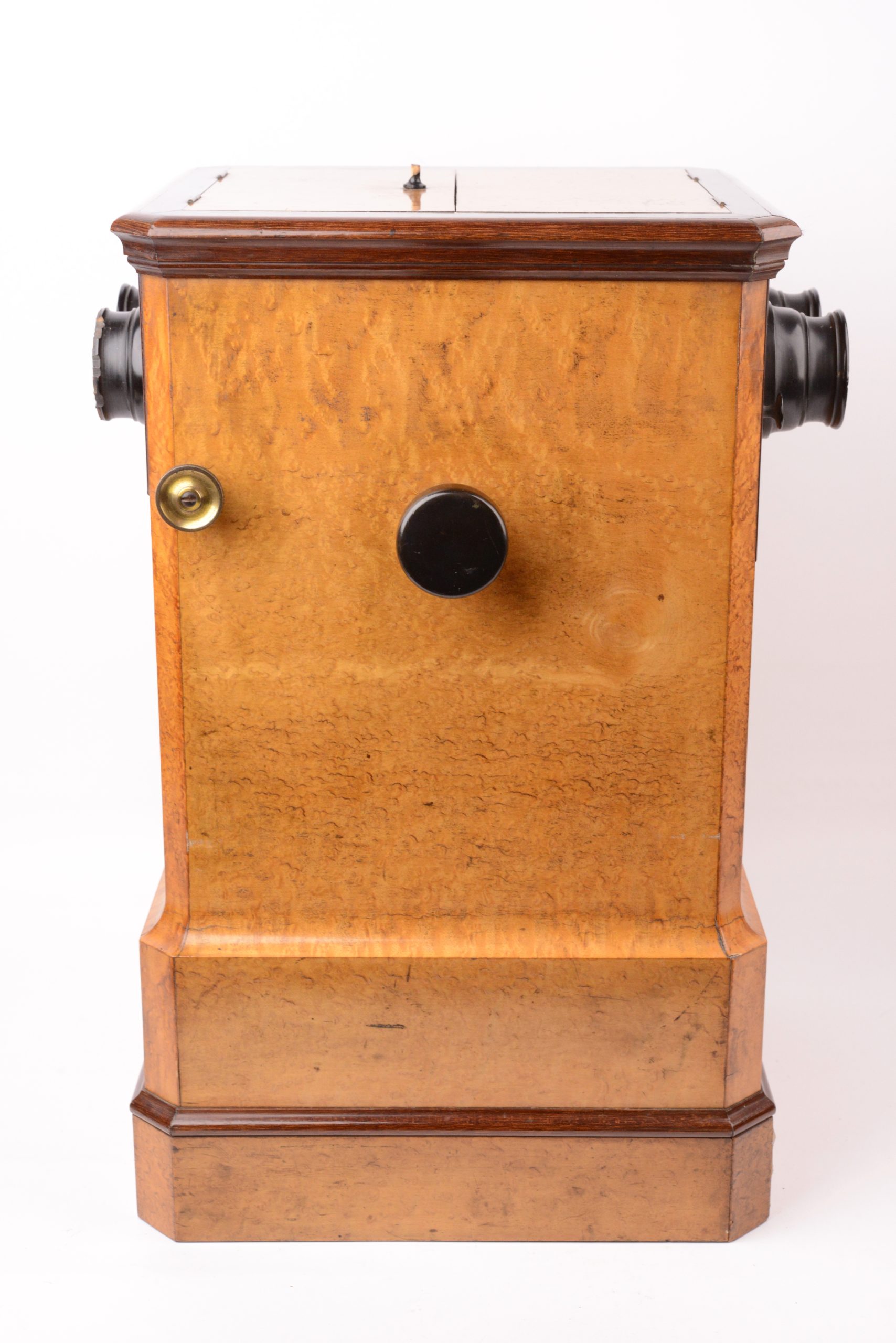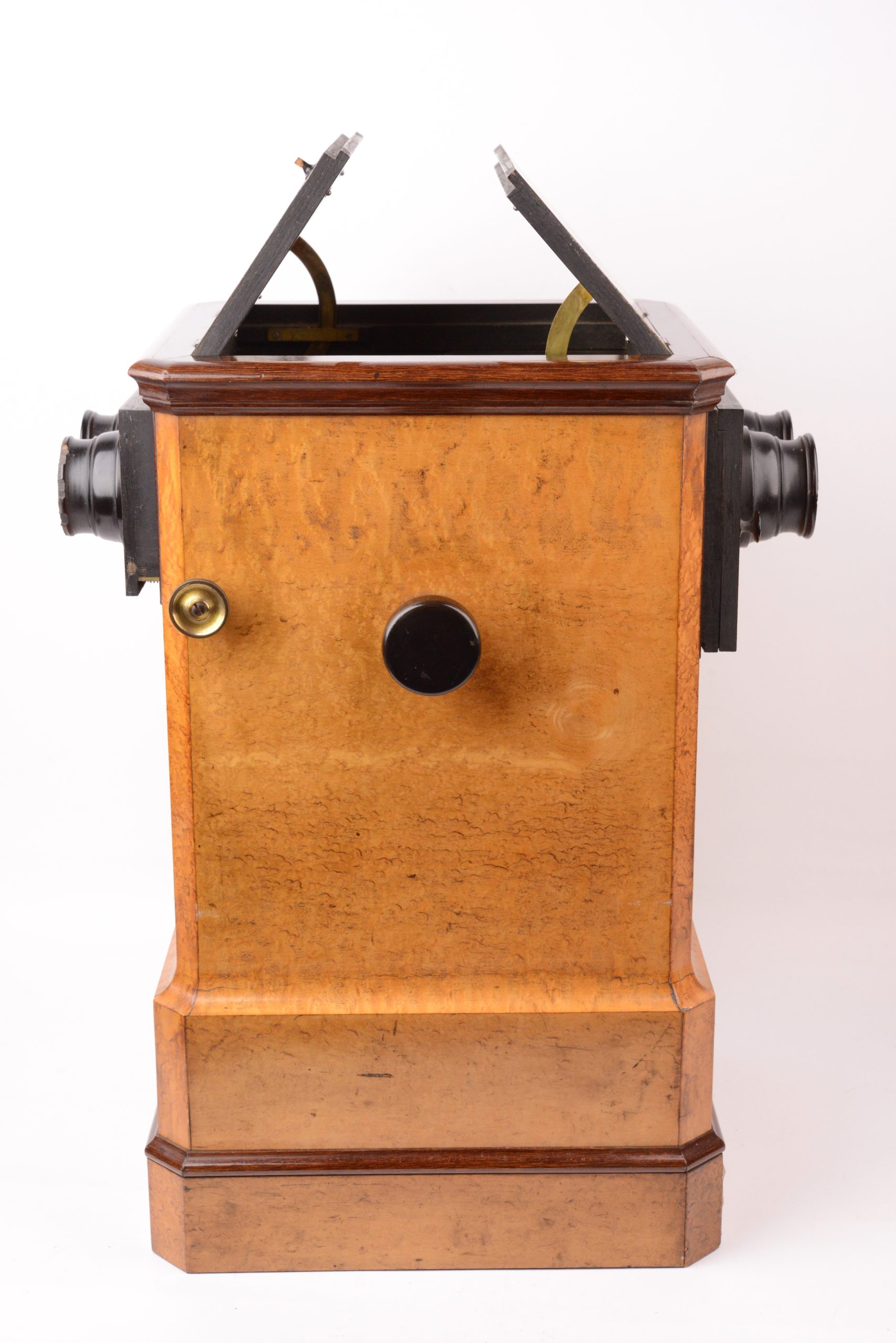 Visionneuse stéréoscopique de table double poste. Deuxième moitié du XIXème siècle. Très belle ébénisterie en bois de citronnier. La visionneuse comporte une chaine pouvant supporter 50 stéréogrammes au format 8,5x17. Le changement de vue s’effectue à l’aide des deux poignées latérales agissant sur la chaîne. La visionneuse offre la possibilité à deux personnes de pouvoir observer des vues simultanément. A cet effet, les deux volets fermant le haut de la visionneuse sont munis de miroirs pour l’éclairage des vues observées. Notez quelques égrenures sur la paire de moulures des oculaires.