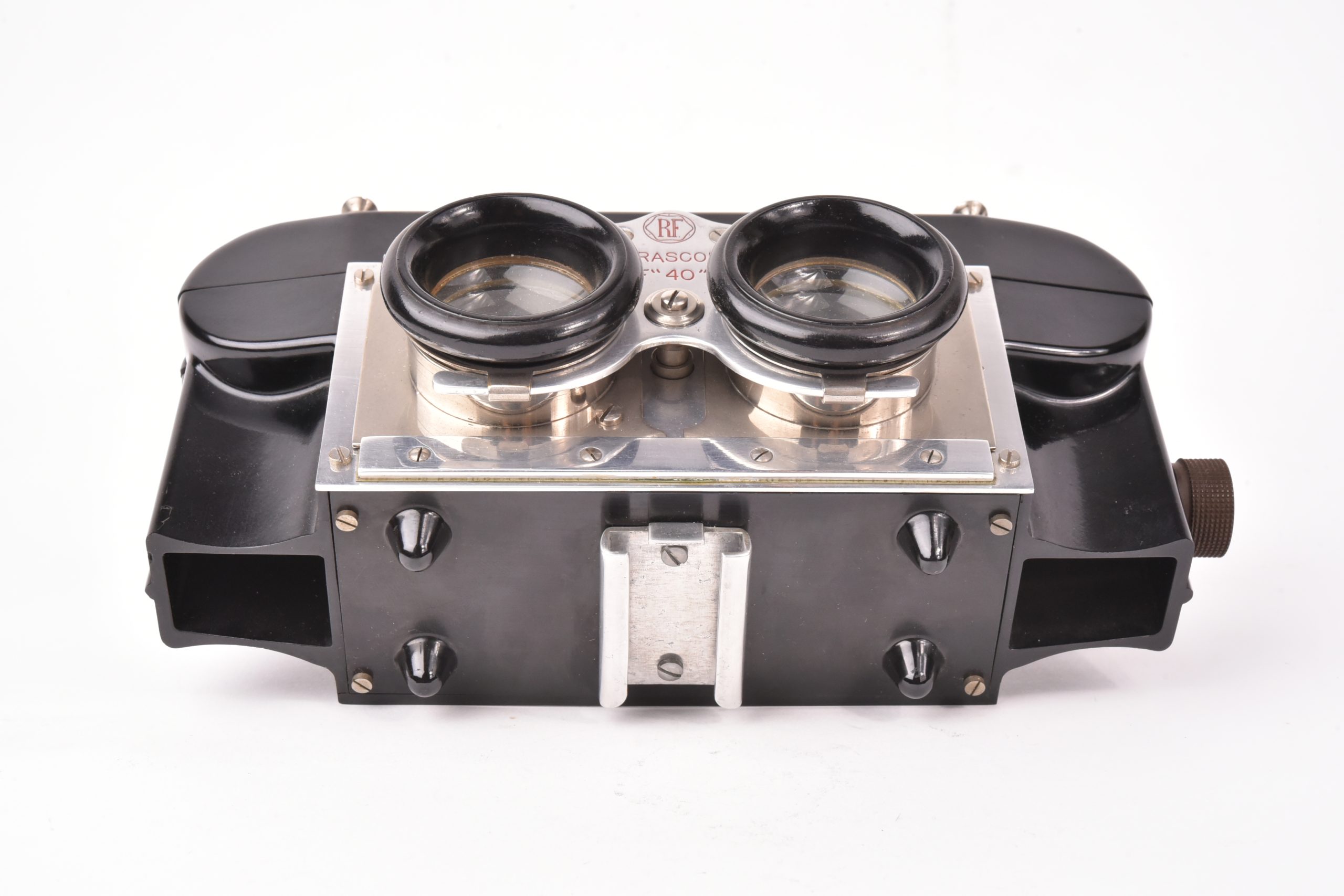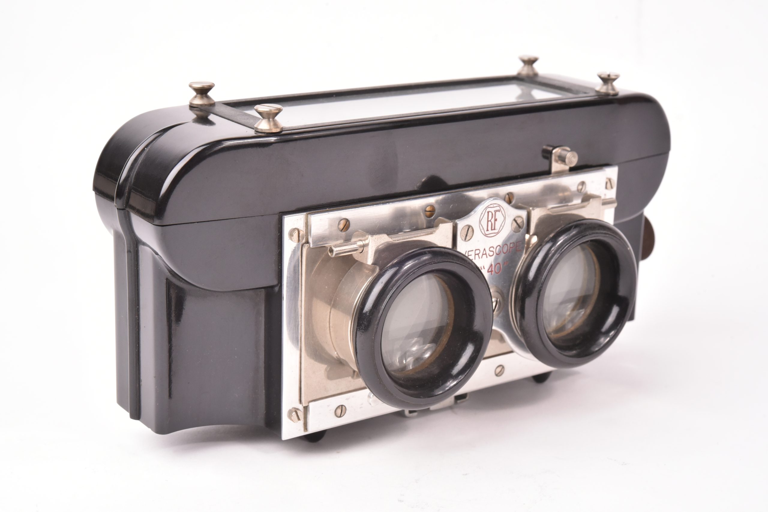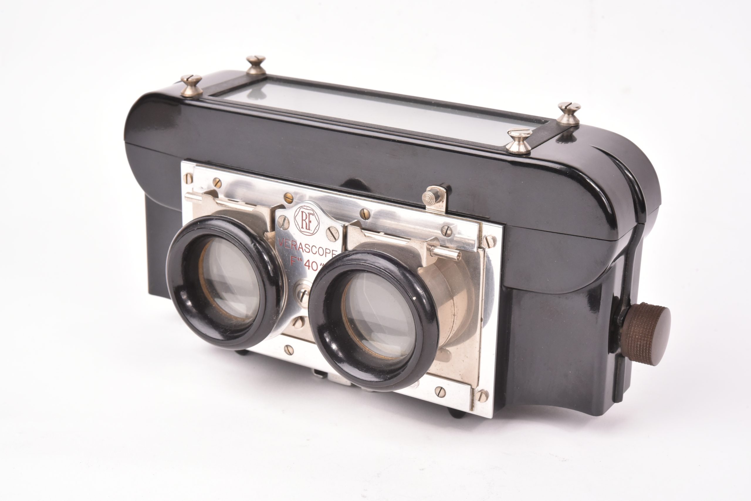 Cette visionneuse en bakélite noire est d'ordinaire couplée avec l'appareil de prise de vue le Vérascope F40 qui produit des vues stéréoscopiques de 45 x 107mm. La visionneuse indique cela par une mention rouge gravée entre les deux oculaires. Bel état, pas de fissures. Cet exemplaire ne possède pas de capot.