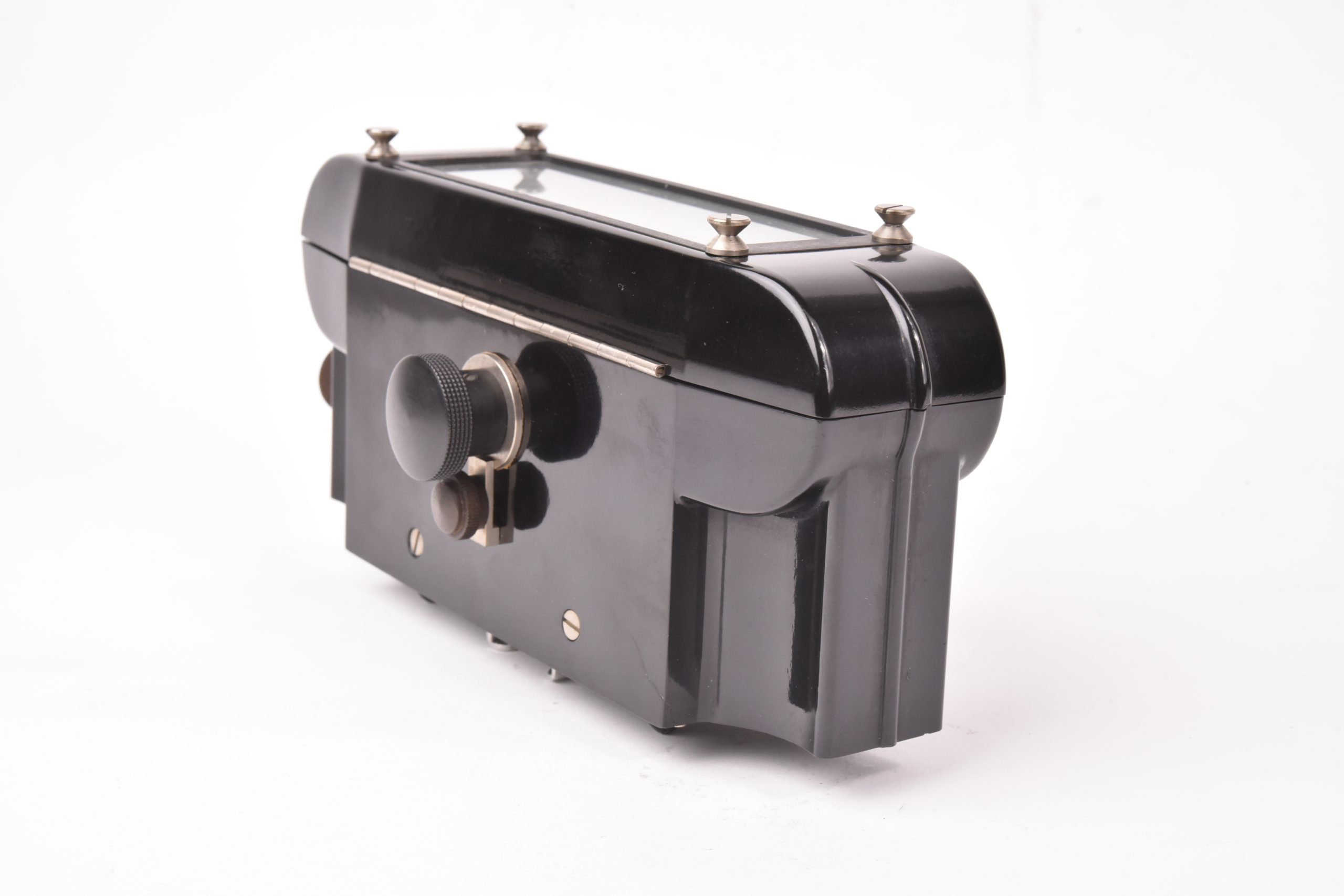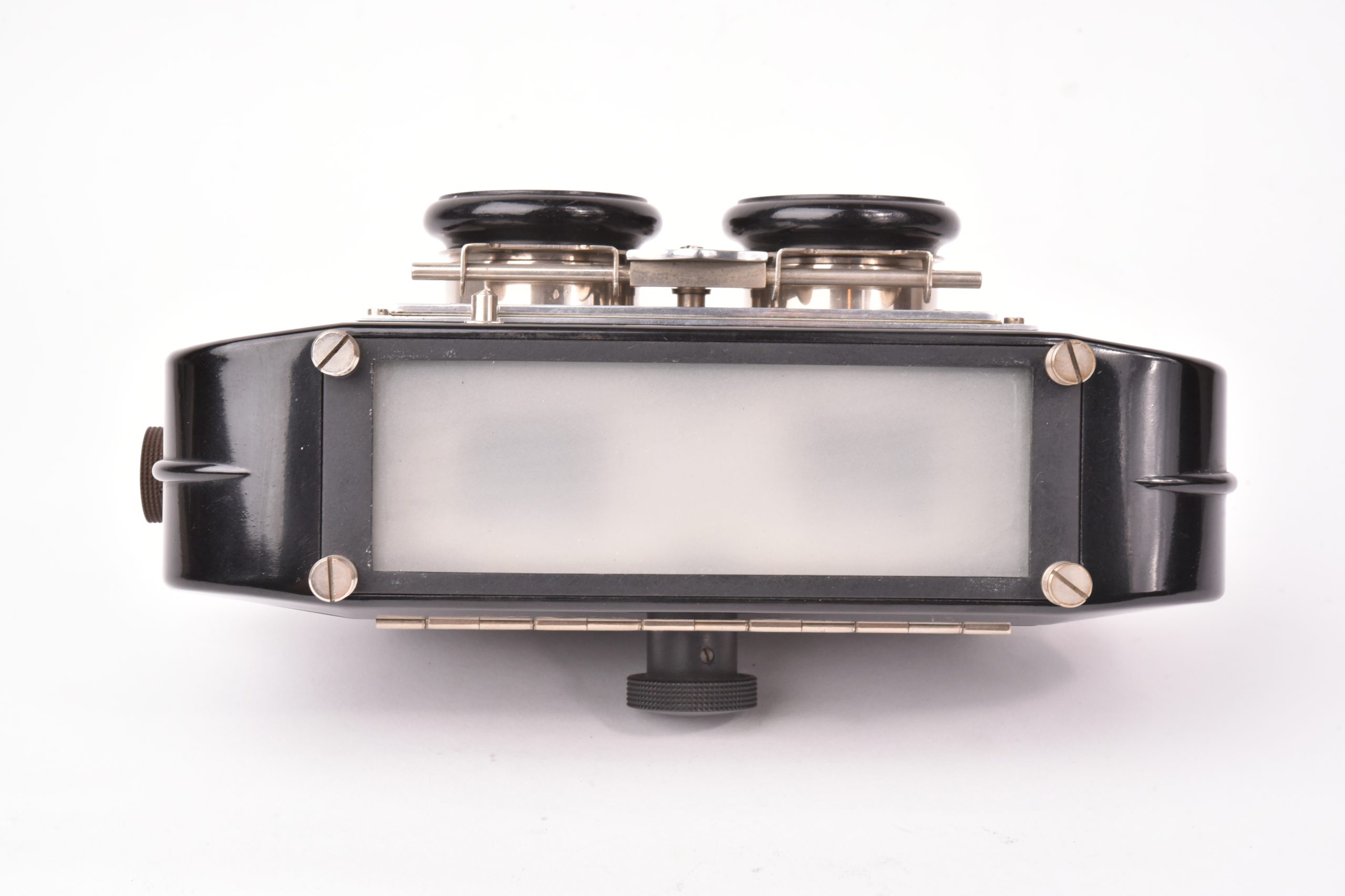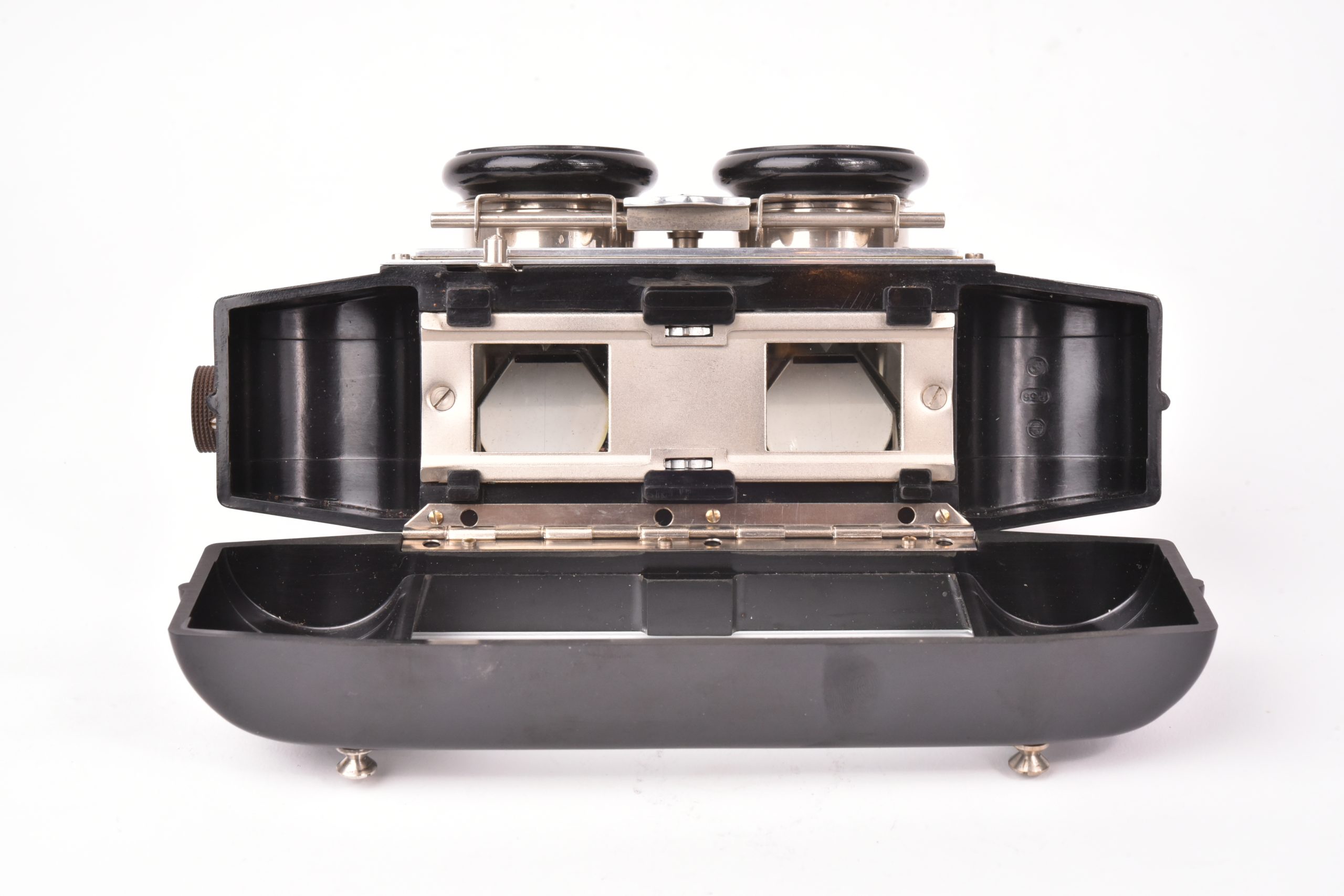 Cette visionneuse en bakélite noire est d'ordinaire couplée avec l'appareil de prise de vue le Vérascope F40 qui produit des vues stéréoscopiques de 45 x 107mm. La visionneuse indique cela par une mention rouge gravée entre les deux oculaires. Bel état, pas de fissures. Cet exemplaire ne possède pas de capot.
